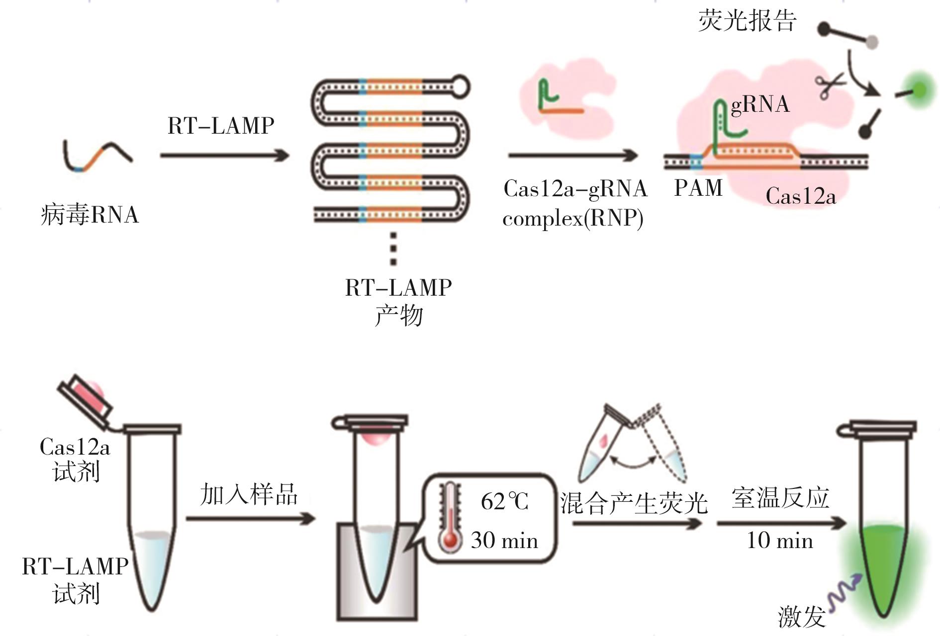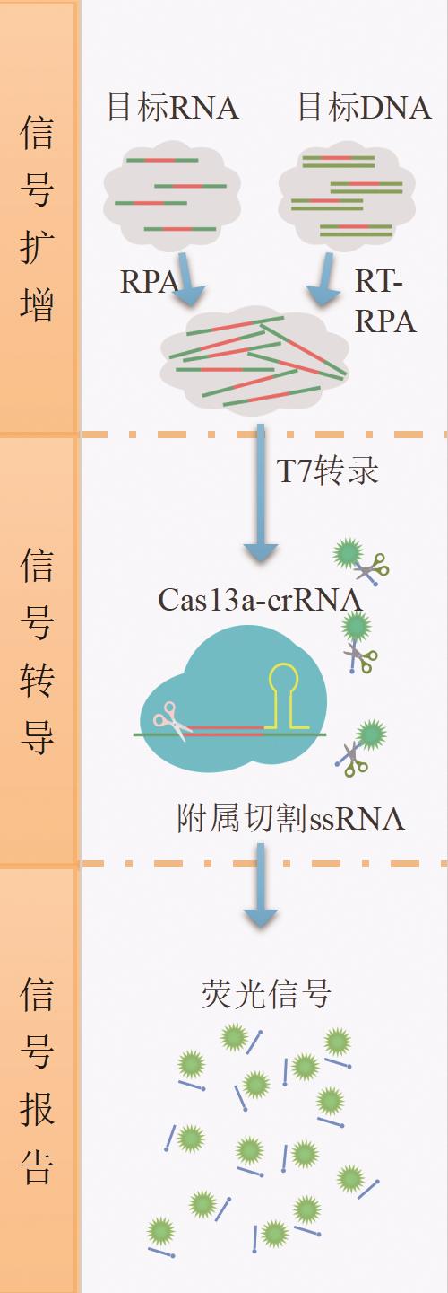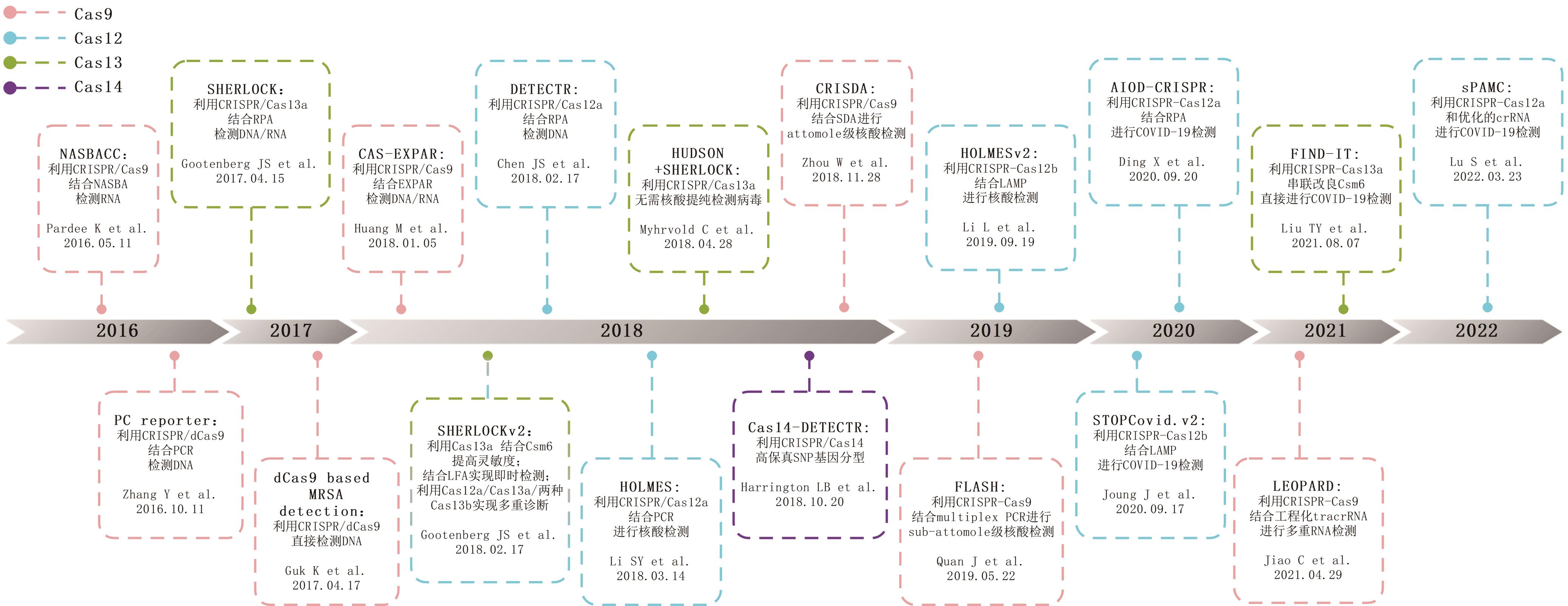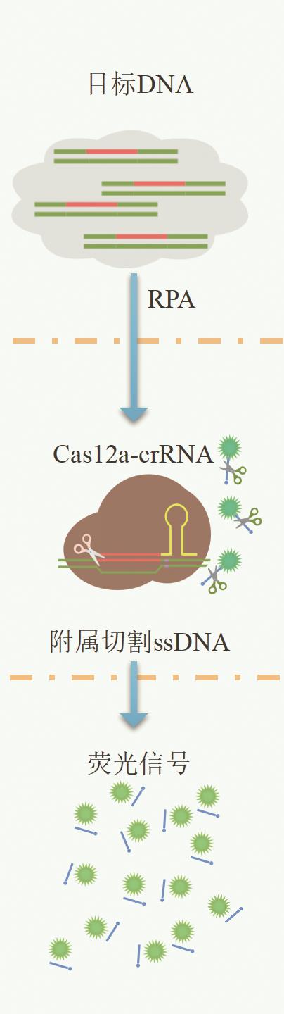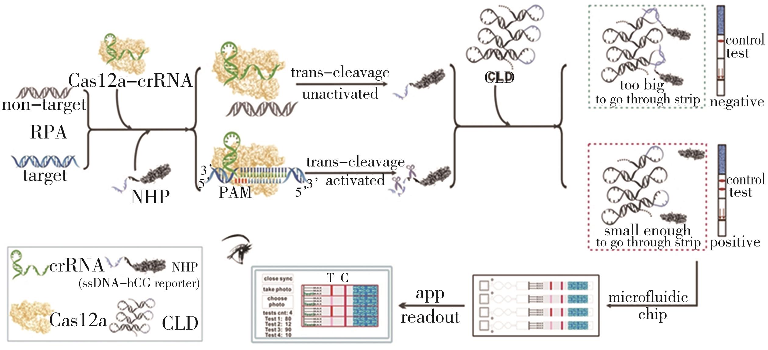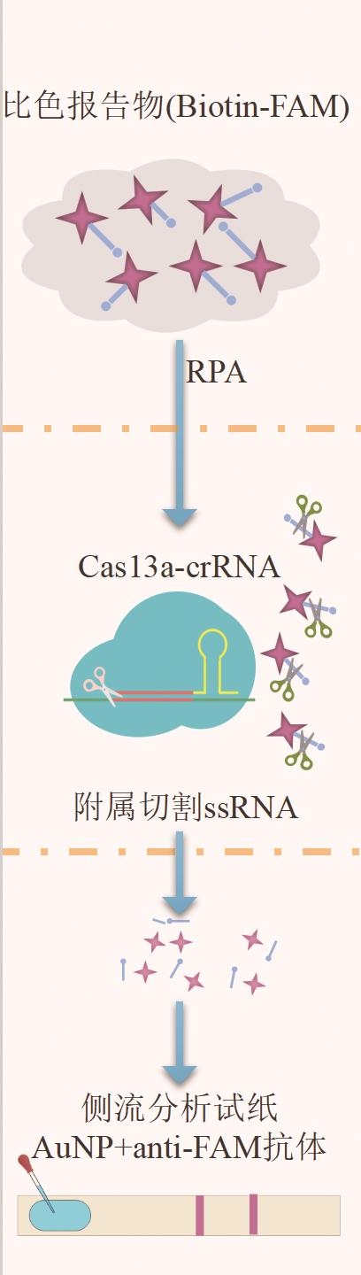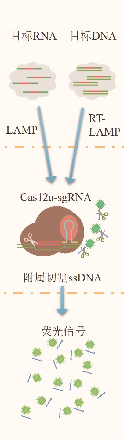 摘要:在全球疫情背景下,现场条件下的核酸检测在疫情防控中发挥越来越重要的作用,这促使核酸即时检测(point-of-care testing,POCT)工具的开发面临空前的需求。基于规律间隔成簇短回文重复序列及其相关蛋白系统(clustered regularly interspaced short palindromic repeats-associated nuclease,CRISPR/Cas)应用于核酸POCT在近年来得到飞速发展并取得良好成果。在疫情封控区、海关以及灾区等特殊现场,可以将恒温放大技术与CRISPR有机结合并集成到小型手持设备中,这些技术使用起来更简单,非专业人员能够更快捷准确地进行感染源的核酸检测。这篇综述首先简要介绍了CRISPR/Cas系统和不同的效应蛋白,回顾了基于CRISPR/Cas系统特异识别和切割特性在核酸POCT中的不同应用策略,最后讨论CRISPR/Cas用于核酸POCT面临的挑战及未来的研究前景。