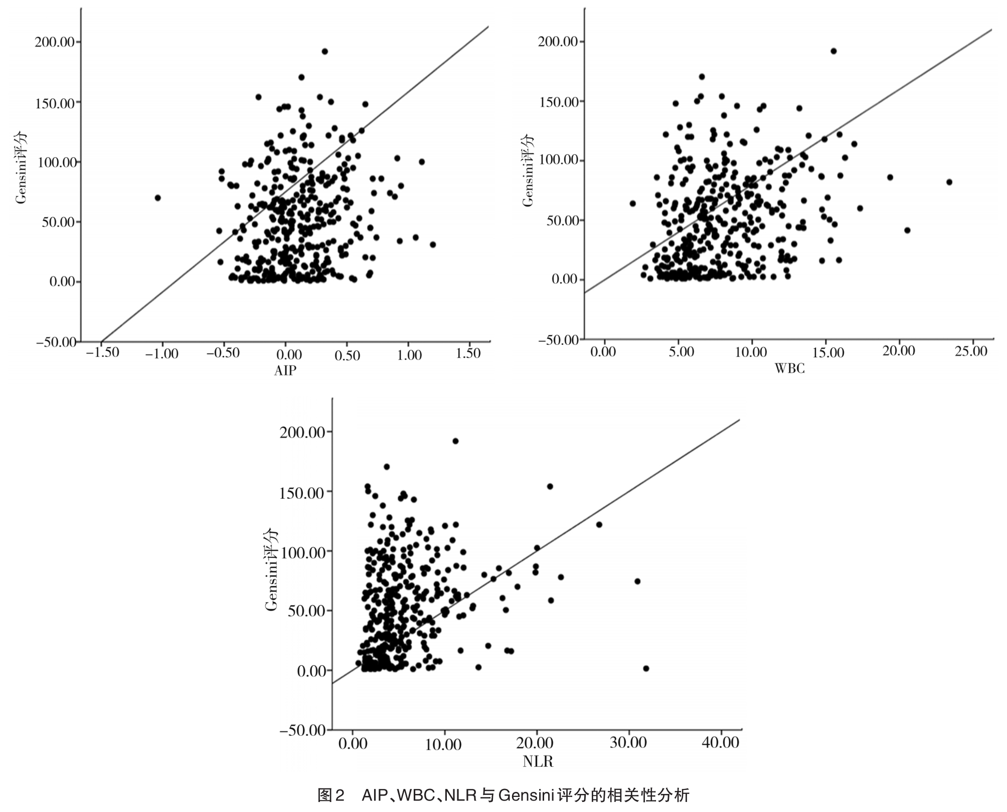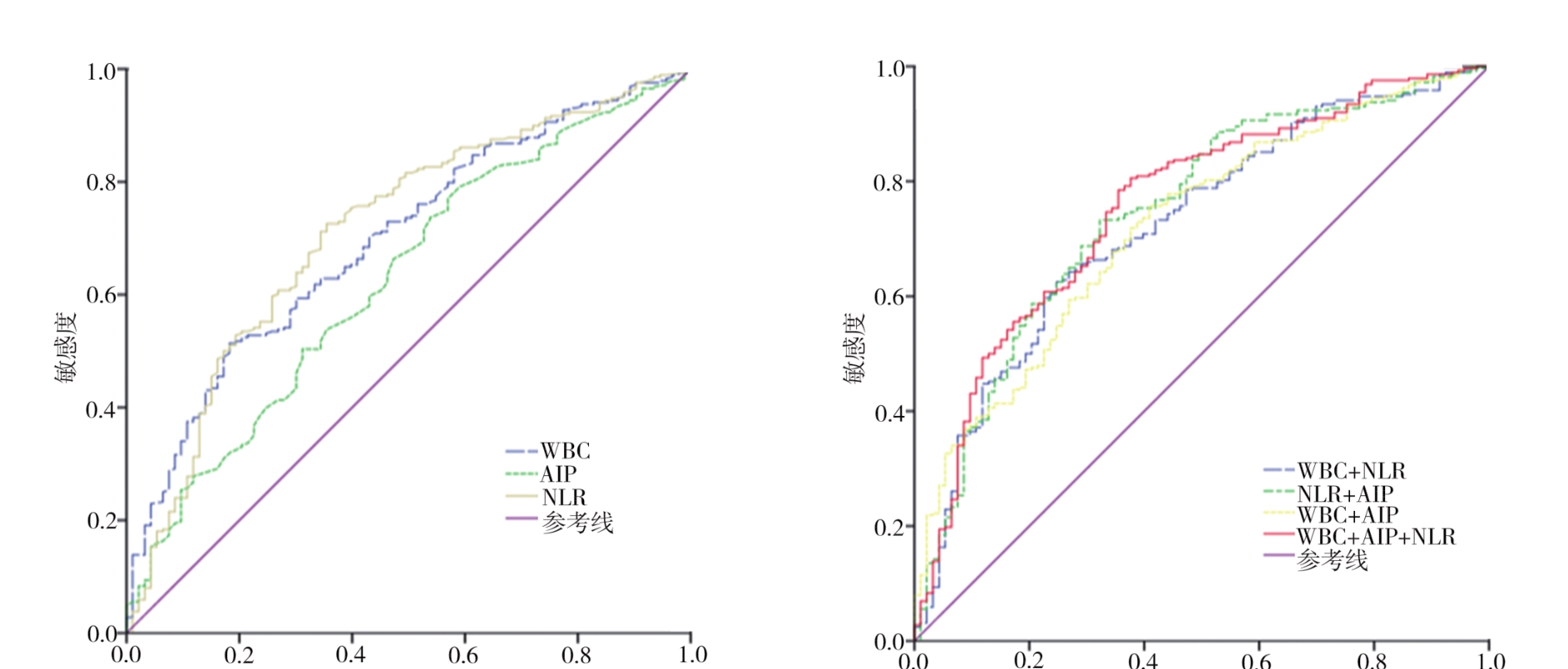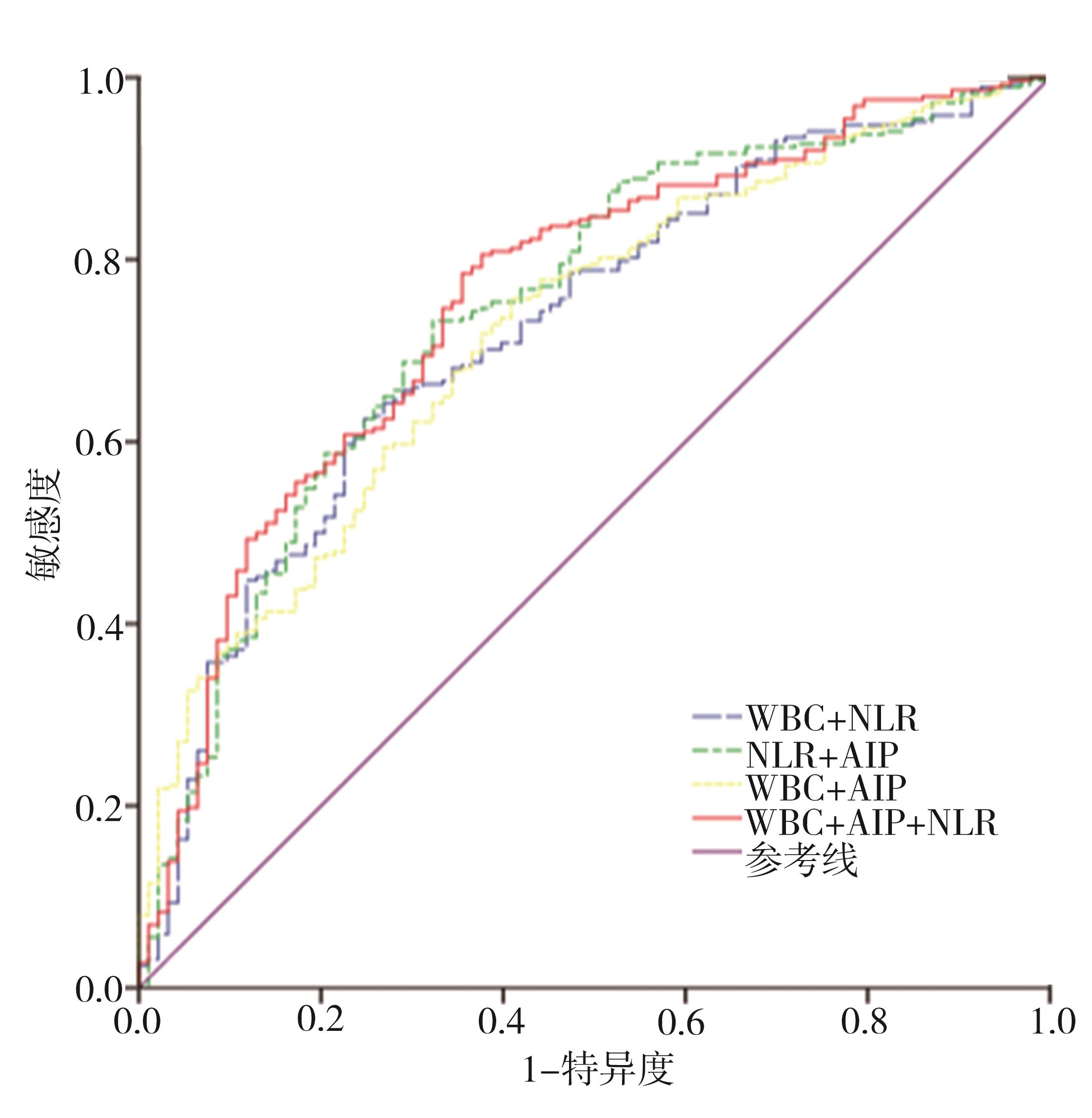摘要:目的 探讨血浆动脉粥样硬化指数(atherosclerotic index of plasma,AIP)、白细胞(white blood cells,WBC)计数和中性粒细胞淋巴细胞比值(neutrophil lymphocyte ratio,NLR)对急性冠状动脉综合征(acute coronary syndrome,ACS)的风险预测和冠脉病变程度的评估价值。方法 将2019年1月至2021年12月期间首次就诊的疑似冠心病患者分为ACS组(n=288)和非ACS组(n=93)进行对比研究。采用受试者工作特征(receiver operating characteristic,ROC)曲线、多因素logistic回归分析和Spearman秩相关分析方法评估AIP、WBC计数和NLR对ACS的预测价值及与Gensini评分的相关性。结果 ACS组AIP、WBC计数和NLR高于非ACS组(t/Z=3.623、6.697、-6.165,P<0.001)。多因素logistic回归分析结果显示,AIP、WBC计数和NLR 3个指标均是ACS的独立危险因素,排除混杂因素后,AIP、WBC、NLR每增加一个单位,ACS发生风险分别增加6.739倍(95%CI=2.829~21.169,P<0.001)、0.260倍(95%CI=1.113~1.426,P<0.001)和0.145倍(95%CI=1.036~1.265,P=0.008)。AIP、WBC计数和NLR预测ACS的曲线下面积(area under the curve,AUC)分别为0.627(95%CI=0.563~0.692,P<0.001)、0.696(95%CI=0.638~0.755,P<0.001)和0.713(95%CI=0.652~0.773,P<0.001),三指标联合预测的AUC为0.756(95%CI=0.700~0.813,P<0.001)。高AIP、高WBC、高NLR组发生完全闭塞、左主干/多支病变的比例和Gensini评分均高于低值组(均P<0.05),三者与Gensini评分呈正相关(r=0.188、0.313、0.332,均P<0.001)。结论 AIP、WBC计数和NLR是ACS发生的独立危险因素,三者联合对ACS风险有一定预测价值,且与冠状动脉病变严重程度显著正相关,有望成为ACS风险预测及病情评估的潜在标志物。