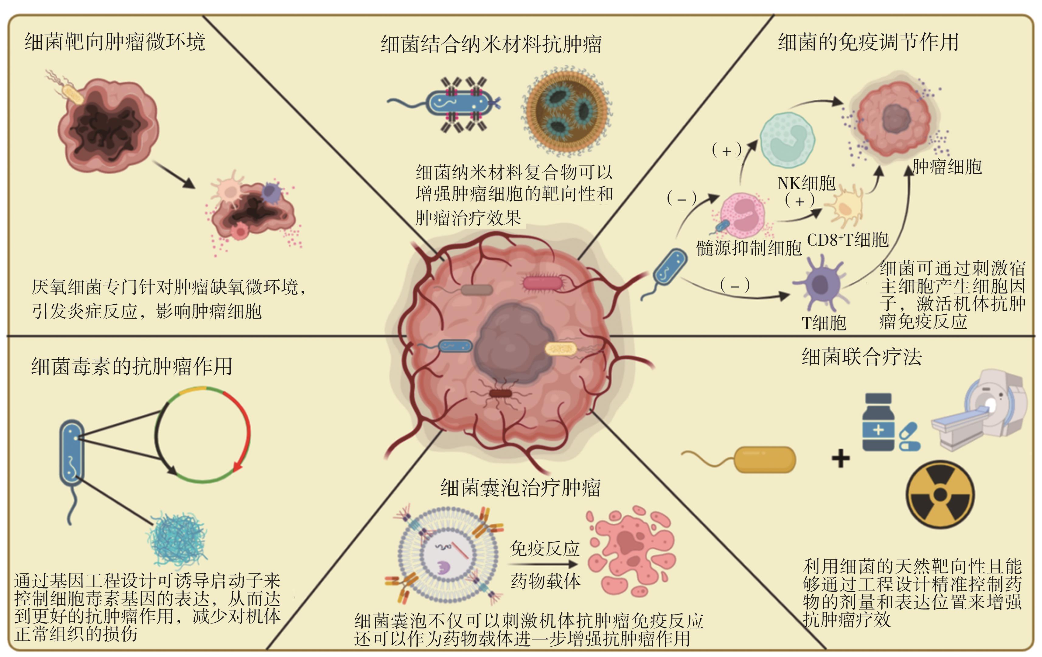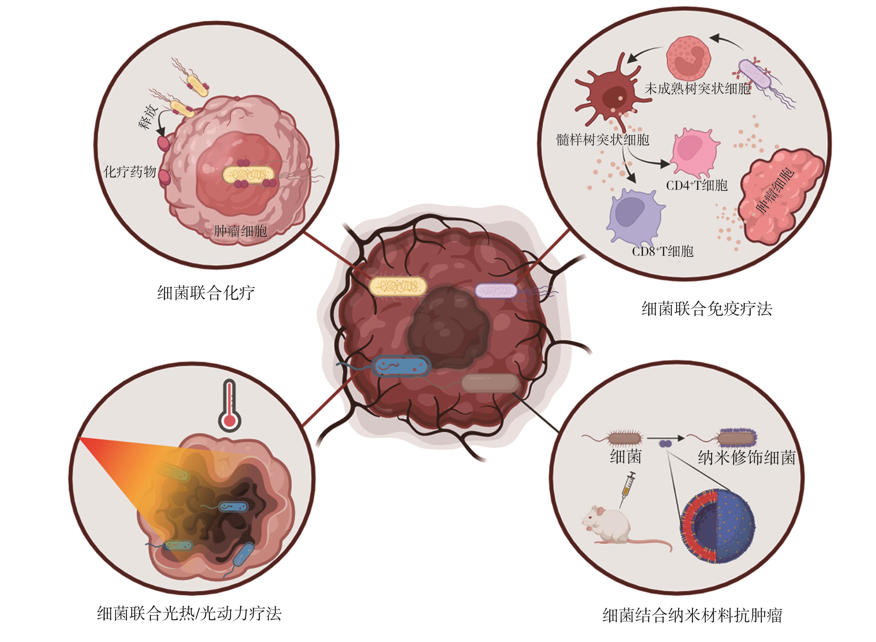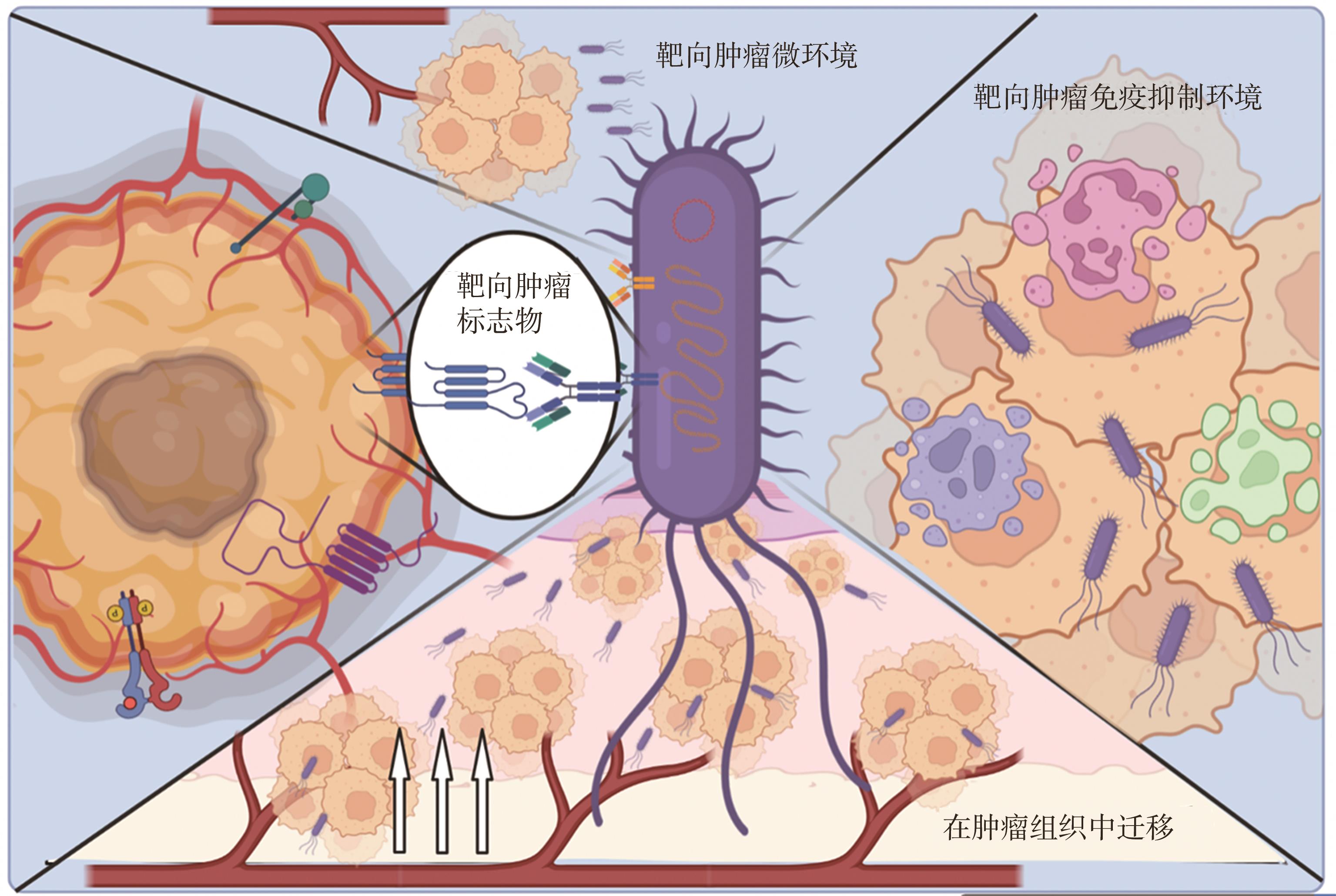 摘要:肿瘤是危害人类健康的严重疾病,探索新型肿瘤治疗方式、提高其靶向性和药物递送效率、避免肿瘤细胞免疫逃逸、降低副反应是目前肿瘤治疗研究的热点问题。细菌既可以依赖天然的特性靶向缺氧、低pH、高渗透性和免疫抑制的肿瘤微环境,又可以通过免疫调节、细菌毒素促凋亡、抑制血管新生等机制发挥抗肿瘤作用。同时,研究者可以利用基因工程技术改造细菌,使之成为靶向性更高、穿透性更好的工程菌。此外,利用细菌外膜囊泡装载化疗药物或结合纳米材料抗肿瘤以及细菌联合化疗、放疗、光热/光动疗法的出现,使得细菌治疗肿瘤方面研究进展迅速。本文综述了近年来细菌介导肿瘤治疗的最新研究进展,并展望了其未来的发展方向。