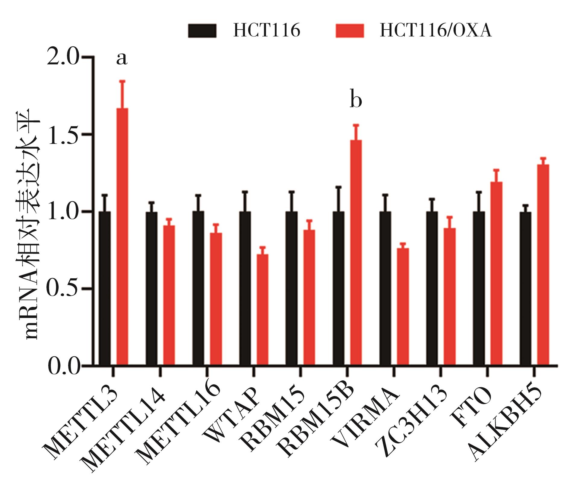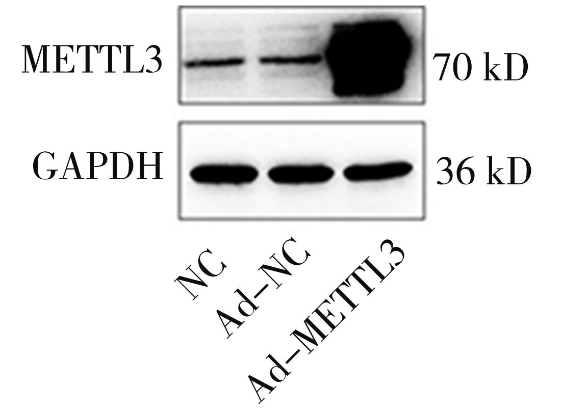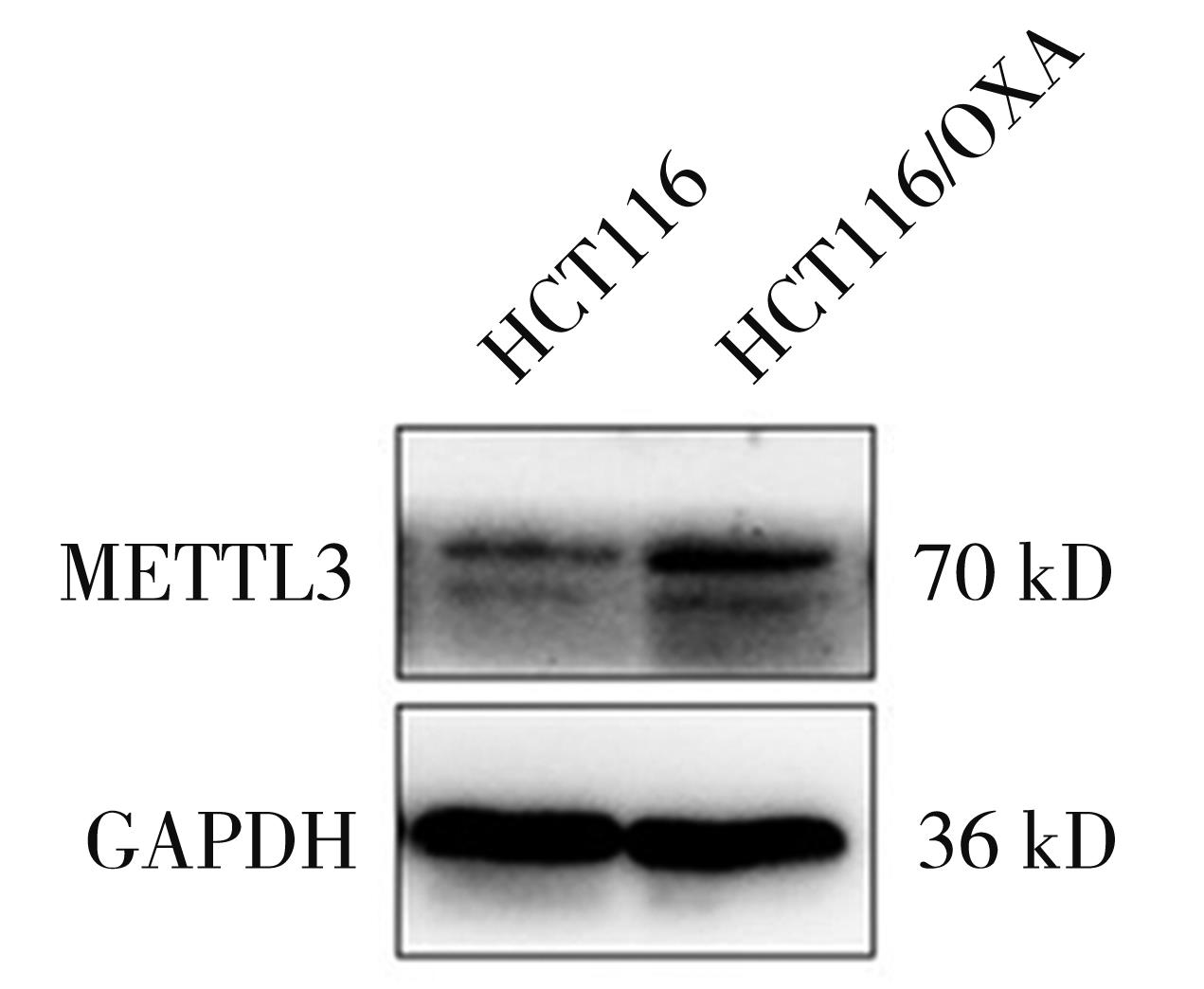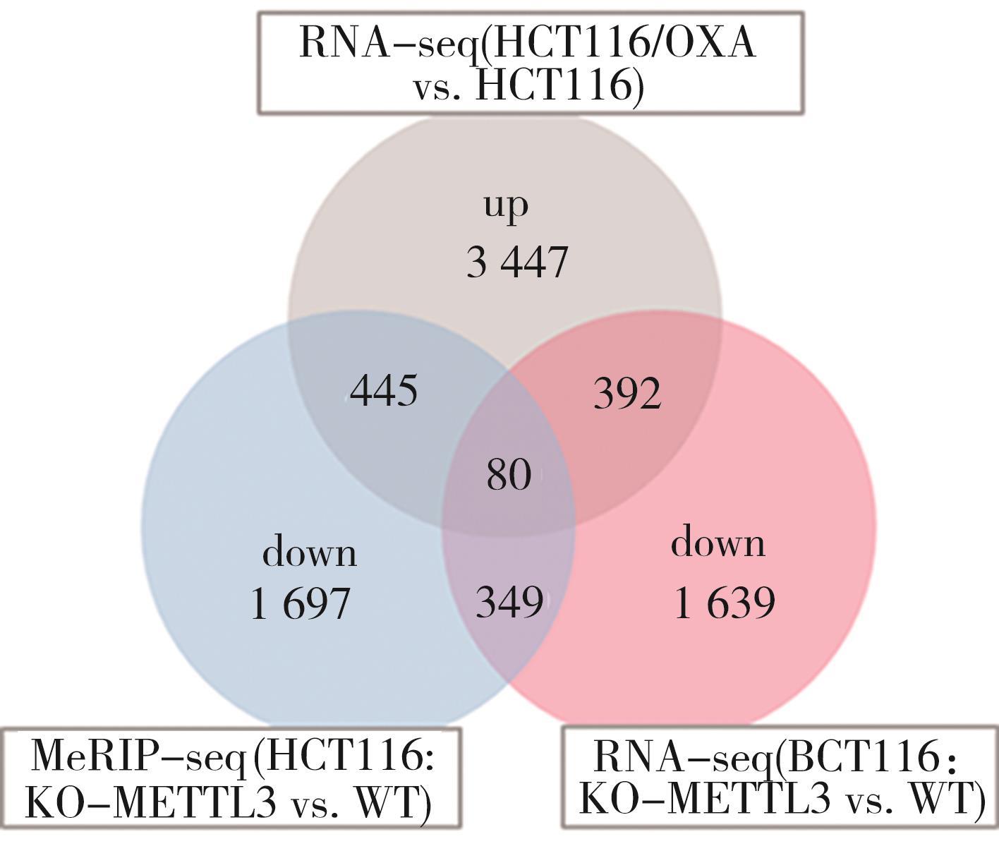 摘要:目的 探究N6-甲基腺嘌呤(N6-methyladenosine,m6A)调控因子甲基转移酶样蛋白3(methyltransferase-like 3,METTL3)在结直肠癌奥沙利铂(oxaliplatin,OXA)耐药中的作用。方法 采用浓度梯度法构建OXA耐药细胞株HCT116/OXA,CCK-8分析其耐药性;采用Dot blot及m6A RNA甲基化定量ELISA实验检测细胞RNA m6A水平,RNA-seq及qRT-PCR筛选差异m6A调控因子,Western blot验证METTL3表达水平;利用腺病毒感染技术在HCT116细胞过表达METTL3,CCK-8检测各组细胞的增殖活性;通过对GEO数据库中HCT116细胞敲除METTL3的MeRIP-seq和RNA-seq数据与耐药细胞RNA-seq联合分析,筛选耐药相关的METTL3介导m6A修饰调控的下游靶基因及信号通路;TCGA数据库分析METTL3与患者预后的相关性。结果 HCT116/OXA细胞对OXA的耐药性明显高于其亲代细胞(P<0.01);与HCT116相比,耐药细胞的RNA m6A水平异常上调(P<0.01),且伴随METTL3的mRNA和蛋白水平升高;过表达METTL3明显增强HCT116细胞对OXA的耐药性(P<0.01);多组学数据联合分析筛选的METTL3介导m6A修饰调控的与耐药相关的关键基因主要富集在ABC转运蛋白、干细胞多能性调节信号通路、TGF-β信号通路等;METTL3高表达与结直肠癌患者的不良预后明显相关(P<0.01)。结论 METTL3介导的m6A修饰可能通过调节ABC转运蛋白、调节干细胞多能性的信号通路、TGF-β信号通路等经典耐药信号通路促进结直肠癌OXA耐药。