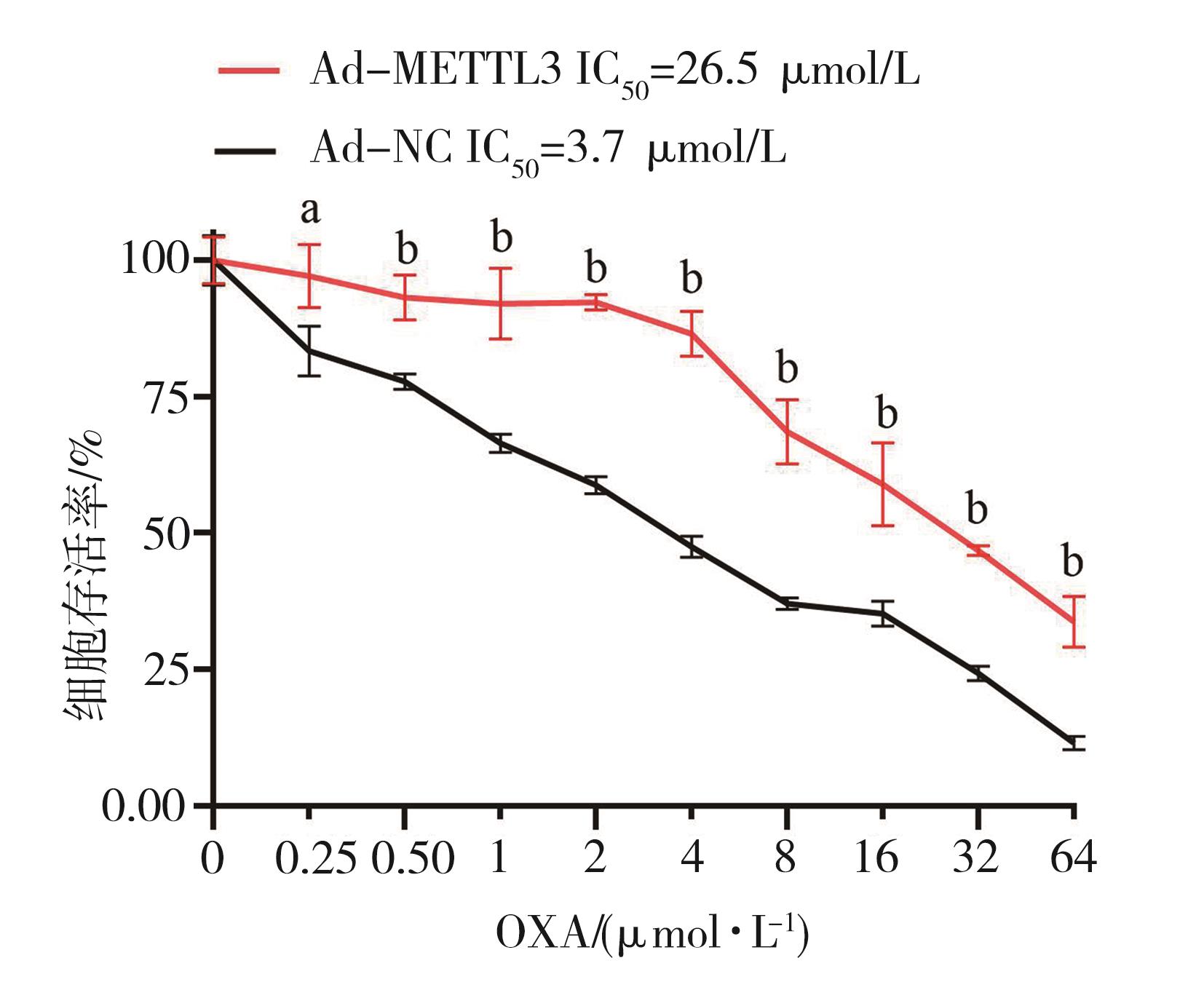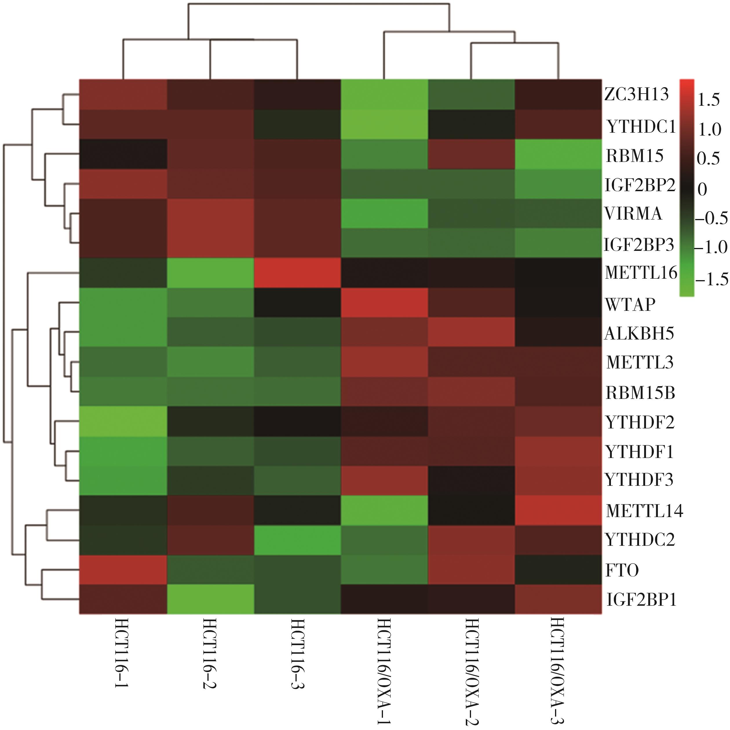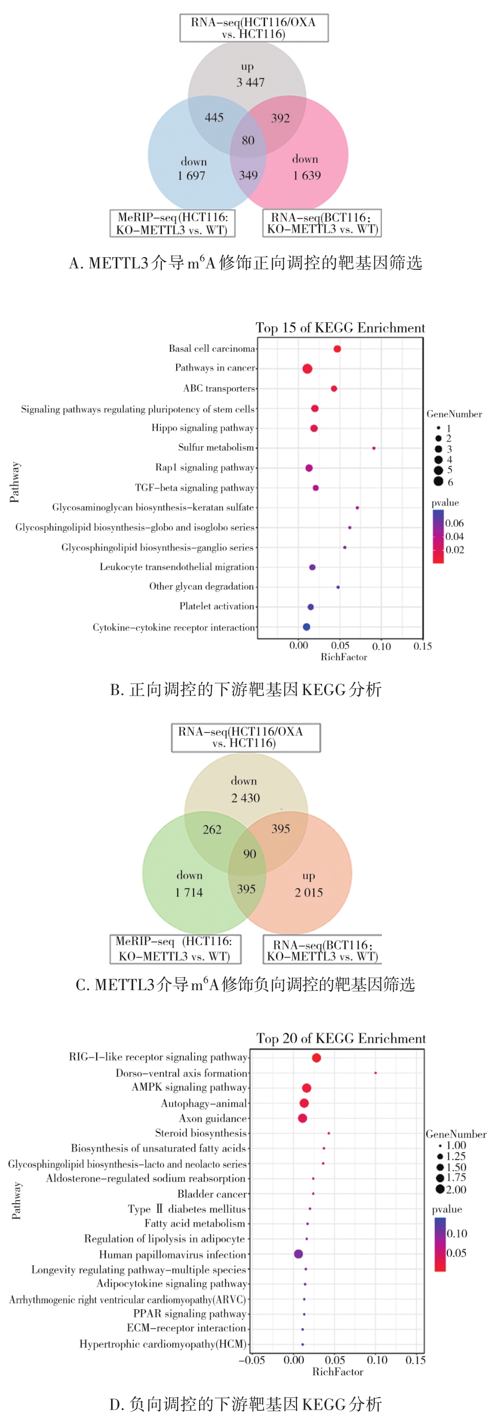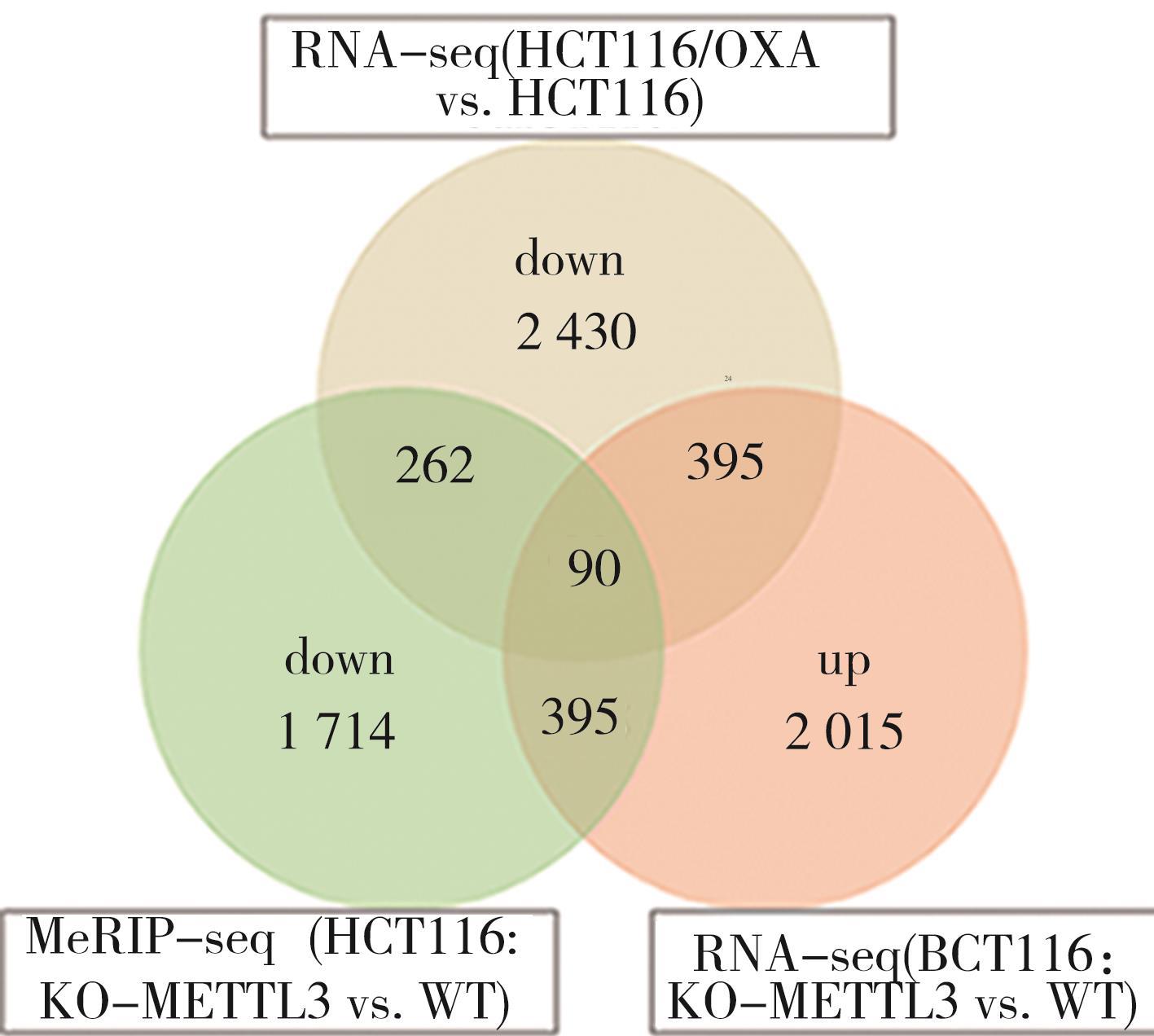 摘要:目的 探究N6-甲基腺嘌呤(N6-methyladenosine,m6A)调控因子甲基转移酶样蛋白3(methyltransferase-like 3,METTL3)在结直肠癌奥沙利铂(oxaliplatin,OXA)耐药中的作用。方法 采用浓度梯度法构建OXA耐药细胞株HCT116/OXA,CCK-8分析其耐药性;采用Dot blot及m6A RNA甲基化定量ELISA实验检测细胞RNA m6A水平,RNA-seq及qRT-PCR筛选差异m6A调控因子,Western blot验证METTL3表达水平;利用腺病毒感染技术在HCT116细胞过表达METTL3,CCK-8检测各组细胞的增殖活性;通过对GEO数据库中HCT116细胞敲除METTL3的MeRIP-seq和RNA-seq数据与耐药细胞RNA-seq联合分析,筛选耐药相关的METTL3介导m6A修饰调控的下游靶基因及信号通路;TCGA数据库分析METTL3与患者预后的相关性。结果 HCT116/OXA细胞对OXA的耐药性明显高于其亲代细胞(P<0.01);与HCT116相比,耐药细胞的RNA m6A水平异常上调(P<0.01),且伴随METTL3的mRNA和蛋白水平升高;过表达METTL3明显增强HCT116细胞对OXA的耐药性(P<0.01);多组学数据联合分析筛选的METTL3介导m6A修饰调控的与耐药相关的关键基因主要富集在ABC转运蛋白、干细胞多能性调节信号通路、TGF-β信号通路等;METTL3高表达与结直肠癌患者的不良预后明显相关(P<0.01)。结论 METTL3介导的m6A修饰可能通过调节ABC转运蛋白、调节干细胞多能性的信号通路、TGF-β信号通路等经典耐药信号通路促进结直肠癌OXA耐药。
