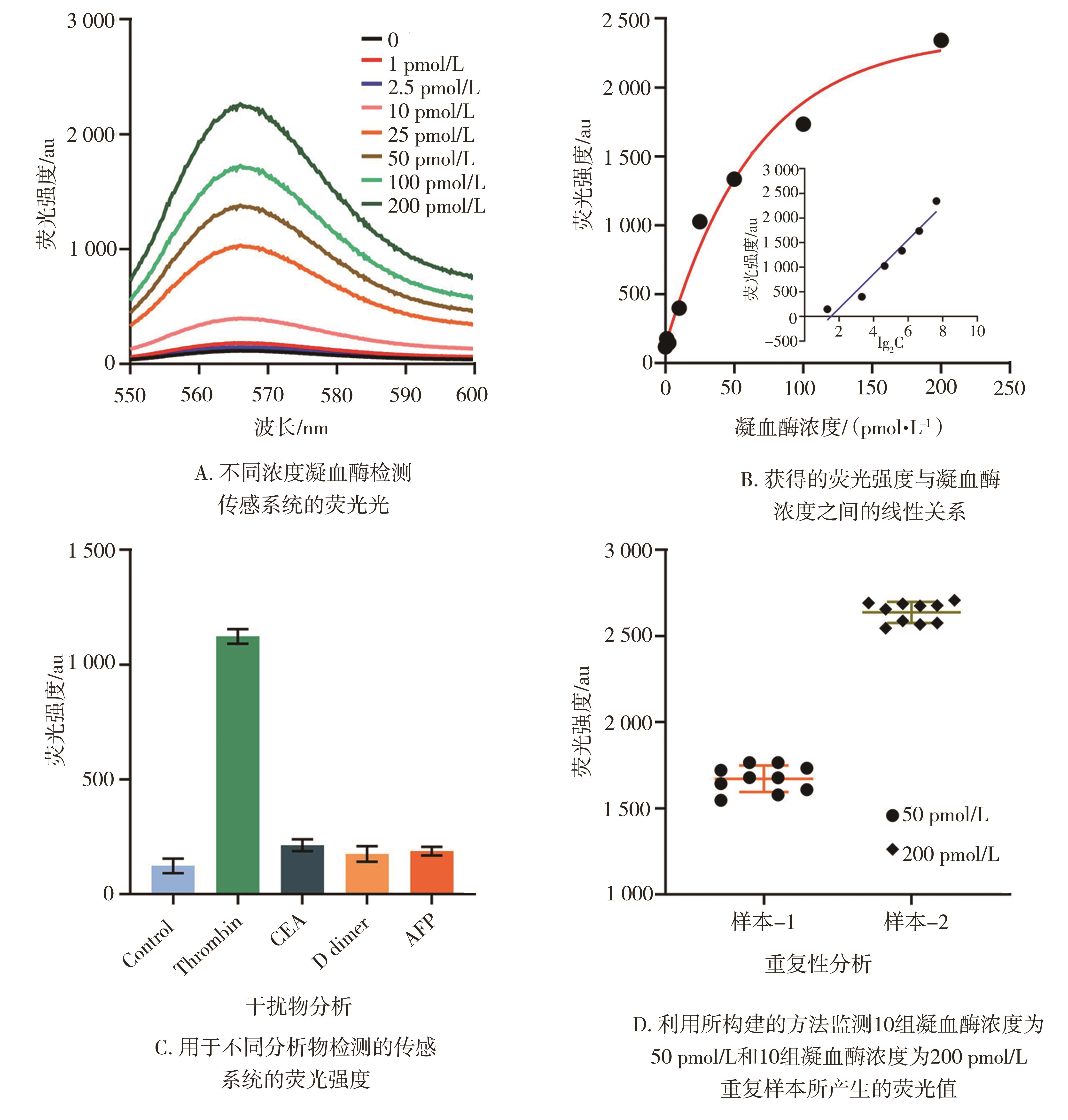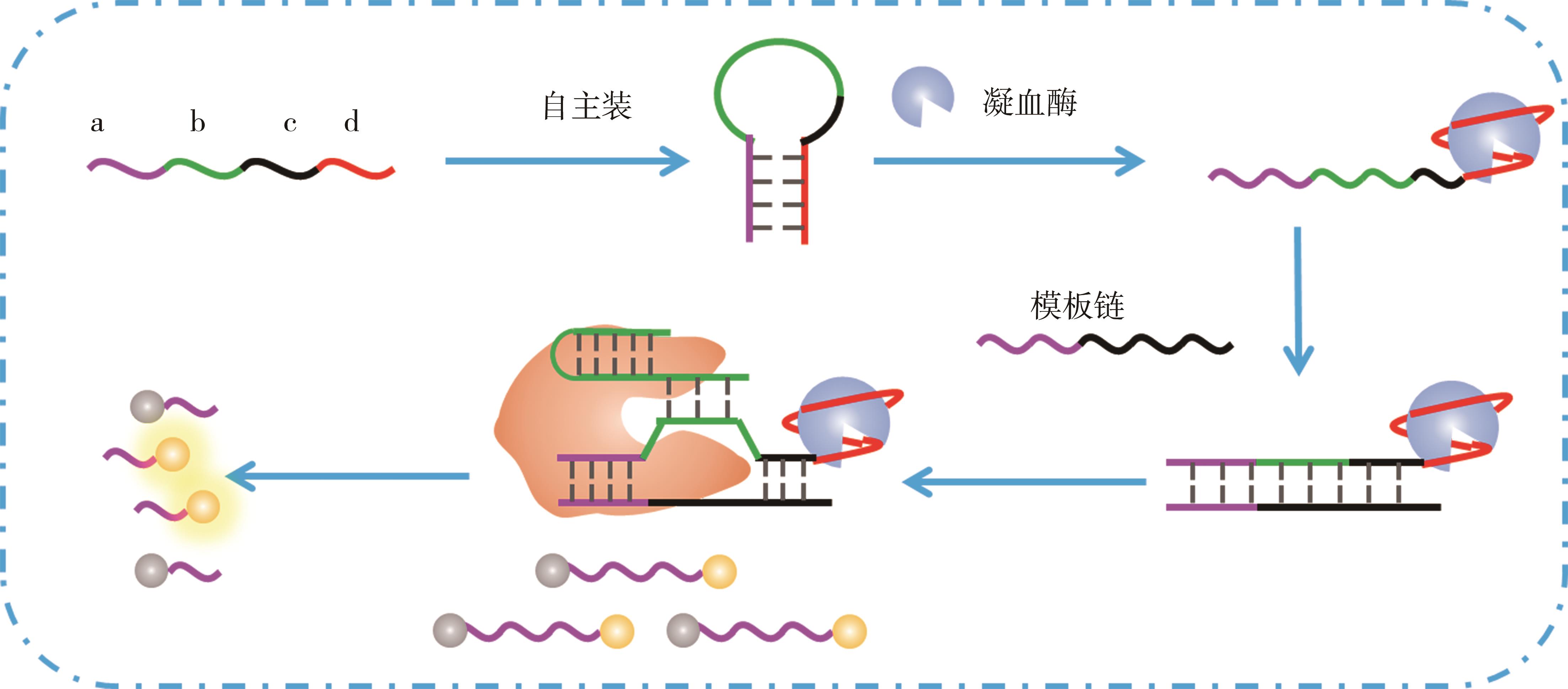 摘要:目的 通过构建快速、灵敏的凝血酶检测技术,为多种血管栓塞性疾病,如脑静脉窦血栓形成(cerebral venous sinus thrombosis,CVST)的早期诊断和治疗提供新的策略。方法 利用所筛选的高特异性凝血酶适配体设计发夹结构变构探针,用于高特异性识别凝血酶并将凝血酶信号转化为核酸信号。在变构探针识别凝血酶后,适配体结合凝血酶引发变构探针变构,暴露Cas12a活性部分。CRISPR-Cas12a系统识别活性部分后,其反式切割特性被触发,开始无序切割周围存在的单链DNA荧光探针,导致标记在荧光探针两端的荧光基团(Cy3)和淬灭基团(BHQ)分离,使处于被淬灭状态的Cy3荧光重新出现。所产生的荧光信号的强度与体系中存在的凝血酶浓度呈正相关。结果 通过荧光实验证实所设计的变构探针对凝血酶表现出极高的识别特异性和稳定性;在所优化的实验条件下,该方法表现出良好的检测性能,检测限为0.23 pmol/L。结论 该方法结合了高灵敏度、低成本和良好的便携性等优点,为凝血酶相关疾病的检测与精准诊断提供了强有力的技术支持。