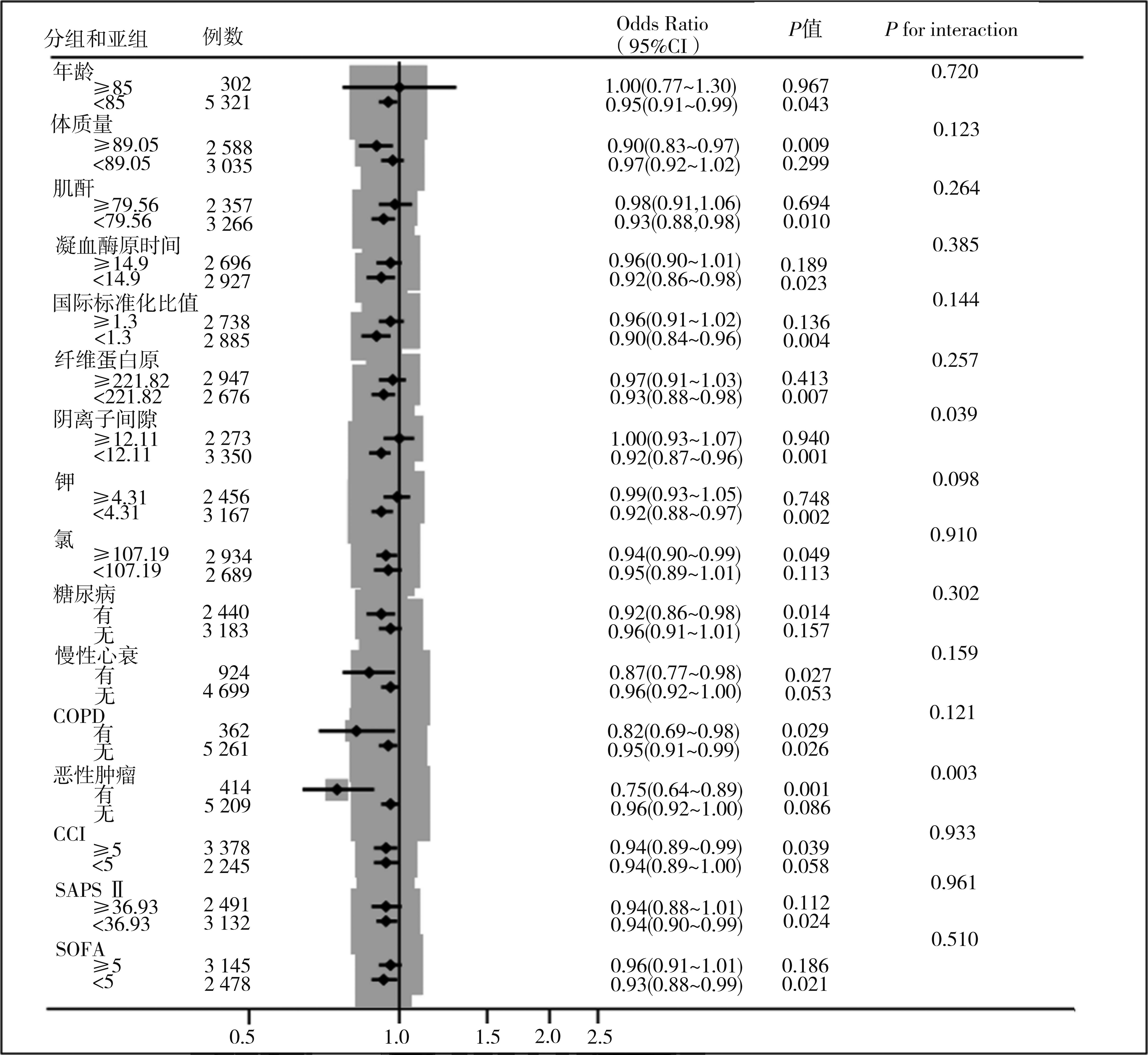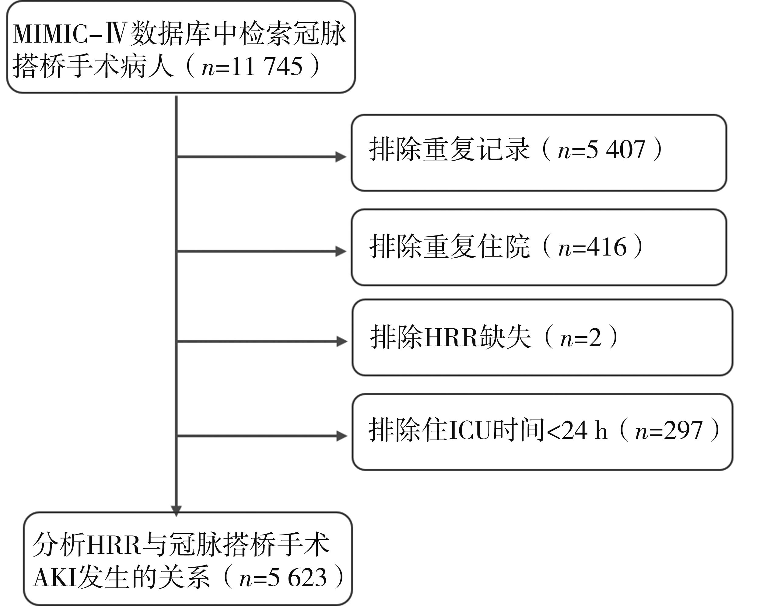 摘要:目的 研究血红蛋白-红细胞分布宽度比值(hemoglobin / red blood cell distribution width ratio,HRR)与冠脉搭桥手术(coronary artery bypass grafting,CABG)后急性肾损伤(acute kidney injury,AKI)发生风险的相关性。方法 选择重症监护数据集(Medical Information Mart for Intensive Care Database,MIMIC)-Ⅳ中所有CABG术后患者作为研究对象,根据是否发生AKI分为2组。比较分析2组一般资料,并将有统计学差异的变量纳入logistic单因素回归分析,以单因素分析中P<0.05的变量纳入多因素logistic回归分析。Logistic回归模型评估HRR对CABG术后AKI风险的预测价值。亚组分析采用层次回归模型。结果 共5 623例患者纳入研究,AKI组4 342例,非AKI组1 281例。AKI组患者入院时HRR水平明显低于非AKI组(P<0.001)。多因素回归模型显示HRR是预测CABG术后AKI风险的独立危险因子(OR=0.92,95%CI=0.88~0.96,P<0.001)。Logistic回归模型发现,在模型Ⅲ中(调整潜在混杂因素),HRR水平降低仍然是CABG术后发生AKI的独立影响因素。亚组分析发现HRR与AKI发生的相关性在大多数协变量中相似。结论 低HRR水平是CABG术后AKI发生风险的独立危险因素。