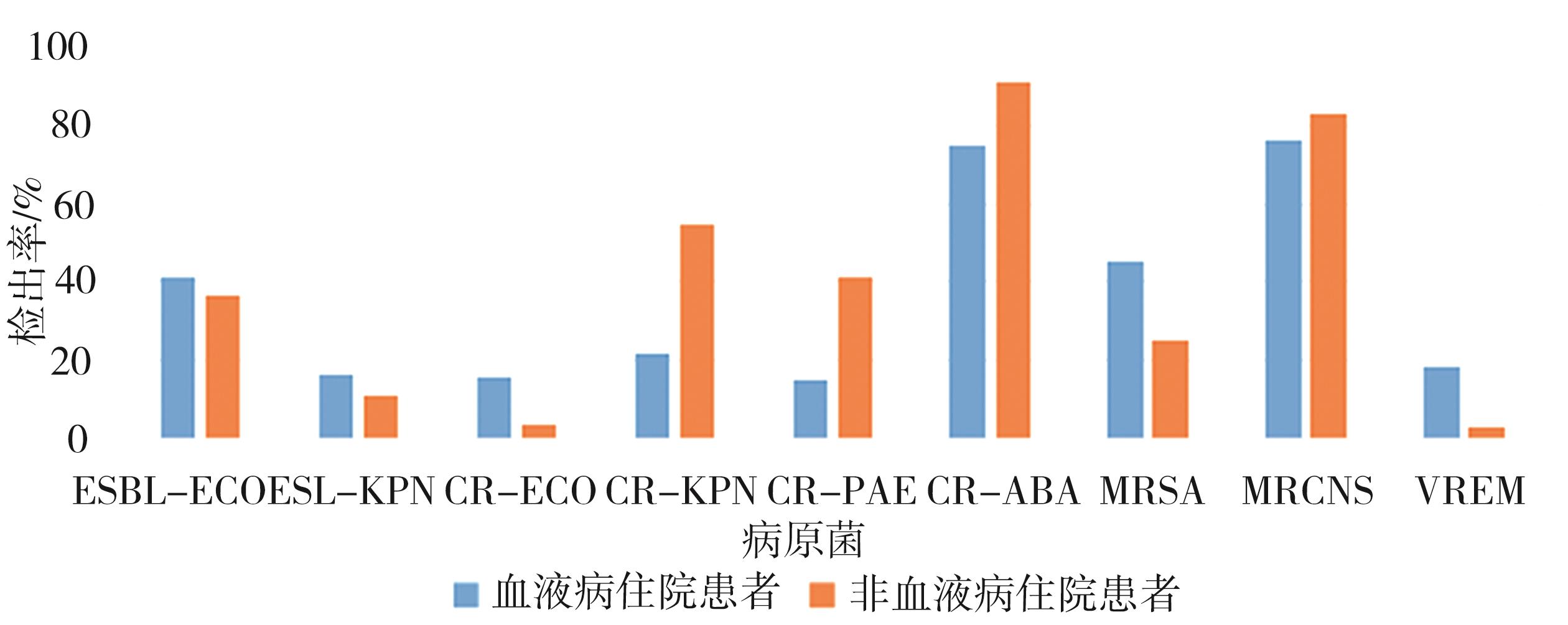 摘要:目的 分析解放军总医院血液病住院患者血流感染病原菌的分布特点和耐药性,为临床合理选用抗菌药物提供参考依据。方法 对2019年至2021年血液病和非血液病住院患者送检的血培养及药敏结果进行回顾性分析,用VITEK-2微生物分析仪进行微生物鉴定和药敏试验。结果 血液病患者血培养阳性标本病原菌以革兰阴性杆菌为主(71.2%),其次是革兰阳性菌(26.8%)、真菌(2.0%);主要病原菌有大肠埃希菌、肺炎克雷伯菌、凝固酶阴性葡萄球菌、铜绿假单胞菌等;主要革兰阴性菌对阿米卡星、亚胺培南、美罗培南敏感率较高;主要革兰阳性菌对万古霉素、利奈唑胺敏感率较高;葡萄球菌属未发现万古霉素、替加环素和利奈唑胺耐药株;分离的真菌对二性霉素B和伏立康唑的敏感率高。对血液病和非血液病患者血流感染的病原菌进行比较,发现血液病患者铜绿假单胞菌和嗜麦芽窄食单胞菌构成比高于非血液病患者,凝固酶阴性葡萄球菌和白色假丝酵母菌明显低于非血液病患者(P<0.05)。血液病患者大肠埃希菌对碳青霉烯类药物、喹诺酮类药物等的耐药率高于非血液病患者,差异有统计学意义(P<0.05);肺炎克雷伯菌和铜绿假单胞菌对碳青霉烯类、喹诺酮类等抗菌药物的耐药率均低于非血液病患者,差异有统计学意义(P<0.05)。结论 革兰阴性菌是引起本院血液病住院患者血流感染最主要的病原菌,以大肠埃希菌最为常见,与本院非血液病患者病原菌分布结果大致相同。革兰阴性菌对阿米卡星、亚胺培南、美罗培南、哌拉西林/他唑巴坦敏感率高,革兰阳性菌对万古霉素、利奈唑胺敏感率高。本研究发现血液病患者大肠埃希菌对碳青霉烯类药物、喹诺酮类药物等的耐药率高于非血液病患者,在临床诊治中应加强对碳青霉烯类药物和喹诺酮类药物的关注和监控,及时进行病原菌和耐药性监测、正确选用抗菌药物、及早控制血流感染,对预后非常重要。