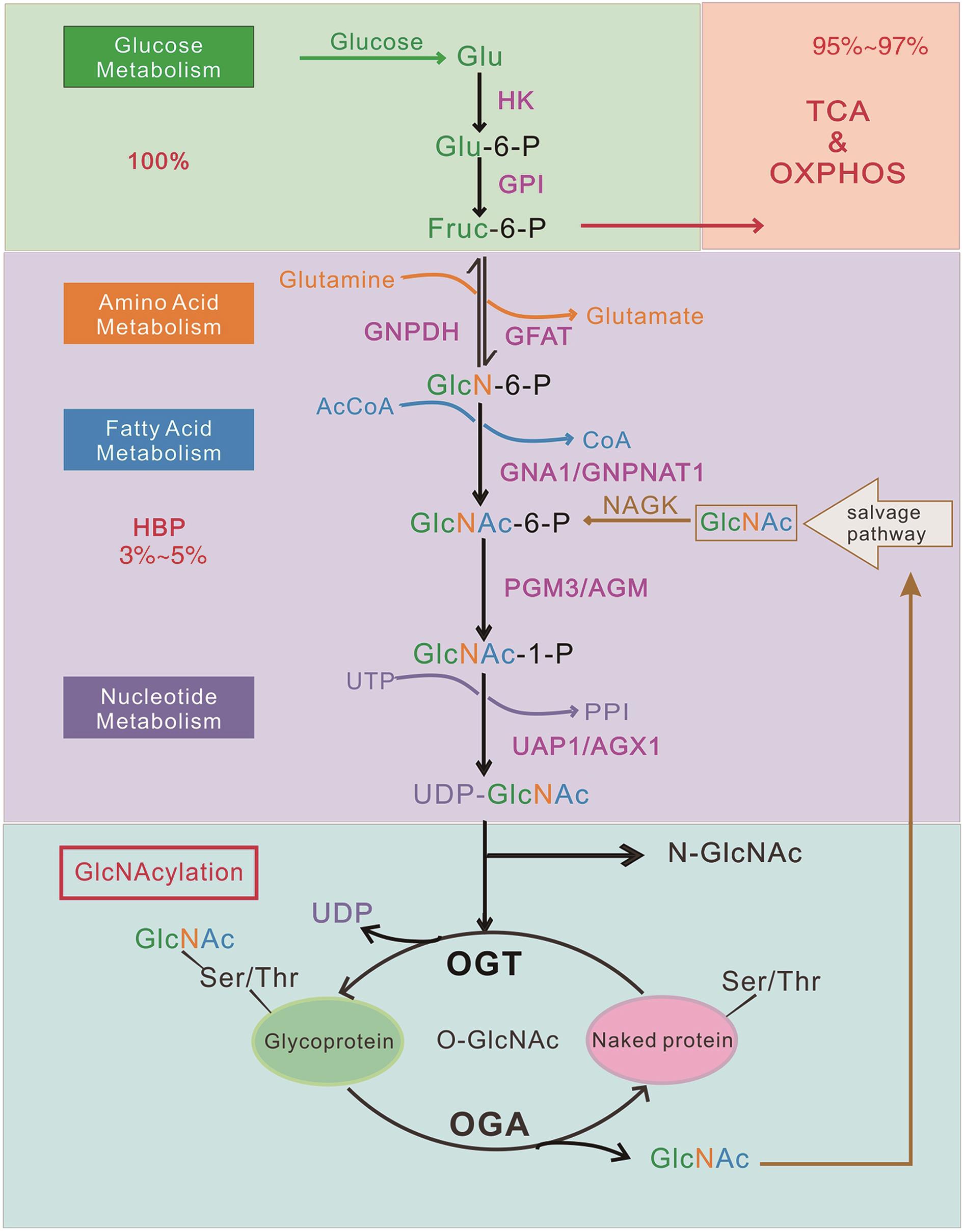 摘要:细胞代谢异常和能量失调被认为是癌症的重要标志。己糖胺生物合成途径(hexosamine biosynthetic pathway,HBP)在多数肿瘤中异常激活。葡萄糖、脂肪酸、氨基酸和谷氨酰胺等是肿瘤生长的重要营养物质,并作为HBP的底物用于合成尿苷二磷酸N -乙酰氨基葡萄糖胺(uridine diphosphate N-acetylglucosamine,UDP-GlcNAc)。UDP-GlcNAc是蛋白质发生氧连接的氮乙酰葡萄糖胺(O-linked N-acetylglucosamine,O-GlcNAc)修饰的供体底物,其被认为在细胞中扮演着“营养感受器”的角色。近年来,HBP代谢酶在癌症病理生理学中的作用被广泛研究,HBP介导的O-GlcNAc糖基化修饰与癌细胞的增殖、存活和转移密切相关。本文对HBP及其在肿瘤中的重要作用进行了综述,并且讨论了靶向HBP治疗癌症的潜在策略。