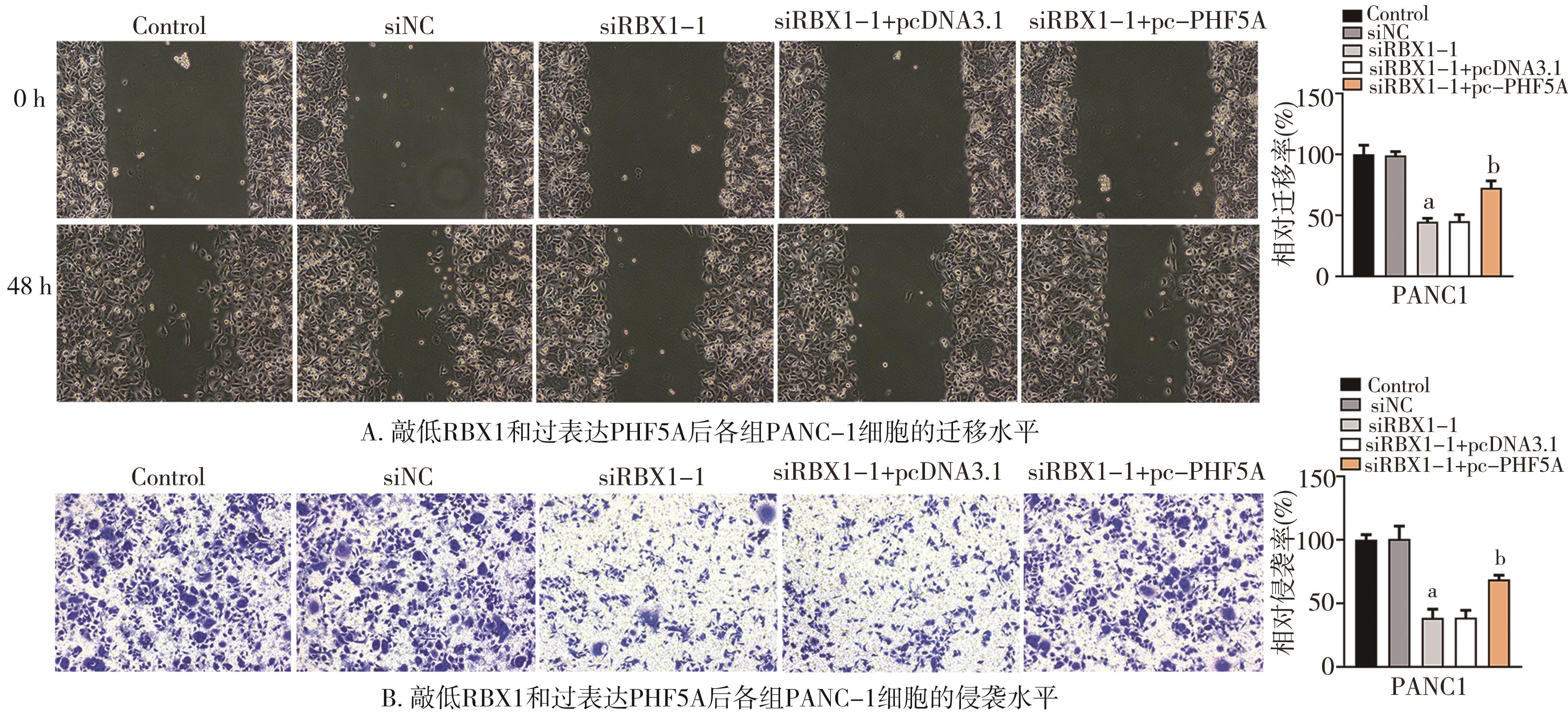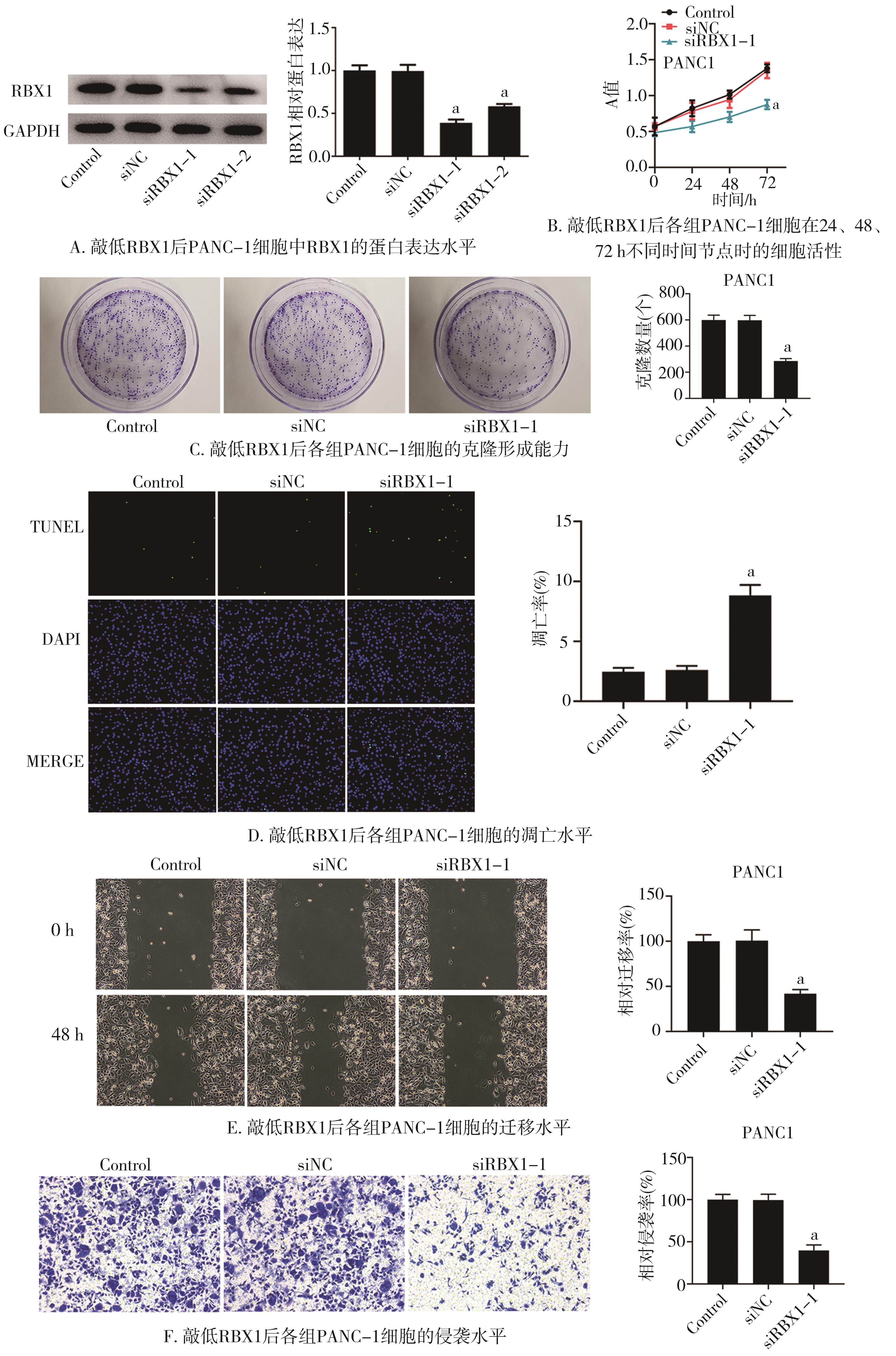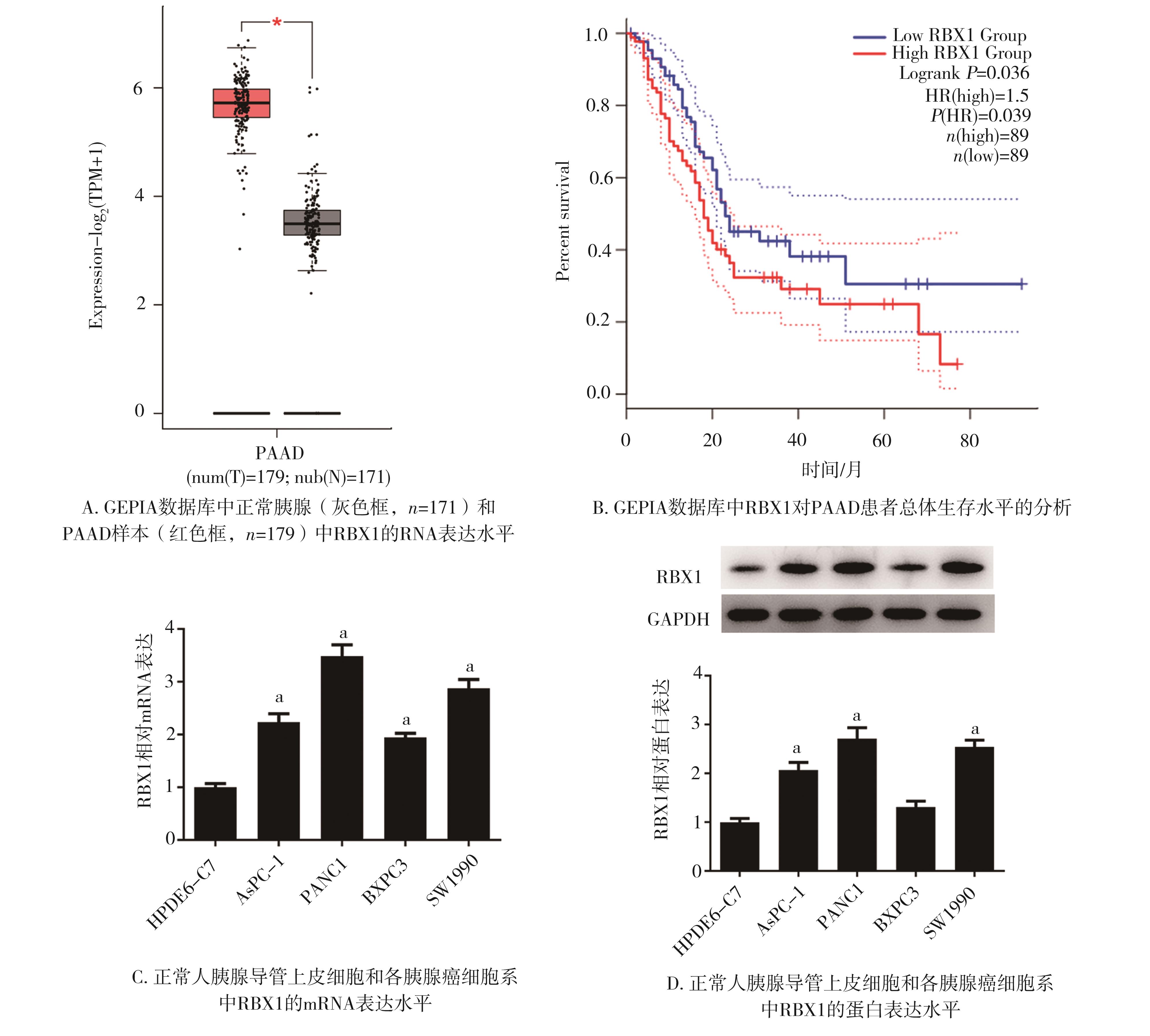 摘要:目的 研究环盒蛋白1(ring-finger protein 1,RBX1)对胰腺癌(pancreatic adenocarcinoma,PAAD)细胞增殖、凋亡、迁移和侵袭的作用及其潜在的作用机制。方法 利用基因表达谱交互式分析网站(gene expression profile interactive analysis website,GEPIA),实时荧光定量聚合酶链反应(quantitative reverse transcription-polymerase chain reaction,qRT-PCR)、Western blot检测RBX1在PAAD组织、细胞中的表达和预后价值。使用细胞计数试剂盒-8(cell counting kit-8,CCK-8)、细胞克隆形成能力实验、脱氧核糖核苷酸末端转移酶介导的缺口末端标记法(terminal deoxynucleotidyl transferase dUTP nick end labeling,TUNEL)、细胞划痕实验、Transwell实验检测RBX1敲低对胰腺癌-1(pancreatic carcinoma-1,PANC-1)细胞增殖、凋亡、迁移和侵袭的影响。通过LinkedOmics网站研究PAAD中RBX1和PHD锌指结构域蛋白5A(plant homodomain finger-like domain-containing protein 5A,PHF5A)的相关性。qRT-PCR和Western blot检测RBX1敲低后PHF5A的表达,进行功能拯救实验。结果 RBX1在PAAD组织和细胞系中高表达,与不良预后相关(P<0.05)。RBX1敲低抑制PANC-1细胞增殖、迁移和侵袭,促进细胞凋亡(P<0.05)。RBX1和PHF5A在PAAD中具有相关性(r=0.692),且RBX1正向调控PHF5A表达(P<0.05)。功能拯救实验表明PHF5A过表达部分逆转了RBX1敲低对PANC-1细胞增殖、迁移、侵袭和凋亡的作用(P<0.05)。结论 RBX1敲低通过下调PHF5A表达抑制PANC-1细胞增殖、迁移和侵袭,促进凋亡。