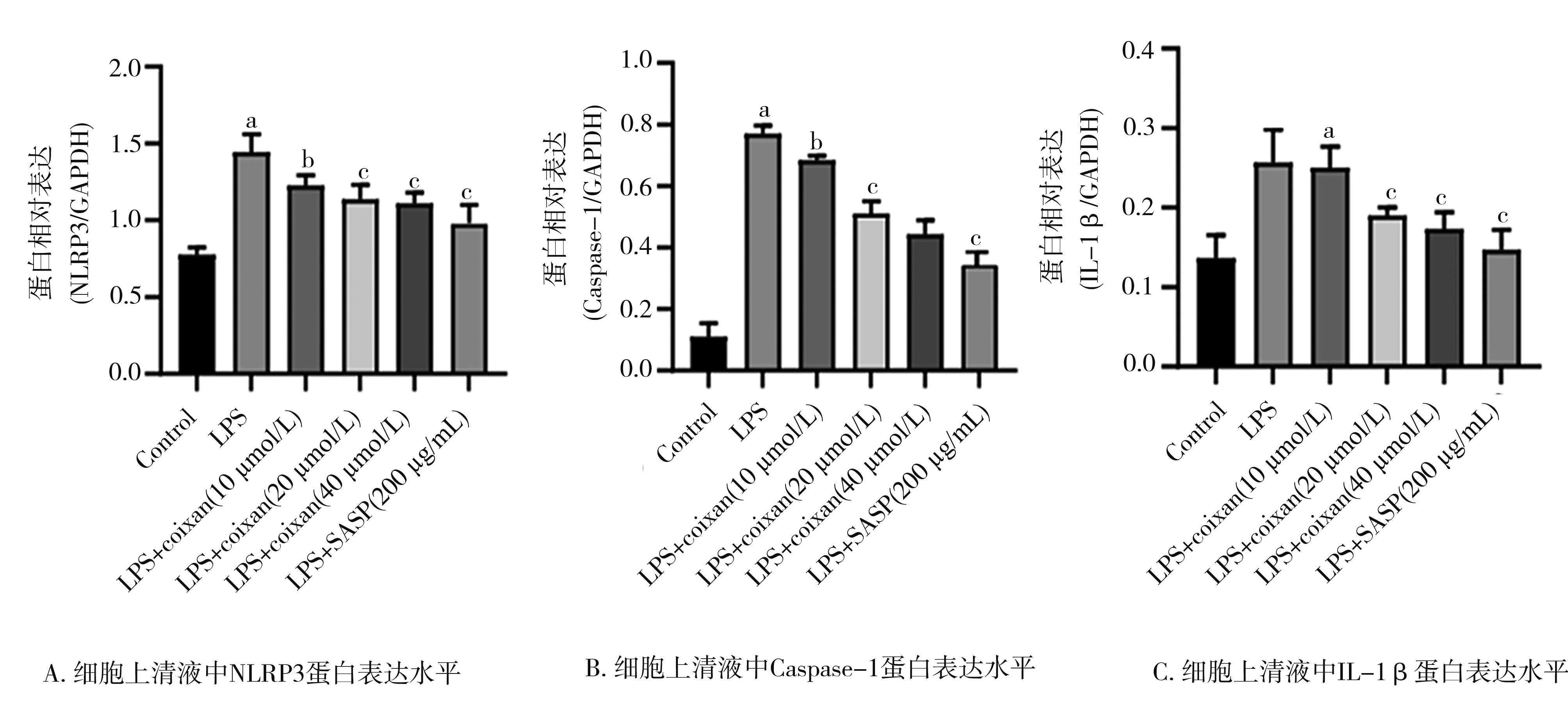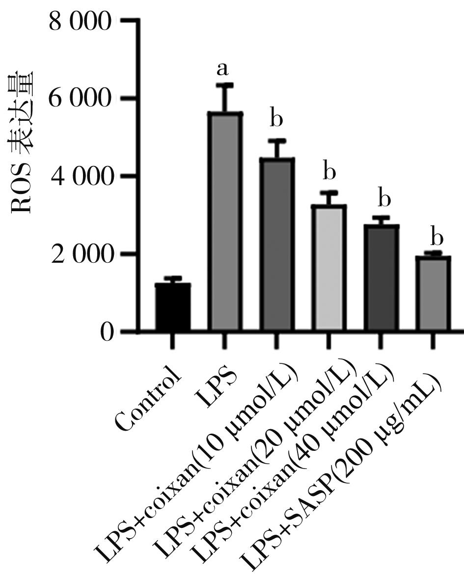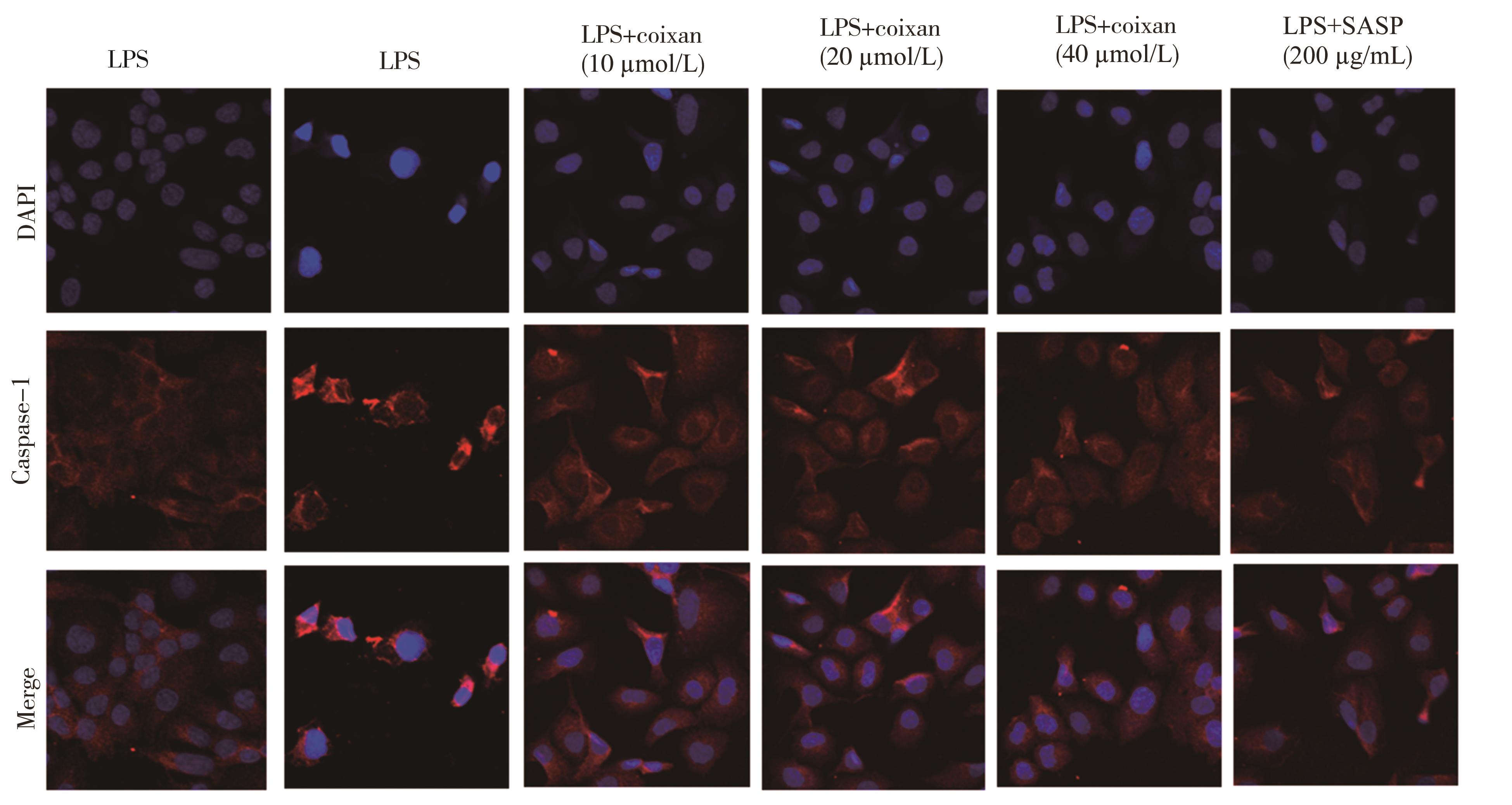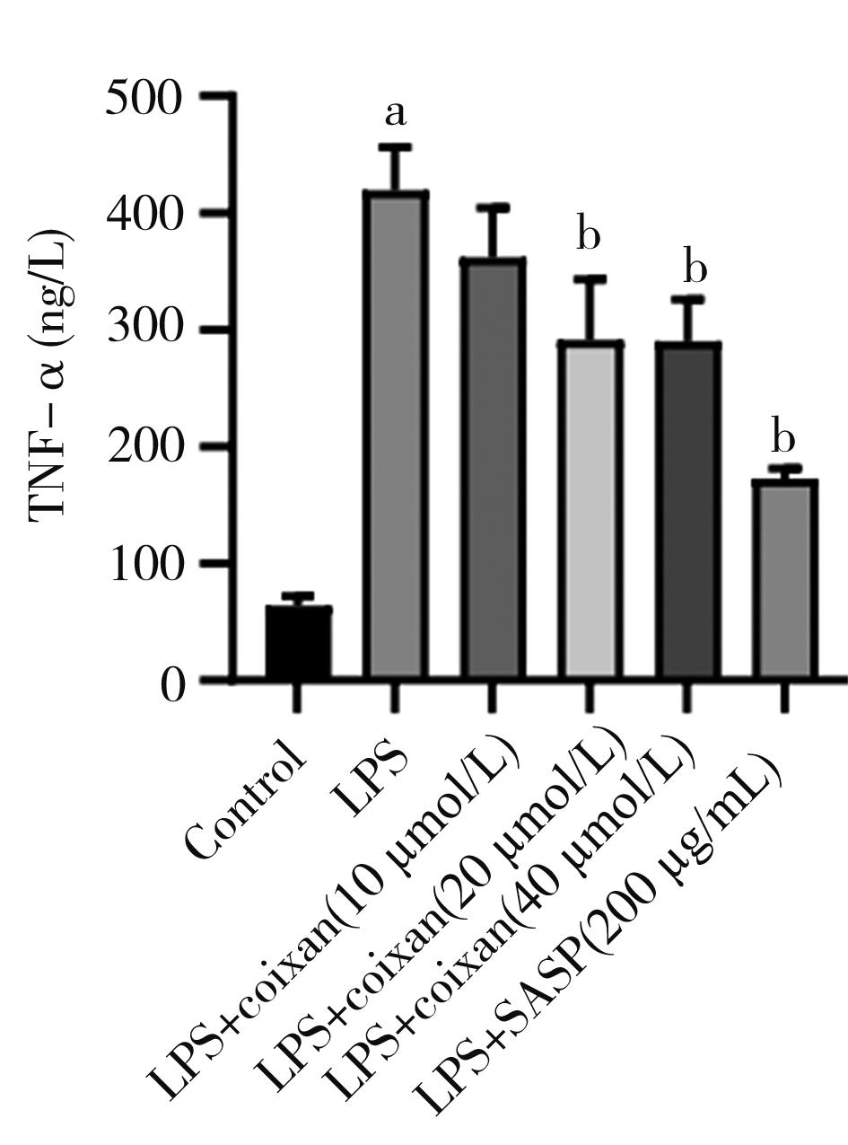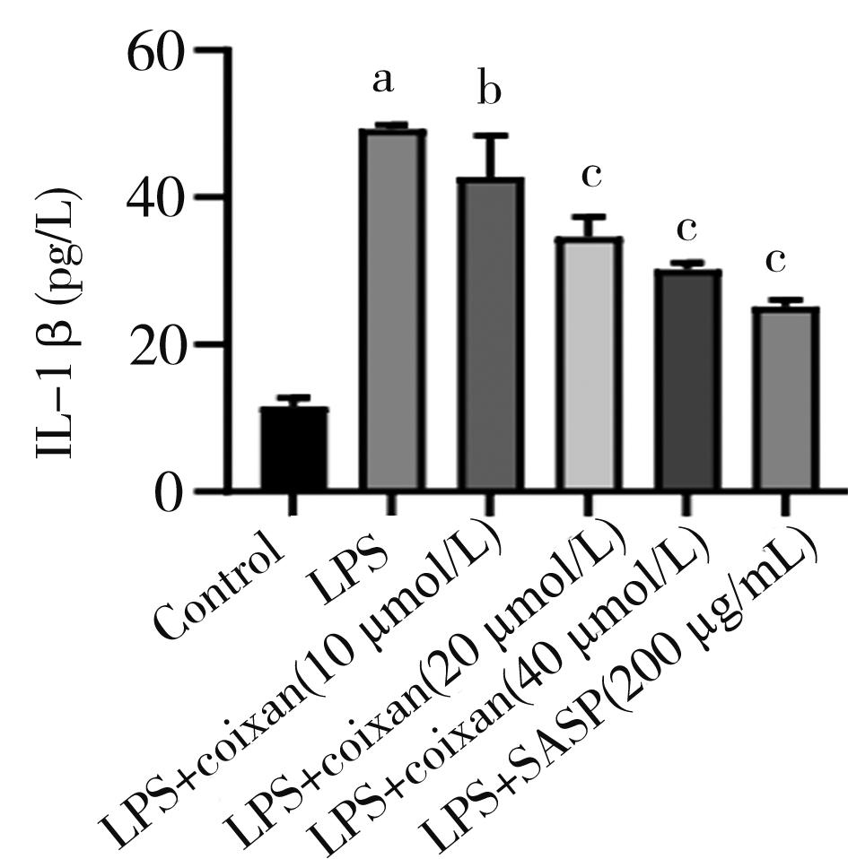 摘要:目的 从炎症理论角度出发,探讨薏苡仁多糖(Coixan)对溃疡性结肠炎(ulcerative colitis,UC)体外炎症模型的干预作用及其机制。方法 体外培养NCM460细胞,采用不同剂量(0、2.5、5、10、20和40 μg/mL)脂多糖(lipopolysaccharide,LPS)诱导NCM460细胞,筛选出最佳诱导剂量(20 μg/mL);用不同浓度(0、5、10、20、40和80 μg/mL)的Coixan 诱导NCM460,筛选出最佳促增殖浓度(10、20、40 μg/mL)。实验随机设为空白组、模型组(LPS诱导)、LPS+Coixan低、中、高剂量(10、20、40 μmol/L)组,LPS+柳氮磺吡啶(sulfasalazine,SASP)(200 μg/mL)组,除空白组外用LPS(20 μg/mL)刺激48 h建立UC体外细胞炎症模型后,分别以薏苡仁多糖及SASP进行48 h干预治疗后,ELISA法检测细胞上清液中炎症因子白细胞介素-1β(interleukin-1β,IL-1β)、肿瘤坏死因子-α(tumor necrosis factor-α,TNF-α)水平;免疫荧光检测焦亡相关蛋白Caspase-1荧光的表达量;采用qRT-PCR技术检测各组NCM460中NLRP3/Caspase-1通路中焦亡相关NLRP3、Caspase-1、GSDMD-N、IL-1β基因表达水平的影响;Western blot技术检测各组焦亡相关NLRP3、Caspase-1、IL-1β蛋白表达水平的影响。结果 与0 μg/mL比较(20 μg/mL)LPS诱导48 h对NCM460细胞生长抑制较为适中(P<0.01),同时,干预48 h时,炎症因子IL-1β、TNF-α含量明显升高(P<0.01),因此,选择(20 μg/mL)LPS诱导48 h作为造模方式。与0 μmol/L的Coixan相比,当Coixan浓度为10、20,40 μmol/L时,细胞存活率增高,特别是Coixan浓度为10、20 μmol/L(P<0.05)。与正常对照组比较,模型组中炎症因子IL-1β、TNF-α的含量,NLRP3、Caspase-1β、IL-1β蛋白和NLRP3、Caspase-1、GSDMD-N、IL-1β基因表达均显著升高(P<0.01);与模型组比较,药物干预组中,中、高剂量组和柳氮磺吡啶组中细胞IL-1β、TNF-α分泌量减少,差异有统计学意义(P<0.01);与模型组比较,药物干预组中,高剂量组和柳氮磺吡啶组中焦亡相关蛋白Caspase-1表达水平明显下调(P<0.01);与模型组比较,药物干预组中,低、中、高剂量组和柳氮磺吡啶组中NLRP3、Caspase-1蛋白和基因表达明显降低(P<0.05或P<0.01),药物干预组中,高剂量组、柳氮磺吡啶组中GSDMD-N、IL-1β基因表达均显著降低(P<0.01);与模型组比较,药物干预组中,中、高剂量组和柳氮磺吡啶组中焦亡相关蛋白(NLRP3,Caspase-1,IL-1β)表达水平明显下调(P<0.01)。结论 薏苡仁多糖可能通过下调焦亡相关因子NLRP3、Caspase-1、GSDMD-N、IL-1β的表达水平,从而抑制人结肠上皮细胞的细胞焦亡,发挥人结肠上皮细胞保护作用。