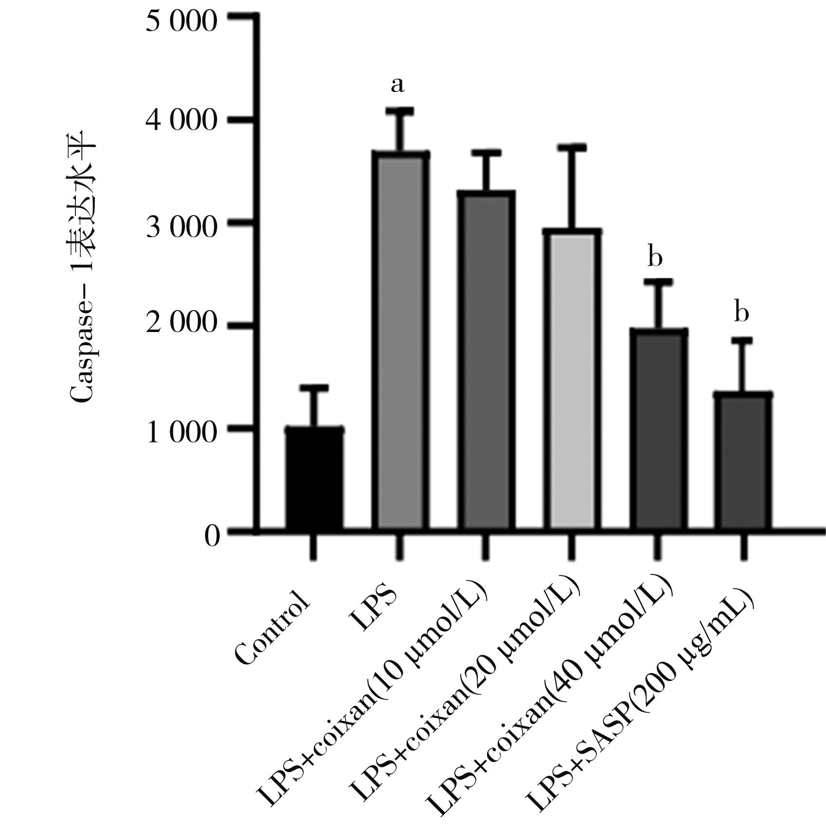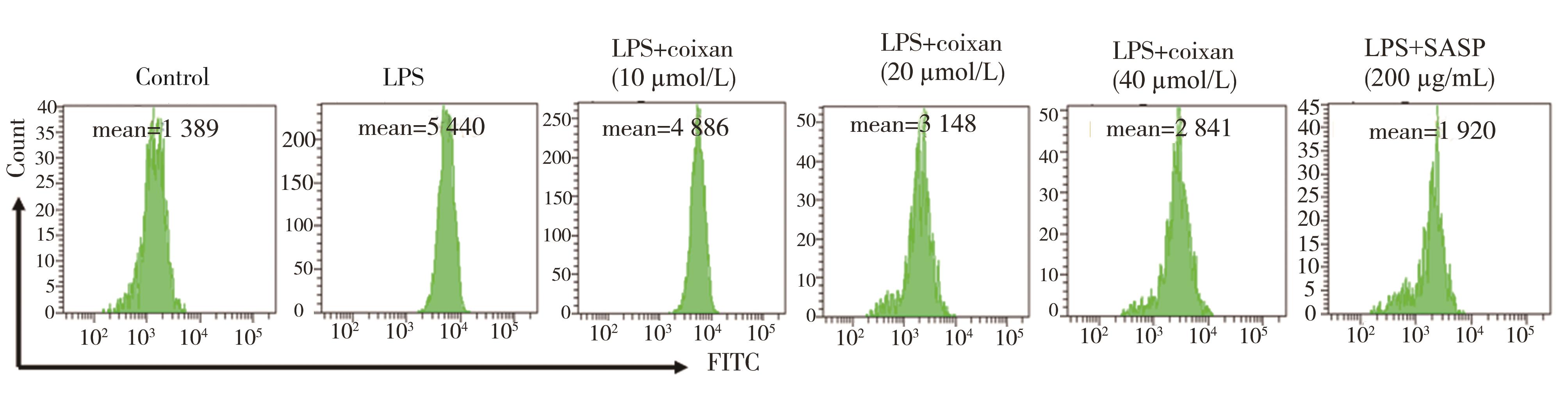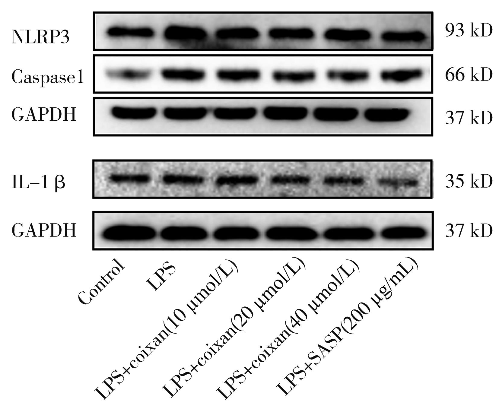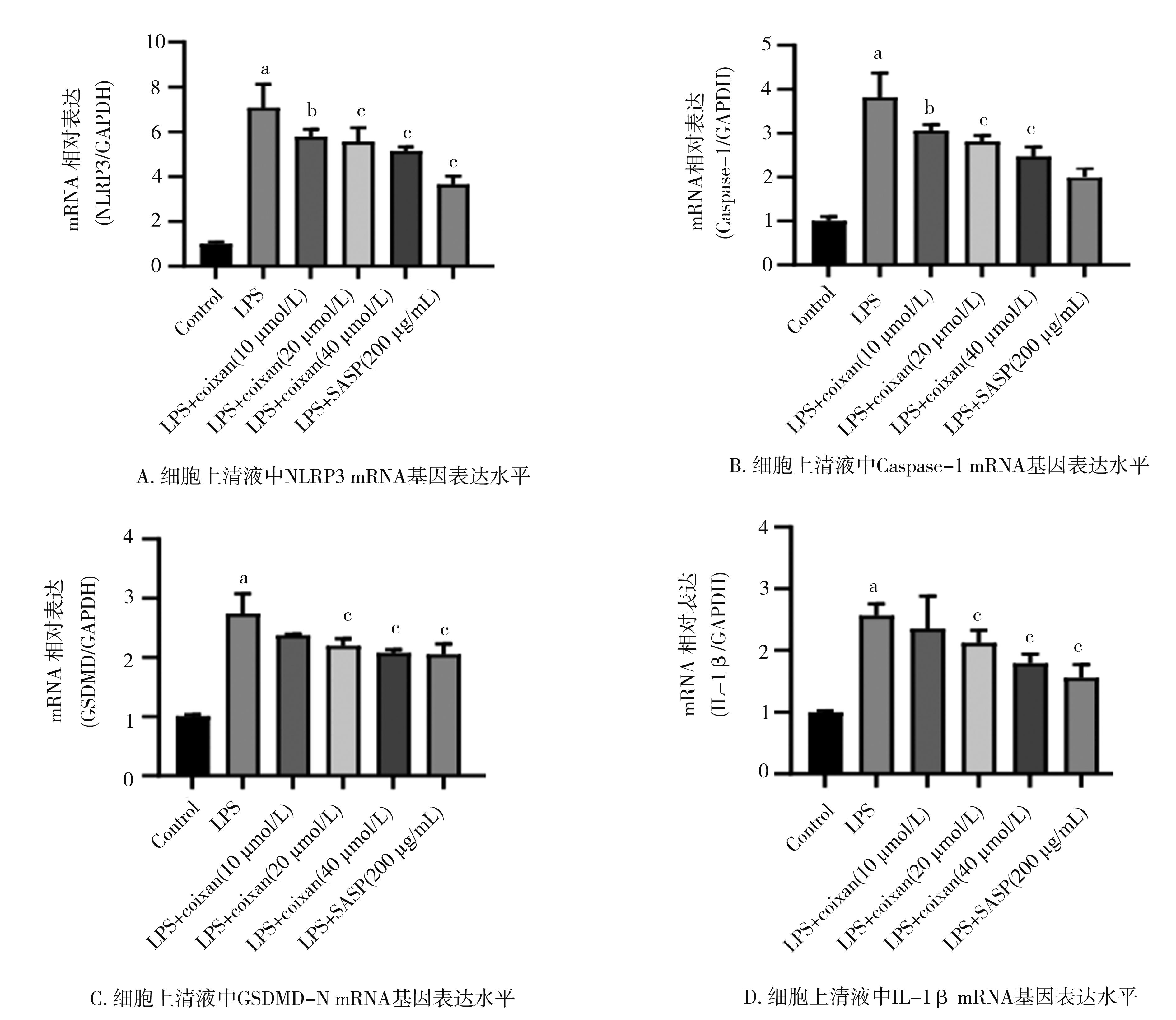 摘要:目的 从炎症理论角度出发,探讨薏苡仁多糖(Coixan)对溃疡性结肠炎(ulcerative colitis,UC)体外炎症模型的干预作用及其机制。方法 体外培养NCM460细胞,采用不同剂量(0、2.5、5、10、20和40 μg/mL)脂多糖(lipopolysaccharide,LPS)诱导NCM460细胞,筛选出最佳诱导剂量(20 μg/mL);用不同浓度(0、5、10、20、40和80 μg/mL)的Coixan 诱导NCM460,筛选出最佳促增殖浓度(10、20、40 μg/mL)。实验随机设为空白组、模型组(LPS诱导)、LPS+Coixan低、中、高剂量(10、20、40 μmol/L)组,LPS+柳氮磺吡啶(sulfasalazine,SASP)(200 μg/mL)组,除空白组外用LPS(20 μg/mL)刺激48 h建立UC体外细胞炎症模型后,分别以薏苡仁多糖及SASP进行48 h干预治疗后,ELISA法检测细胞上清液中炎症因子白细胞介素-1β(interleukin-1β,IL-1β)、肿瘤坏死因子-α(tumor necrosis factor-α,TNF-α)水平;免疫荧光检测焦亡相关蛋白Caspase-1荧光的表达量;采用qRT-PCR技术检测各组NCM460中NLRP3/Caspase-1通路中焦亡相关NLRP3、Caspase-1、GSDMD-N、IL-1β基因表达水平的影响;Western blot技术检测各组焦亡相关NLRP3、Caspase-1、IL-1β蛋白表达水平的影响。结果 与0 μg/mL比较(20 μg/mL)LPS诱导48 h对NCM460细胞生长抑制较为适中(P<0.01),同时,干预48 h时,炎症因子IL-1β、TNF-α含量明显升高(P<0.01),因此,选择(20 μg/mL)LPS诱导48 h作为造模方式。与0 μmol/L的Coixan相比,当Coixan浓度为10、20,40 μmol/L时,细胞存活率增高,特别是Coixan浓度为10、20 μmol/L(P<0.05)。与正常对照组比较,模型组中炎症因子IL-1β、TNF-α的含量,NLRP3、Caspase-1β、IL-1β蛋白和NLRP3、Caspase-1、GSDMD-N、IL-1β基因表达均显著升高(P<0.01);与模型组比较,药物干预组中,中、高剂量组和柳氮磺吡啶组中细胞IL-1β、TNF-α分泌量减少,差异有统计学意义(P<0.01);与模型组比较,药物干预组中,高剂量组和柳氮磺吡啶组中焦亡相关蛋白Caspase-1表达水平明显下调(P<0.01);与模型组比较,药物干预组中,低、中、高剂量组和柳氮磺吡啶组中NLRP3、Caspase-1蛋白和基因表达明显降低(P<0.05或P<0.01),药物干预组中,高剂量组、柳氮磺吡啶组中GSDMD-N、IL-1β基因表达均显著降低(P<0.01);与模型组比较,药物干预组中,中、高剂量组和柳氮磺吡啶组中焦亡相关蛋白(NLRP3,Caspase-1,IL-1β)表达水平明显下调(P<0.01)。结论 薏苡仁多糖可能通过下调焦亡相关因子NLRP3、Caspase-1、GSDMD-N、IL-1β的表达水平,从而抑制人结肠上皮细胞的细胞焦亡,发挥人结肠上皮细胞保护作用。