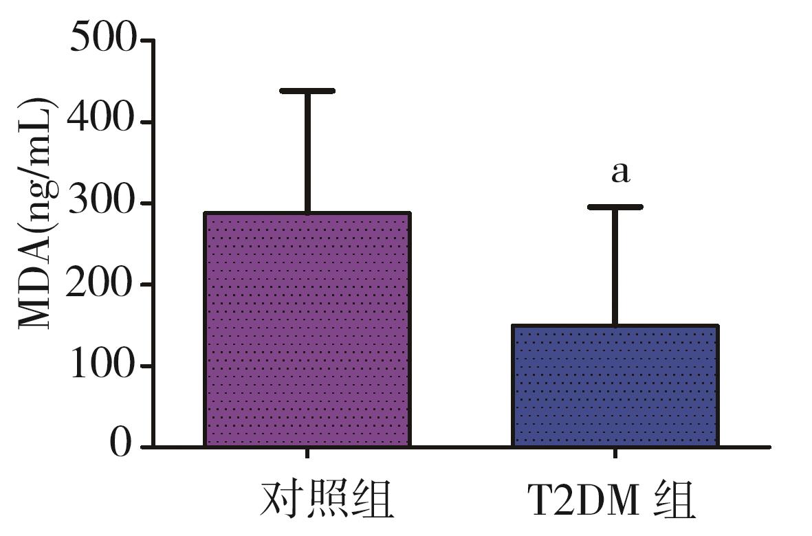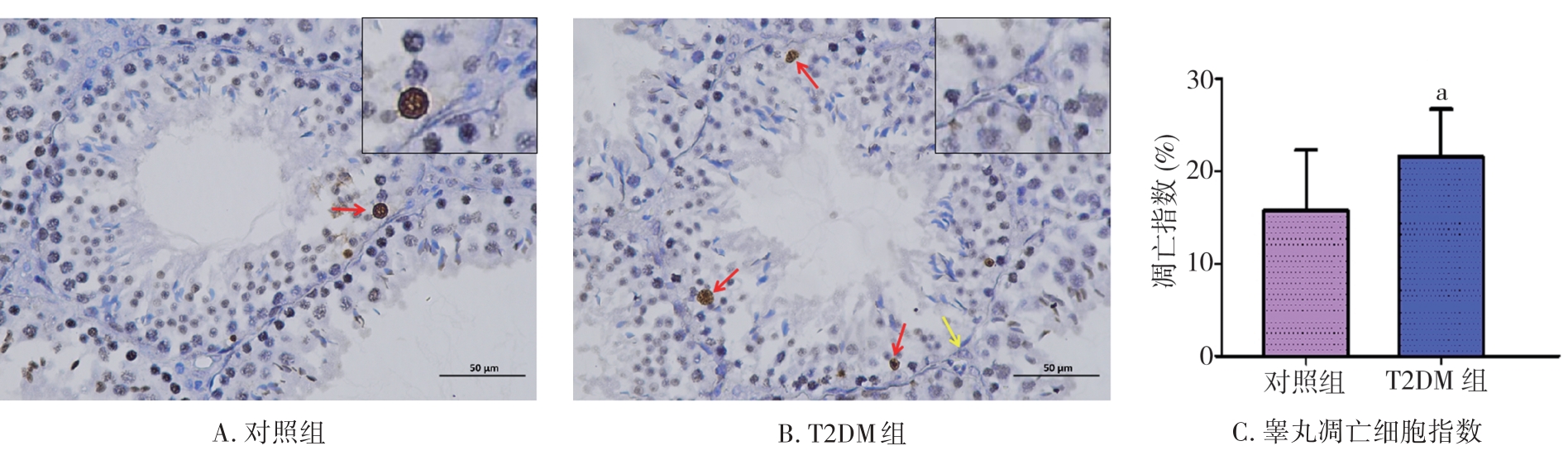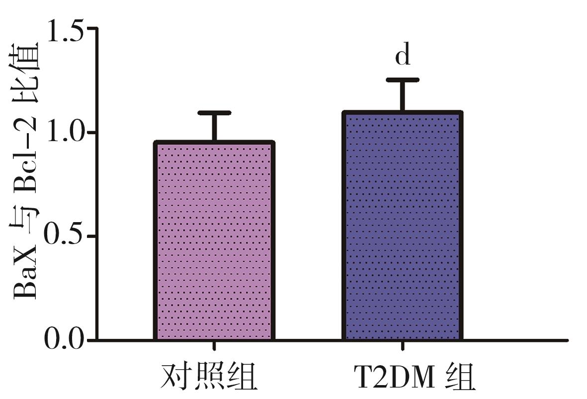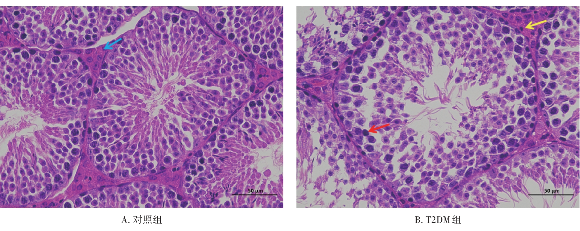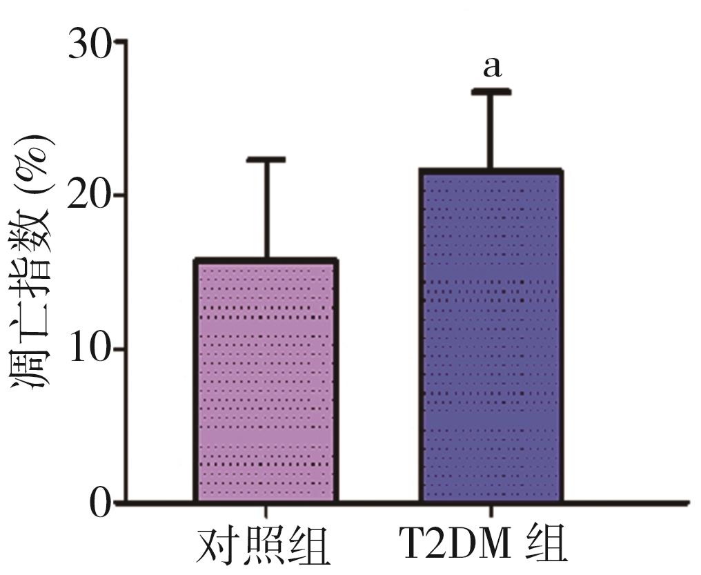 摘要:目的 通过构建2型糖尿病(type 2 diabetes mellitus,T2DM)雄性小鼠模型探究2型糖尿病对睾丸组织形态学、睾酮分泌、精子生成等方面的影响。方法 将24只8周龄C57BL/6J雄性小鼠随机分为2组:对照组10只和T2DM组14只。对照组小鼠基础饲料喂养,T2DM组给予高脂喂养。8周后对照组小鼠腹腔注射柠檬酸盐缓冲液,T2DM组小鼠腹腔注射60 mg/kg链脲佐菌素(streptozocin,STZ),持续5 d。饲养小鼠4周后断颈处死,分离出小鼠的血清、睾丸、附睾。通过精子计数、睾酮水平检测评估雄性小鼠生殖细胞生精功能;HE染色分析睾丸组织形态学变化;TUNEL染色检测睾丸生殖细胞的凋亡情况。ELISA检测雄性小鼠血清中超氧化物歧化酶(superoxide dismutase,SOD)、丙二醛(malondialdehyde,MDA)、血红素加氧酶-1(heme oxygenase-1,HO-1)水平;Western blot检测雄性小鼠睾丸组织中B细胞淋巴瘤/白血病-2(B cell lymphoma/leukemia-2,Bcl-2)、Bcl-2相关X蛋白(Bcl-2-associated X protein,BaX)、半胱氨酸天冬氨酸蛋白酶-3(cysteinyl aspartate specific proteinase-3,Caspase-3)蛋白表达水平。结果 与对照组相比,T2DM组小鼠体质量(26.00±2.85) g、精子数目(4.15±1.01)×106个/L、睾酮水平(0.99±0.41) ng/mL均降低(P=0.000,P=0.009,P=0.041);TUNEL结果显示:T2DM组小鼠睾丸生精小管各级生精细胞都有不同程度的凋亡,凋亡细胞数量(21.60±5.11,P=0.033)增加;ELISA结果显示:T2DM组小鼠血清氧化应激SOD(4.42±0.47) pg/mL和HO-1(2 968.00±536.10) pg/mL表达水平增加(P=0.000,P=0.008)。Western blot检测发现BaX(1.270±0.059)、Caspase-3(1.94±0.47)蛋白表达水平增加(P=0.008,P=0.041),且BaX与Bcl-2比值增大。结论 2型糖尿病雄性小鼠血清睾酮含量显著降低,生精细胞凋亡增加,成熟精子数量减少,影响生殖能力。