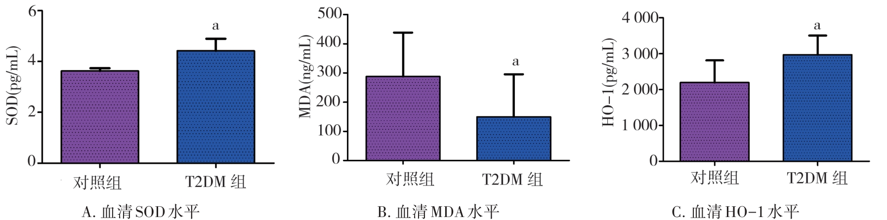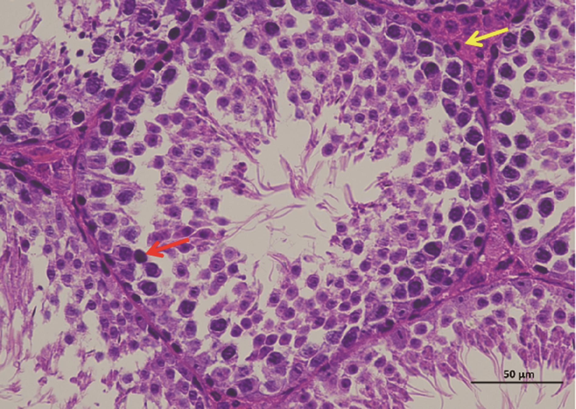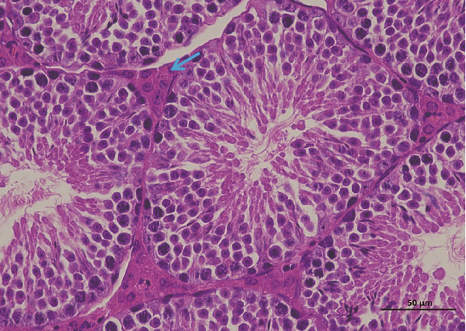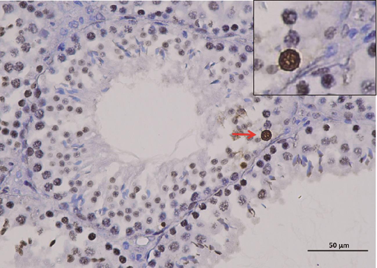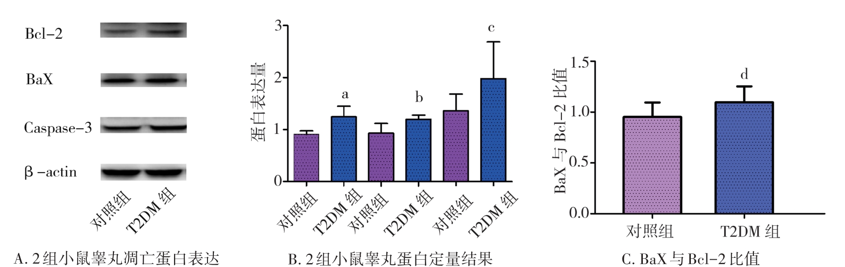 摘要:目的 通过构建2型糖尿病(type 2 diabetes mellitus,T2DM)雄性小鼠模型探究2型糖尿病对睾丸组织形态学、睾酮分泌、精子生成等方面的影响。方法 将24只8周龄C57BL/6J雄性小鼠随机分为2组:对照组10只和T2DM组14只。对照组小鼠基础饲料喂养,T2DM组给予高脂喂养。8周后对照组小鼠腹腔注射柠檬酸盐缓冲液,T2DM组小鼠腹腔注射60 mg/kg链脲佐菌素(streptozocin,STZ),持续5 d。饲养小鼠4周后断颈处死,分离出小鼠的血清、睾丸、附睾。通过精子计数、睾酮水平检测评估雄性小鼠生殖细胞生精功能;HE染色分析睾丸组织形态学变化;TUNEL染色检测睾丸生殖细胞的凋亡情况。ELISA检测雄性小鼠血清中超氧化物歧化酶(superoxide dismutase,SOD)、丙二醛(malondialdehyde,MDA)、血红素加氧酶-1(heme oxygenase-1,HO-1)水平;Western blot检测雄性小鼠睾丸组织中B细胞淋巴瘤/白血病-2(B cell lymphoma/leukemia-2,Bcl-2)、Bcl-2相关X蛋白(Bcl-2-associated X protein,BaX)、半胱氨酸天冬氨酸蛋白酶-3(cysteinyl aspartate specific proteinase-3,Caspase-3)蛋白表达水平。结果 与对照组相比,T2DM组小鼠体质量(26.00±2.85) g、精子数目(4.15±1.01)×106个/L、睾酮水平(0.99±0.41) ng/mL均降低(P=0.000,P=0.009,P=0.041);TUNEL结果显示:T2DM组小鼠睾丸生精小管各级生精细胞都有不同程度的凋亡,凋亡细胞数量(21.60±5.11,P=0.033)增加;ELISA结果显示:T2DM组小鼠血清氧化应激SOD(4.42±0.47) pg/mL和HO-1(2 968.00±536.10) pg/mL表达水平增加(P=0.000,P=0.008)。Western blot检测发现BaX(1.270±0.059)、Caspase-3(1.94±0.47)蛋白表达水平增加(P=0.008,P=0.041),且BaX与Bcl-2比值增大。结论 2型糖尿病雄性小鼠血清睾酮含量显著降低,生精细胞凋亡增加,成熟精子数量减少,影响生殖能力。
