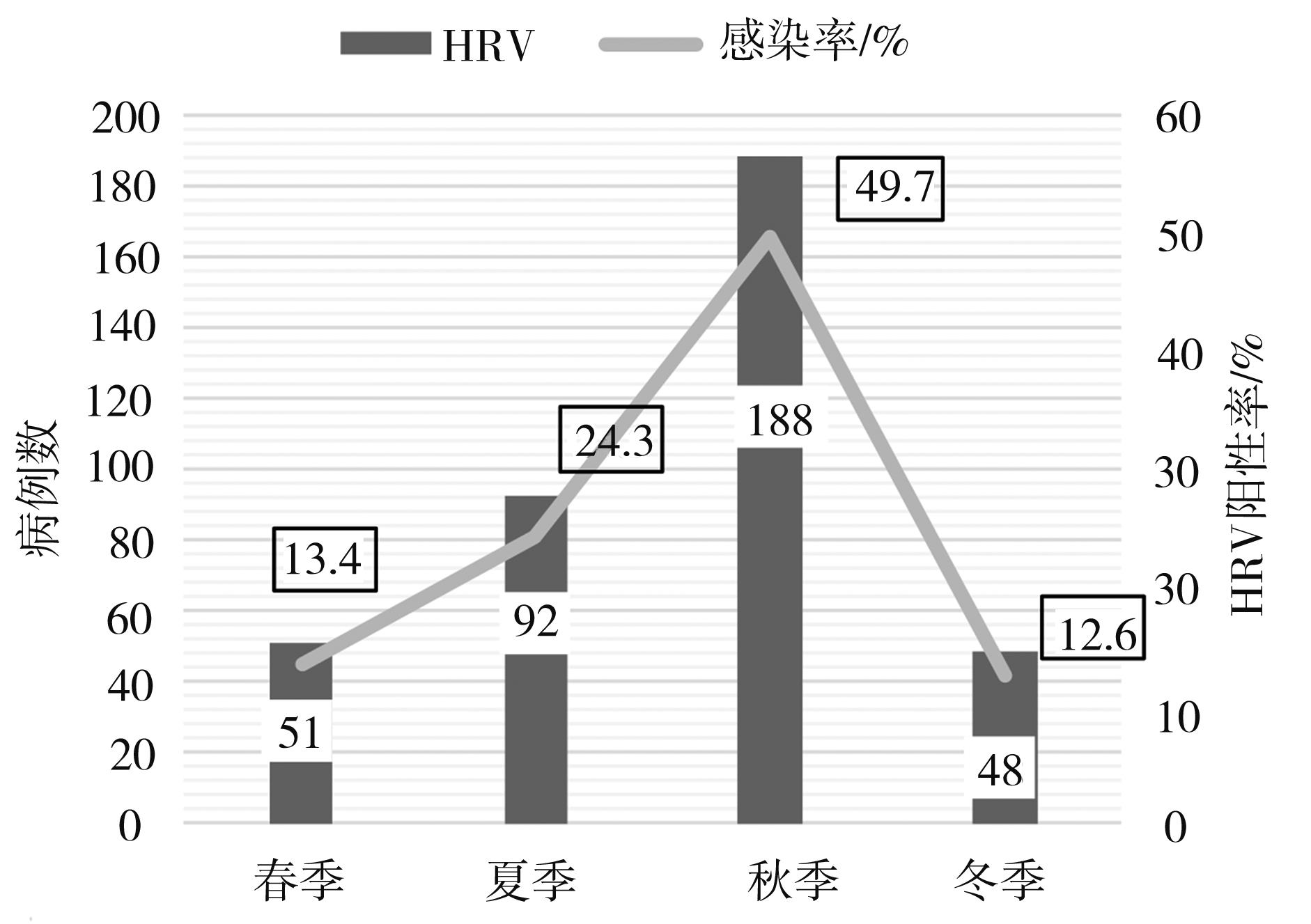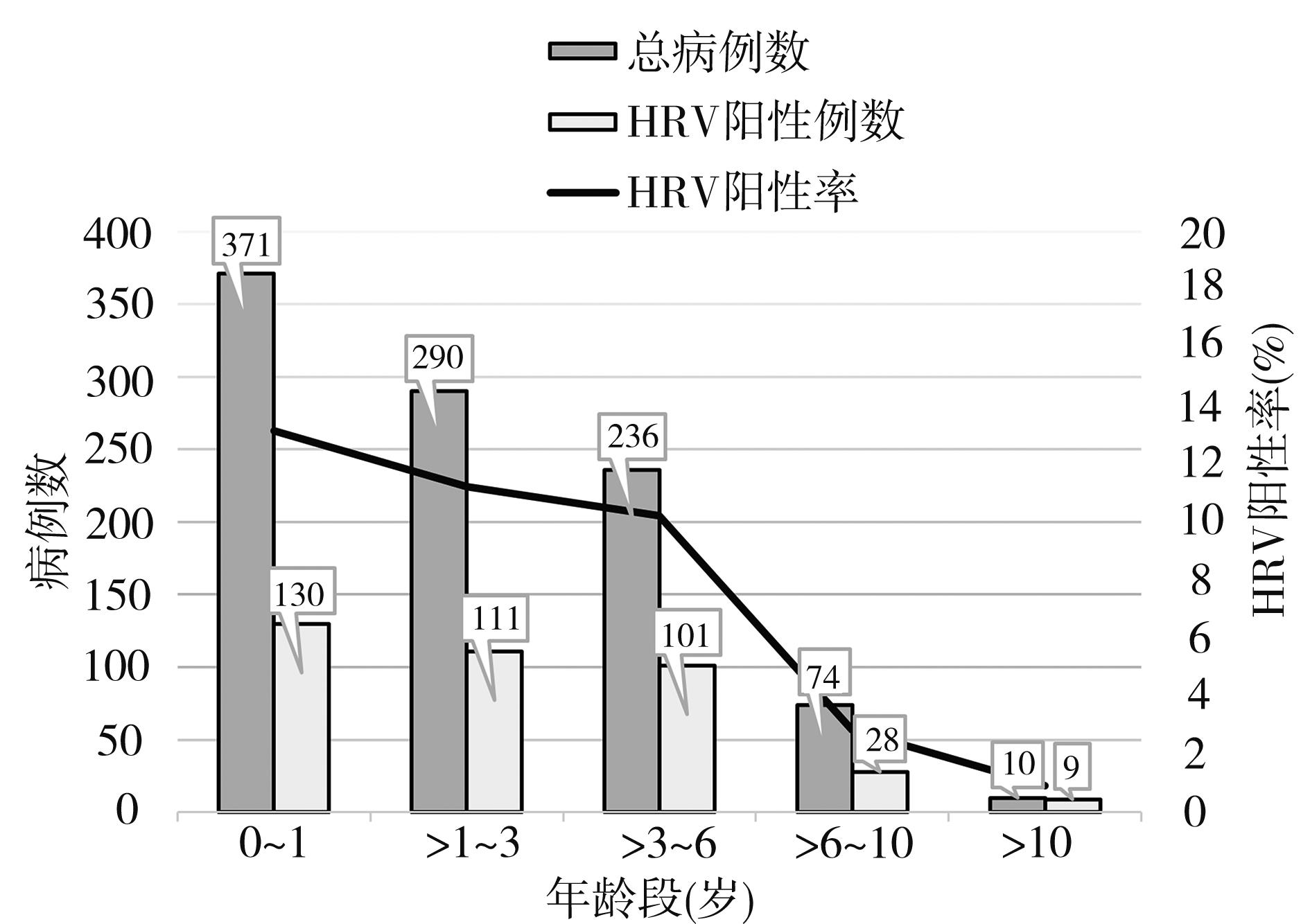 摘要:目的 回顾性分析银川市下呼吸道感染患儿中人鼻病毒的流行病学及临床特征,为儿童预防人鼻病毒(human rhinovirus,HRV)及临床诊疗提供理论依据。方法 采集2018至2019年因下呼吸道感染就诊于银川市妇幼保健院儿科的989例住院患儿的下呼吸道分泌物,采用多重PCR方法检测标本中病毒检出情况,分析人鼻病毒病例的基本情况、临床特征及实验室检查指标。结果 本研究989例下呼吸道感染患儿中,HRV总检出率为38.3%,HRV单纯感染率为9.5%,混合其他病毒感染率为28.9%;感染HRV的男患儿有221例(58.3%),女患儿有158例(41.7%);HRV感染常年都有发生,但主要流行在夏季和秋季;HRV感染患儿87.3%被诊断为肺炎,13.7%为支气管和毛细支气管炎;90.2%的感染患儿为小于6岁的儿童。HRV感染和非HRV感染患儿相比,HRV感染组发热和呕吐症状明显(P<0.05),而咳嗽、喘息、喘憋、闻及喘鸣音等临床特征方面没有统计学差异(P>0.05),在实验室检查指标分析中,血红蛋白、红细胞计数、谷草转氨酶、谷丙转氨酶以及乳酸酶含量均存在明显差异(P<0.05);结论 HRV是银川地区常见的下呼吸道感染病原体,6岁以下儿童极易感染,以发热为主要症状,且HRV感染会引发肺炎、支气管炎及毛细支气管炎下呼吸道感染疾病;HRV常与其他病毒混合感染;具有以夏、秋季为感染高峰的明显的季节性流行。