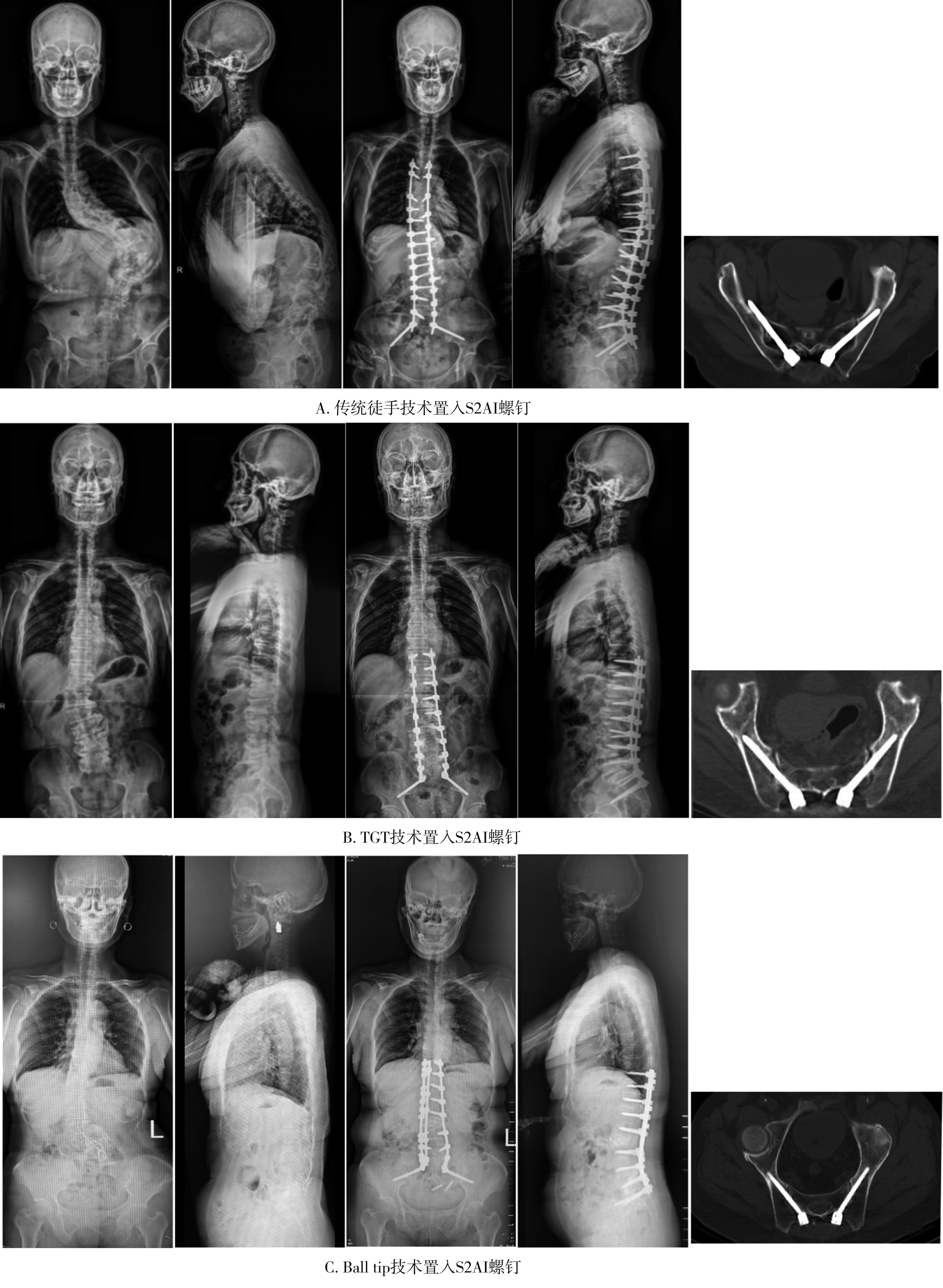 摘要:目的 比较传统徒手置钉,3D打印模板引导技术(three-dimensional printed template guided technique,TGT)和ball tip置钉技术在置入骶2髂骨(s2 alar-iliac,S2AI)螺钉的准确性。方法 回顾分析接受S2AI螺钉放置的145例患者,按置钉技术不同将其分为徒手技术组(36例)、TGT技术组(48例)和ball tip技术组(61例)。所有患者术前行骨盆CT确认最佳S2AI螺钉的最佳轨道参数,术后CT扫描评估螺钉轨迹的准确性,比较3种技术的置钉准确性。结果 3组患者S2AI螺钉的最佳轨道参数差异均无统计学意义(P>0.05);3组患者共置入S2AI螺钉290枚。其中,传统徒手技术组72枚,TGT技术组96枚,ball tip技术组122枚。传统徒手组置钉不准确率为18.1%(13/72),TGT技术组置钉不准确率3.1%(3/96),ball tip组置钉不准确率为4.1%(5/122):TGT技术组置钉准确性高于传统徒手技术组,差异有统计学意义(P<0.05);ball tip技术组置钉准确性也高于传统徒手技术组,差异有统计学意义(P<0.05);TGT技术组置钉准确性虽高于ball tip技术组,但差异无统计学意义(P>0.05)。结论 TGT技术和ball tip技术均为S2AI螺钉置入的可靠技术,二者的准确性均明显高于徒手技术,但ball tip技术操作简单。