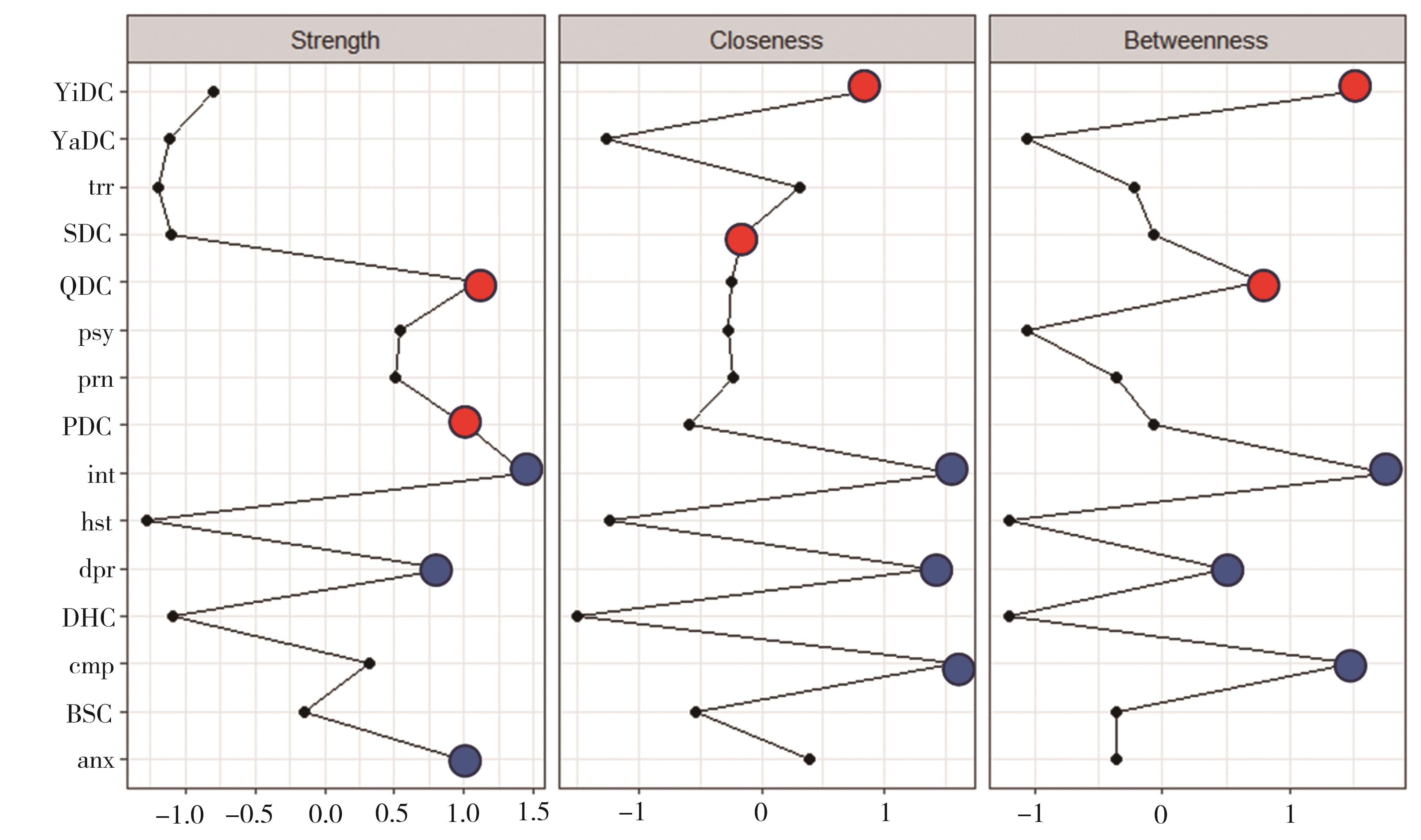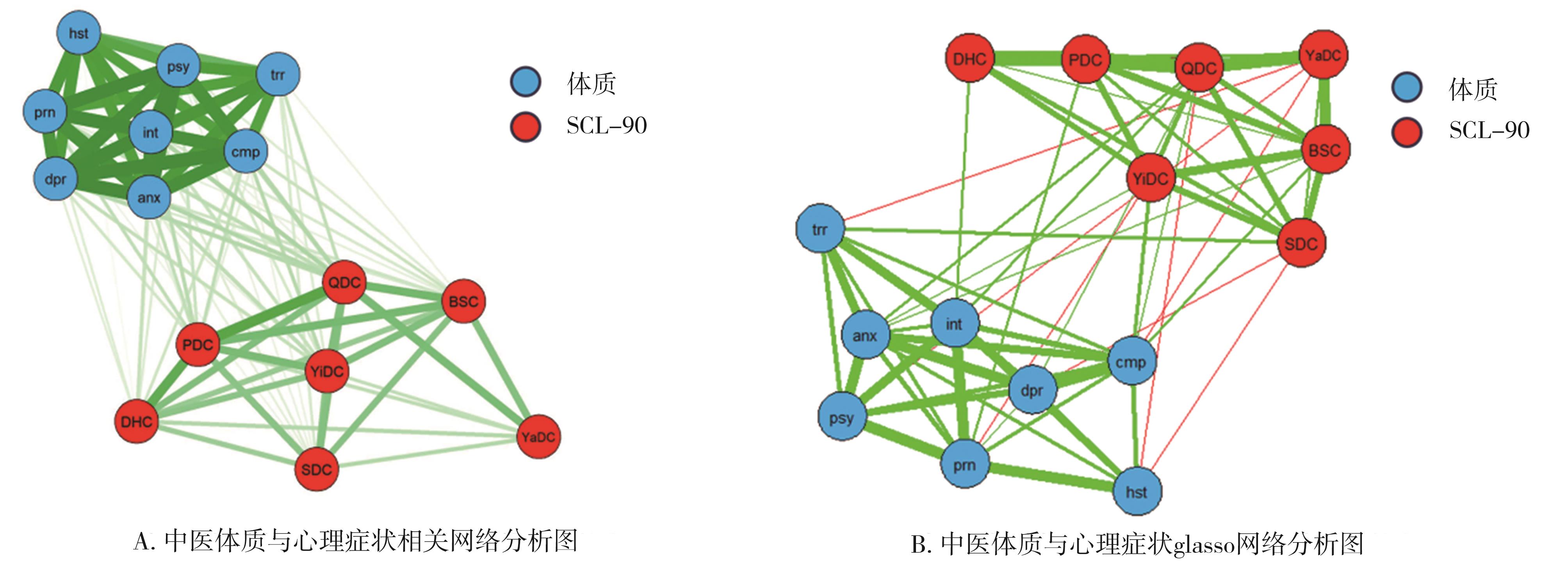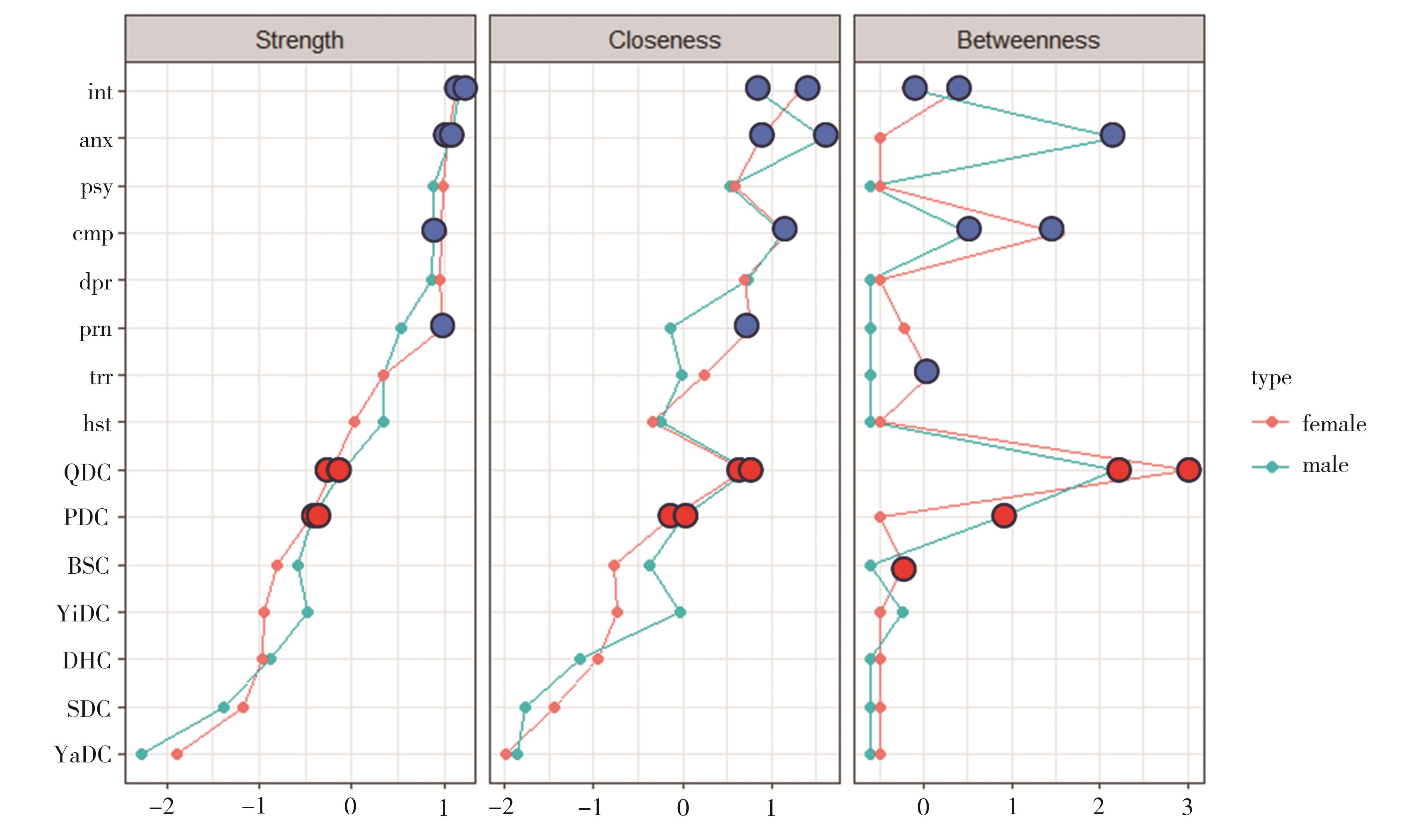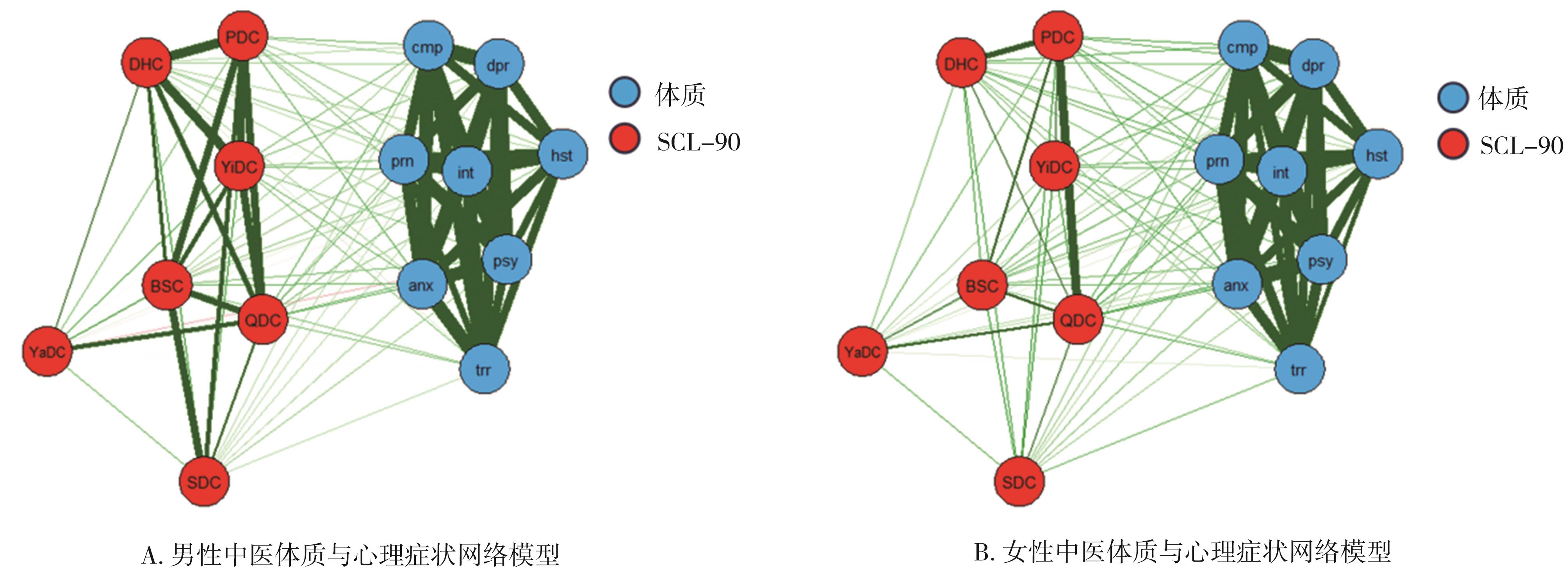 摘要:目的 对中医体质与心理症状进行网络分析,构建二者的网络分析图,探究体质与心理症状的关系以及不同性别之间网络结构的差异,为临床心理疾病的早期预防和治疗提供依据。方法 以网络调查的方法收集调查对象的中医体质与心理症状,在R(Version 4.3.1)中使用qgraph进行分析和构建网络模型,利用graphical lasso对网络进行简化。使用bootnet对网络的稳定性进行检验,NetworkComparisonTest对不同性别之间的网络分析进行比较。结果 气虚质、阴虚质、痰湿质为该网络中具有高中心性的体质;人际关系敏感、焦虑、抑郁、强迫症状是具有高中心性的心理症状。该网络中强度中心性稳定性为0.75,接近中心性稳定性为0.67,中介中心性稳定性为0.28,均达到了可接受的程度。不同性别的中医体质与心理症状网络不存在显著差异。结论 不同性别的中医体质与心理症状网络是相似的,在该网络中气虚质、阴虚质和痰湿质是与心理症状相关的高中心性体质。在心理问题早期筛查中可结合患者的体质,针对体质进行调理,达到治未病的目的。