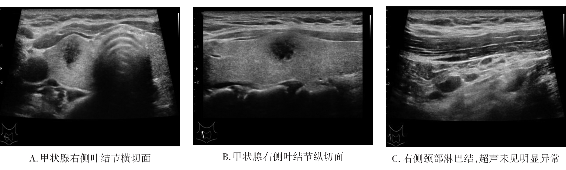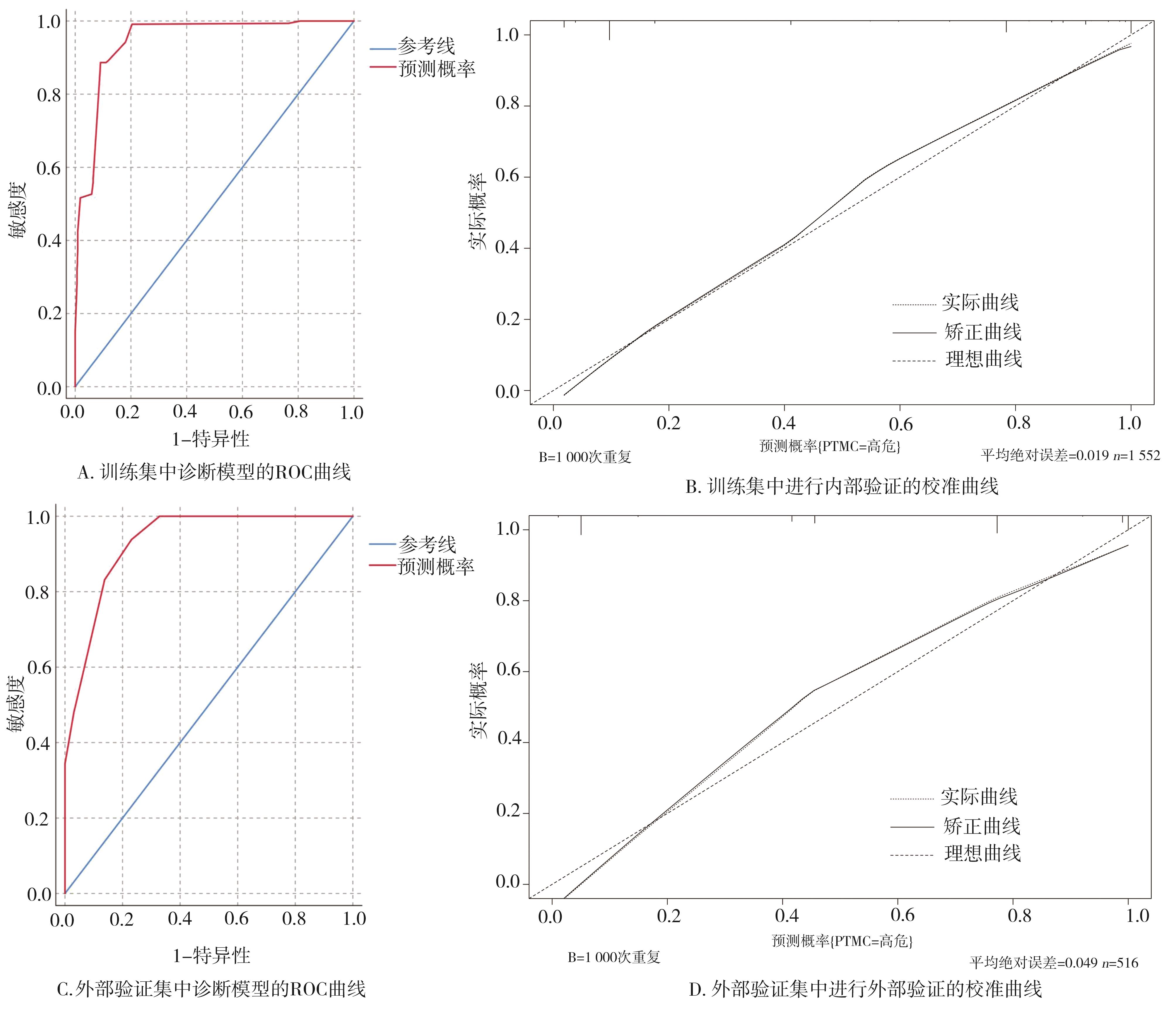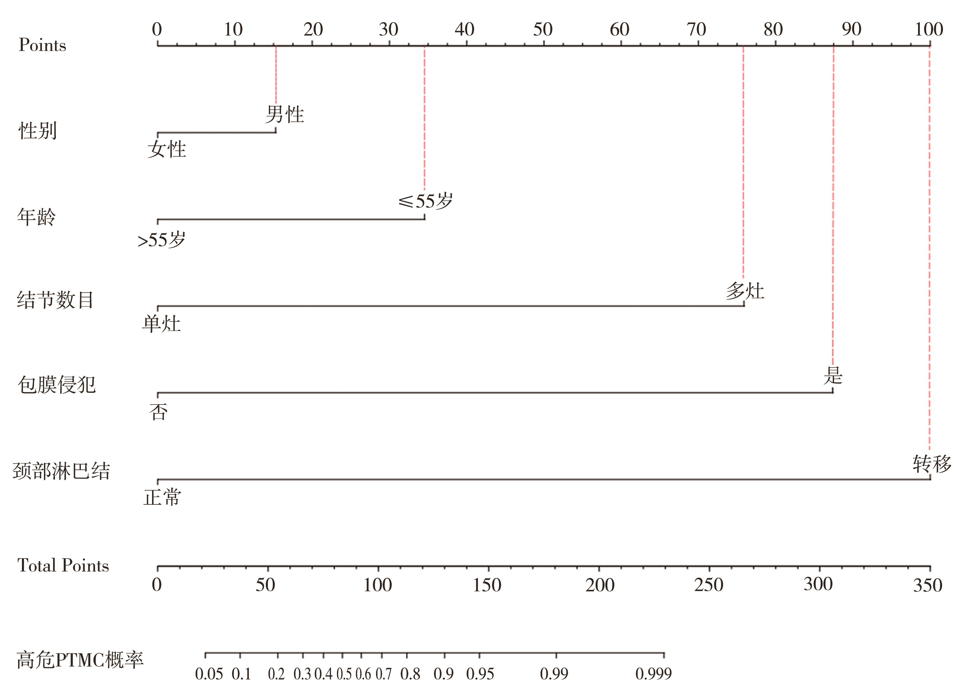 摘要:目的 探讨高危甲状腺微小乳头状癌(papillary thyroid microcarcinoma,PTMC)的风险预测因子,构建可靠的列线图诊断模型并验证。方法 回顾性分析2004至2015年SEER数据库中手术治疗的PTMC患者(训练集)以及2020至2022年四川省人民医院甲状腺诊疗中心诊治的甲状腺微小结节患者(外部验证集)的临床病理及超声影像资料。验证集中,利用logistic回归分析高危PTMC的风险预测因子,构建列线图诊断模型并采用内部验证集和外部验证集分别进行验证。再根据术前超声影像学特征进行间接评估,探讨术前超声影像学特征预测高危PTMC的可行性与可靠性。结果 训练集纳入患者1 552例,外部验证集纳入患者516例。训练集中筛选出高危PTMC的独立危险因素为性别(男性)、年龄(≤55岁)、结节数目(多灶)、包膜侵犯,颈部淋巴结异常(P<0.05),构建出的列线图C指数为0.946。在训练集及外部验证集中,该列线图模型的预测结果与实际情况均具有较好的一致性。基于超声影像特征诊断高危PTMC的受试者工作特征(receiver operating characteristic,ROC)的曲线下面积(area under the curve,AUC)值为0.931(95%CI=0.910~0.953),与基于病理特征诊断的AUC值具有较高的一致性(κ=0.611,P<0.05)。结论 本研究构建的高危PTMC诊断模型具有较好的预测效应,利用术前超声影像学特征预测高危PTMC具有一定的临床可行性及临床应用价值。