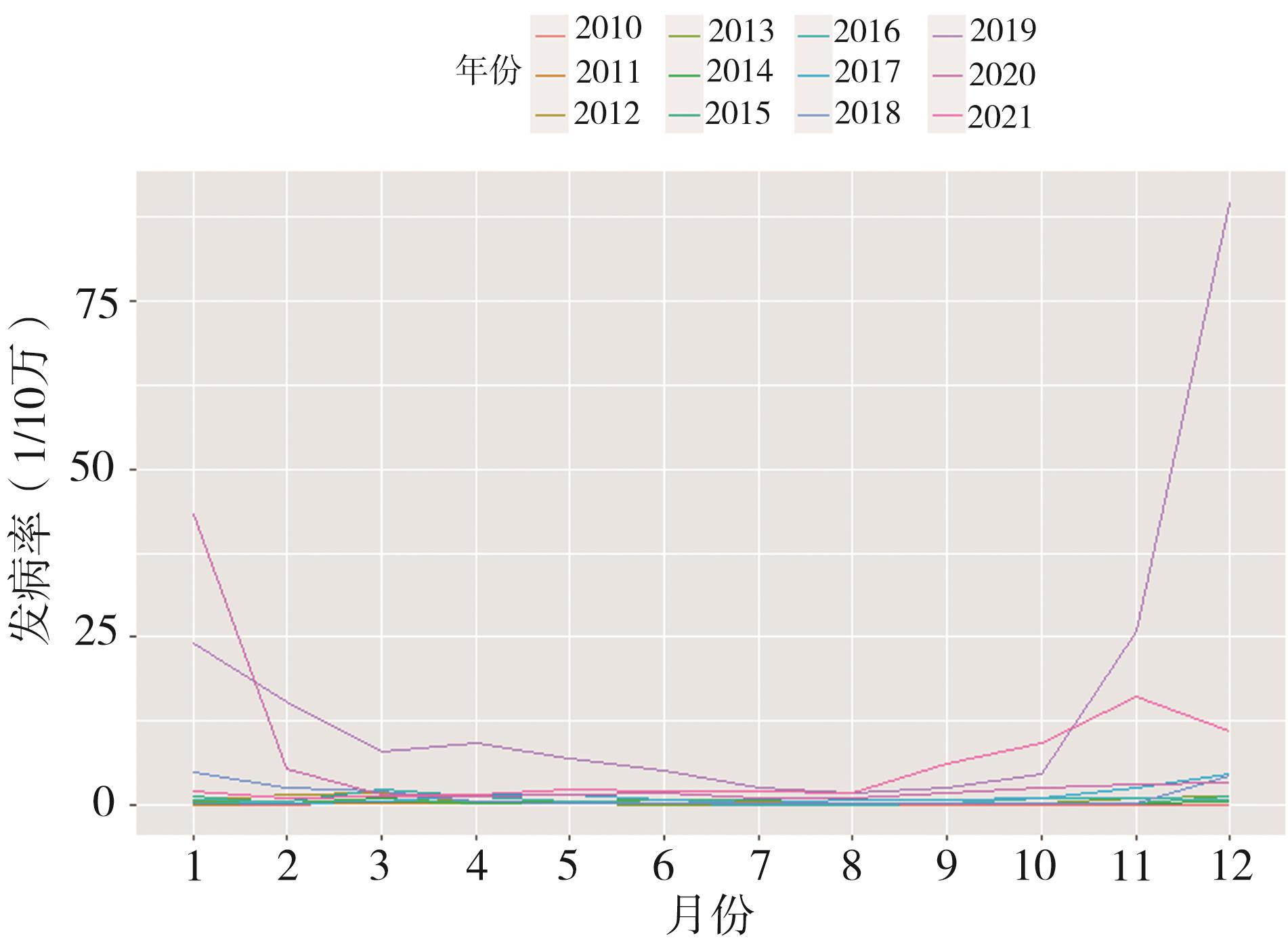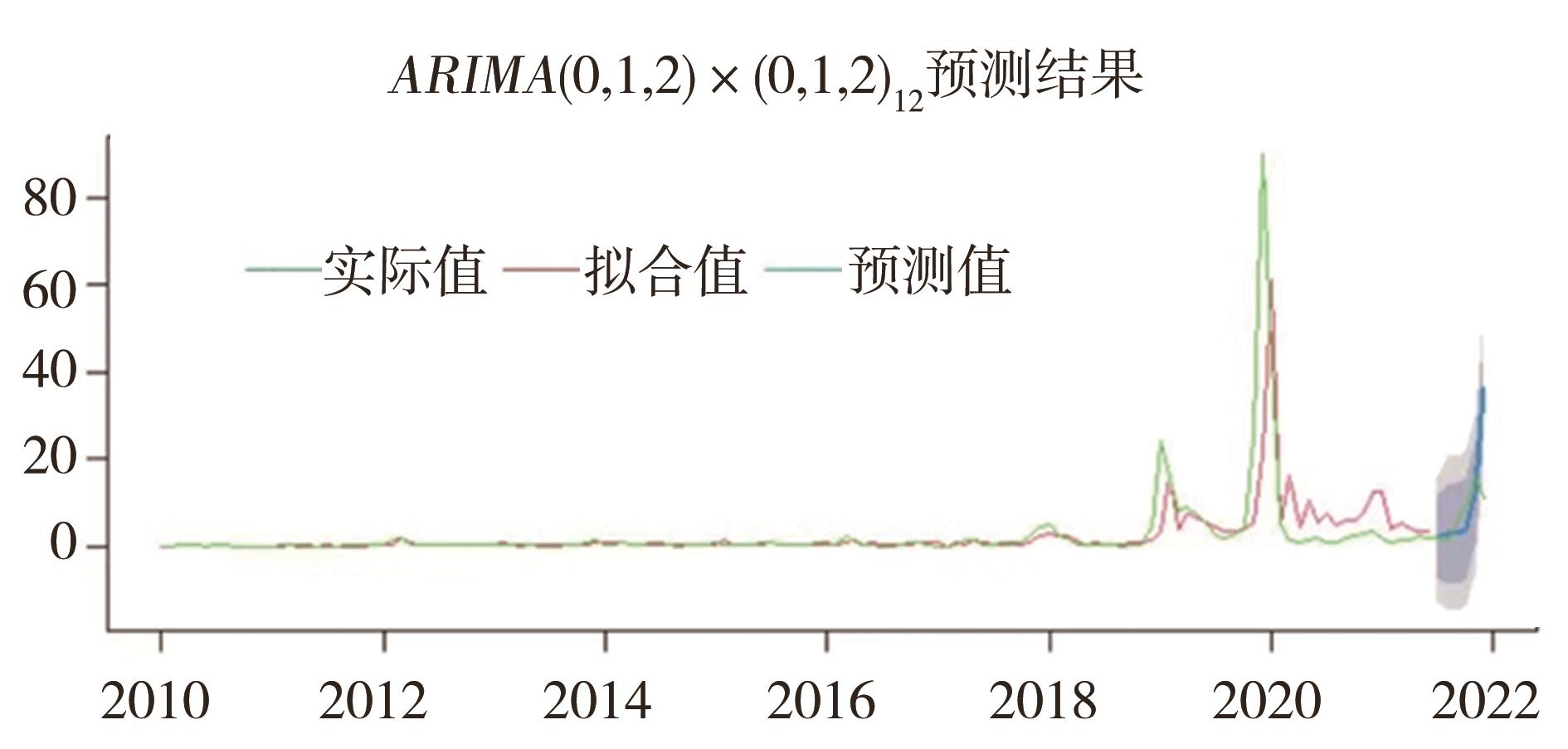 摘要:目的 分析流感的流行趋势,构建流行性感冒发病的自回归滑动平均混合模型(autoregressive integrated moving average,ARIMA)并对验证集进行预测,为重庆市流感的防治提供科学依据。方法 本研究采用R软件对重庆市2010年1月至2021年6月的流感数据进行ARIMA模型拟合,用2021年7月至2021年12月的数据评价模型拟合效果。结果 该流感疾病的流行呈现出明显的季节周期性,周期为1年,发病高峰期为冬季和春季,整体患病率呈上升后有下降趋势,拟合最佳模型为ARIMA(0,1,2)×(0,1,2)12,且该模型在预测2021年7月至12月罹患率的均方根误差为10.70,平均绝对百分比误差为70.04%,预测效果较好。结论 ARIMA模型在预测重庆市流感发病和流行趋势上有一定的效果,并能对未来的罹患率进行估计,可以为今后的流感疾病防控工作提供参考。