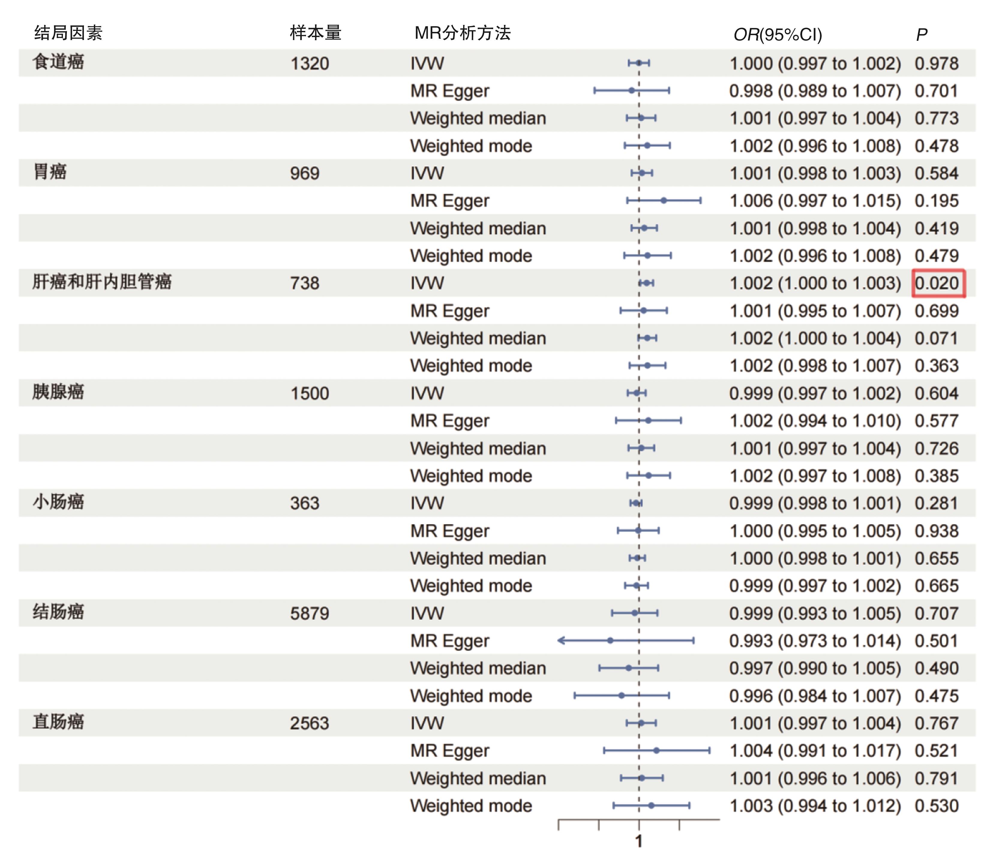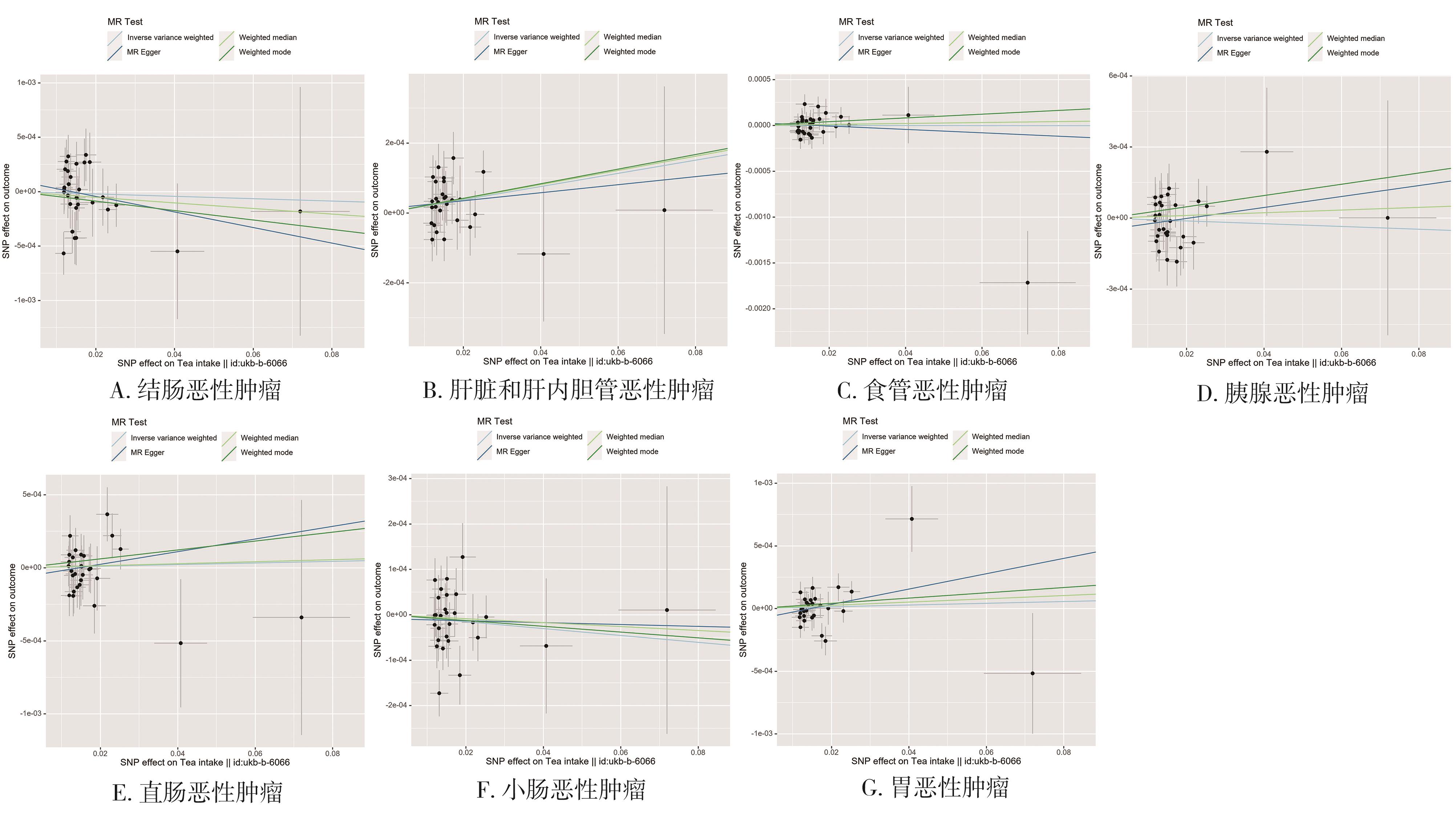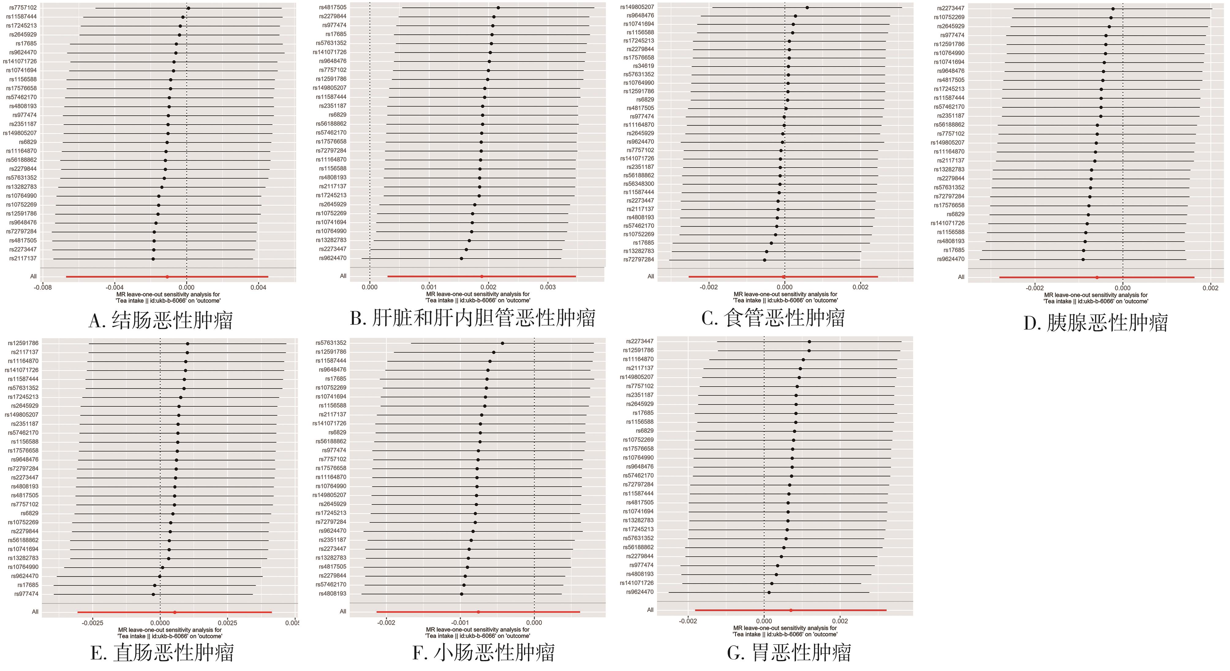 摘要:目的 采用两样本的孟德尔随机化(two-sample mendelian randomization,TSMR)分析方法,探讨茶摄入量与消化系统恶性肿瘤之间的因果关联。方法 在欧洲人群的全基因组关联研究(genome-wide association study,GWAS)中选择与暴露因素茶摄入量密切相关的单核苷酸多态性(single nucleotide polymorphisms,SNP)作为工具变量。英国生物库联合会(United Kingdom Biobank,UKB)提供了消化系统肿瘤的汇总统计数据作为结局变量,其中包括食道癌、胃癌、小肠癌、结肠癌、直肠癌、肝癌及肝内胆管癌。采用逆方差加权(inverse-variance weighted,IVW)作为主要分析方法,并进行了异质性检验、多效性分析以及敏感性分析以评价研究的可靠性。结果 本研究在全基因组显著性水平(P<5×10-8)上,共纳入32个独立与茶摄入量相关的SNPs作为工具变量。IVW分析方法显示,茶摄入量与发生肝癌或肝内胆管癌的风险增加相关(OR=1.0019,95%CI=1.0003~1.0035,P=0.020),而茶摄入量与其他消化系统肿瘤的发生在统计学上没有明显联系。研究结果均不受多效性、异质性的影响,敏感性分析验证了结果的可靠性。结论 这项孟德尔随机研究表明,饮茶可能是增加肝癌和肝内胆管癌风险的一个危险因素,但目前仍需更大样本量的GWAS数据进行进一步的孟德尔随机化研究来验证这种关系。