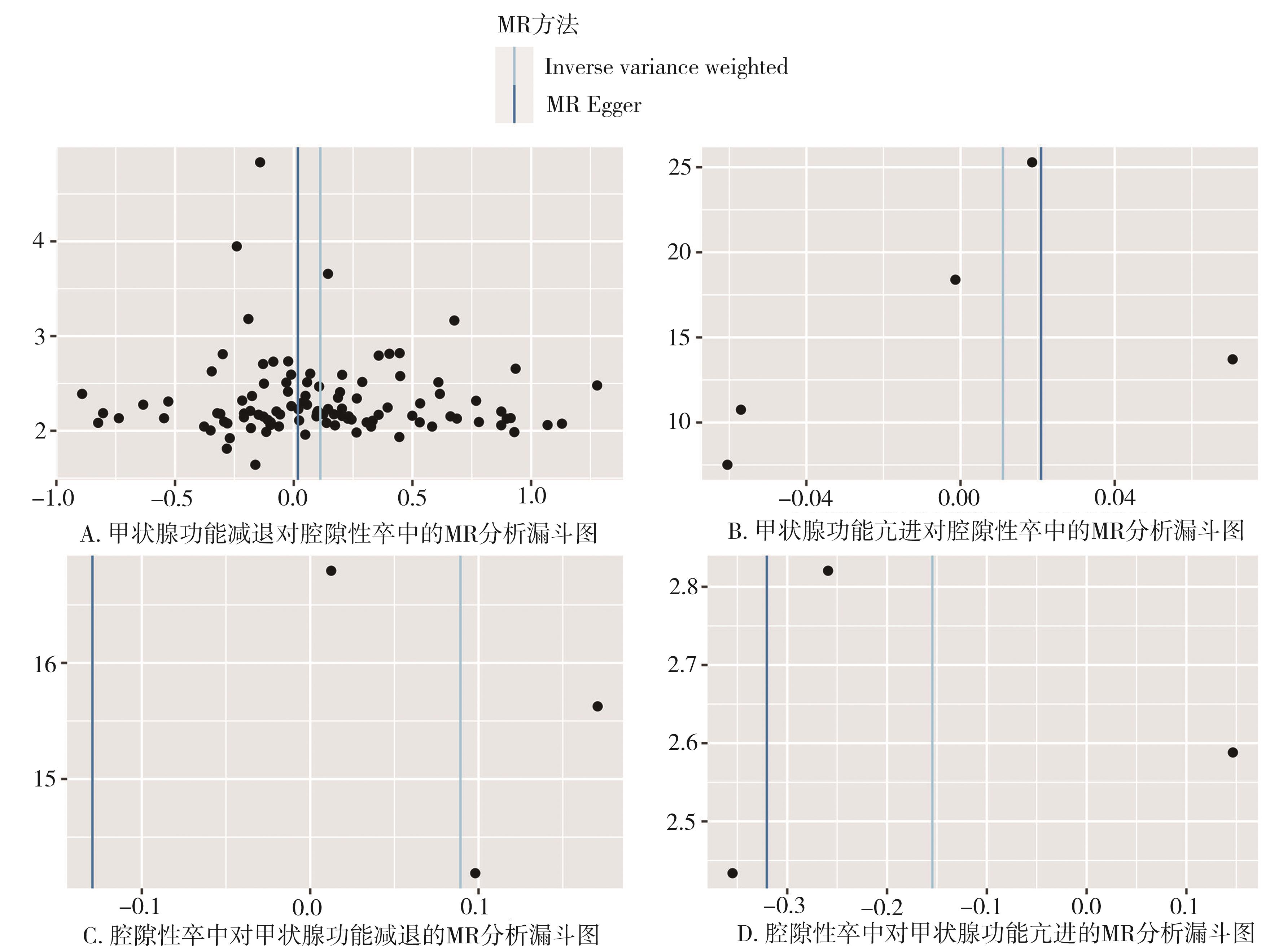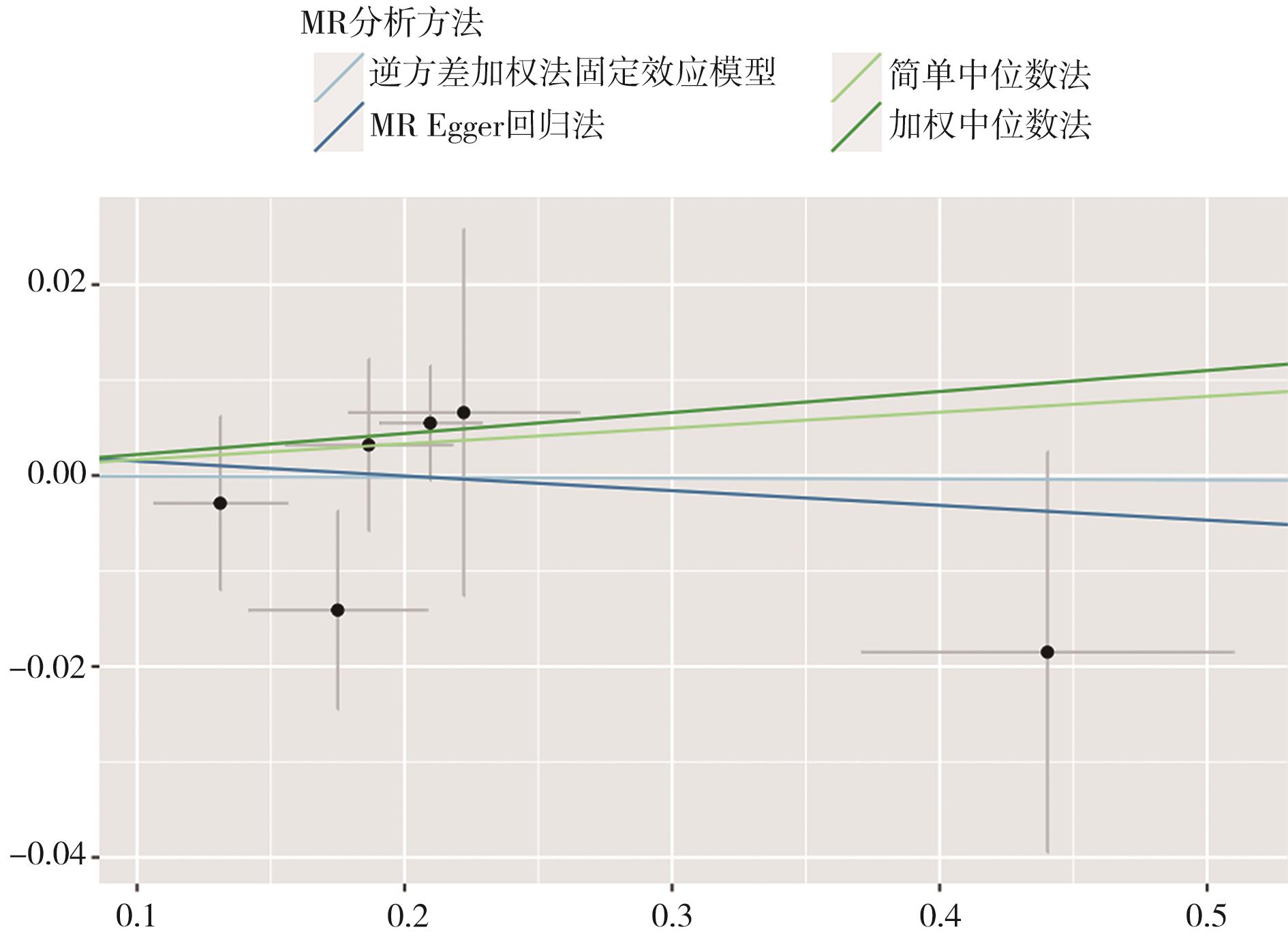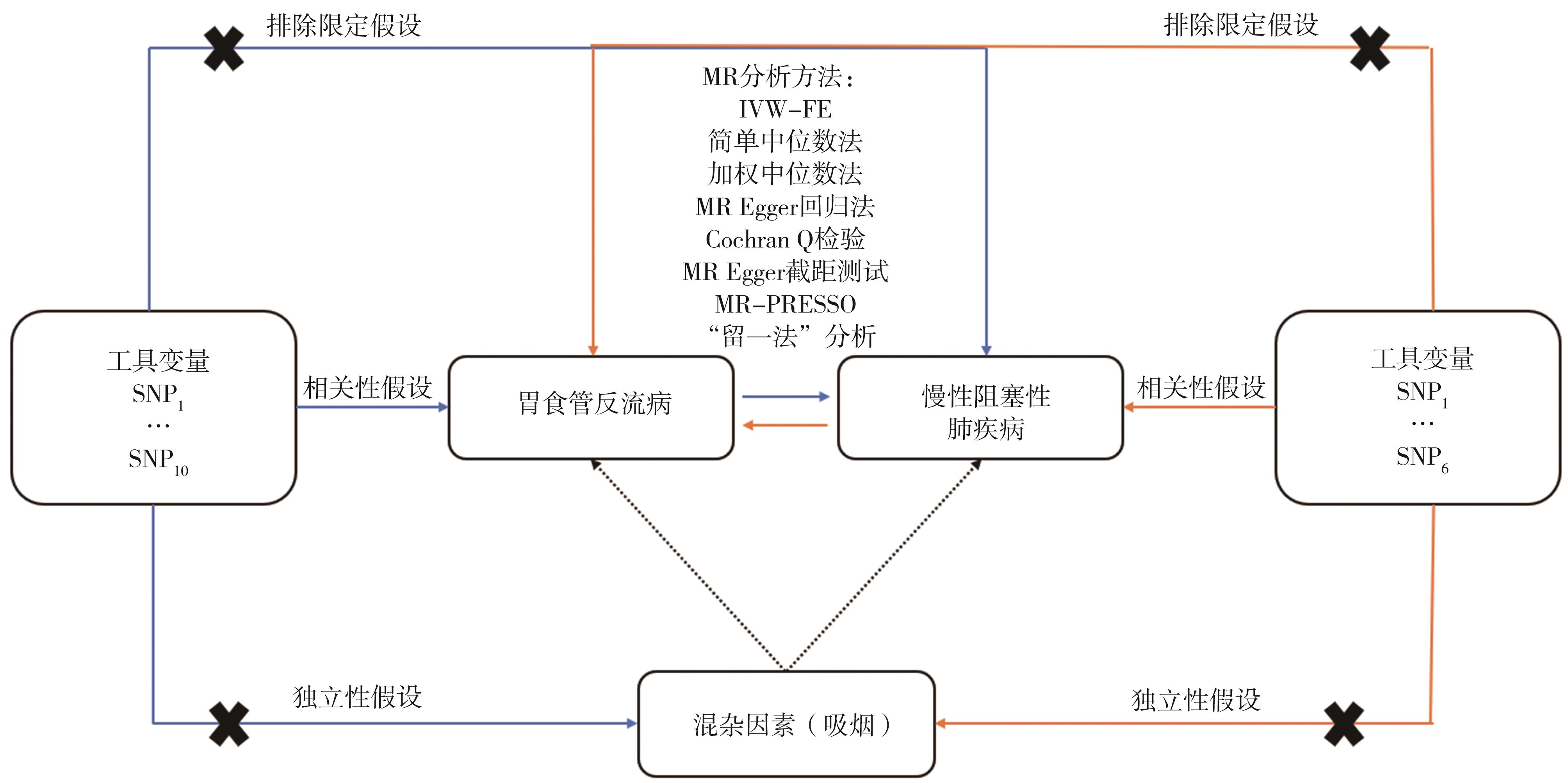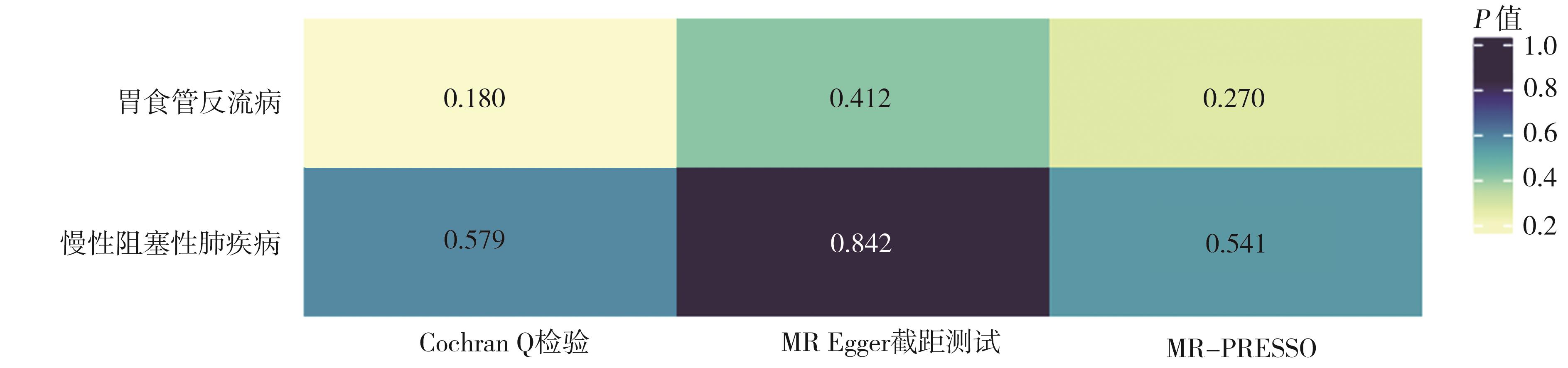 摘要:目的 采用两样本双向孟德尔随机化(Mendelian randomization,MR)方法研究胃食管反流病(gastroesophageal reflux disease,GERD)与慢性阻塞性肺疾病(chronic obstructive pulmonary disease,COPD)的因果关系。方法 基于大规模全基因组关联研究(genome-wide association studies,GWAS)汇总数据,选择相互独立且与胃食管反流病及COPD高度相关的单核苷酸多态性(single nucleotide polymorphism,SNP)作为工具变量。采用逆方差加权法固定效应模型(inverse variance weighted-fixed effects,IVW-FE)为主要分析方法,简单中位数法、加权中位数法、MR Egger回归法进行结果验证和稳定性检验;采用F统计量、Cochran Q检验、MR Egger截距测试、孟德尔随机多态性残差和离群值(mendelian randomization pleiotropy residual sum and outlier,MR-PRESSO)检验、“留一法”进行敏感性分析。以比值比(odds ratio,OR)及95%置信区间(confidence interval,CI)作为效应指标对胃食管反流病及COPD的双向因果关系进行探讨。结果 IVW-FE分析表明胃食管反流病可增加COPD的患病风险(OR=1.757,95%CI=1.425~2.166,P=0.000),且在简单中位数法、加权中位数法中被证实。然而MR Egger回归法未显示出二者之间的因果关联。在反向MR分析中,IVW-FE分析显示没有证据表明COPD增加胃食管反流病的发病风险(OR=0.999,95%CI=0.962~1.037,P=0.962),同样简单中位数法、加权中位数法、MR Egger回归法未发现二者存在因果关联。工具变量的F值均大于10,不存在弱工具变量;Cochran Q检验、MR Egger截距测试、MR-PRESSO检验表明工具变量间不存在异质性或水平多效性;“留一法”分析显示没有单个SNP对整体结果有较大影响。结论 胃食管反流病与COPD的风险增加有显著的因果关系,但是没有发现COPD导致胃食管反流病风险增加的证据。
