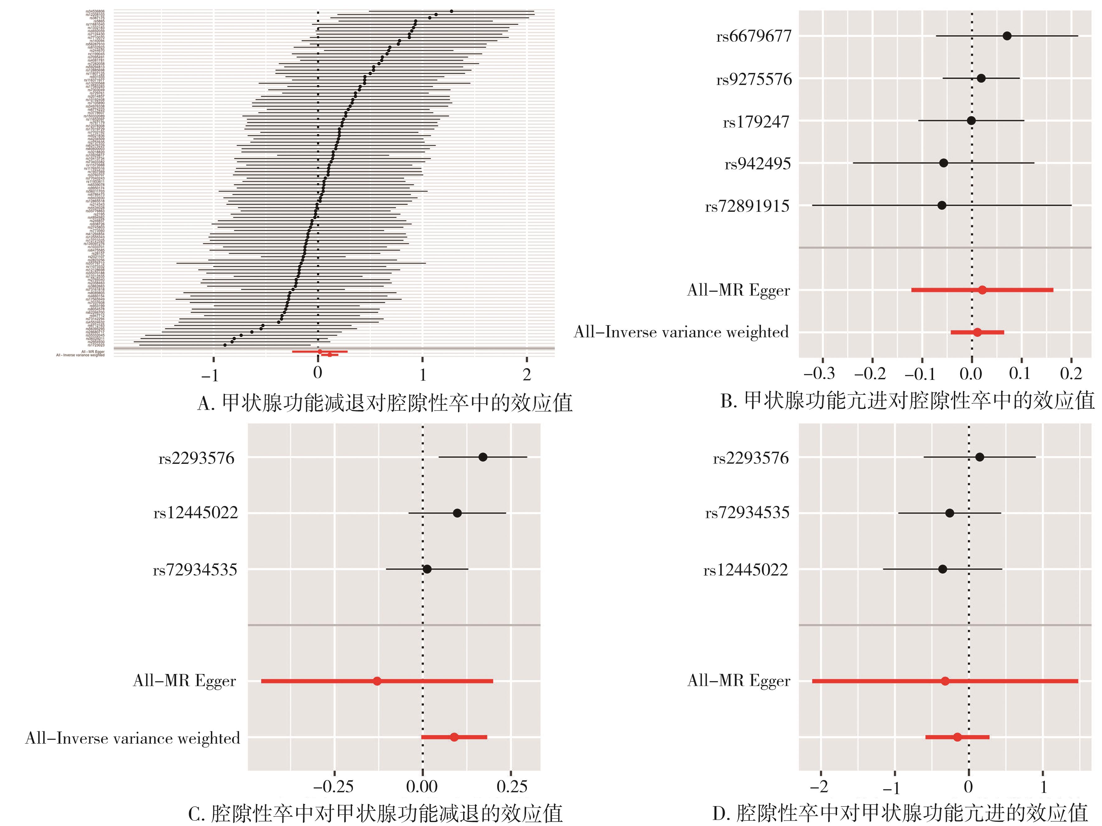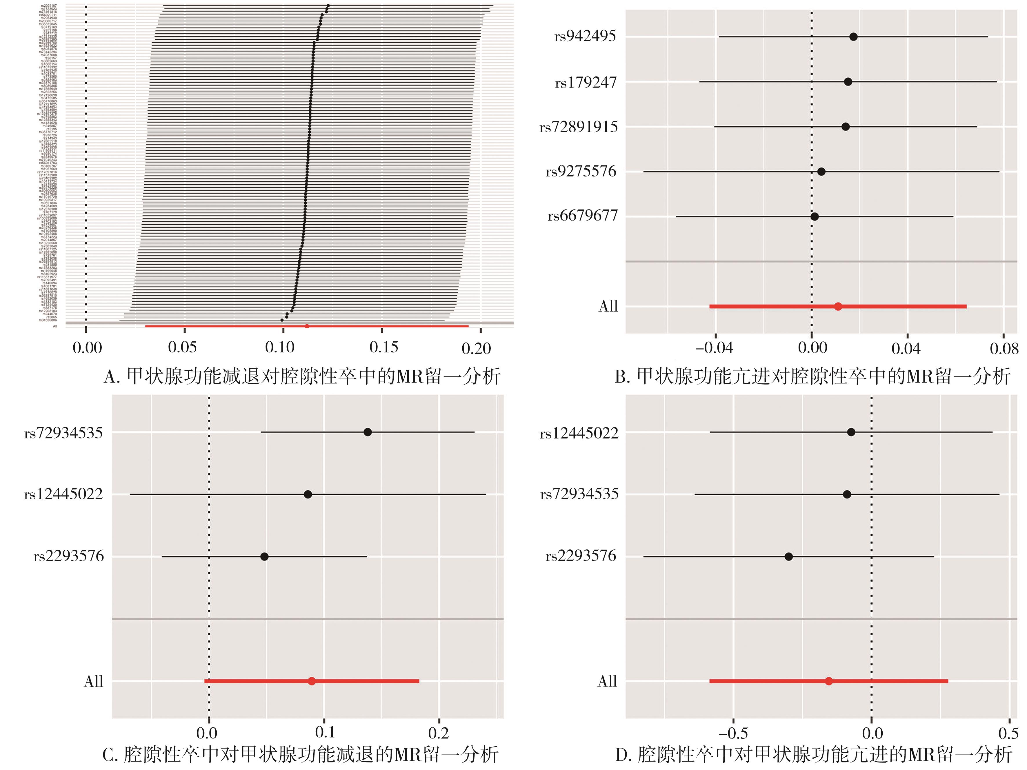 摘要:目的 通过两样本孟德尔随机分析(Mendelian randomization,MR)探讨甲状腺功能障碍与腔隙性卒中之间的因果关系。方法 从已发表的全基因组关联研究(genome-wide association studies,GWAS)中提取甲状腺功能减退症、甲状腺功能亢进和腔隙性卒中的GWAS汇总数据,分别包含494 577、172 938和254 459个样本。在正向MR分析中,本研究以甲状腺功能减退和甲状腺功能亢进作为暴露,分别获取了103和5个单核苷酸多态性(single nucleotide polymorphism,SNP)作为工具变量(instrumental variable,IV),以腔隙性卒中作为结局。在反向MR分析中,以腔隙性卒中作为暴露获取了3个SNP作为IV,以甲状腺功能减退和甲状腺功能亢进作为结局。双向MR分析均应用逆方差加权(inverse variance weighted,IVW)作为主要分析方法,加权中位数(weighted median,WM)和MR-Egger作为补充分析方法以评估因果效应。同时还进行了异质性和多效性检验并使用留一法分析评估结果的稳定性。结果 遗传预测的甲状腺功能减退与腔隙性卒中的风险增加相关(IVW:OR=1.118,95%CI=1.030~1.214),未发现甲状腺功能亢进对腔隙性卒中(IVW:OR=1.011,95%CI=0.958~1.067)以及腔隙性卒中对甲状腺功能减退(IVW:OR=1.093,95%CI=0.996~1.200)和腔隙性卒中对甲状腺功能亢进(IVW:OR=0.857,95%CI=0.556~1.320)存在因果关联。结论 甲状腺功能减退与腔隙性卒中风险增加有关,在甲状腺功能亢进对腔隙性卒中的研究及反向研究中并未发现因果关联,该研究结果需要进一步的实验室研究进行验证,以及未来更大样本量的研究提供证据支持。