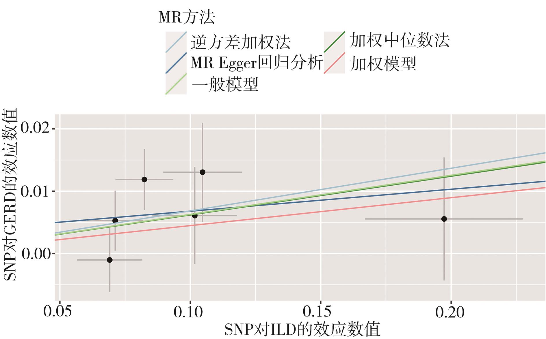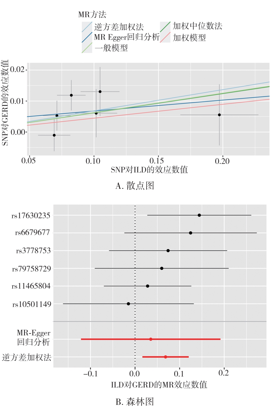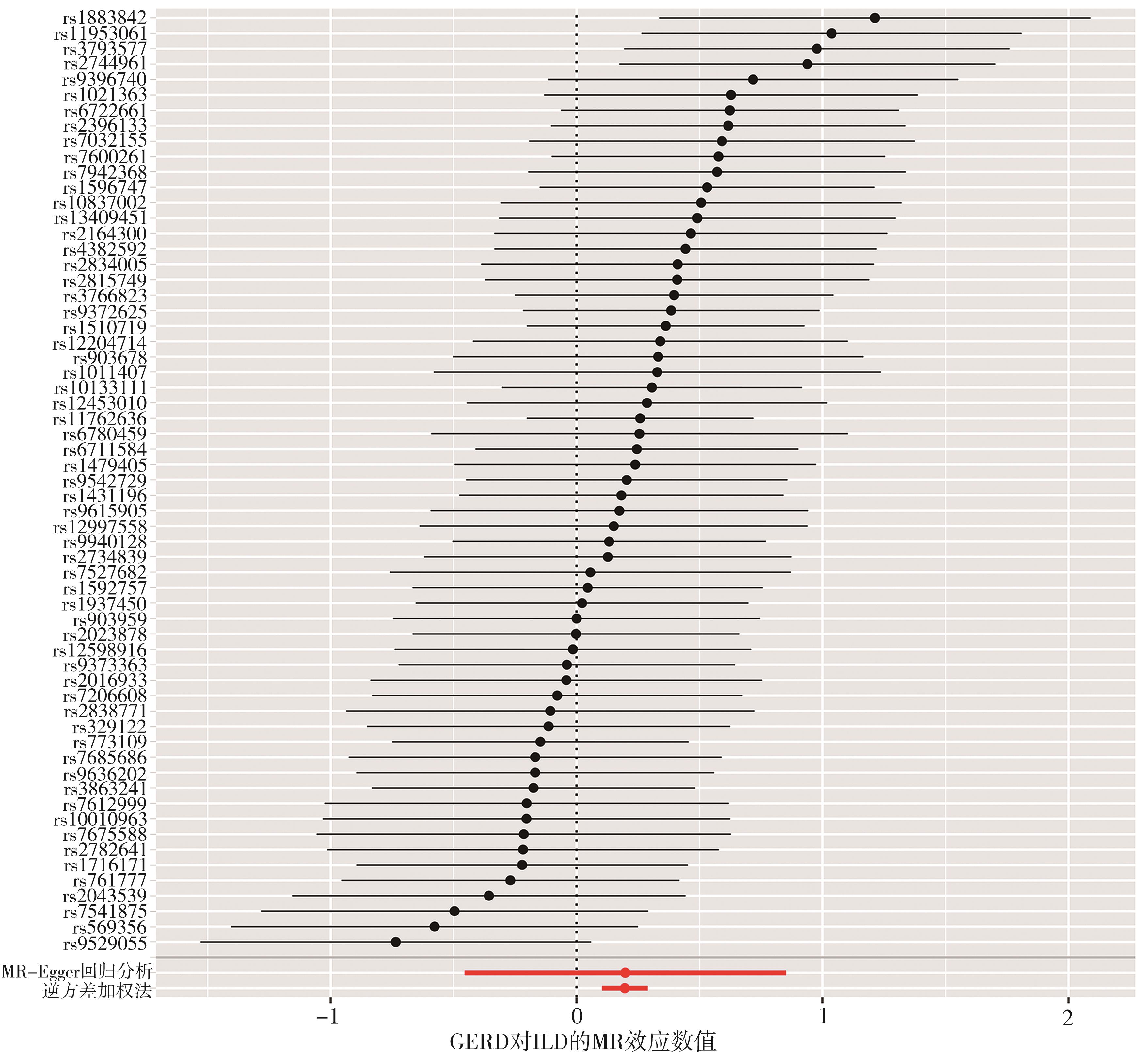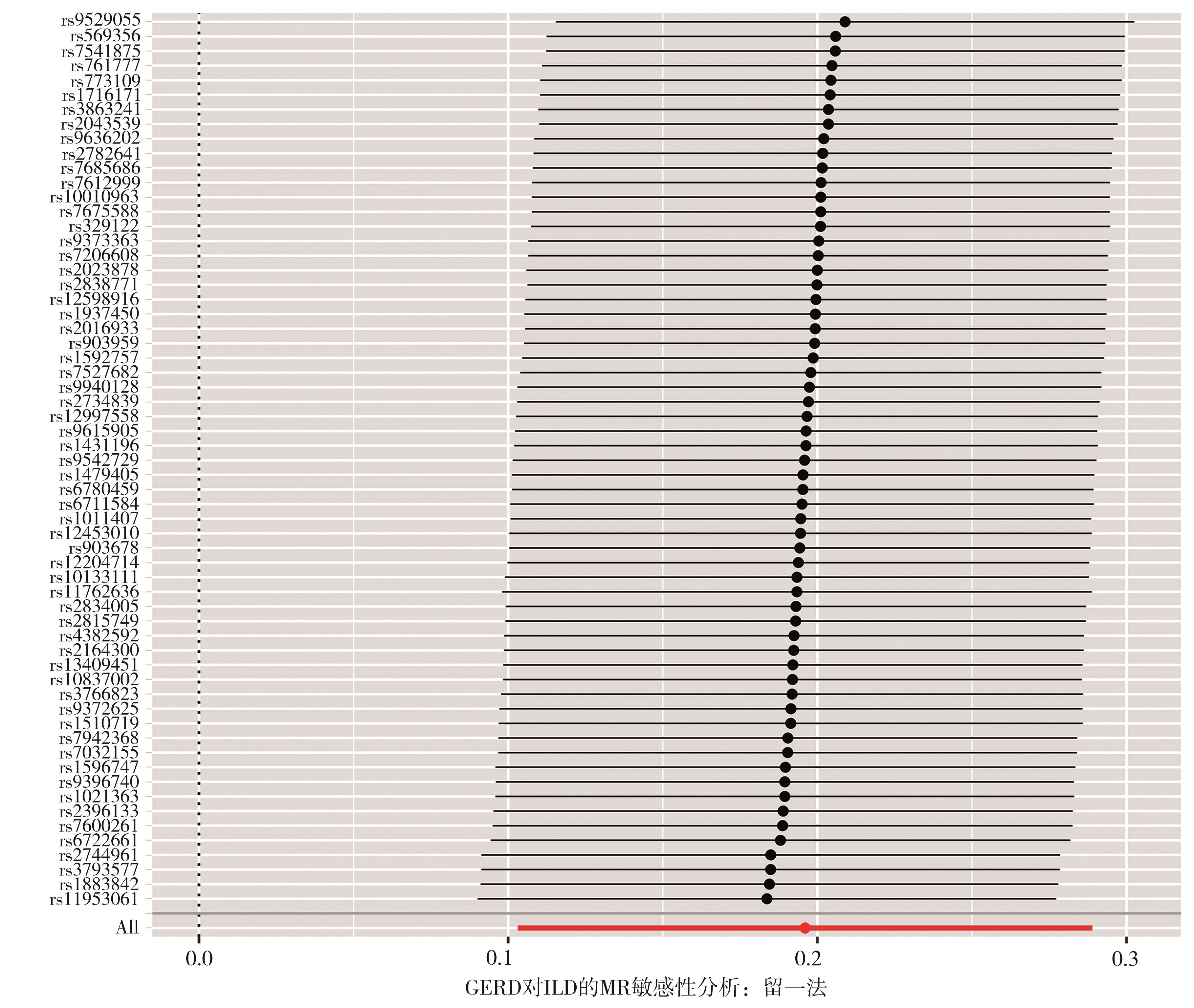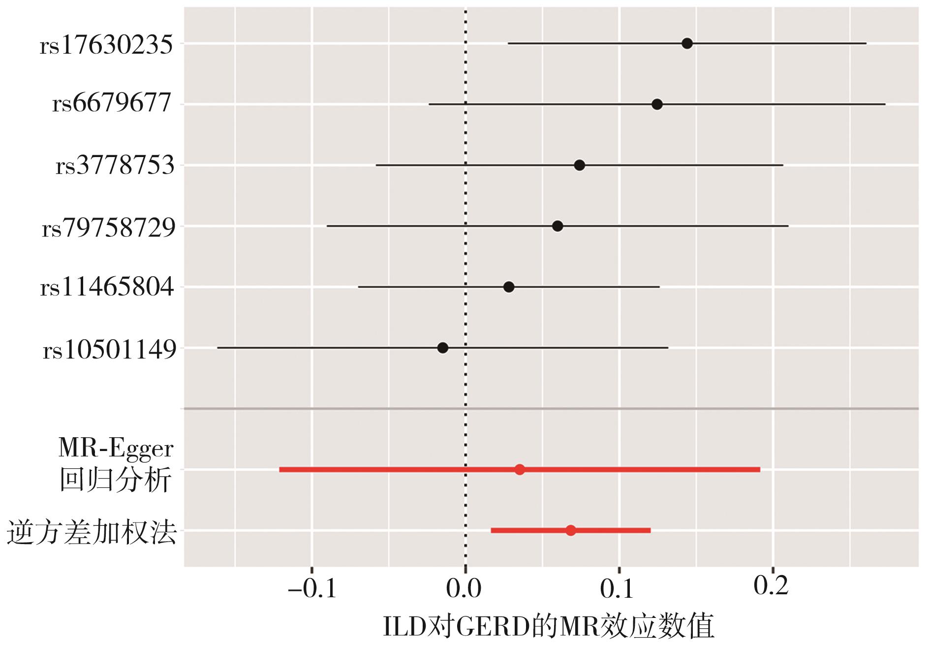摘要:目的 临床观察及流行病学调查发现胃食管反流病(gastroesophageal reflux disease,GERD)与间质性肺疾病(interstitial lung disease,ILD)具有相关性,本文章旨在通过孟德尔随机化分析(Mendelian randomization,MR)方法,研究GERD与ILD是否相互存在因果关联,以及这些关联的方向性。方法 从全基因组关联研究(genome-wide association studies,GWAS)汇总数据中选择符合条件的单核苷酸多态性(single nucleotide polymorphisms,SNPs)作为工具变量(instrumental variables,IVs)进行分析,分别采用逆方差加权法(inverse-variance weighted,IVW)、MR-Egger回归分析、加权中位数法(weighted median estimator,WME)等进行两样本孟德尔随机化分析,其中IVW用于主要分析;在进行敏感性分析时,采用MR-PRESSO检验和MR-Egger回归分析以检测和纠正水平多效性;采用留一法、Cochran’s Q检验、漏斗图以评估MR结果的稳定性和可靠性,以OR值评价GERD与ILD的因果关系。结果 IVW结果显示GERD可增加患ILD的风险,GERD对数变换后每增加一个标准差,会导致ILD的风险增加22%(OR=1.22,95%CI=1.11~1.33,P=3.52e-05)。反之,ILD也可增加患GERD的风险。结论 GERD与ILD具有双向因果关系。