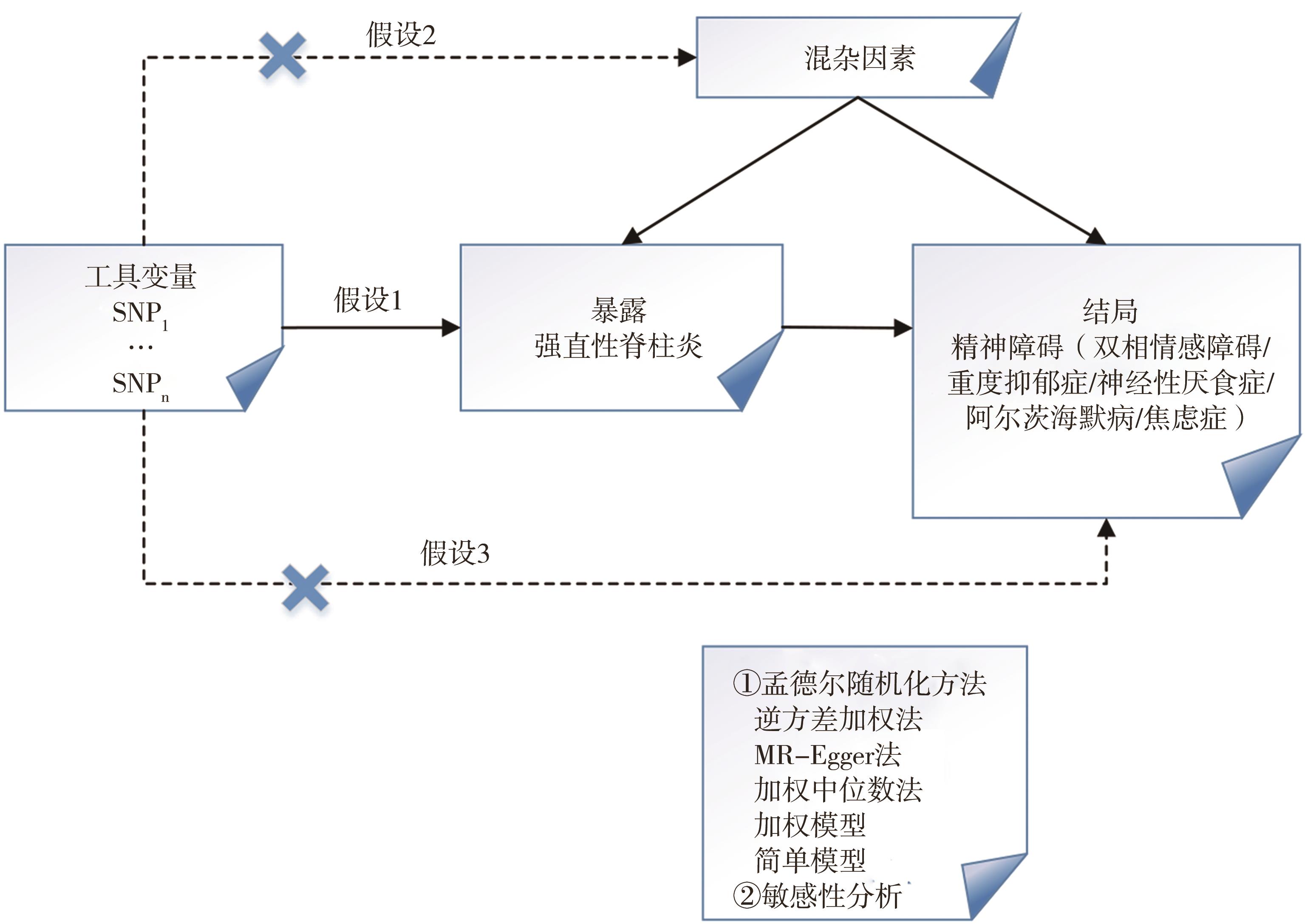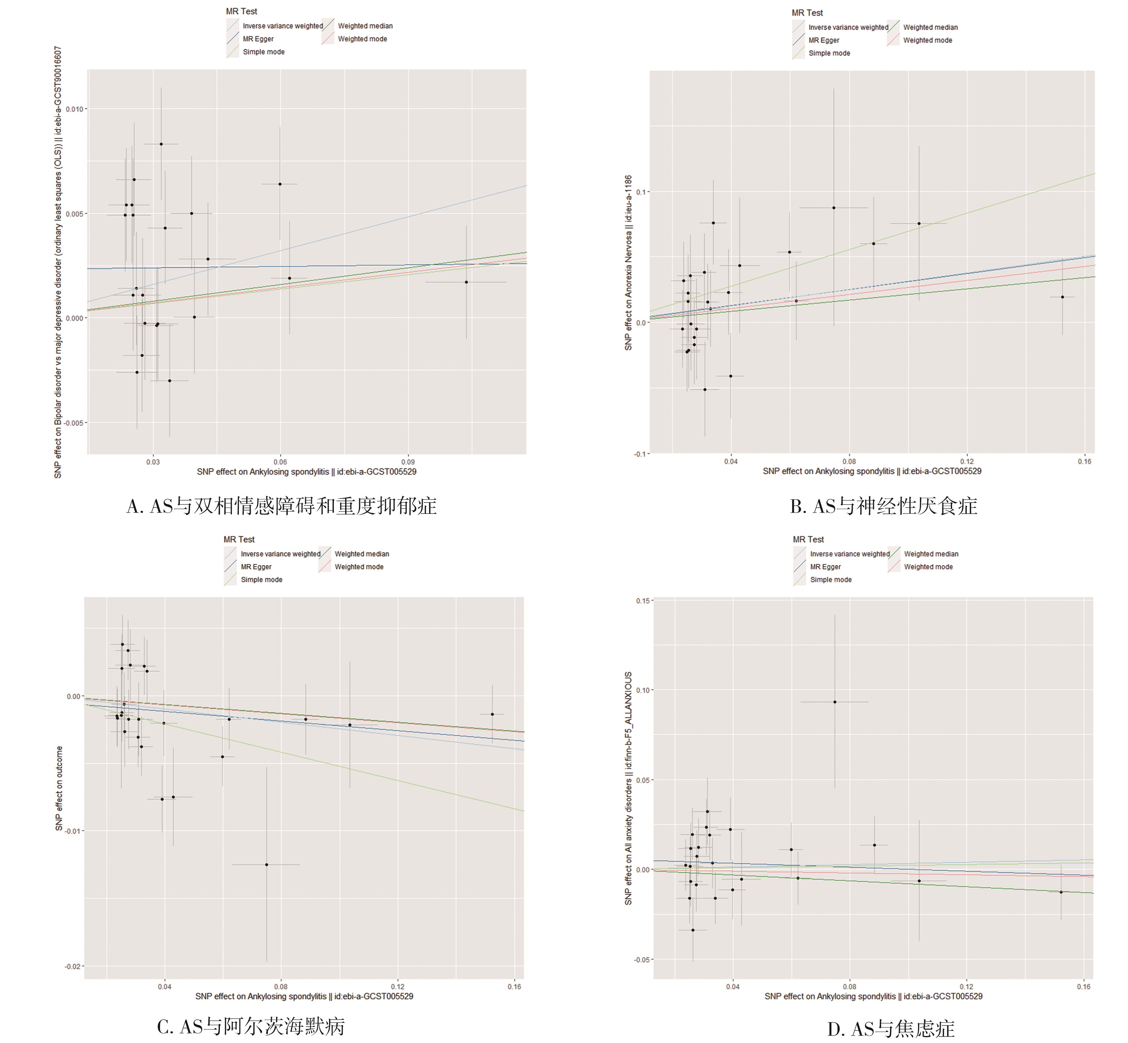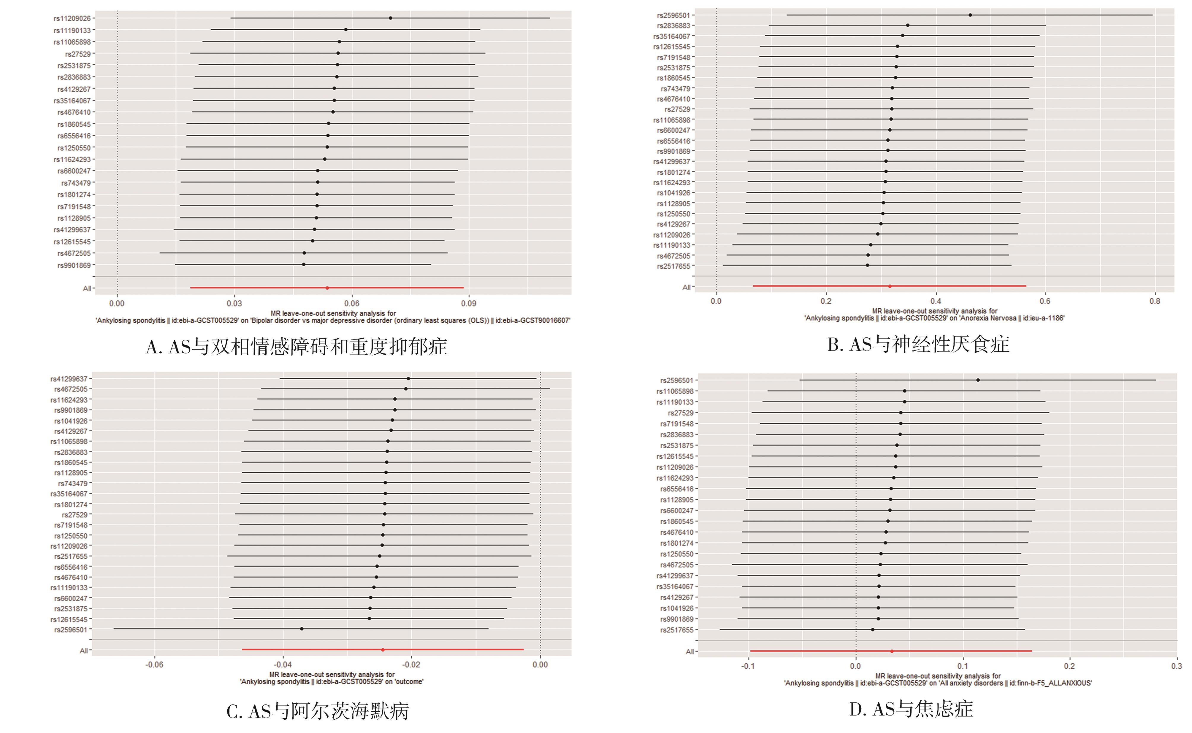 摘要:目的 采用两样本孟德尔随机化(two-sample Mendelian randomization,TSMR)分析方法,探讨强直性脊柱炎(ankylosing spondylitis,AS)与精神障碍之间潜在的因果关联,从遗传学角度为AS患者早期预防精神障碍的发生发展提供参考。方法 通过对非重叠全基因组关联研究公开数据进行筛选,以AS作为暴露数据,精神障碍(双相情感障碍和重度抑郁症、神经性厌食症、阿尔茨海默病、焦虑病)作为结局数据,采用逆方差加权法(inverse-variance weighted,IVW)作为该研究评估因果效应的主要分析方法,MR-Egger法、加权中位数法(weighted median)、加权模型(weighted mode)、简单模型(simple mode)等作为补充方法,并通过Cochran’s Q、MR-Egger-intercept进行敏感性分析。结果 ①IVW结果表明遗传预测的AS与双相情感障碍和重度抑郁症(OR=1.055,95%CI=1.019~1.093,P=0.003)、神经性厌食症(OR=1.370,95%CI=1.068~1.759,P=0.013)呈正向因果关系;与阿尔茨海默病(OR=0.976,95%CI=0.955~0.997,P=0.029)呈负向因果关系;与焦虑症(OR=1.034,95%CI=0.906~1.179,P=0.620)之间未发现因果关联。②敏感性分析未发现存在异质性以及水平多效性(P>0.05),表明研究结果没有产生偏倚,留一法也提示结果稳健。结论 本研究提供了AS与精神障碍之间因果关系的新证据,AS可能与双相情感障碍和重度抑郁症及神经性厌食症风险增加有关,为精神障碍的遗传研究提供了新的见解,但未来仍需更大样本量的全基因组关联研究数据通过进一步的孟德尔随机化研究来验证这种关系。