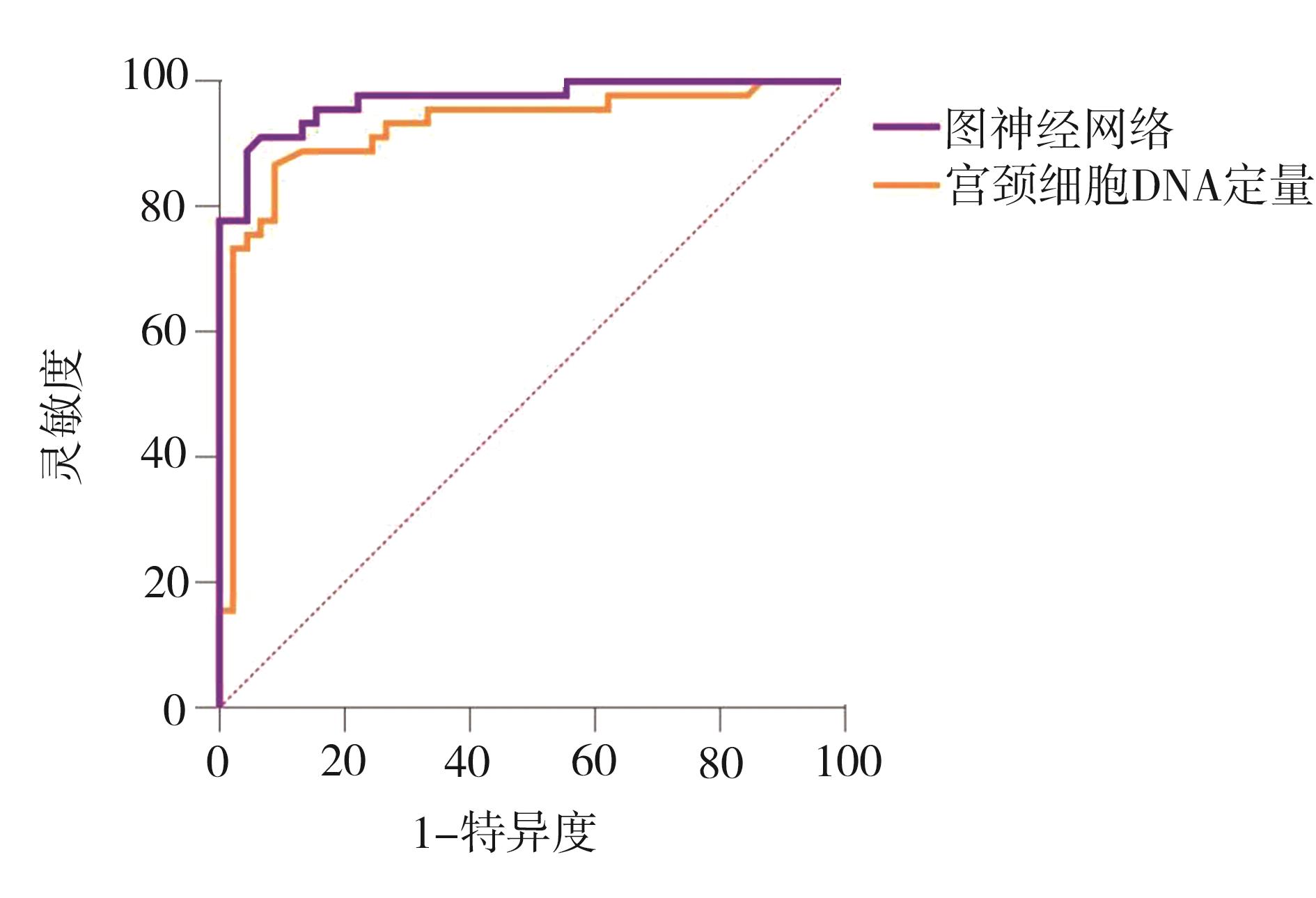 摘要:目的 基于图神经网络对比分析宫颈癌筛查系统(truScreen,TS)、宫颈细胞DNA定量检查高危型人乳头瘤病毒(human papillomavirus,HPV)阳性患者中筛查宫颈癌及癌前病变的效果。方法 选取2022年1月至2023年5月于重庆大学附属黔江医院妇科门诊行宫颈癌高危型HPV检测阳性的400例患者为研究对象。对所有研究对象依次进行TS、宫颈细胞DNA定量、阴道镜下组织病理学检查。以组织病理检查为“金标准”,除采用TS系统已有模块外,基于图神经网络进行标识学习,提取特征,随后使用支持向量机(support vector machines,SVM)和随机森林(random forest,RF)等分类器进行分类,计算并比较 TS、宫颈细胞DNA定量筛查宫颈癌及癌前病变的灵敏度、特异度、受试者工作特征(receiver operating characteristic,ROC)曲线下面积(area under the curve,AUC)、阴性预测值、阳性预测值、与活检病理结果一致性检验统计量Kappa值。结果 TS融合图神经网络筛查宫颈癌及癌前病变的灵敏度、特异度、AUC、阴性预测值、阳性预测值分别为93.75%、95.45%、0.97、98.18%、87.50%,均高于宫颈细胞DNA定量检查(分别为81.25%、90.91%、0.92、96.15%、64.29%)。与活检病理结果的一致性检验显示,TS融合图神经网络与活检病理结果的Kappa值为0.89,高于宫颈细胞DNA定量检查(0.72)。ROC曲线下面积的比较显示,TS融合图神经网络与宫颈细胞DNA定量检查之间存在显著差异。结论 TS融合图神经网络在高危型HPV阳性患者中筛查宫颈癌及癌前病变的效果优于宫颈细胞DNA定量检查,具有较高的准确性和可靠性,可作为一种简单、有效的宫颈癌筛查方法。