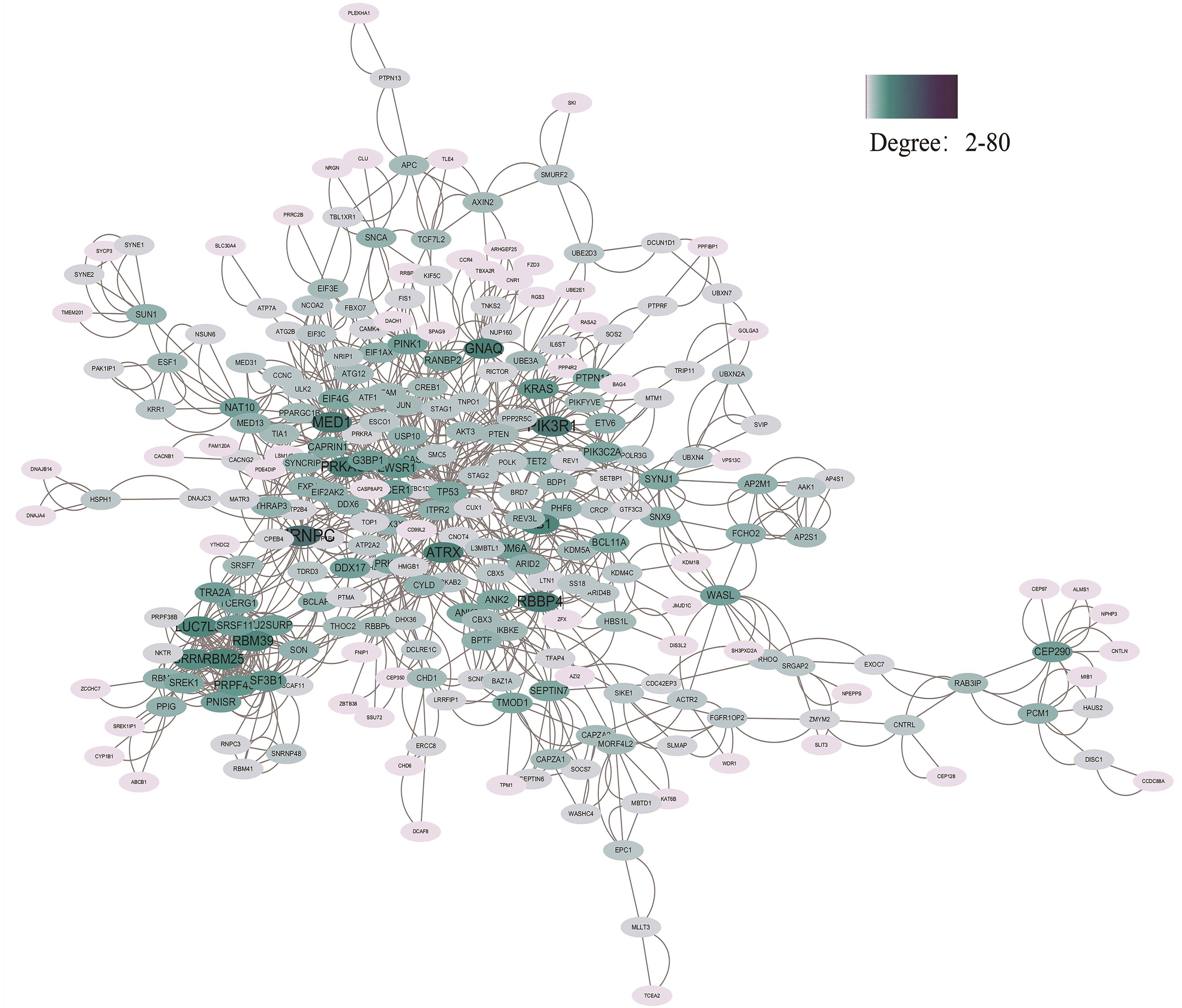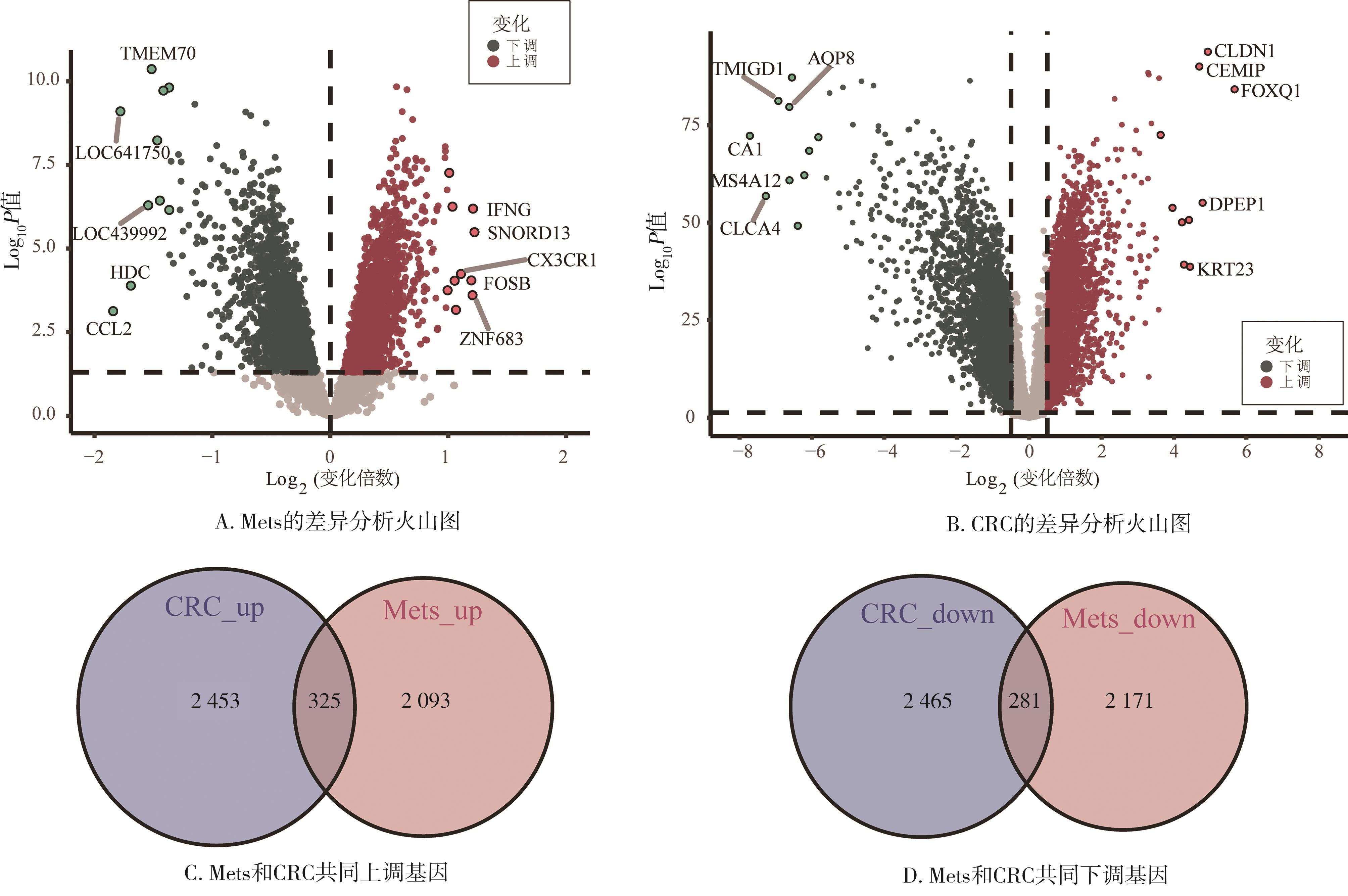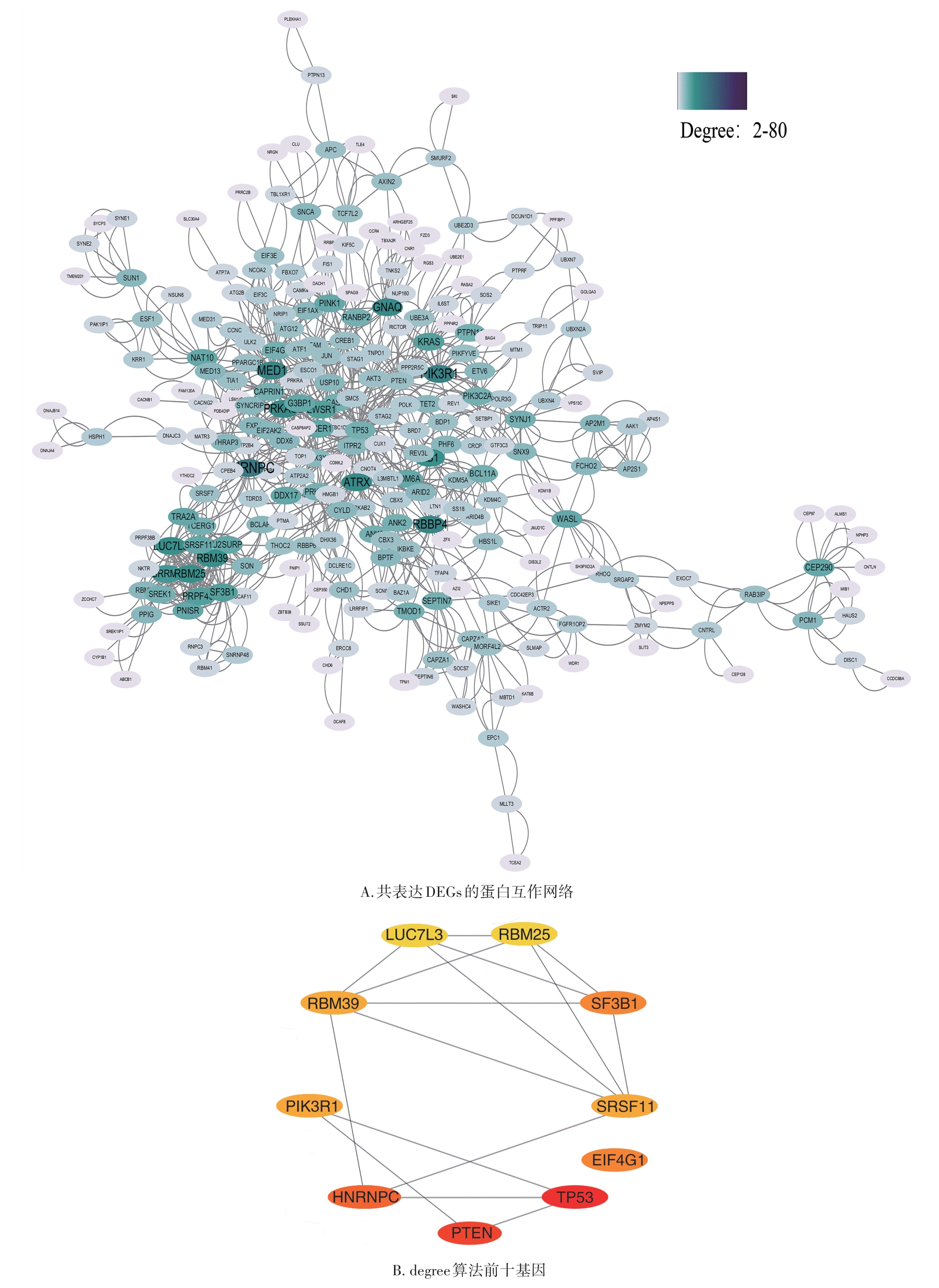 摘要:目的 基于生物信息学筛选阿尔茨海默病(Alzheimer's disease,AD)患者外周血和海马组织中有共同表达趋势的差异基因,为AD的诊断、治疗靶点的筛选提供新的思路。方法 从基因表达综合数据库(Gene Expression Omnibus,GEO)下载关于AD的数据集GSE97760(9例AD、10例健康对照)、GSE5281(10例AD、13例健康对照)进行生物信息学分析。分别筛选AD患者外周血和海马组织的差异表达基因(differentially expressed genes,DEGs),并确定2个数据集中有共同表达趋势的DEGs。对共表达DEGs进行基因本体论(Gene Ontology,GO)富集分析和京都基因与基因组百科全书(Kyoto Encyclopedia of Genes and Genomes,KEGG)通路分析,构建蛋白互作(protein-protein interaction,PPI)网络进一步筛选关键基因,并对关键基因进行验证。结果 基于对2个GEO数据集的综合分析,共筛选出669个共表达DEGs,包括64个上调DEGs、605个下调DEGs,GO和KEGG分析分别揭示了174个关键条目、40个关键通路,主要在RNA聚合酶的转录调控、神经胶质瘤通路等方面显著富集。通过PPI网络进一步筛选出10个与AD相关的关键基因TP53、PTEN、HNRNPC、EIF4G1、SF3B1、SRSF11、PIK3R1、RBM39、LUC7L3、RBM25,其中PTEN、HNRNPC、SF3B1、PIK3R1、LUC7L3在数据集GSE48350中得到了验证。结论 本研究筛选得出的5个值得进一步研究的关键基因(PTEN、HNRNPC、SF3B1、PIK3R1、LUC7L3),可作为AD诊断的潜在生物标志物。