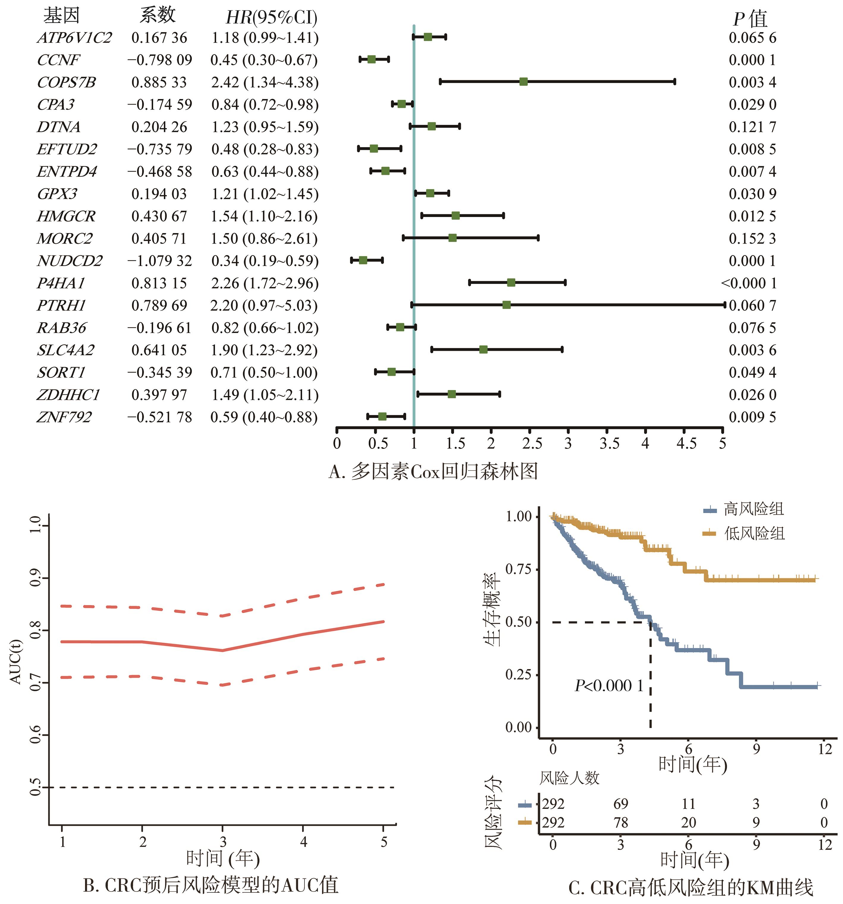 摘要:目的 识别代谢综合征(metabolic syndrome,MetS)与结直肠癌(colorectal cancer,CRC)共同的基因特征和生物学通路,并筛选与MetS相关的CRC预后生物标志物。方法 对MetS、CRC和相应的对照样本进行差异分析,以识别表达差异的基因作为与疾病相关的基因。根据这些基因的表达特征进行功能富集分析,以识别受调控的生物学功能。利用单因素Cox回归鉴定与CRC预后相关的MetS基因,并使用LASSO和多因素Cox回归分析构建CRC的预后预测模型。基于汇总数据的孟德尔随机化分析(Summary-data-based Mendelian Randomization,SMR)进一步确认MetS基因与CRC预后的因果关系。结果 325个基因在MetS和CRC中表达上调,281个基因表达下调。研究还发现,Apelin信号和胞吐等通路在2种疾病中被抑制,而核酸修复通路则被激活。其中,有60个与MetS和CRC共享的基因与CRC的预后相关。18个基因被用于构建预测模型,在TCGA数据库的CRC队列中,模型在1~5年的曲线下面积(area under the curve,AUC)值均大于0.75,表现出良好的预测性能。通过SMR分析进一步确定,P4HA1和LARS2与CRC预后具有因果关系。结论 MetS和CRC具有共同的基因特征和通路,炎症可能为2种疾病相关的基础,共享基因对CRC的预后有影响。