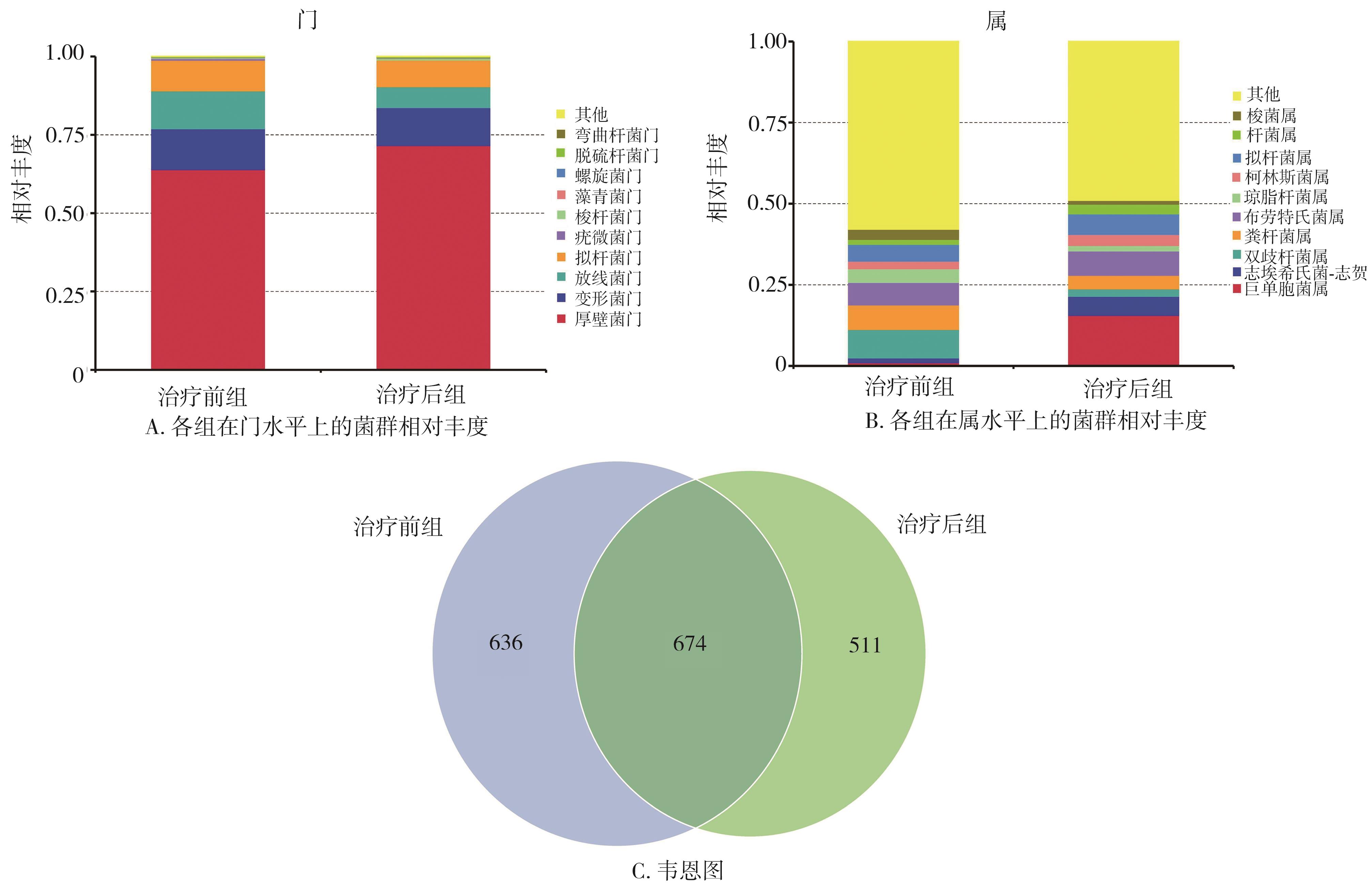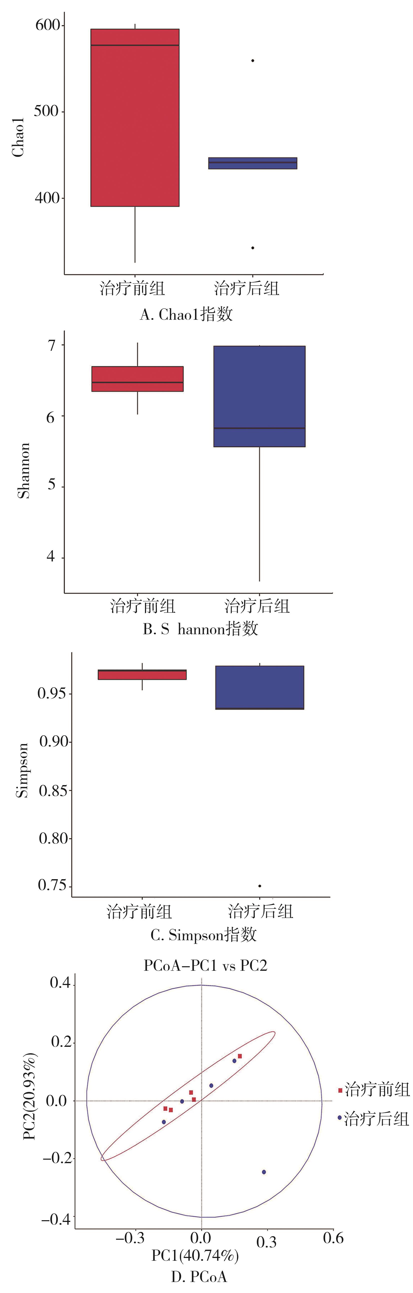 摘要:目的 通过 16s rRNA 测序联合代谢组学探讨逍遥抑激汤治疗腹泻型肠易激综合征(diarrhea-predominant irritable bowel syndrome,IBS-D)的作用机制。方法 招募10例就诊于陕西省中医医院且符合纳入标准的IBS-D患者,收集患者逍遥抑激汤治疗前后的粪便样本,进行16s rRNA测序,多样性分析肠道菌群组成和群落结构的差异,筛选差异性菌群;通过粪便代谢组学分析筛选分析差异性表达代谢产物和通路。结果 IBS-D患者在逍遥抑激汤治疗后,门水平上肠道菌群中的厚壁菌门、变形菌门、放线菌门、拟杆菌门发生明显改变,厚壁菌门明显上调,属水平上巨单胞菌、志贺氏埃希氏菌、双歧杆菌、普拉梭菌是优势菌群,多样性分析表明治疗后肠道菌群物种丰富度减低,但均匀度和多样性均增加,群落结构和组成基本一致,Negativicutes、韦荣球菌属是组间具有统计学差异的特异性菌群。筛选出21种疾病相关的差异代谢产物,涉及16条代谢相关通路,苯丙氨酸代谢影响最显著。结论 逍遥抑激汤可能通过调控厚壁菌门、韦荣球菌等肠道菌群,调控苯丙氨酸代谢和组氨酸代谢等通路以达到治疗IBS-D的作用。