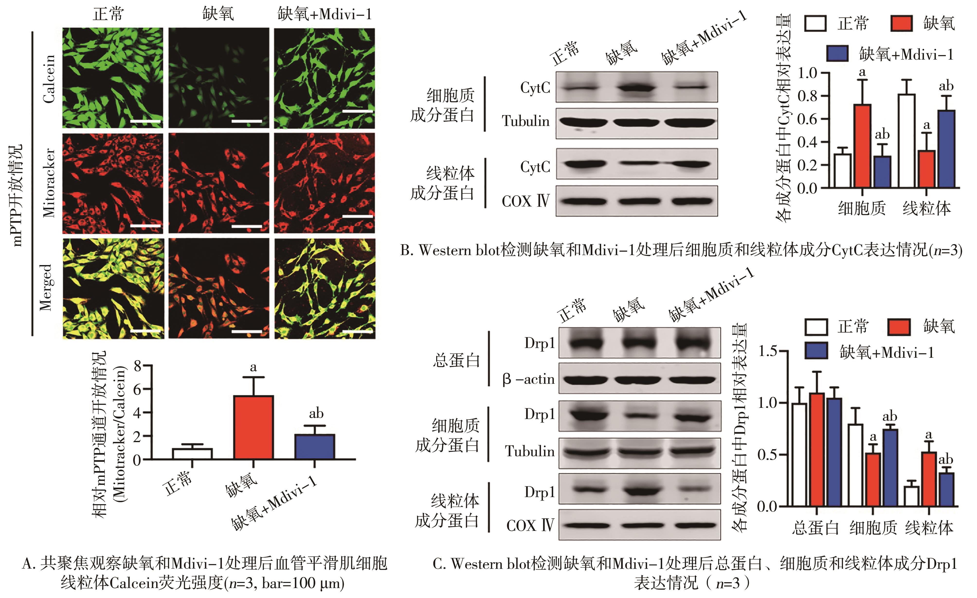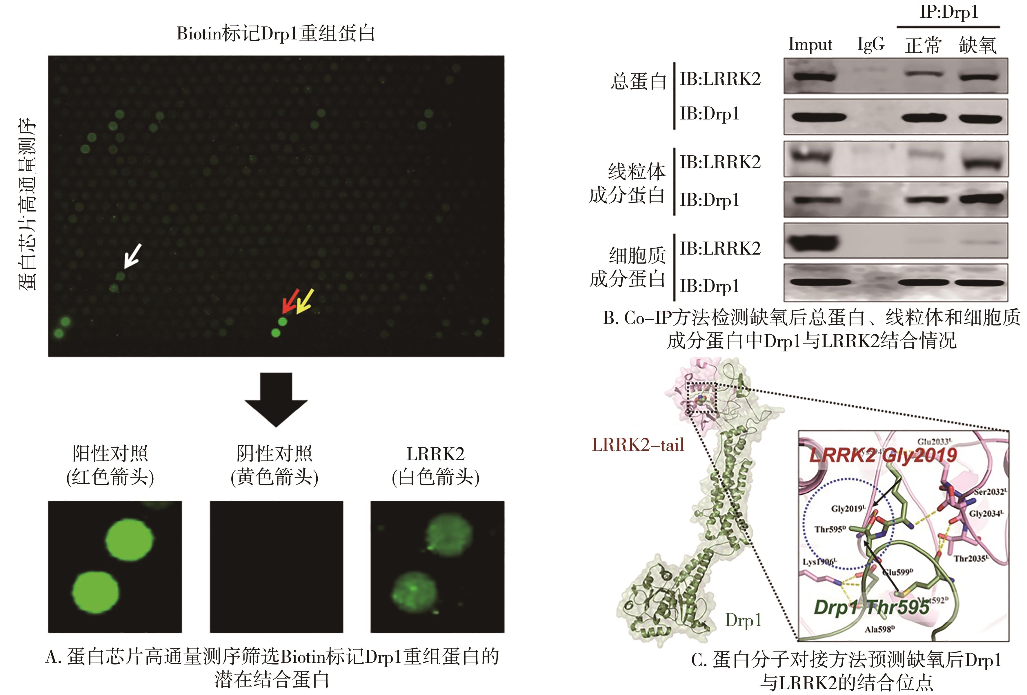 摘要:目的 探究缺氧后线粒体动力相关蛋白1(dynamin-related protein 1,Drp1)对线粒体膜通透性转换通道(mitochondrial permeability transition pore,mPTP)开放的调控机制。方法 在血管平滑肌细胞中通过免疫荧光方法观察缺氧后mPTP开放情况;通过超速离心法分离线粒体和细胞质成分蛋白;使用Co-IP和Western blot检测缺氧或者干预Drp1、干预己糖激酶-2(hexokinase-2,HK2)后Drp1的表达分布情况、HK2与电压依赖性阴离子通道蛋白(voltage dependent anion channel,VDAC)结合情况、Drp1与富含亮氨酸重复激酶2(leucine-rich repeat kinase 2,LRRK2)结合情况;使用蛋白分子对接和蛋白芯片方法筛选Drp1的潜在结合蛋白及结合位点;使用Drp1抑制剂和点突变法用于相应机制探究。结果 缺氧后Drp1发生线粒体转位促使mPTP过度开放(P<0.05)。使用Mdivi-1减少线粒体Drp1表达后可抑制mPTP开放,减少细胞色素C(cytochrome C,CytC)释放(P<0.05)。缺氧后HK2-Thr473磷酸化水平减低引起的HK2线粒体分离会导致mPTP结构破坏,通过HK2 T473D点突变恢复HK2活性后,HK2与线粒体结合情况及mPTP开放情况明显改善(P<0.05)。Drp1蛋白芯片结果发现缺氧后Drp1可以与LRRK2结合并封闭其活性位点,通过Drp1 T595A点突变破坏Drp1-LRRK2结合后,HK2活性及HK2线粒体分离情况明显改善(P<0.05),mPTP开放情况明显减少(P<0.05)。结论 缺氧后线粒体Drp1通过封闭激酶LRRK2活性位点导致HK2 Thr473磷酸化水平减低及其线粒体分离,最终诱导mPTP过度开放。
