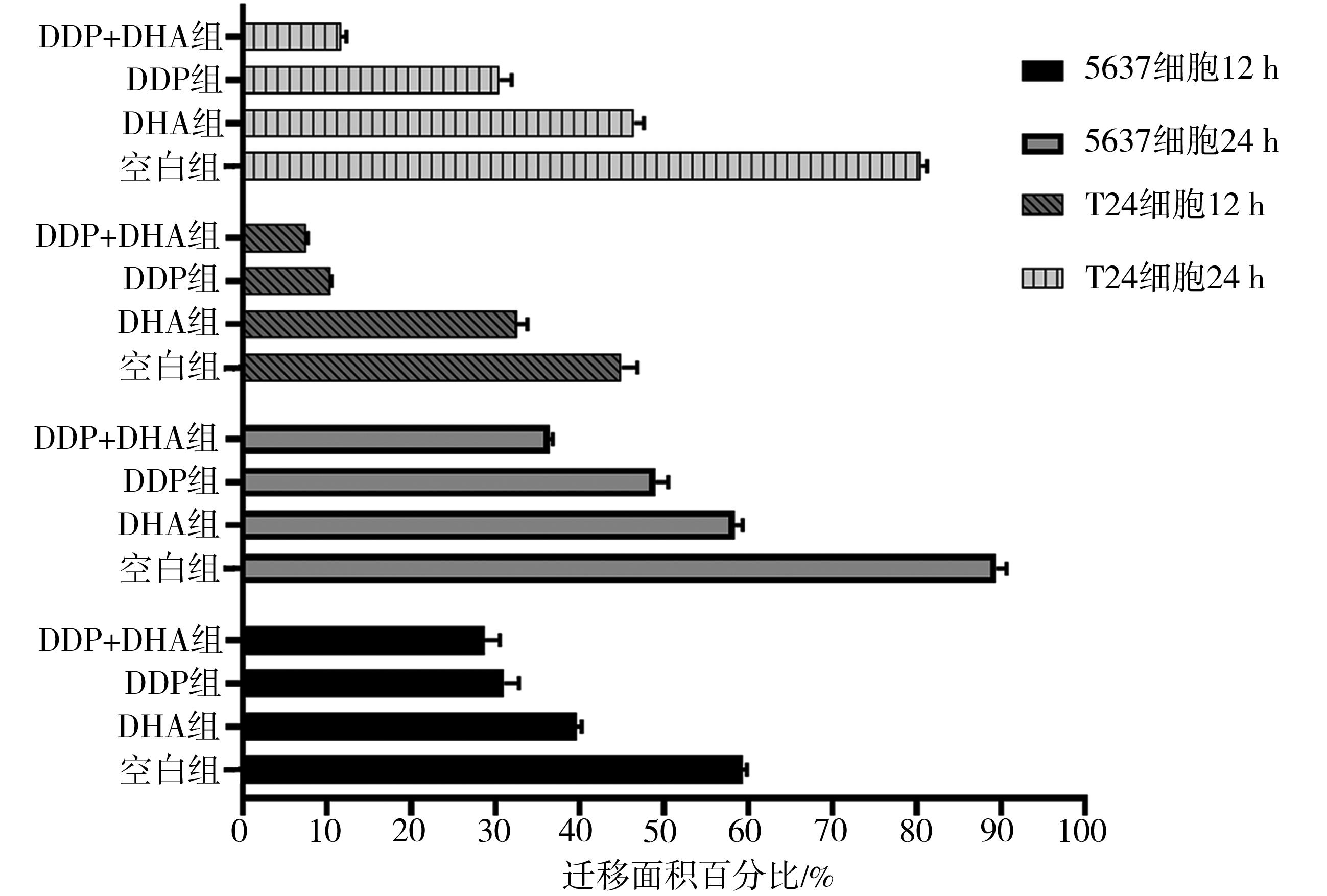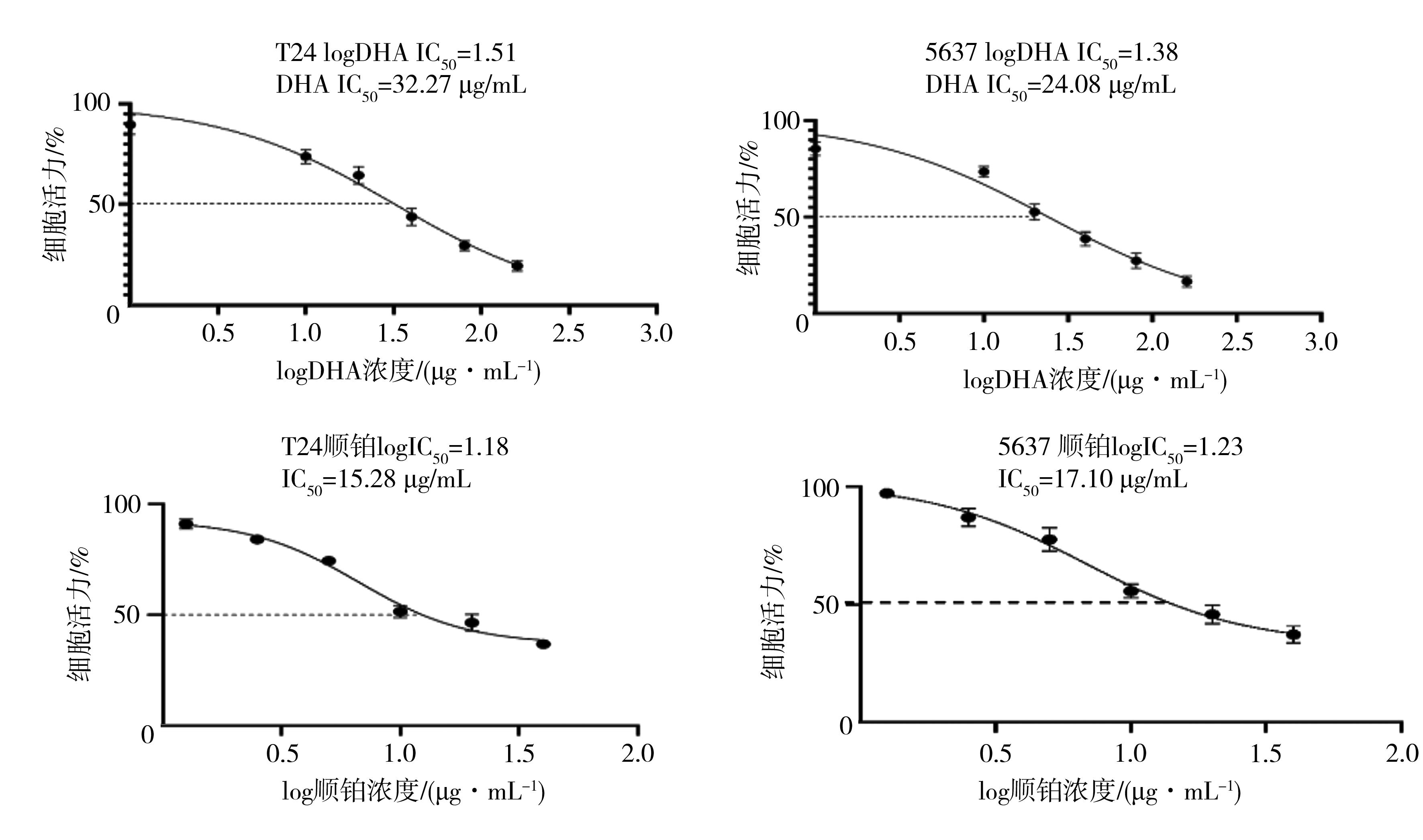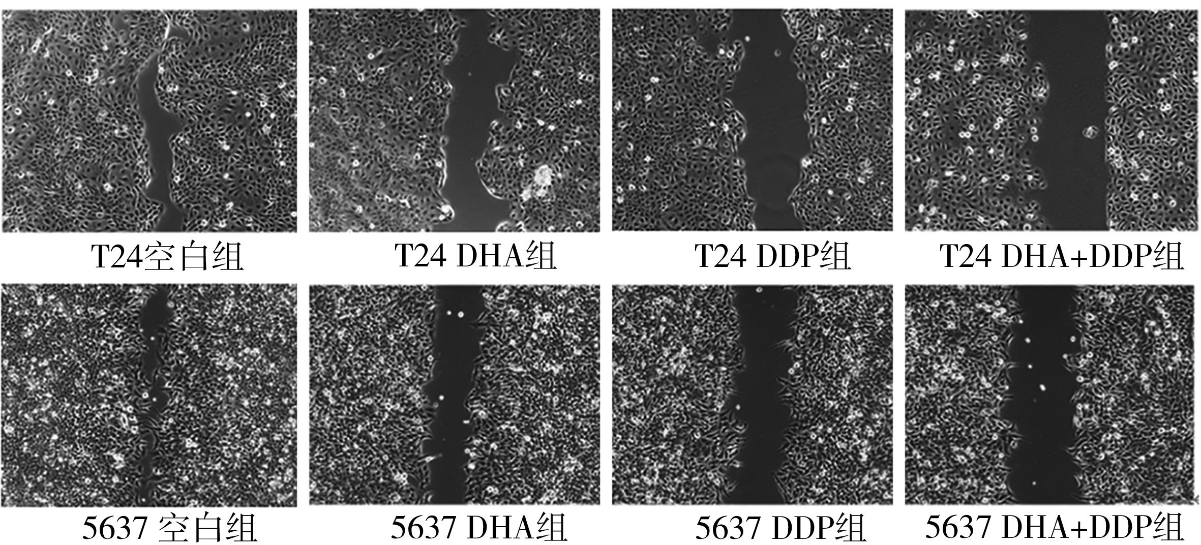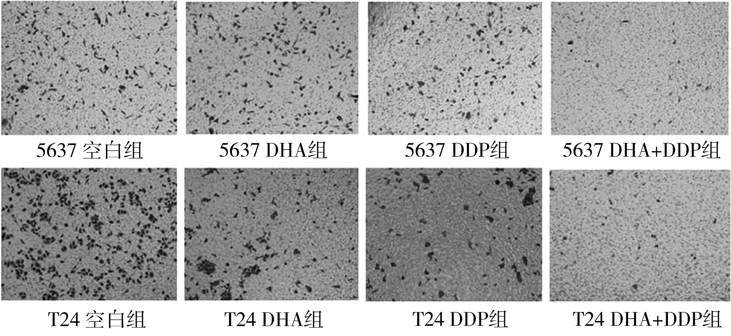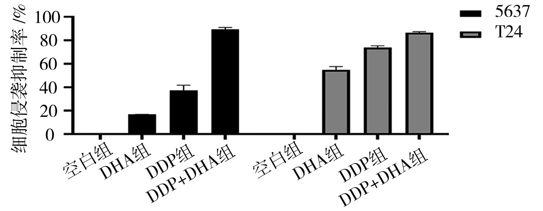 摘要:目的 初步了解双氢青蒿素(dihydroartemisinin,DHA)联合顺铂(cisplatin,DDP)抑制膀胱癌细胞增殖、侵袭转移的作用。方法 以膀胱癌细胞T24/5637为研究对象,通过CCK-8分别检测2种细胞系对DDP及DHA的半抑制浓度(half maximal inhibitory concentration,IC50);流式细胞仪检测DHA与DDP单独及联合应用时对2种细胞系周期和凋亡的影响;划痕实验、Transwell实验检测DHA与DDP单独或联合应用时对膀胱癌细胞迁移、侵袭能力的影响。结果 DDP对5637细胞的IC50为17.10 μg/mL,对T24细胞的IC50为15.28 μg/mL;DHA对5637细胞的IC50约为24.08 μg/mL,对T24细胞的IC50约为32.27 μg/mL。DHA/DDP单独用药组阻滞G0/G1、S期作用弱于联合用药组(P<0.05),单独用药及联合用药对G2/M期的抑制作用无统计学意义。DHA联合DDP可使T24、5637细胞凋亡率明显高于DHA/DDP单独应用(P<0.05),DDP诱导细胞凋亡率明显高于DHA(P<0.05);在24 h时,2种细胞DHA组迁移面积百分比大于DDP组(P<0.05)及DDP+DHA组(P<0.05),DDP组迁移面积百分比大于DDP+DHA组(P<0.05)。24 h后DHA组抑制率明显小于DDP组(P<0.05)及DDP+DHA组(P<0.05),DDP组抑制率明显小于DDP+DHA组(P<0.05)。结论 DDP+DHA可增强DDP抑制膀胱癌细胞增殖,DDP+DHA可使DDP抑制膀胱癌细胞迁移侵袭的作用进一步增强。