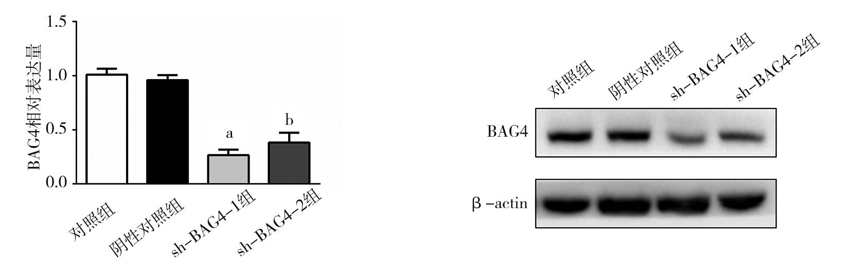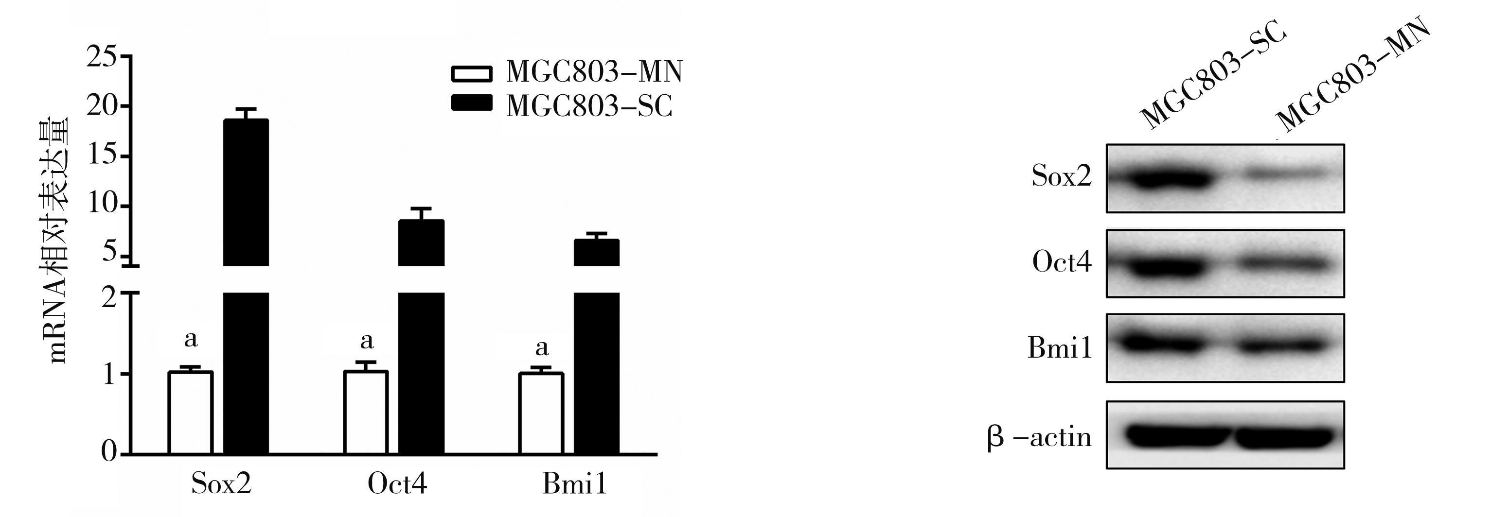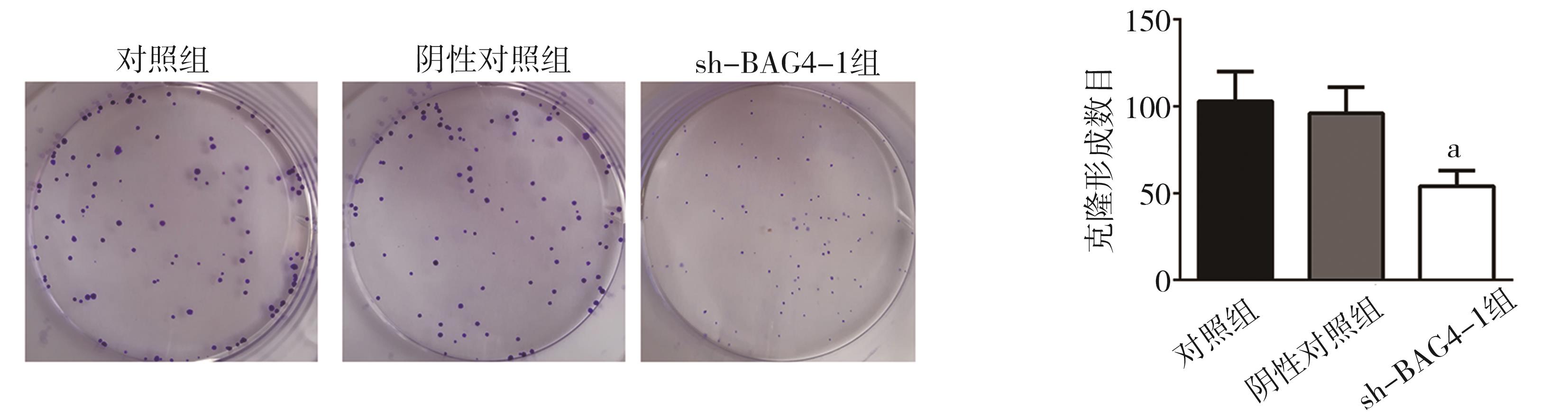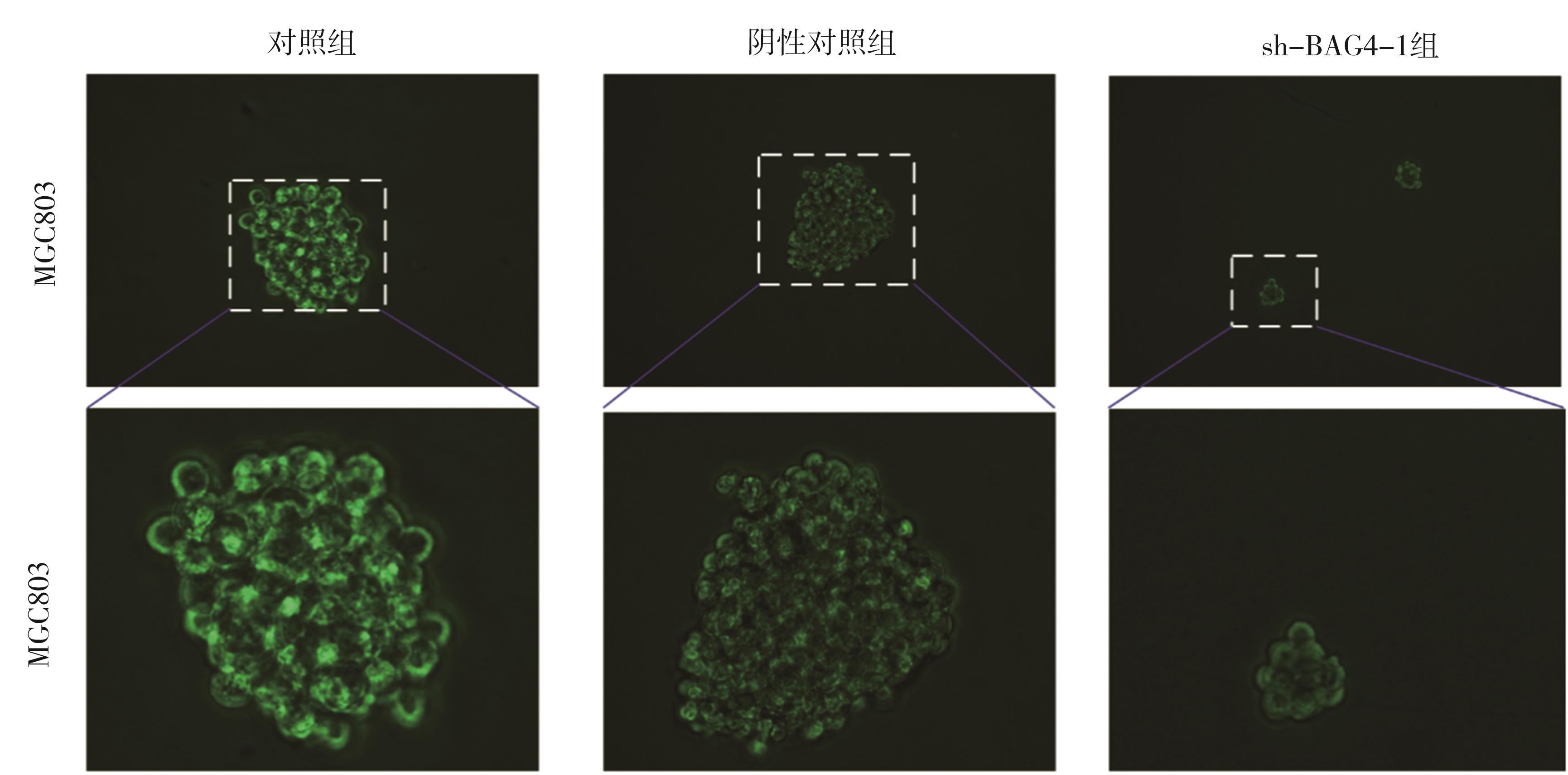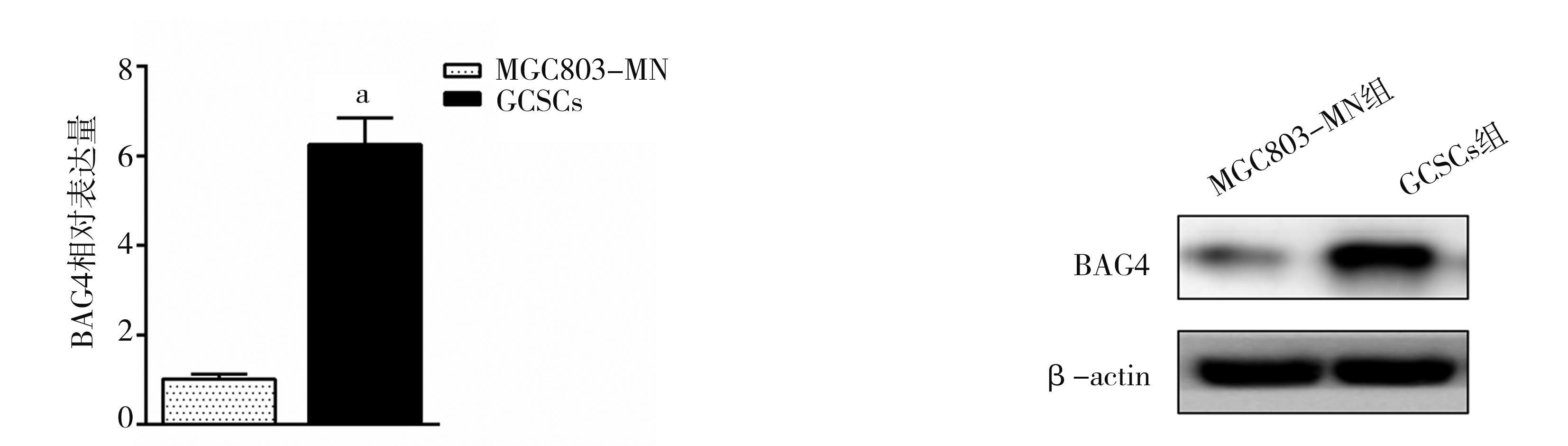 摘要:目的 探讨Bcl-2相关的永生基因4(Bcl-2 associated athanogene 4,BAG4)在胃癌干细胞(gastric cancer stem cells,GCSCs)自我更新能力中的调控作用。方法 采用成球培养法分离/富集GCSCs,并对其生物学特征进行鉴定。采用慢病毒干扰技术构建沉默BAG4表达的MGC803胃癌细胞系,以平板克隆形成和成球实验分别检测沉默BAG4对胃癌细胞克隆形成和成球能力的影响。结果 成球培养法成功分离/富集出球细胞(sphere cell,SC)。与普通单层贴壁细胞相比,MGC803-SC高表达干性相关基因Sox2、Oct4和Bmi1,具有更强的克隆形成能力(198±17 vs. 92±11,P<0.001),诱导分化后干性标志物CD44表达下降,在体外具有更强的侵袭能力(185±18 vs. 84±11,P<0.01)。上述实验结果证实MGC803-SC具有GCSCs特性。BAG4在GCSCs中的表达水平明显高于普通贴壁胃癌细胞,沉默BAG4明显降低胃癌细胞的克隆形成和成球能力。结论 沉默BAG4基因能有效抑制GCSCs的自我更新能力,有望成为胃癌靶向治疗的新靶标。