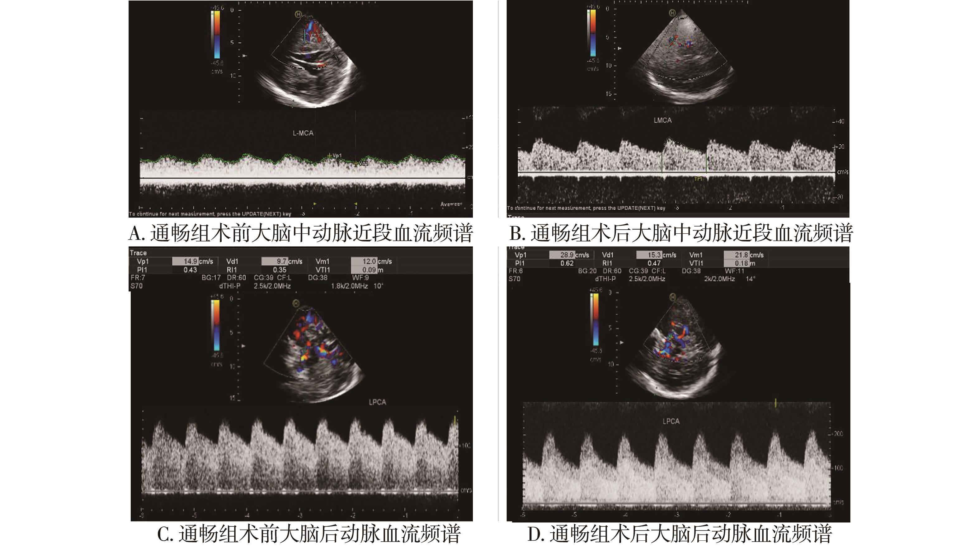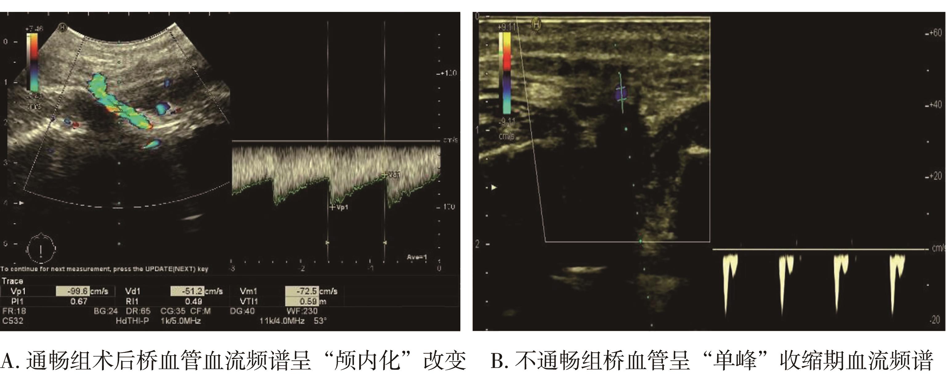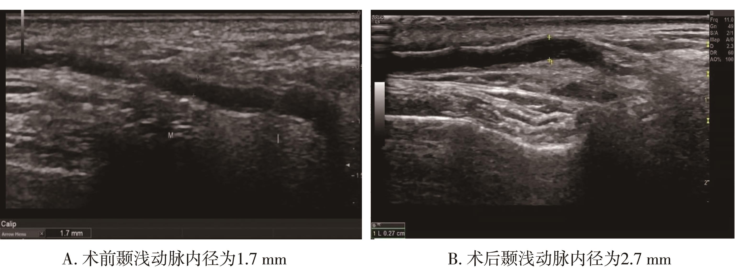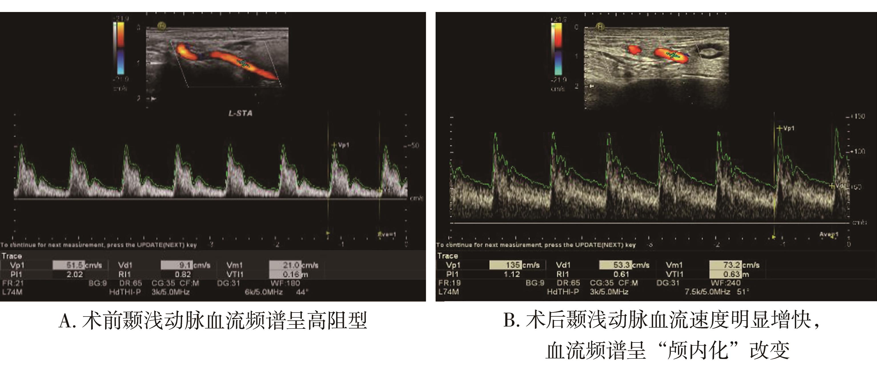 摘要:目的 应用超声技术对行颞浅动脉(superficial temporal artery,STA)-大脑中动脉(middle cerebral artery,MCA)搭桥术的烟雾病(moyamoya disease,MMD)患者进行术前、术后评估,探讨超声在早期预测手术成功率方面的临床价值。方法 选取2018年7月至2020年9月在空军军医大学第二附属医院行MMD搭桥术的患者28例,分别于术前1~3 d、术后4~7 d进行STA主干、顶支、额支内径及血流动力学参数检测;MCA远段及近段,大脑后动脉(posterior cerebral artery,PCA)血流动力学参数检测;术后桥血管内径及血流动力学参数进行检测。血流动力学参数测量包括收缩期峰值血流速度(systolic peak flow velocity,Vs)、舒张期末血流速度(diastolic end flow velocity,Vd)、平均血流速度(mean flow velocity,Vm)、搏动指数(pulse index,PI)、阻力指数(resistance index,RI)。所有患者根据术后6个月至1年经数字减影血管造影(digital saubtraction angiograph,DSA)检查结果分为搭桥通畅组与不通畅组,统计分析2组检测血管血流动力学术前术后之间的差异。结果 所有患者术后6个月至1年内行DSA检查,证实86%(24/28)吻合血管通畅,手术成功。搭桥通畅组中92%(22/24)的患者术后与术前相比,STA、桥血管内径明显增宽,Vs、Vm、Vd明显升高,PI值明显减低,频谱呈“颅内动脉化”改变,且MCA远段血流反向,差异有统计学意义(P<0.05);MCA近段、PCA血流参数术前术后相比无统计学差异。搭桥通畅组与不通畅组之间,通畅组STA和桥血管内径较不通畅组明显增宽,2组间差异有统计学意义(P<0.05);通畅组STA和桥血管Vm、Vs、Vd高于不通畅组,PI值低于不通畅组,差异有统计学意义(P<0.05)。绘制ROC曲线,术后STA内径变化率≥37%、STA-PI≤1.26是预测手术成功的最佳截断值。结论 MMD患者在进行STA-MCA搭桥术时,应用超声技术术前探查STA内径及血流参数,术后探查STA内径变化率及与桥血管的血流频谱PI值,在早期预测吻合口血管是否通畅、手术是否成功方面具有潜在的临床应用价值。