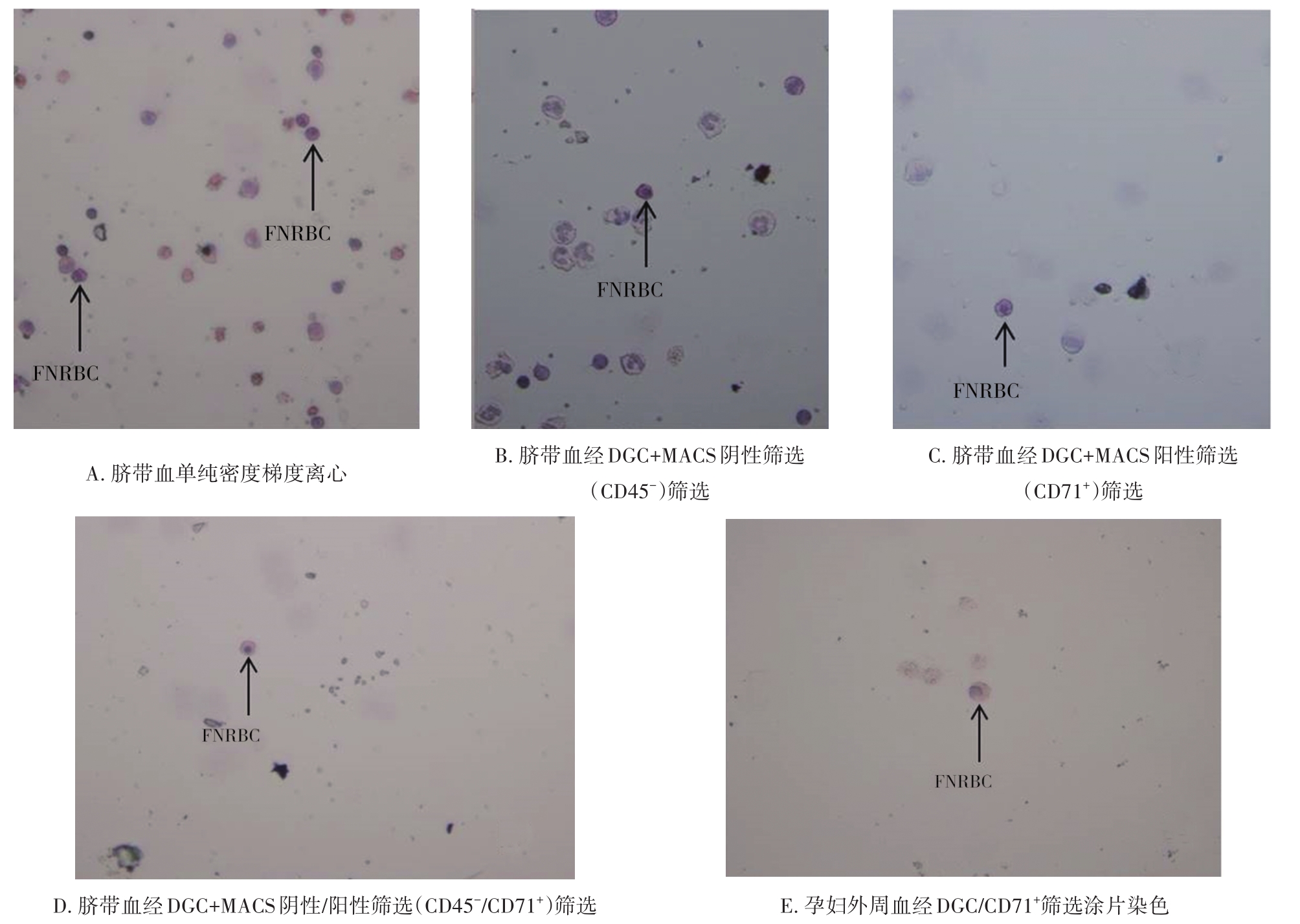 摘要:目的 将密度梯度离心(density gradient centrifugation,DGC)与免疫磁珠法(magnetic-activated cell sorting,MACS)相结合,应用4种不同的筛选方案,对脐血中的胎儿有核红细胞(fetal nucleated red blood cells,FNRBC)进行分离,评估不同策略富集FNRBC的效果。方法 对10例脐血标本(12 mL/例)按4种不同方案进行筛选:DGC;DGC+MACS阴性筛选(CD45-);DGC +MACS阳性筛选(CD71+);DGC+MACS阴性/阳性筛选(CD45-/CD71+)。通过细胞计数板计数,K-B染色后显微镜下人工FNRBC计数,从获得总细胞量、FNRBC量和FNRBC比例经t检验后评估不同方案富集FNRBC的效果。结果 ①与其他3组相比,DGC方案可获得的总细胞量(0.95×107/mL)最多,FNRBC数量(39.87/mL)最多,FNRBC比例最低(0.004‰),差异均具有统计学意义(均P=0.000);②与其他3组相比,DGC+MACS阴性/阳性筛选(CD45-/CD71+)组合法所获得的总细胞量最少(0.81×106/mL),获得FNRBC数量也最少(7.47/mL),差异均具有统计学意义(均P=0.000);③DGC+MACS单种抗体筛选方案中,DGC+MACS阳性筛选(CD71+)所获得总细胞量为1.99×106/mL,较DGC+MACS阴性筛选(CD45-)(2.56×106/mL)低,差异有统计学意义(P=0.000),而两方案所得FNRBC数量之间差异无统计学意义(P=0.910);④DGC+MACS阴性筛选(CD45-),DGC+MACS阳性筛选(CD71+),DGC+MACS阴性/阳性筛选(CD45-/CD71+)所得FNRBC比例之间差异无统计学意义(P=0.030、0.050、0.210)。结论 DGC方案获得FNRBC数量最多;DGC+MACS阴性/阳性筛选(CD45-/CD71+)方案去除混杂细胞能力最强。在不降低获取目标细胞数量基础上,DGC+MACS阳性筛选(CD71+)方案富集FNRBC效果最好。