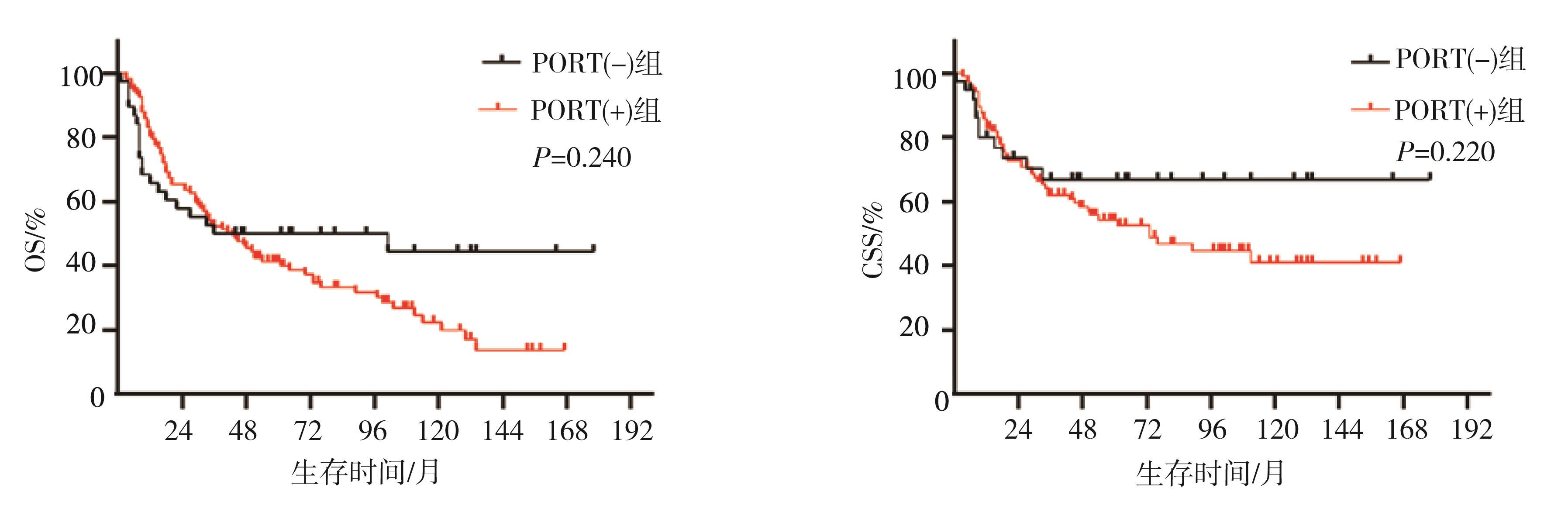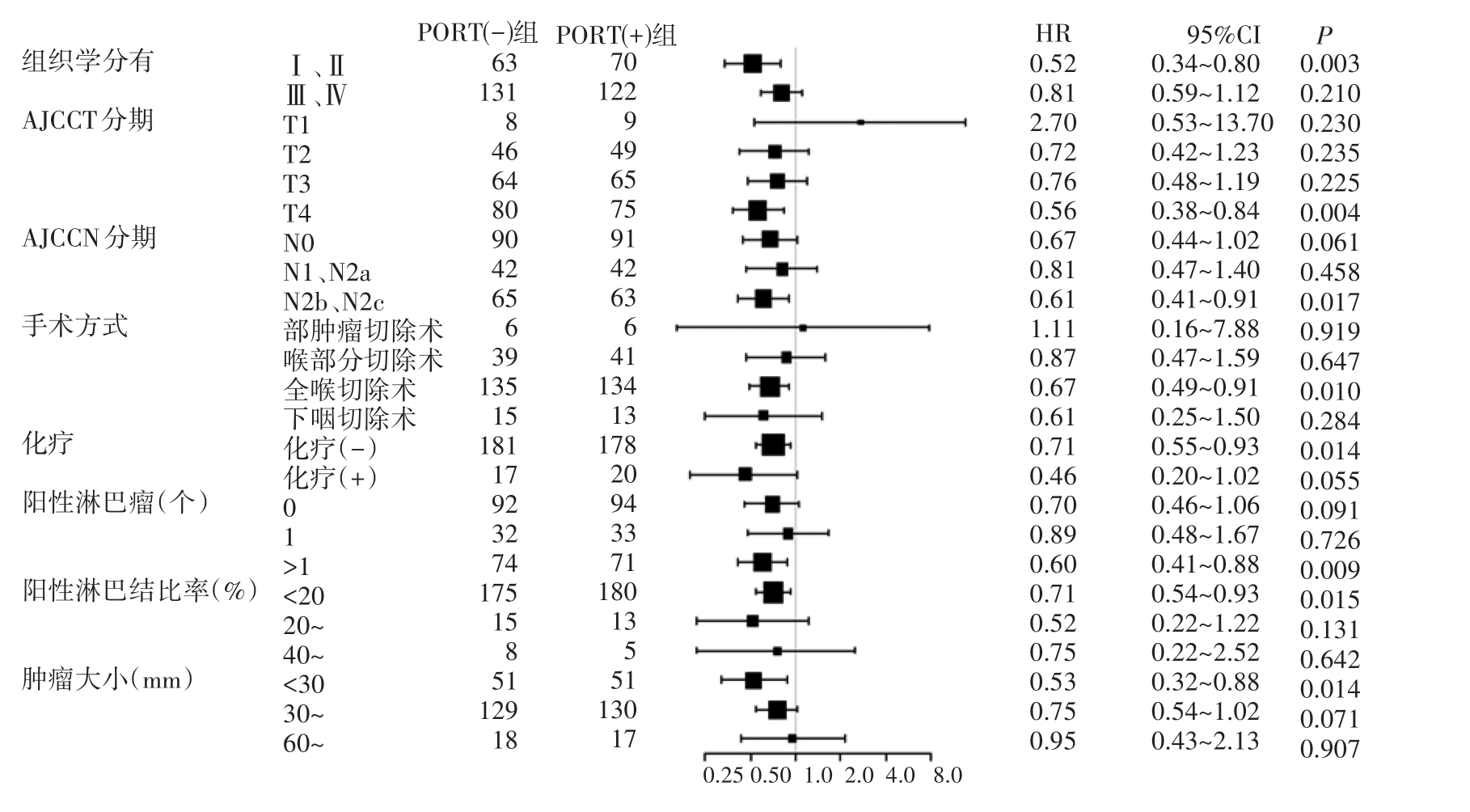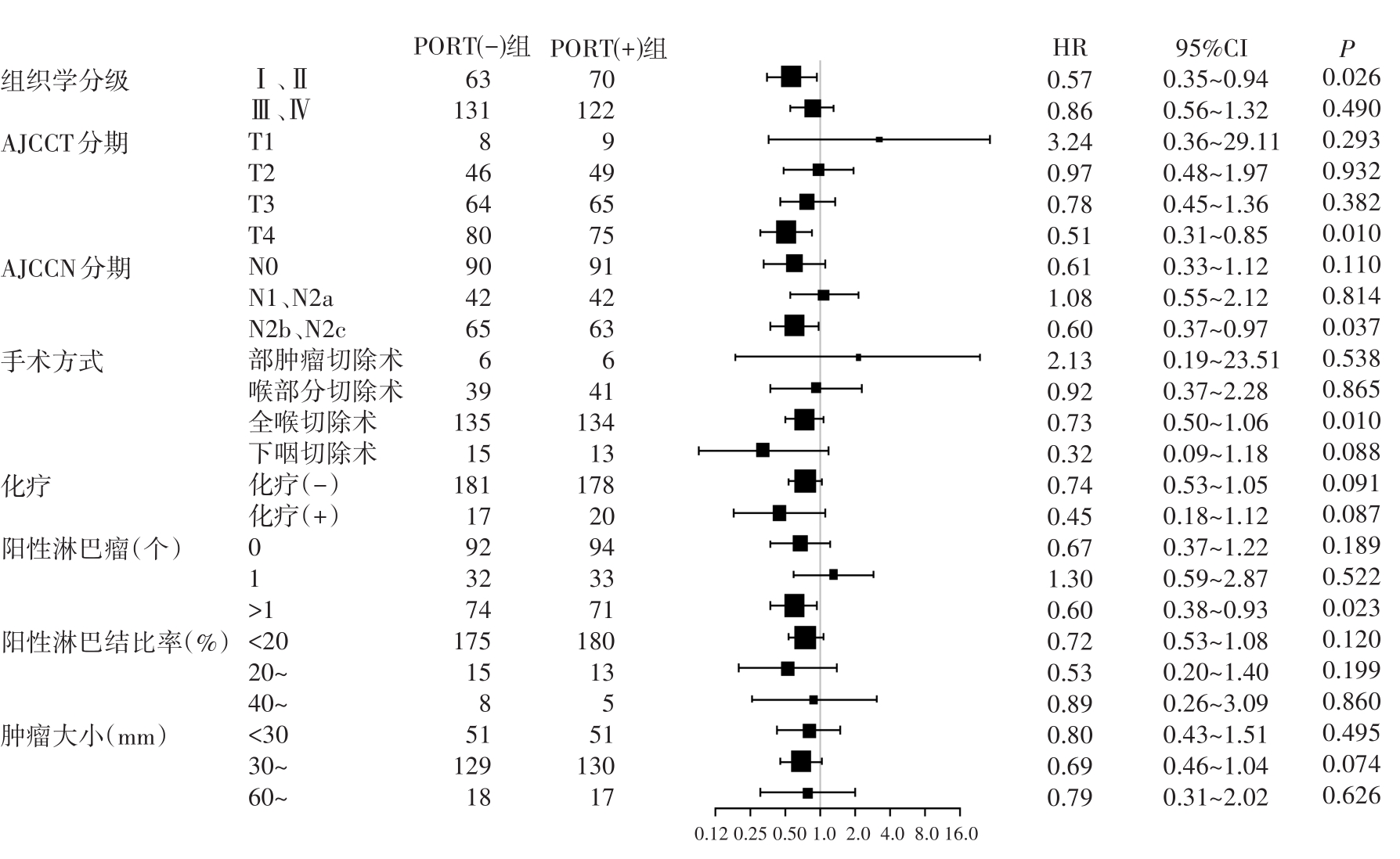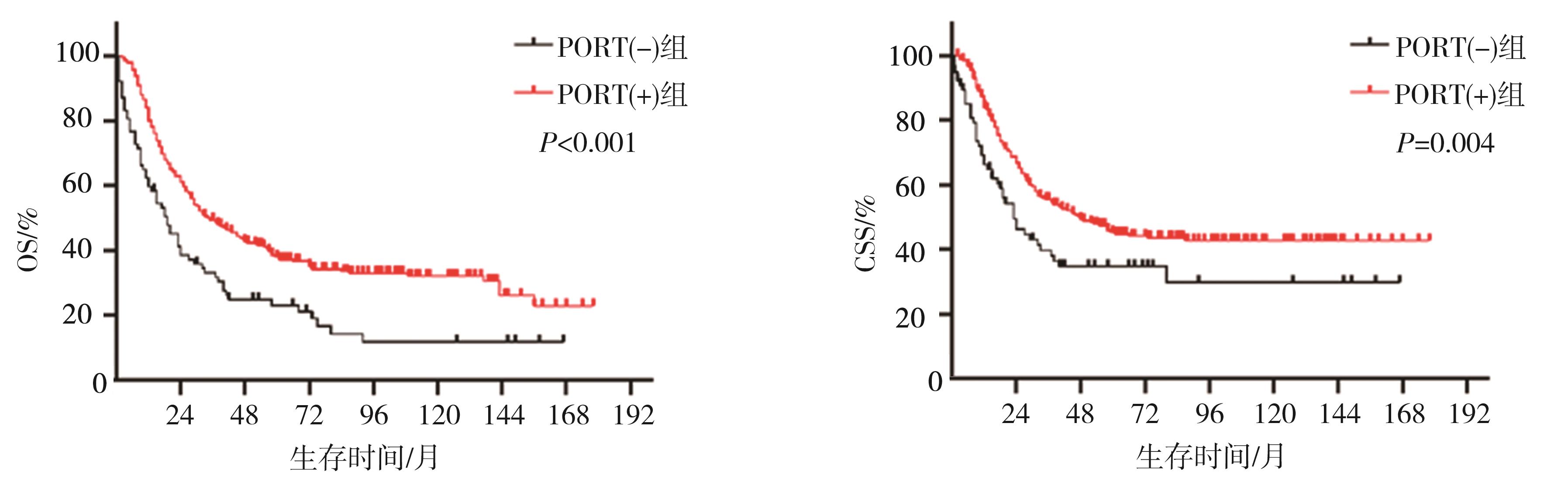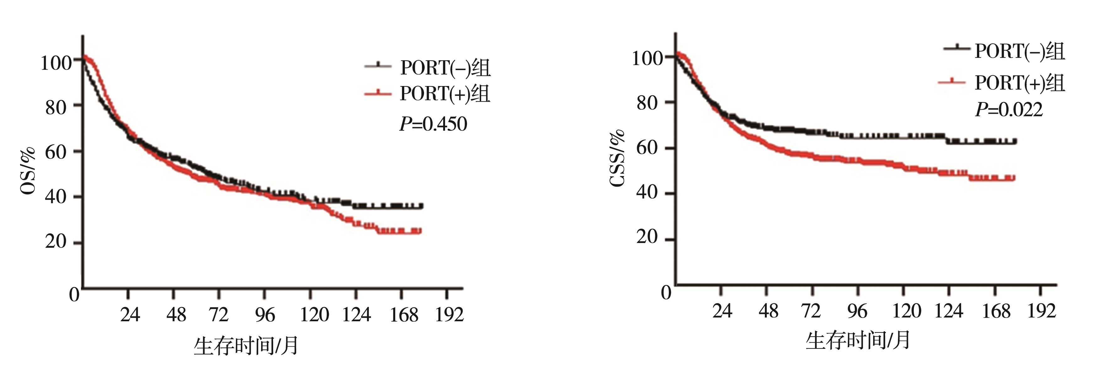 摘要:目的 评估手术后辅助放疗(postoperative radiotherapy,PORT)在声门上型喉鳞状细胞癌治疗中的作用。方法 搜集美国监测、流行病学和最终结果(Surveillance,Epidemiology,and End Results,SEER)数据库中2004年至2015年接受手术治疗的831例声门上型喉鳞状细胞癌患者的临床资料,根据术后是否接受放疗分为PORT(-)组及PORT(+)组,应用倾向性评分匹配法(propensity score matching,PSM)均衡2组间变量的差异,采用Kaplan-Meier及log-rank检验进行生存分析并进行亚组分析,比较2组间总生存(overall survival,OS)和肿瘤特异性生存(cancer specific survival,CSS)的差异,分析PORT在声门上型喉鳞状细胞癌患者治疗中的价值及获益人群。结果 倾向性评分匹配前,PORT(-)组及PORT(+)组的OS无统计学差异,而PORT(+)组的CSS较PORT(-)组更差(P=0.022)。对阳性淋巴数的亚组分析显示,阳性淋巴结数为0和1的患者,PORT(-)组与PORT(+)组的OS与CSS均无统计学差异;但在阳性淋巴结数>1的患者中,PORT(+)组的5年OS与CSS均较PORT(-)组更好(OS:23.1% vs. 38.1%,P<0.001;CSS:34.8% vs. 45.3%,P=0.004)。进行倾向性评分匹配后,PORT(+)组较PORT(-)组的OS及CSS均更好(OS:55.1% vs. 41.9%,P=0.004;CSS:67.1% vs. 56.1%,P=0.042)。亚组分析显示,组织学分级Ⅰ、Ⅱ级,AJCC T4期,AJCC N2b、N2c期,阳性淋巴结数>1及全喉切除术的患者,PORT(+)组在OS及CSS中均获益,且有统计学意义。而未接受化疗、阳性淋巴结比率<20%及肿瘤大小<30 mm的患者仅存在OS获益。结论 PORT能提高部分声门上型喉鳞状细胞癌患者的生存率,相关获益人群为AJCC T4期、AJCC N2b及以上分期、阳性淋巴结数>1的患者。还需要在同类研究中进一步评估PORT在具有不良病理特征患者中的价值。