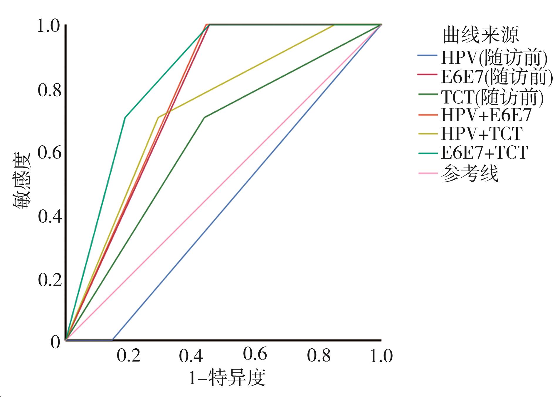 摘要:目的 评估人乳头瘤病毒(human papilloma virus,HPV)E6/E7 mRNA预测宫颈上皮内瘤变Ⅰ级(cervical intraepithelial neoplasia grade Ⅰ,CIN Ⅰ)转归的应用价值。方法 选取2017年10月至2020年3月在重庆医科大学附属妇女儿童医院妇科门诊就诊,液基细胞学检测(thinprep cytology test,TCT)、HPV DNA检测和HPV E6/E7 mRNA检测中一项结果异常行阴道镜检查,病检结果为CIN Ⅰ的患者208例,1年后复查TCT、HPV DNA、HPV E6/E7 mRNA,检测中一项结果异常再次阴道镜下行宫颈活检,随访患者病变消退、持续存在或进展,分析HPV E6/E7 mRNA对宫颈上皮内瘤变Ⅰ级进展风险的预测价值。结果 ①208例CIN Ⅰ患者中有17例进展为CIN Ⅱ或CIN Ⅲ,进展率8.2%,进展患者中TCT阳性率为58.8%、HPV DNA阳性率为100%,HPV E6/E7 mRNA阳性率为100%;②Cox回归分析中,TCT的风险比(hazard ratio,HR)为9.184,HPV DNA的HR为158.675,HPV E6/E7 mRNA的HR为293.650,说明HPV E6/E7 mRNA对CIN Ⅰ进展的预测价值最大;③HPV DNA和HPV E6/E7 mRNA的敏感度最高,TCT的特异度最高,HPV E6/E7 mRNA特异度次之,HPV DNA的特异度较差,HPV E6/E7 mRNA既有最高的敏感度,又有较高的特异度;④TCT的受试者工作特征(receiver operating characteristic,ROC)曲线下面积(area under the curve,AUC)为0.633,HPV DNA的AUC为0.427,HPV E6/E7 mRNA 的AUC 为0.772,说明HPV E6/E7 mRNA对CIN Ⅰ进展的诊断价值最大。两两联合检测中,HPV DNA联合HPV E6/E7 mRNA的ROC曲线下AUC为0.777,HPV DNA联合TCT的ROC曲线下AUC为0.728,HPV E6/E7 mRNA联合TCT的ROC曲线下AUC为0.839,说明HPV E6/E7 mRNA联合TCT对CIN Ⅰ进展的诊断价值最大。结论 HPV E6/E7 mRNA检测对预测CIN I转归有一定意义,可用于CIN I的随访分流管理,值得在临床推广和应用。