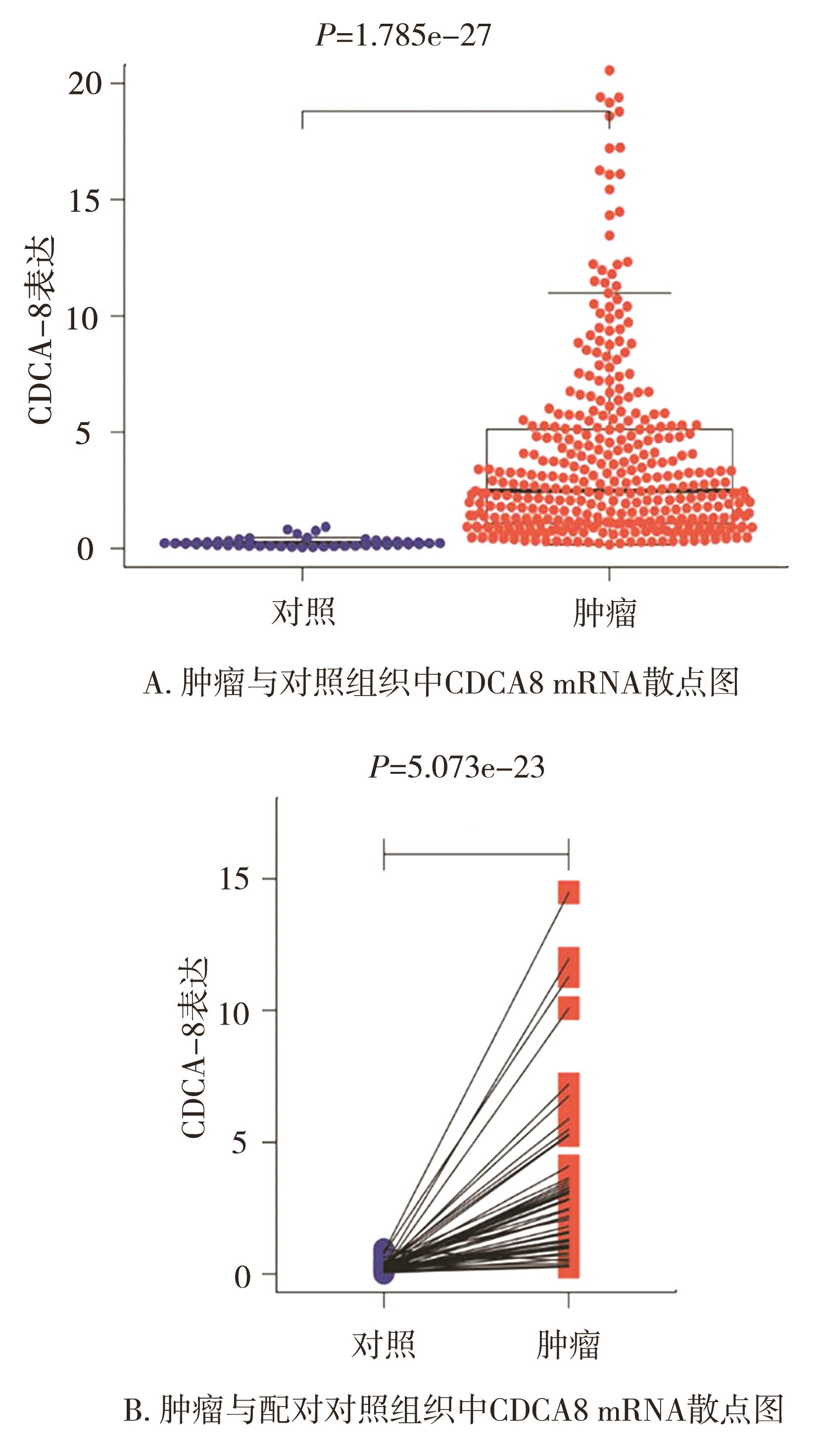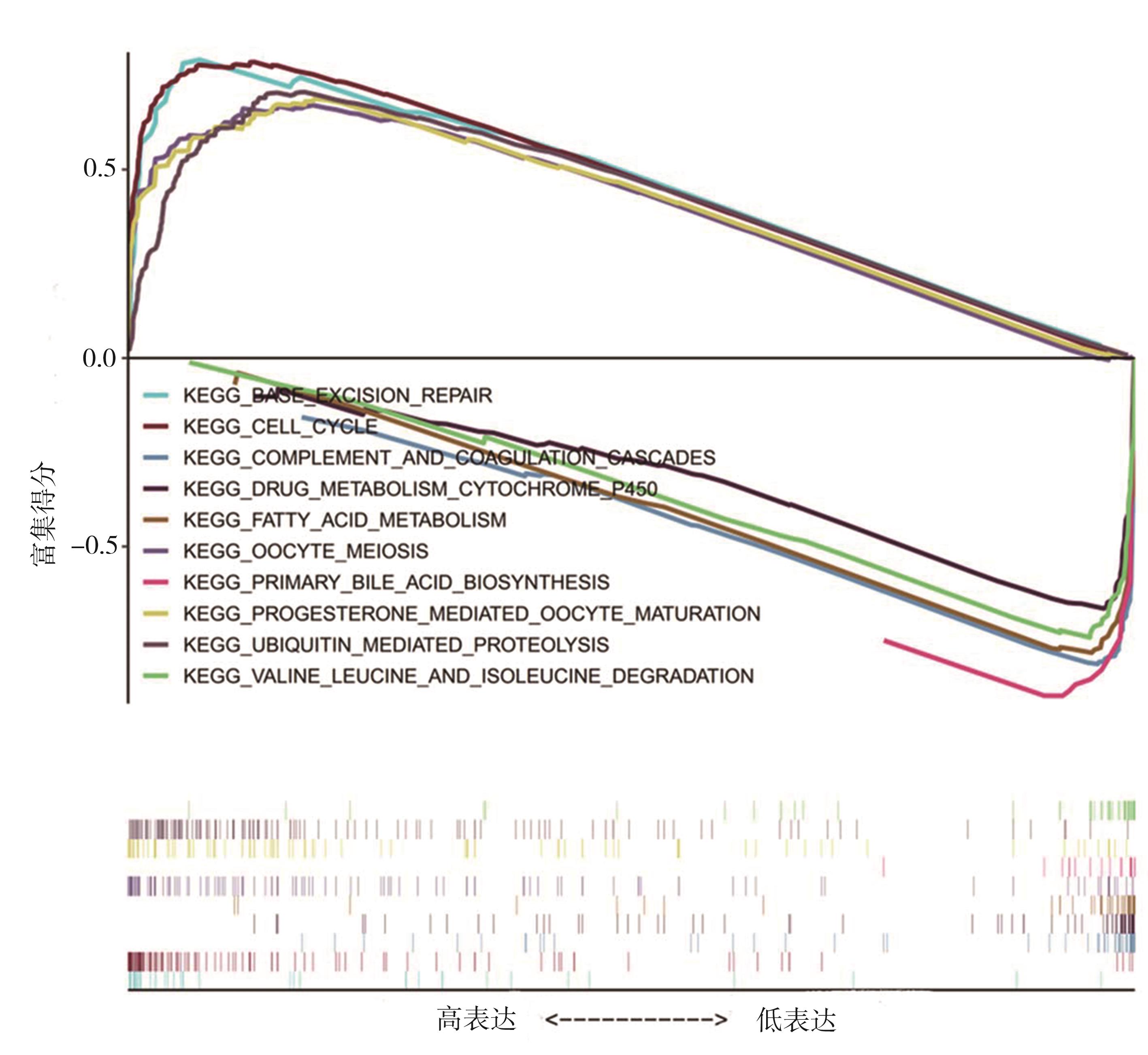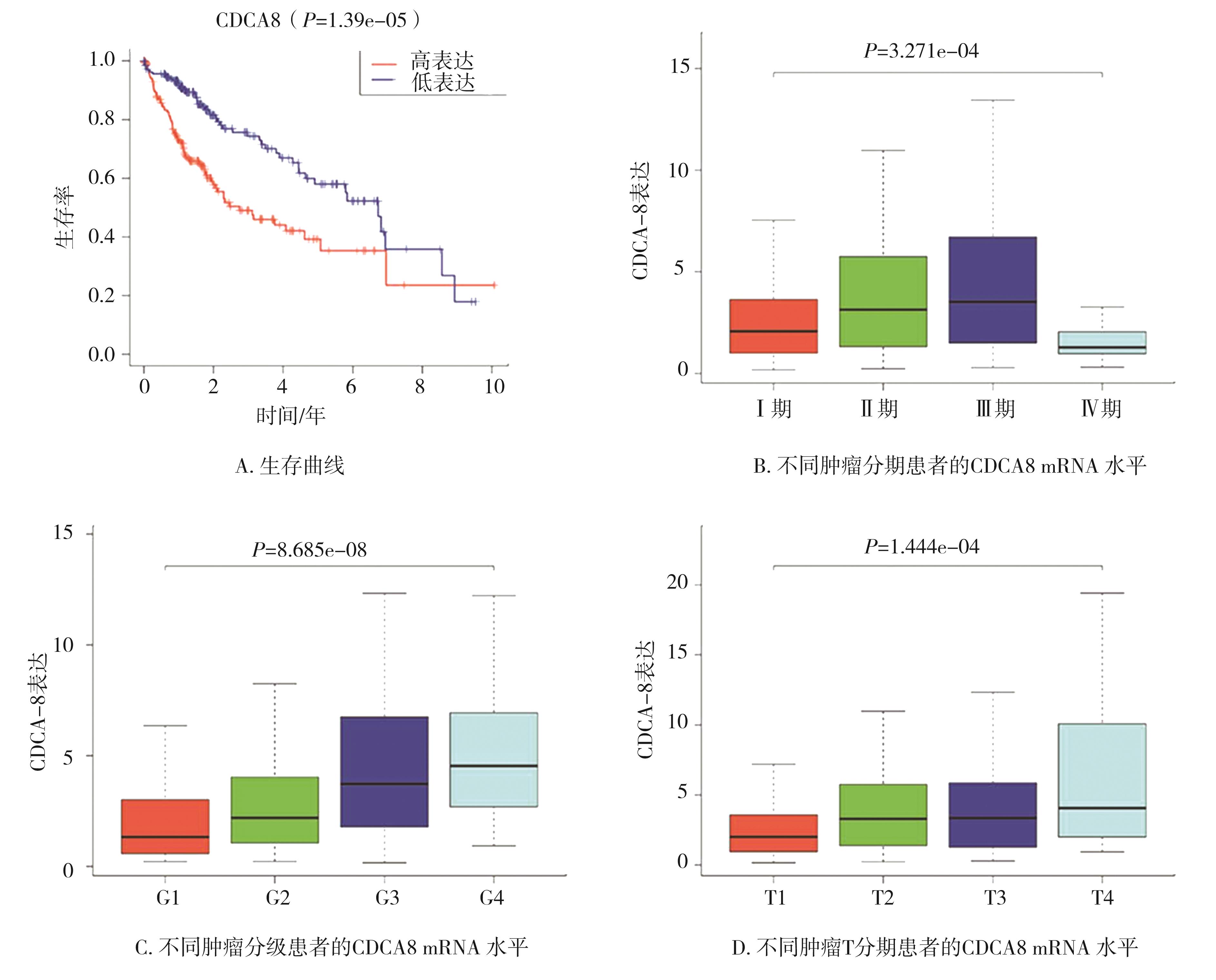 摘要:目的 肝细胞癌预后相关的分子标志物对提高患者生存质量和改善疗效至关重要,本研究旨在探究细胞分裂周期相关基因8(cell division cycle associated 8,CDCA8)对肝细胞癌预后的影响及潜在分子机制。方法 432例肝细胞癌样本的转录组数据及对应患者的临床信息下载自肿瘤基因表达图谱(The Cancer Genome Atlas,TCGA)数据库。分析肿瘤组织和正常组织中CDCA8 mRNA差异;根据CDCA8 mRNA中位数将肝细胞癌患者分为高表达组和低表达组,绘制生存曲线。采用Kruskal检验分析CDCA8与肿瘤分期、分级和T分期的相关性。采用单因素和多因素Cox回归分析探究CDCA8能否作为肝细胞癌患者的独立预后因子。采用基因集富集分析(gene set enrichment analysis,GSEA)探究CDCA8在肝细胞癌中的潜在作用机制。结果 CDCA8在肿瘤组织中的mRNA水平明显高于正常对照组织(P<0.001),CDCA8高表达患者的生存率明显低于低表达组(P<0.001)。随着肿瘤分期(P<0.001)、分级(P<0.001)和T分期(P<0.001)增加,肝细胞癌恶性程度增加,同时伴随CDCA8 mRNA水平增加。GSEA富集分析发现CDCA8高表达明显富集的通路包括细胞周期和有丝分裂。结论 CDCA8可作为肝细胞癌患者的预后分子标志物,深入研究后有望成为治疗的新靶点。