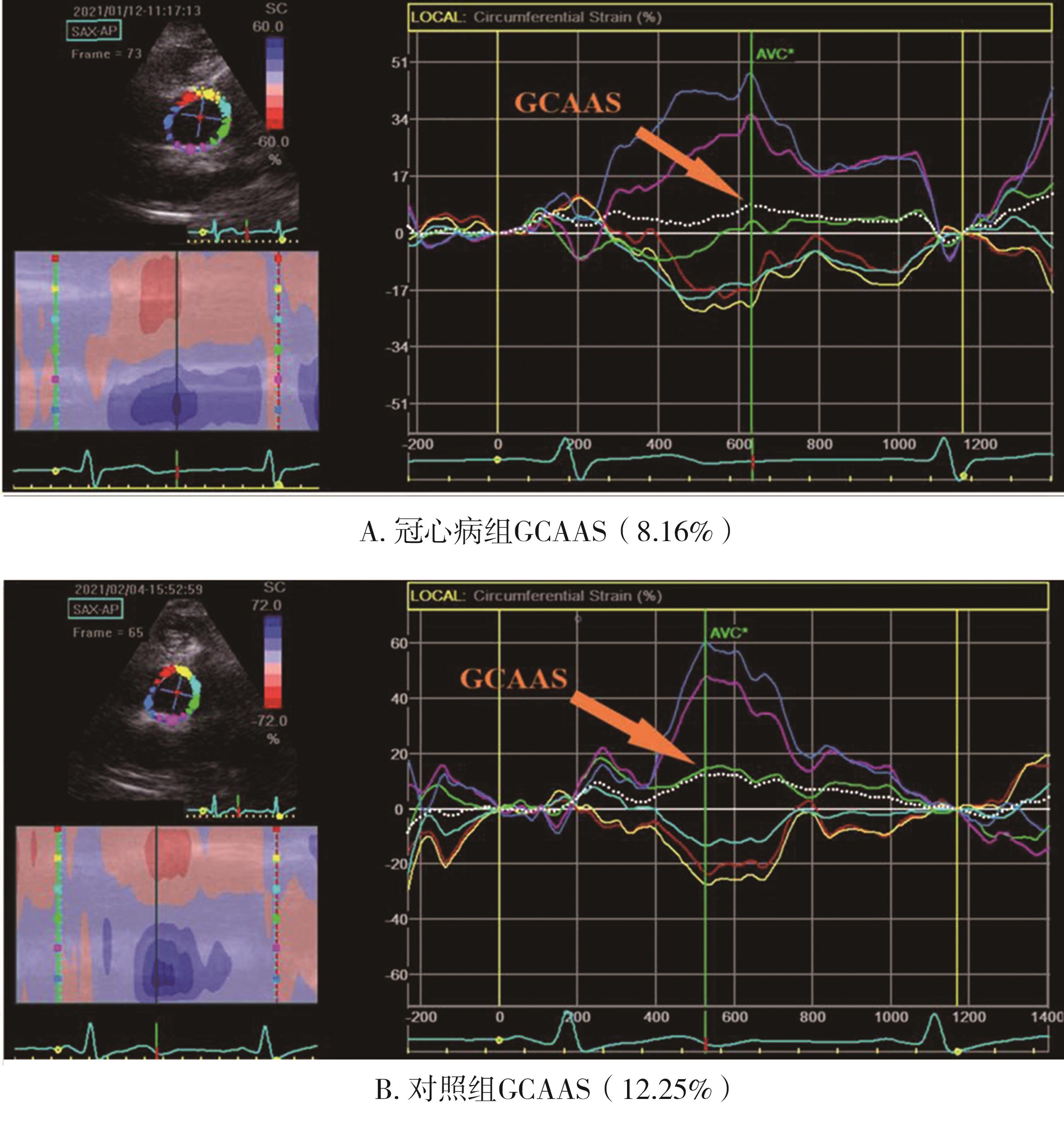 摘要:目的 使用二维斑点追踪技术(two-dimensional speckle tracking imaging,2D-STI)评估冠心病患者升主动脉弹性功能,并探讨其与冠脉病变程度的相关性。方法 纳入三峡大学第一临床医学院宜昌市中心人民医院2020年1月至2021年3月因胸闷、胸痛住院的疑似冠心病患者206例。均行超声心动图检查,计算升主动脉扩张性(aortic distensibility,AoDIS)、升主动脉僵硬指数(aortic stiffness index,AoSI)及升主动脉应变值等常规动脉僵硬度指标。使用2D-STI测量整体周向升主动脉应变峰值(global circumferential acscending aortic peak strain,GCAAS)及周向升主动脉峰值应变率(crcumferential acscending aortic peak strain rate,CAASR)。依据冠脉造影结果及Gensini积分(Gensini score,GS)分为冠心病组(轻度组、中度组及重度组)和对照组。结果 ①冠心病组AoDIS、升主动脉应变值、GCAAS、CAASR均低于对照组,AoSI高于对照组(均P<0.05)。②单因素logistic回归分析显示,男性、糖尿病、高血压、左室射血分数(left ventricular ejection fraction,LVEF)、AoDIS、GCAAS、CAASR均是冠心病的危险因素(均P<0.05)。经多因素分析后,GCAAS仍是冠心病的独立危险因素(P<0.001)。③冠心病组中,GCAAS及CAASR随着冠脉病变严重程度增加而减少(P=0.003,P=0.015)。与轻度组相比,重度组GCAAS、CAASR明显更低(P=0.001,P=0.012)。Spearman相关分析表明,GCAAS与GS呈中度相关(rs=-0.411,P<0.001),CAASR与GS呈弱相关(rs=-0.228,P=0.027)。结论 斑点追踪技术升主动脉应变优于常规超声,能够反映冠心病患者升主动脉弹性的早期改变,整体周向升主动脉应变与冠心病的发生及冠脉病变严重程度密切相关。