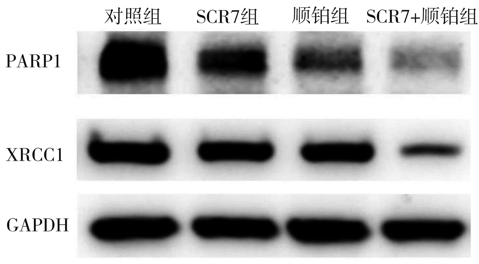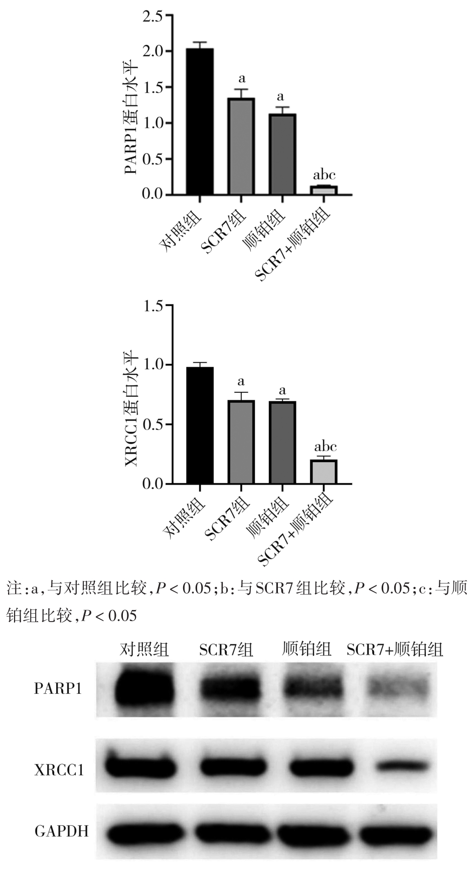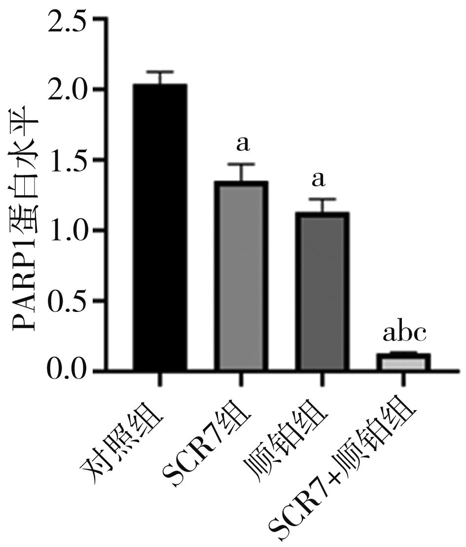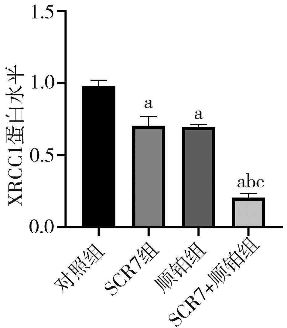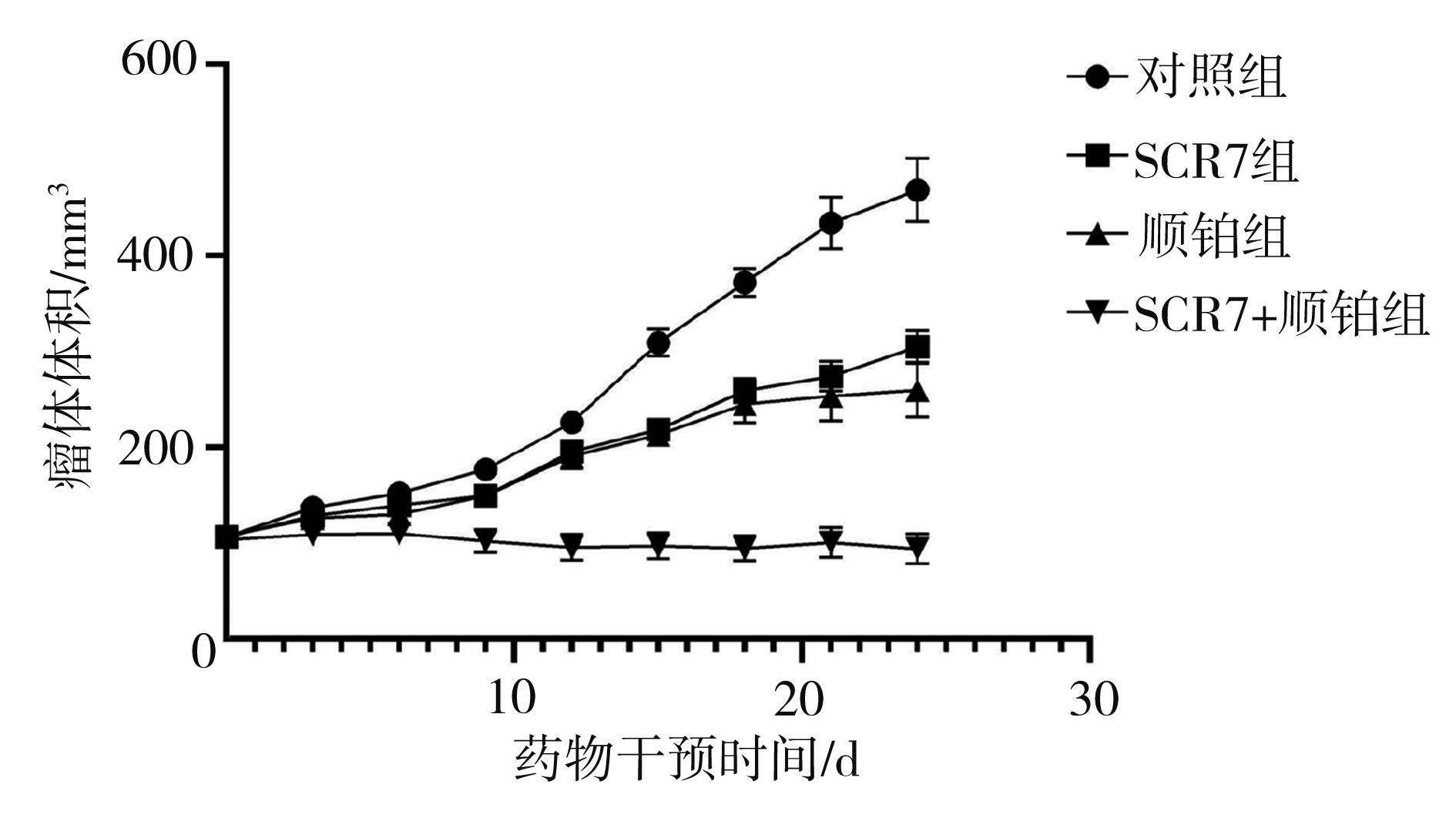 摘要:目的 探讨SCR7对三阴性乳腺癌顺铂化疗的增敏作用。方法 选用三阴乳腺癌MDA-MB-231细胞分为空白对照组、10 μmol/L顺铂对照组和联合组(10 μmol/L顺铂+10、20和40 μmol/L SCR7),采用CCK-8法检测细胞活性并计算细胞增殖抑制率;取对数期TNBC MDA-MB-231细胞构建三阴性乳腺癌移植瘤小鼠模型,建模成功后荷瘤裸鼠随机分为对照组、SCR7组,顺铂组、SCR7+顺铂组;饲养24 d后,观察比较各组荷瘤鼠肿瘤质量、瘤体体积的变化,计算肿瘤抑制率;苏木精-伊红(hematoxylin-eosin,HE)染色观察瘤体组织细胞形态学变化;原位末端标记法(in situ end labeling,TUNEL)检测乳腺癌肿瘤组织的凋亡;采用Western blot检测X射线修复交叉互补蛋白1(X-ray repair cross complementing 1,XRCC1)、多聚(ADP核糖)聚合酶1[poly(adp ribose) polymerase 1,PARP1]蛋白表达。结果 联合组细胞增殖抑制率均高于对照组(P<0.05),且随SCR7质量浓度增大呈逐渐升高趋势(P<0.05)。体内动物实验发现:相较于对照组,SCR7组、顺铂组、SCR7+顺铂组中的乳腺癌肿瘤体积、瘤重减小(P<0.05),其肿瘤抑制率分别是32%、40%、81%;SCR7+顺铂组较顺铂组减少更明显(P<0.05),且小鼠体质量与SCR7组、顺铂组相比无明显差异(P>0.05);HE染色观察干预组肿瘤组织均呈现明显形态学改变,其中SCR7+顺铂组肿瘤细胞退变变化最明显;TUNEL染色显示SCR7+顺铂组肿瘤细胞凋亡最为严重,可见大量红色细胞凋亡;Western blot检测发现,SCR7+顺铂组XRCC1、PARP1蛋白表达均明显低于其他组,差异均有统计学意义(P<0.05)。结论 SCR7在体内外对三阴乳腺癌顺铂化疗均有增敏作用。
