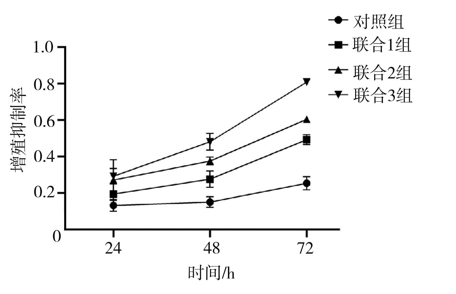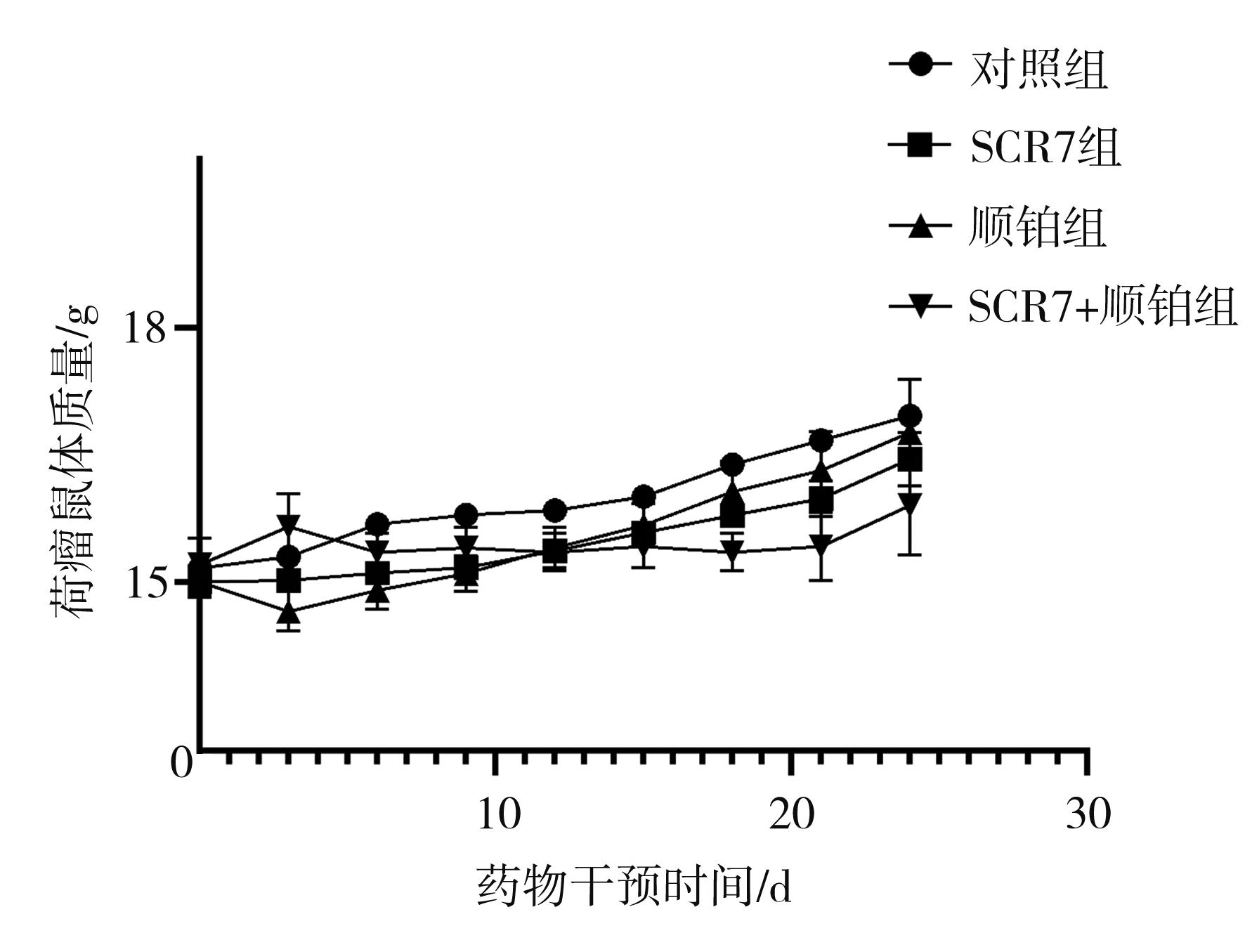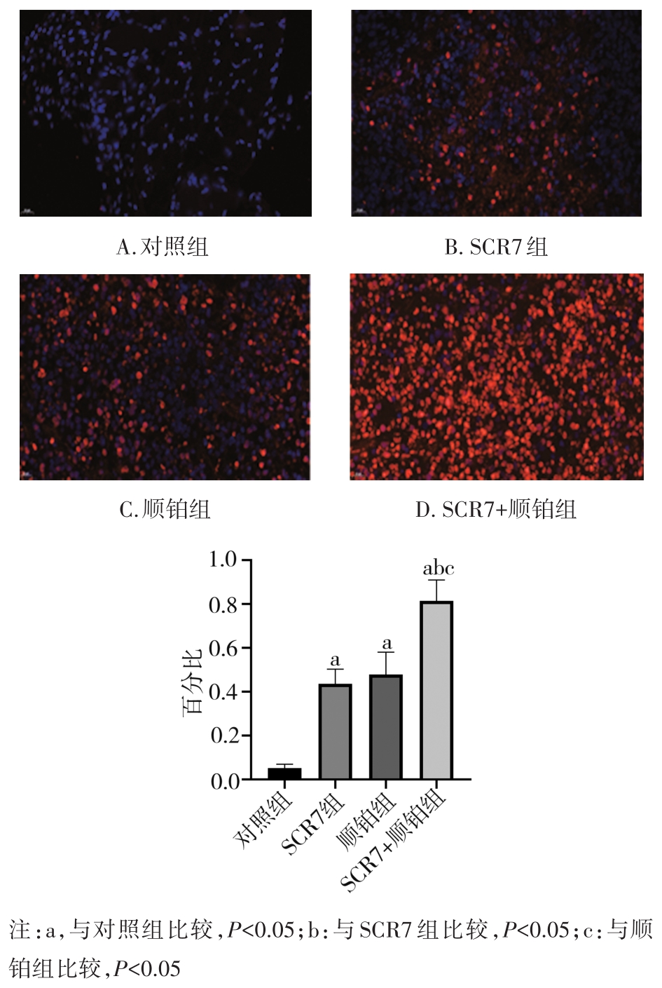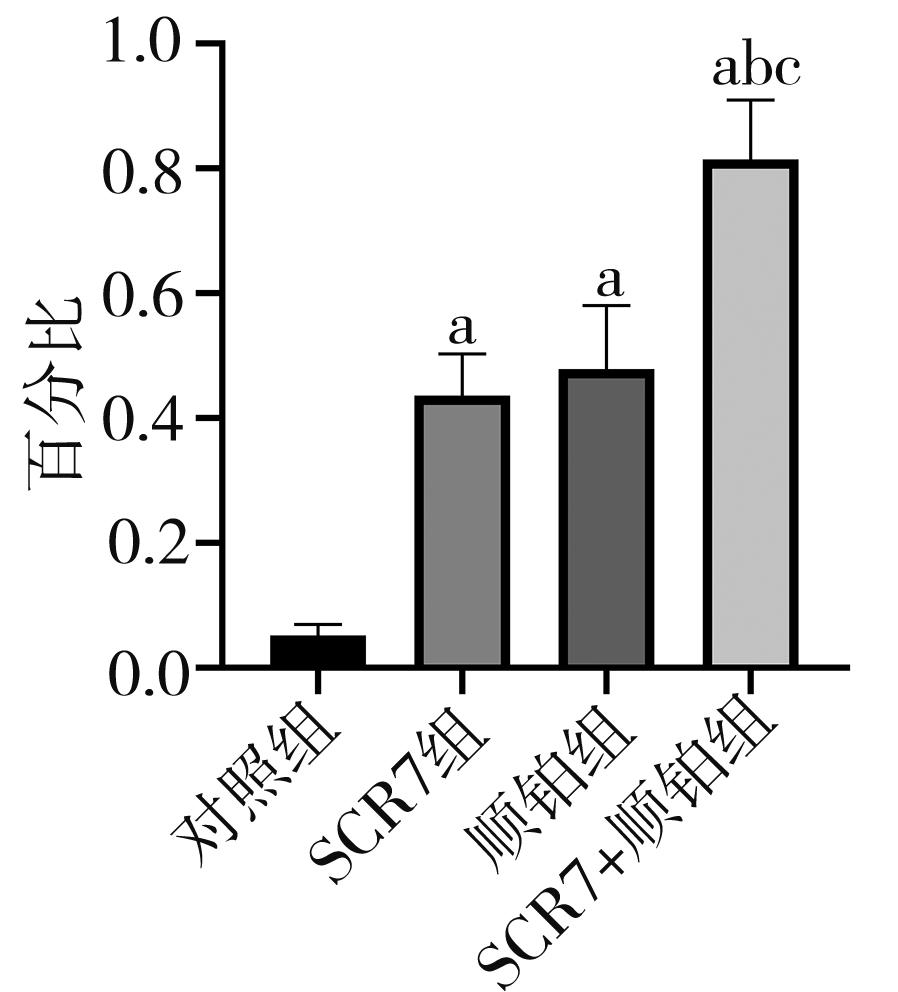 摘要:目的 探讨SCR7对三阴性乳腺癌顺铂化疗的增敏作用。方法 选用三阴乳腺癌MDA-MB-231细胞分为空白对照组、10 μmol/L顺铂对照组和联合组(10 μmol/L顺铂+10、20和40 μmol/L SCR7),采用CCK-8法检测细胞活性并计算细胞增殖抑制率;取对数期TNBC MDA-MB-231细胞构建三阴性乳腺癌移植瘤小鼠模型,建模成功后荷瘤裸鼠随机分为对照组、SCR7组,顺铂组、SCR7+顺铂组;饲养24 d后,观察比较各组荷瘤鼠肿瘤质量、瘤体体积的变化,计算肿瘤抑制率;苏木精-伊红(hematoxylin-eosin,HE)染色观察瘤体组织细胞形态学变化;原位末端标记法(in situ end labeling,TUNEL)检测乳腺癌肿瘤组织的凋亡;采用Western blot检测X射线修复交叉互补蛋白1(X-ray repair cross complementing 1,XRCC1)、多聚(ADP核糖)聚合酶1[poly(adp ribose) polymerase 1,PARP1]蛋白表达。结果 联合组细胞增殖抑制率均高于对照组(P<0.05),且随SCR7质量浓度增大呈逐渐升高趋势(P<0.05)。体内动物实验发现:相较于对照组,SCR7组、顺铂组、SCR7+顺铂组中的乳腺癌肿瘤体积、瘤重减小(P<0.05),其肿瘤抑制率分别是32%、40%、81%;SCR7+顺铂组较顺铂组减少更明显(P<0.05),且小鼠体质量与SCR7组、顺铂组相比无明显差异(P>0.05);HE染色观察干预组肿瘤组织均呈现明显形态学改变,其中SCR7+顺铂组肿瘤细胞退变变化最明显;TUNEL染色显示SCR7+顺铂组肿瘤细胞凋亡最为严重,可见大量红色细胞凋亡;Western blot检测发现,SCR7+顺铂组XRCC1、PARP1蛋白表达均明显低于其他组,差异均有统计学意义(P<0.05)。结论 SCR7在体内外对三阴乳腺癌顺铂化疗均有增敏作用。