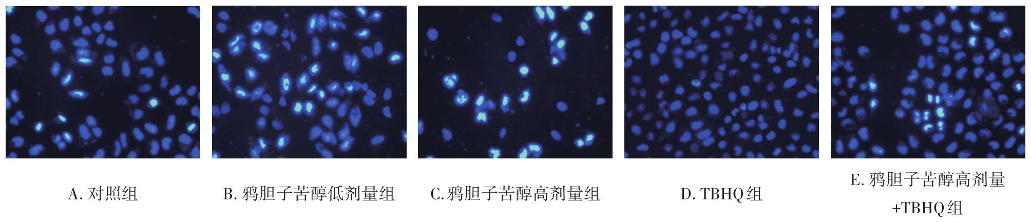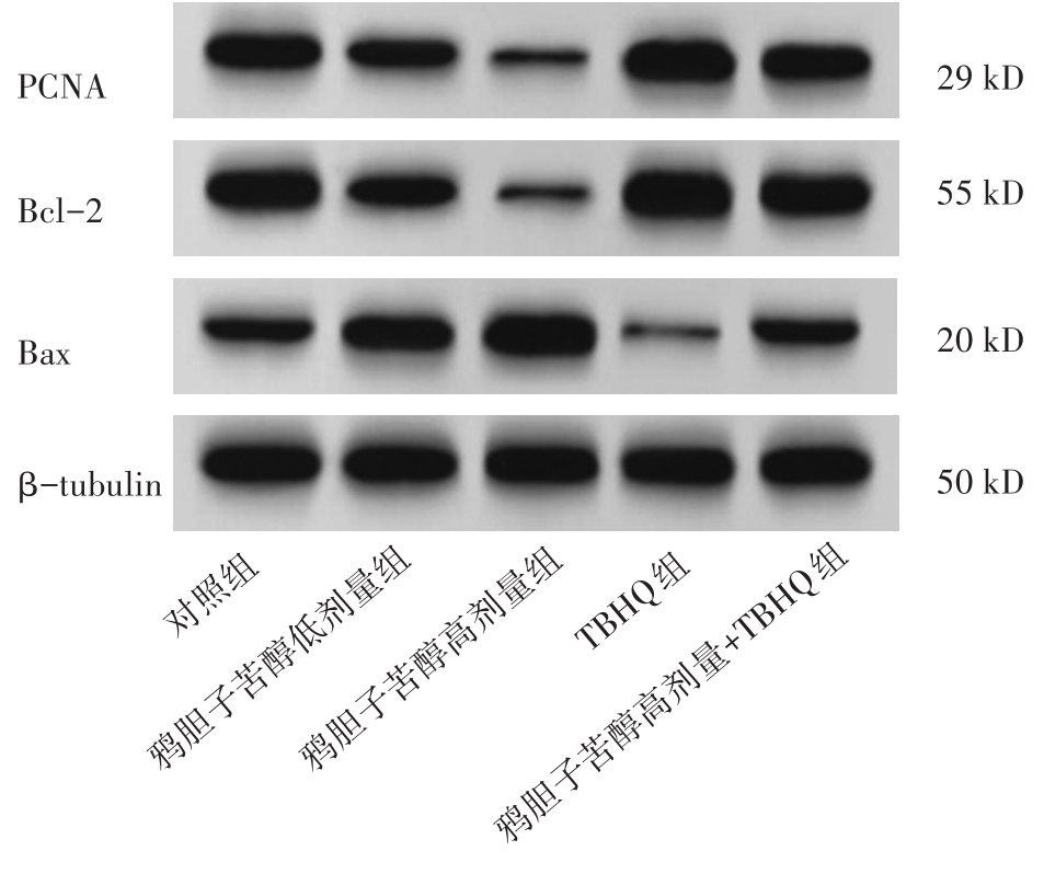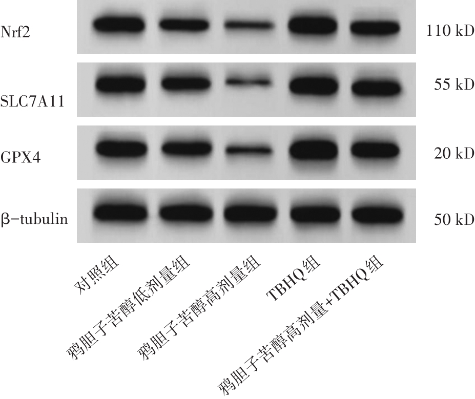 摘要:目的 探讨鸦胆子苦醇调节核因子E2相关因子2(nuclear factor erythroid-2 related factor 2,Nrf2)/溶质载体家族7成员11(solute carrier family 7 member 11,SLC7A11)/谷胱甘肽过氧化物酶4(glutathione peroxidase 4,GPX4)信号通路对皮肤鳞癌(cutaneous squamous cell carcinoma,cSCC)细胞铁死亡的影响。方法 CCK-8法检测0、100、250、500、700、900 nmol/L鸦胆子苦醇处理后人cSCC细胞系A431细胞增殖率,筛选出合适的鸦胆子苦醇作用浓度。体外培养的A431细胞随机分为对照组、鸦胆子苦醇低剂量组、鸦胆子苦醇高剂量组、特丁基对苯二酚(tert-butylhydroquinone,TBHQ;Nrf2激活剂)组、鸦胆子苦醇高剂量+TBHQ组,以鸦胆子苦醇和TBHQ分组处理后,采用CCK-8法、Hoechst 33342染色法检测各组A431细胞增殖与凋亡;采用试剂盒检测各组A431细胞抗氧化因子[谷胱甘肽(glutathione,GSH)、过氧化氢酶(catalase,CAT)、超氧化物歧化酶(superoxide dismutase,SOD)]水平及铁死亡指标[铁含量、活性氧(reactive oxygen species,ROS)及丙二醛(malondialdehyde,MDA)]水平;采用免疫印迹实验检测各组A431细胞增殖、凋亡及Nrf2/SLC7A11/GPX4信号通路相关蛋白表达。结果 与对照组相比,鸦胆子苦醇低、高剂量组细胞增殖率、GSH及CAT、SOD水平,以及增殖细胞核抗原(proliferating cell nuclear antigen,PCNA)及Bcl-2、Nrf2、SLC7A11、GPX4蛋白表达均降低(P<0.05),凋亡率、铁含量、ROS及MDA水平和Bax蛋白表达均升高(P<0.05);鸦胆子苦醇高剂量组细胞增殖率、GSH及CAT、SOD水平,以及PCNA及Bcl-2、Nrf2、SLC7A11、GPX4蛋白表达相比鸦胆子苦醇低剂量组进一步降低(P<0.05),凋亡率、铁含量、ROS及MDA水平和Bax蛋白表达进一步升高(P<0.05);TBHQ组细胞增殖率、GSH及CAT、SOD水平,以及PCNA及Bcl-2、Nrf2、SLC7A11、GPX4蛋白表达升高(P<0.05),凋亡率、铁含量、ROS及MDA水平和Bax蛋白表达降低(P<0.05)。与鸦胆子苦醇高剂量组相比,鸦胆子苦醇高剂量+TBHQ组细胞增殖率、GSH及CAT、SOD水平,以及PCNA及Bcl-2、Nrf2、SLC7A11、GPX4蛋白表达升高(P<0.05),凋亡率、铁含量、ROS及MDA水平和Bax蛋白表达降低(P<0.05)。结论 鸦胆子苦醇通过下调Nrf2/SLC7A11/GPX4信号通路而促进铁死亡,诱导cSCC细胞凋亡,并抑制其增殖。