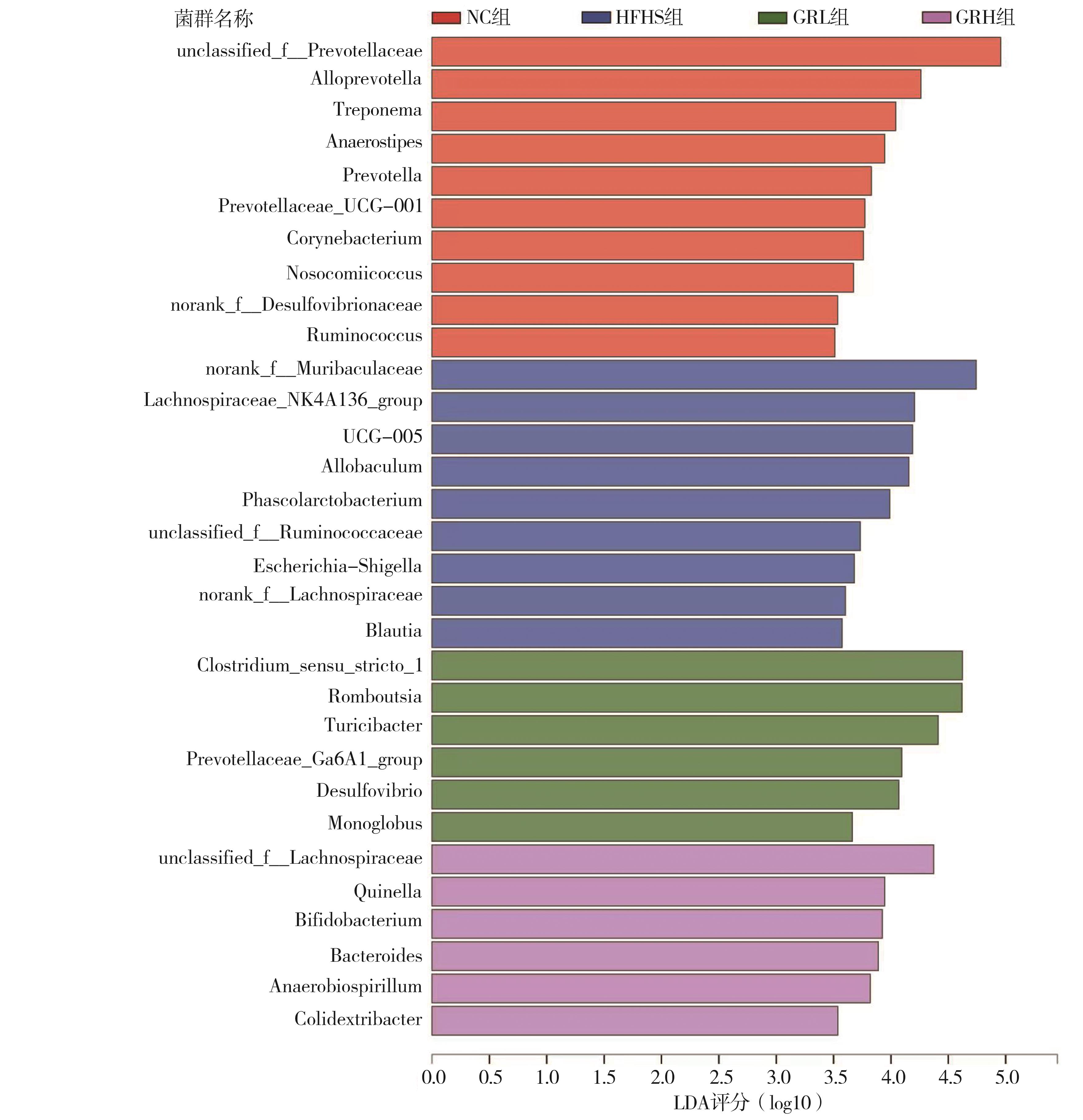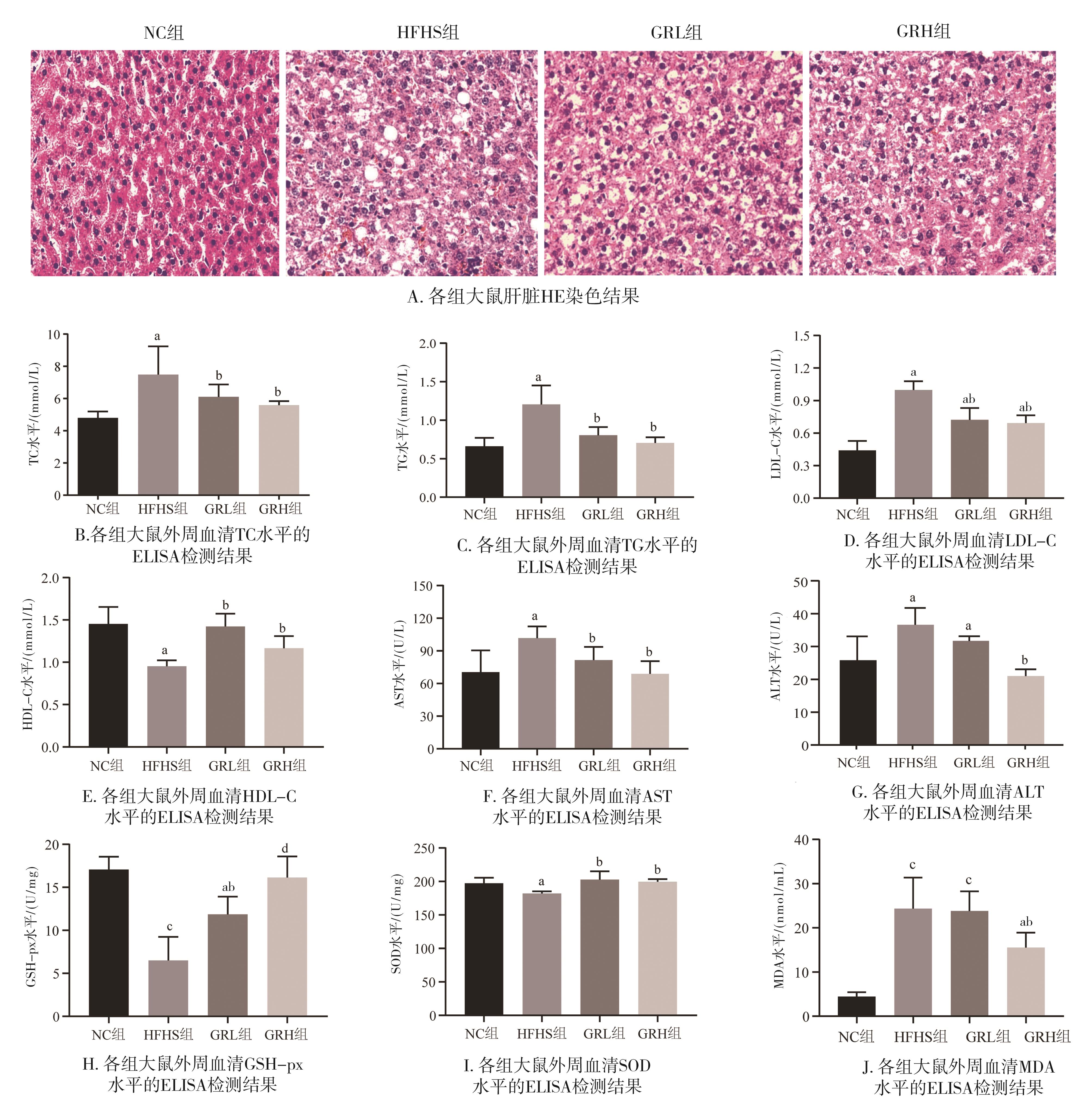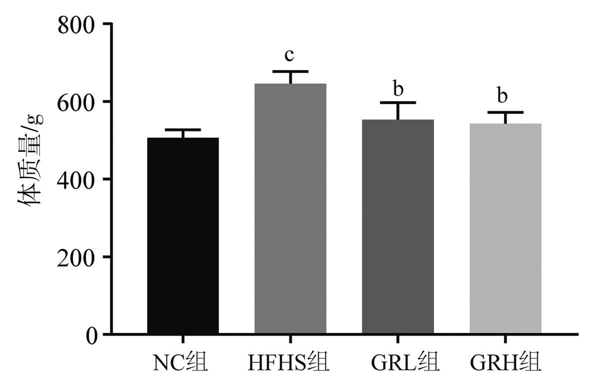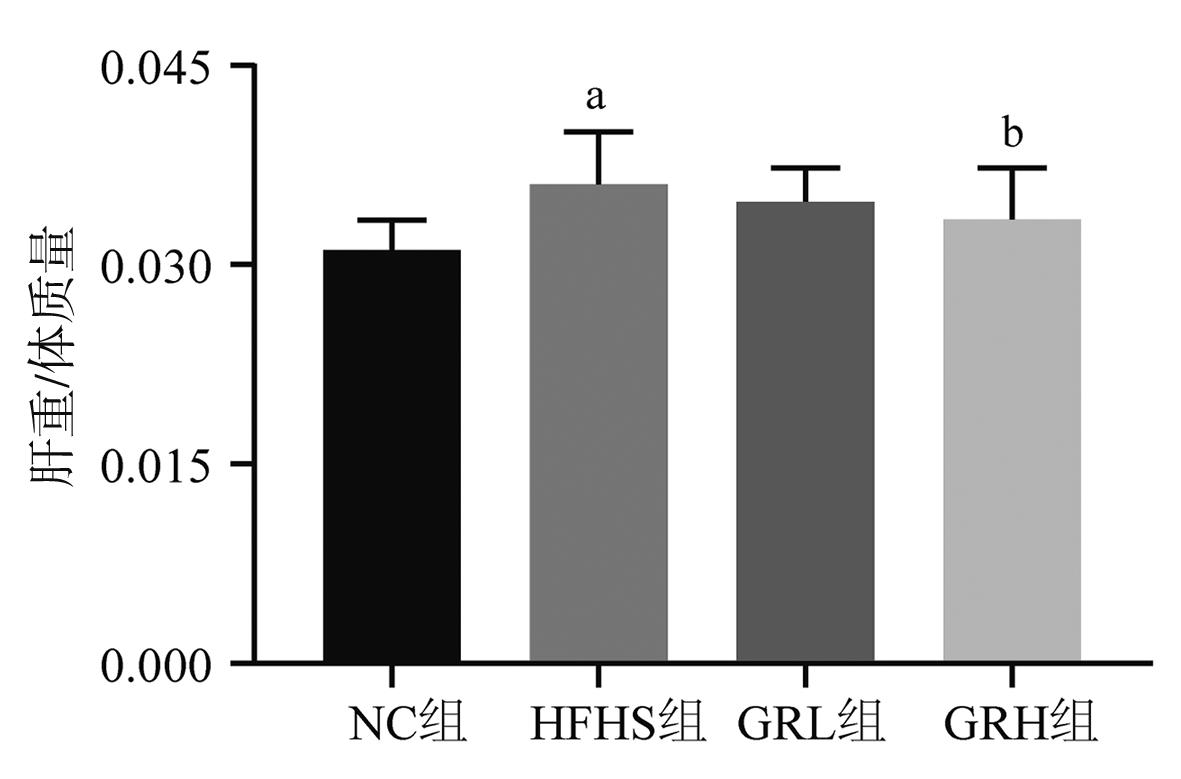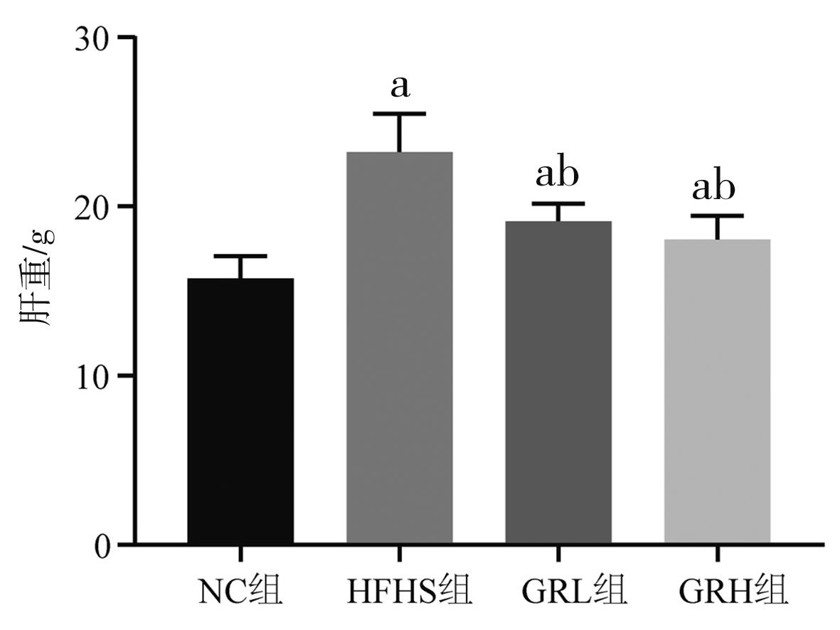 摘要:目的 探讨人参皂苷Rg1对大鼠非酒精性脂肪性肝病(non-alcoholic fatty liver disease,NAFLD)的改善情况及对肠道菌群的潜在影响。方法 将24只大鼠随机分为对照组、高脂高糖(high-fat and high-sugar,HFHS)组、人参皂苷Rg1低剂量治疗组、人参皂苷Rg1高剂量治疗组。采用HFHS饮食喂养制备大鼠NAFLD模型,给予人参皂苷Rg1灌胃干预治疗4周。麻醉处死大鼠,测量各组大鼠的体质量和肝重,计算肝重/体质量的比值;采用酶联免疫吸附实验(enzyme-linked immunosorbent assay,ELISA)分别检测各组大鼠血清总胆固醇(total cholesterol,TC)、甘油三酯(triglyceride,TG)、丙氨酸转氨酶(alanine aminotransferase,ALT)、天冬氨酸转氨酶(aspartate aminotransferase,AST)、低密度脂蛋白胆固醇(low density lipoprotein cholesterol,LDL-C)、高密度脂蛋白胆固醇(high density lipoprotein cholesterol,HDL-C)、谷胱甘肽过氧化物酶(glutathione peroxidase,GSH-px)、超氧化物歧化酶(superoxide dismutase,SOD)及丙二醛(malondialdehyde,MDA)的含量变化;采用苏木精-伊红(hematoxylin eosin,HE)染色法观察各实验组肝脏脂肪变性情况;采用16S rRNA基因高通量测序检测各组大鼠肠道微生物改变情况。结果 人参皂苷 Rg1干预治疗可降低NAFLD大鼠的体质量(P<0.01)和肝重(P<0.05);HE染色结果显示,人参皂苷 Rg1干预治疗可有效减轻NAFLD大鼠肝脏的脂肪变性(P<0.05);ELISA检测结果显示,人参皂苷Rg1干预治疗可降低NAFLD大鼠血清TG、TC、ALT、AST、LDL-C、MDA等指标的表达(P<0.05),HDL-C、GSH-px等指标在人参皂苷Rg1干预治疗后表达显著升高(P<0.05);肠道微生物α多样性分析结果显示,给予高剂量人参皂苷Rg1干预治疗可增加NAFLD大鼠肠道微生物α多样性(P<0.05);β多样性结果显示,给予人参皂苷Rg1干预治疗可显著改变NAFLD大鼠肠道微生物组成(P<0.01);线性判别分析结果显示,高剂量人参皂苷Rg1干预治疗后,其肠道微生物中的优势物种为毛螺菌属、双歧杆菌属、拟杆菌属、厌氧螺旋菌属等肠道益生菌。结论 人参皂苷 Rg1干预治疗可减轻NAFLD大鼠肝脂肪病变和氧化应激反应,其作用机制可能与Rg1改善NAFLD大鼠肠道微生物结构和多样性,以及增加肠道益生菌的丰度有关。