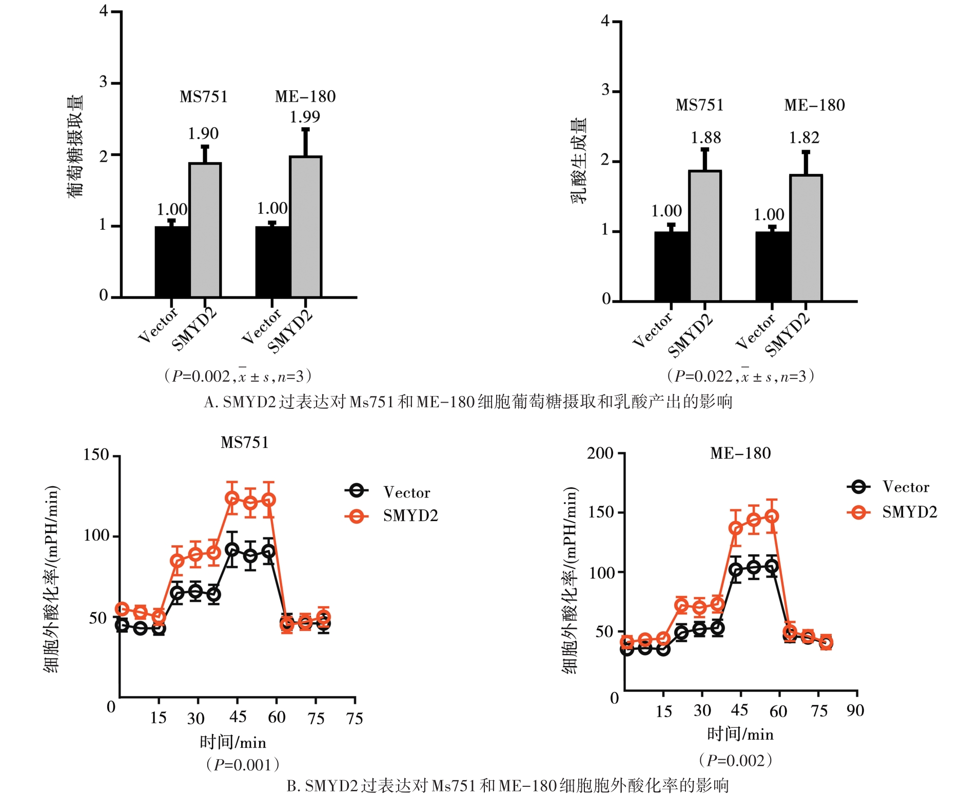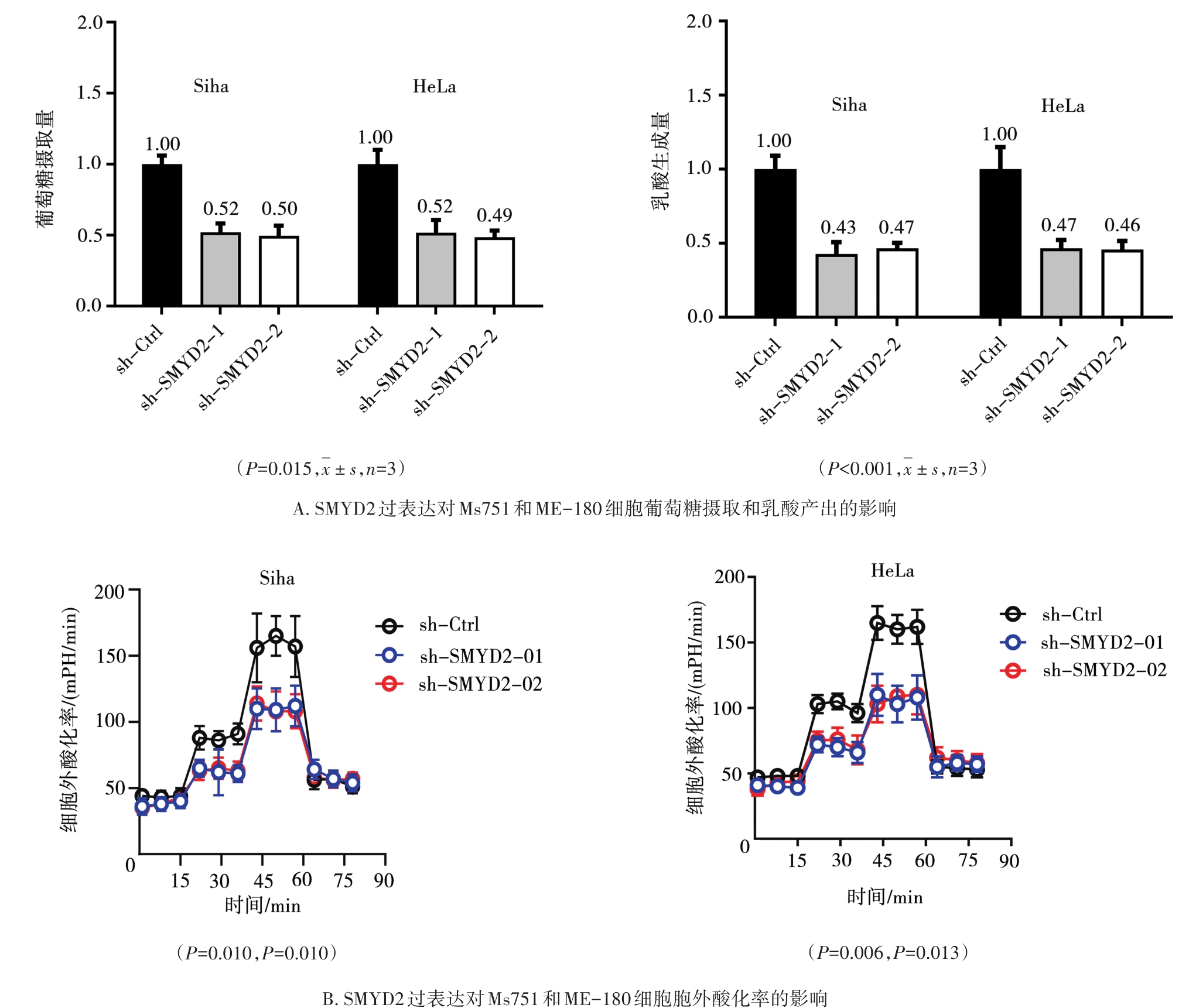 摘要:目的 探讨组蛋白赖氨酸甲基转移酶SET和MYND结构域蛋白2(SET and MYND domain-containing protein 2,SMYD2)在宫颈癌细胞糖代谢中的作用,进一步研究其是否与宫颈癌增殖有关。方法 通过基因表达谱交互分析(gene expression profiling interactive analysis,GEPIA)数据库分析SMYD家族成员在宫颈癌中的表达和预后价值,通过log-rank检验进行生存差异比较。通过SMYD2的shRNA敲低或过表达技术来研究SMYD2在宫颈癌中的糖代谢作用。结果 宫颈癌组织中SMYD2的表达与患者年龄、性别、肿瘤组织分化程度无关,SMYD2的过表达预示总体生存期较差与临床分期相关(F=4.520,P=0.004)。生物信息分析揭示了SMYD2在调控宫颈癌中Warburg效应中发挥调节作用。通过功能缺失实验,证明SMYD2的敲低抑制了宫颈癌细胞的有氧糖酵解,表现为葡萄糖摄取减少,乳酸生成降低和细胞外酸化减弱,而SMYD2过表达则促进子宫颈癌细胞的糖酵解代谢。此外,SMYD2是宫颈癌细胞生长所必需的,并且这种致癌作用主要依赖糖酵解。结论 SMYD2在宫颈癌细胞中过表达并在肿瘤代谢中发挥重要作用,能够通过调节有氧酵解促进宫颈癌细胞增殖。