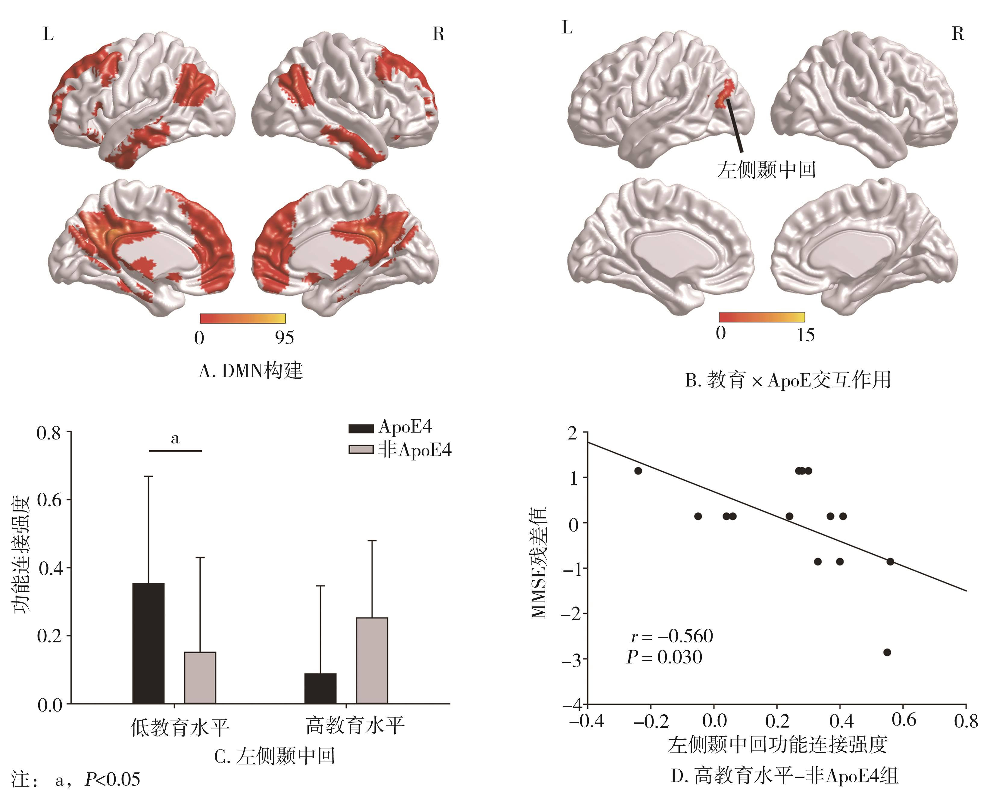 摘要:目的 受教育水平和载脂蛋白E(apolipoprotein E,ApoE)基因均可影响认知障碍的发生,但两者的交互作用尚不明确。本研究旨在探讨受教育水平和ApoE基因对轻度认知障碍(mild cognitive impairment,MCI)患者的认知功能和默认网络(default mode network,DMN)的交互作用。方法 本研究数据来源于阿尔茨海默病神经影像学计划数据集。根据受教育水平和ApoE ε4等位基因(ApoE ε4,ApoE4)状态将MCI受试者分为4组,运用协方差法分析两者对认知功能和DMN的作用。结果 教育和ApoE基因型对MCI患者整体认知功能存在显著交互作用(P<0.05):在低教育受试者中,非ApoE4携带者的整体认知功能优于携带者[23.00(22.50,25.50) vs. 22.00(21.00,24.00)],而在高教育受试者中则相反[23.00(22.00,26.00) vs. 25(22.75,26.25)]。另一方面,受教育水平与ApoE基因型对DMN的左侧颞中回的功能连接值(functional connectivity,FC)存在显著交互作用(P<0.05):在低教育受试者中,ApoE4携带者的FC显著高于非携带者(0.35±0.32 vs. 0.15±0.28),而在高教育受试者中则相反(0.09±0.26 vs. 0.25±0.23)。行为学关联分析发现左侧颞中回的FC与整体认知功能呈显著负相关(r=-0.560,P=0.030)。结论 高教育水平显著降低ApoE4等位基因对MCI患者认知功能的破坏作用,该认知保护作用可能与高教育水平降低异常的DMN活性相关。该结果强调基因与环境交互作用对认知障碍的重要影响。