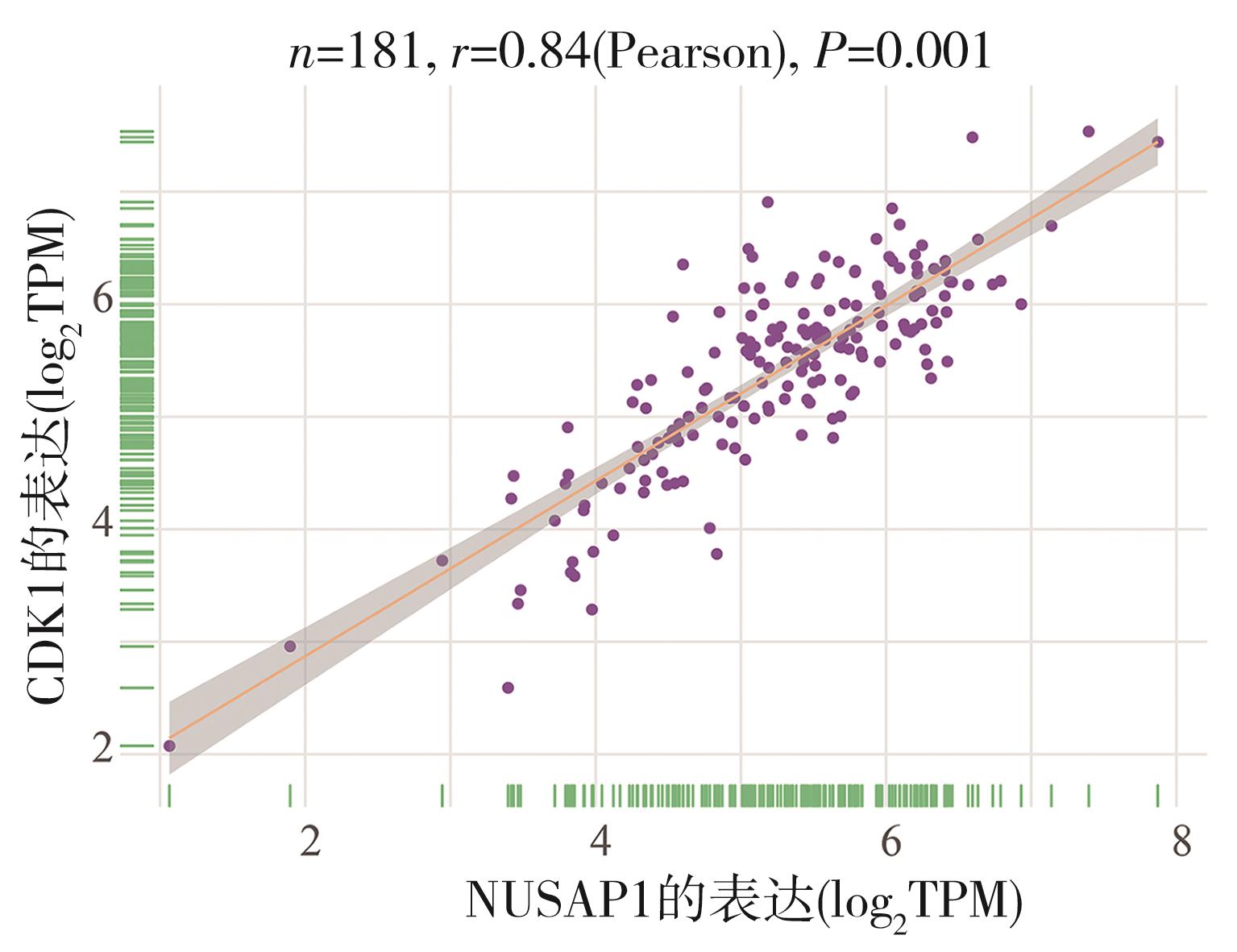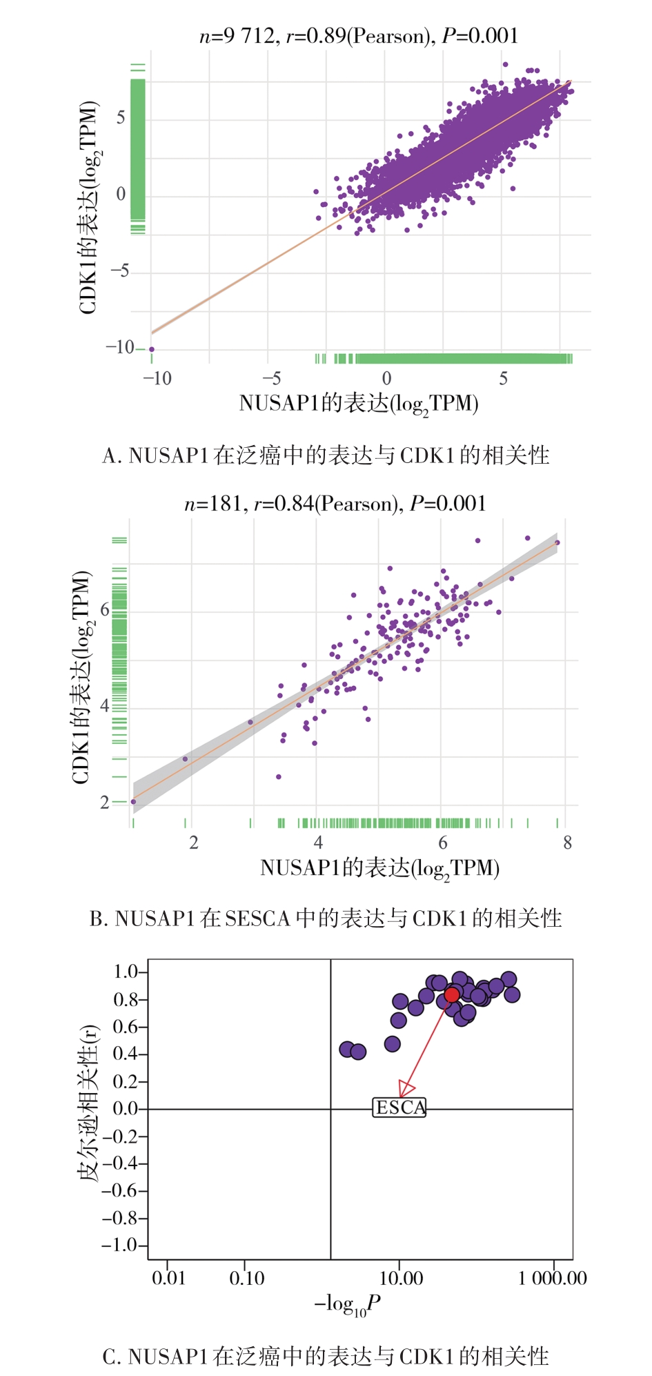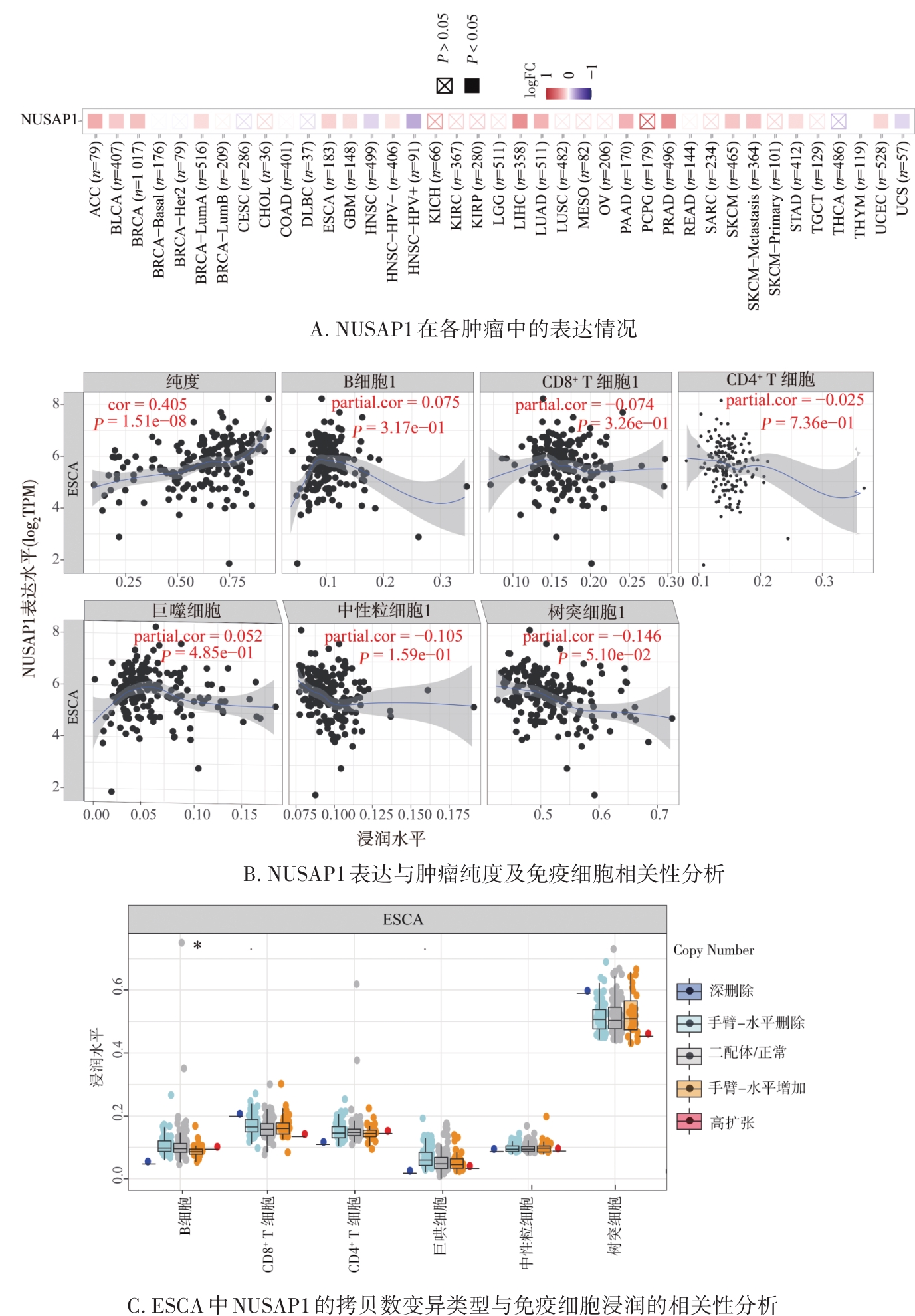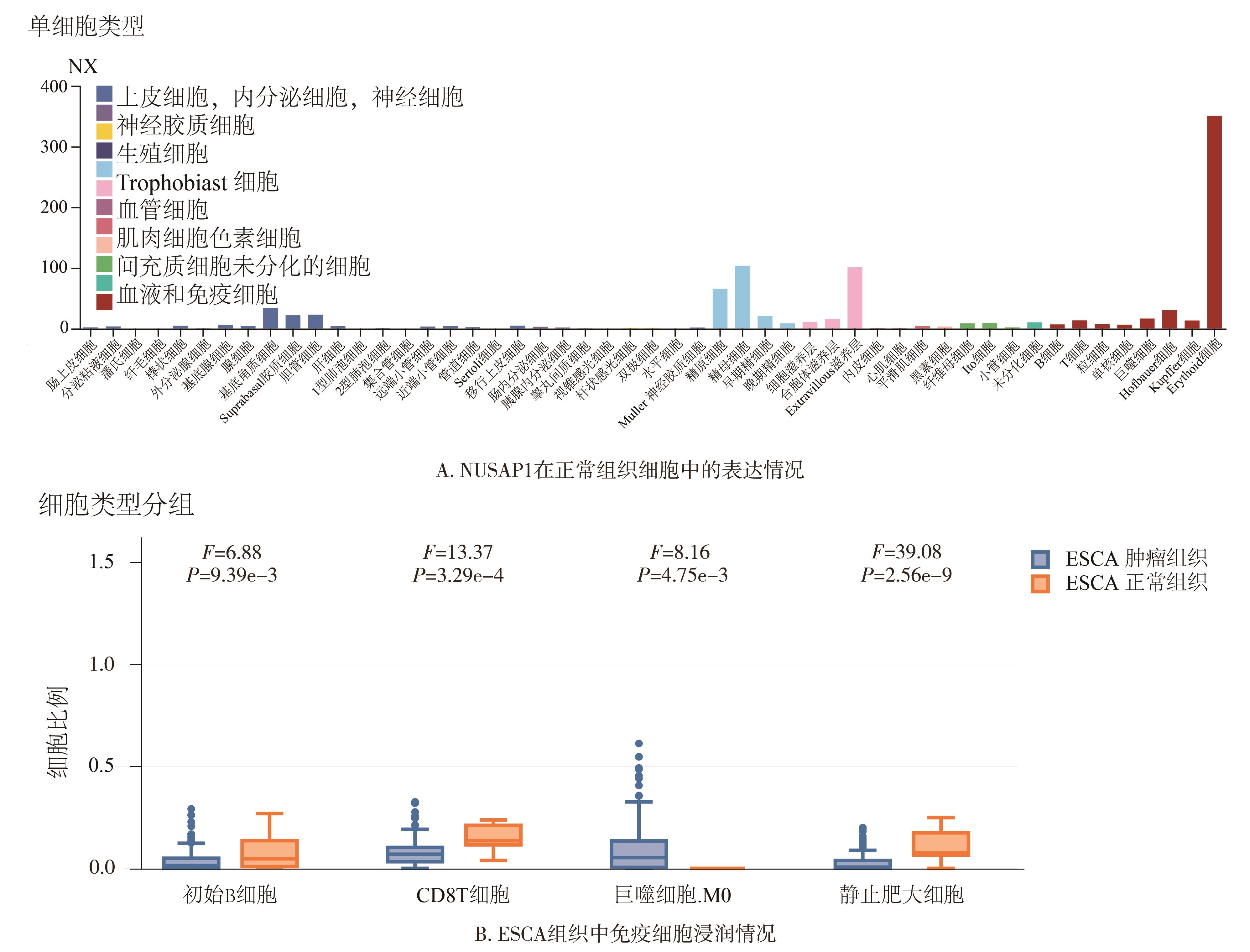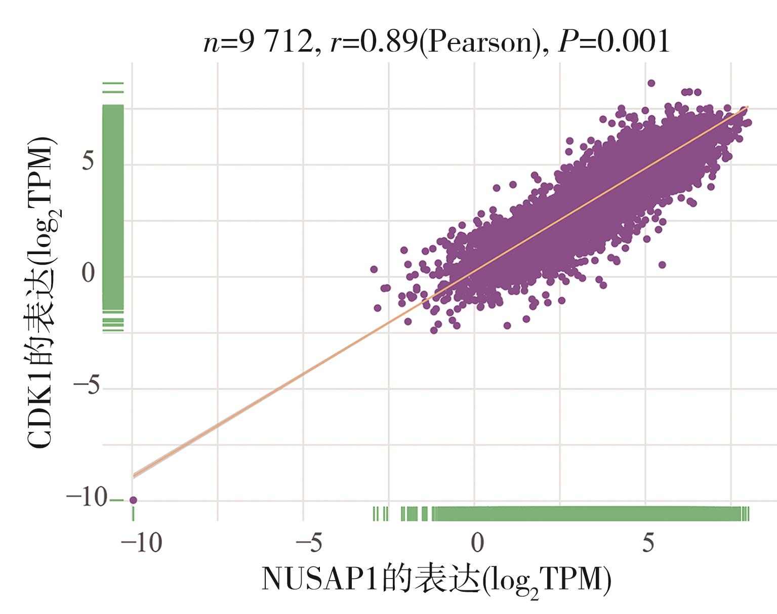 摘要:目的 探讨核仁纺锤体相关蛋白1(nucleolar and spindle-associated protein 1,NUSAP1)在食管癌(esophageal carcinoma,ESCA)中的表达情况、临床意义及功能机制,为ESCA的早期诊断和治疗提供新思路。方法 从GEPIA2和TIMER数据库下载ESCA样本与癌旁样本,进行NUSAP1的表达分析,STRING和Cytoscape软件进行NUSAP1相关基因的PPI网络构建,并进行GO、KEGG及GSEA富集分析。TIMER数据库被用来分析NUSAP1与免疫细胞的相关性。最后通过RT-PCR、Western blot和免疫组化验证NUSAP1在ESCA组织和细胞中的表达,使用慢病毒包被的小干扰RNA转染ESCA细胞,进行NUSAP1的表达敲减。通过CKK-8和Ki67免疫荧光评估NUSAP1对ESCA细胞增殖的影响。结果 NUSAP1在ESCA组织和细胞中高表达。NUSAP1的表达与CDK1、B细胞和巨噬细胞浸润正相关,而与CD4+ T细胞、CD8+ T细胞、中性粒细胞和树突状细胞浸润负相关。GSEA分析发现NUSAP1的高表达组主要富集于Wnt/β-catenin 信号通路、过氧化物酶通路、PI3K/Akt/mTOR信号通路。在体外,敲减NUSAP1后抑制了ESCA细胞增殖。结论 NUSAP1在ESCA中高表达,并与ESCA细胞增殖和免疫细胞浸润密切相关。因此,NUSAP1可能有助于ESCA的诊断和治疗。