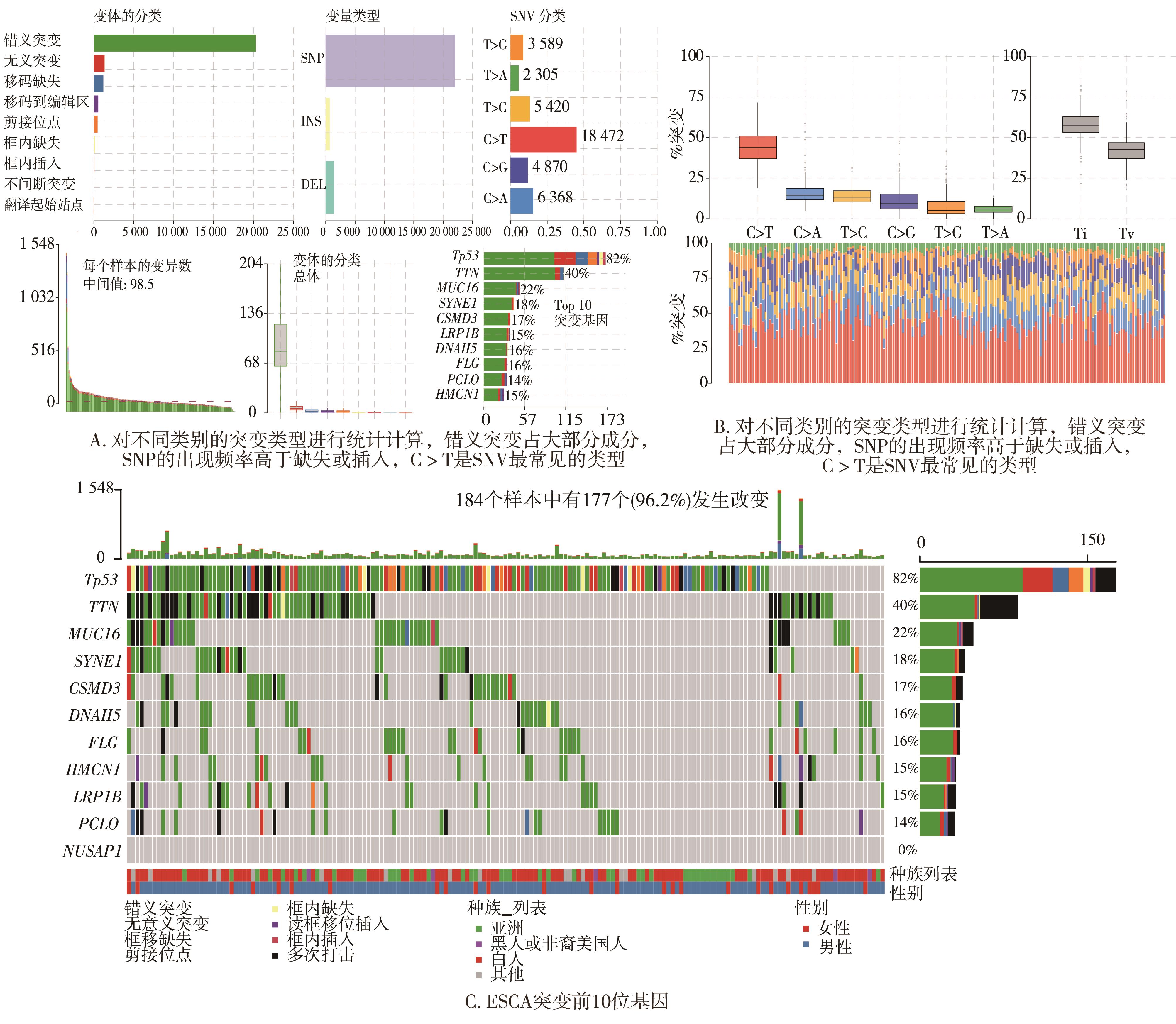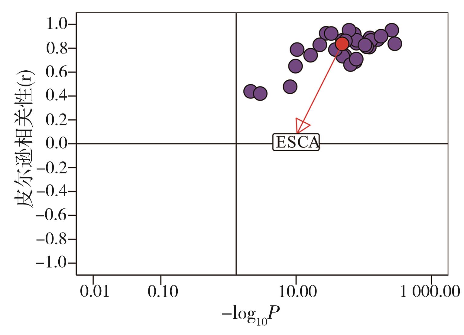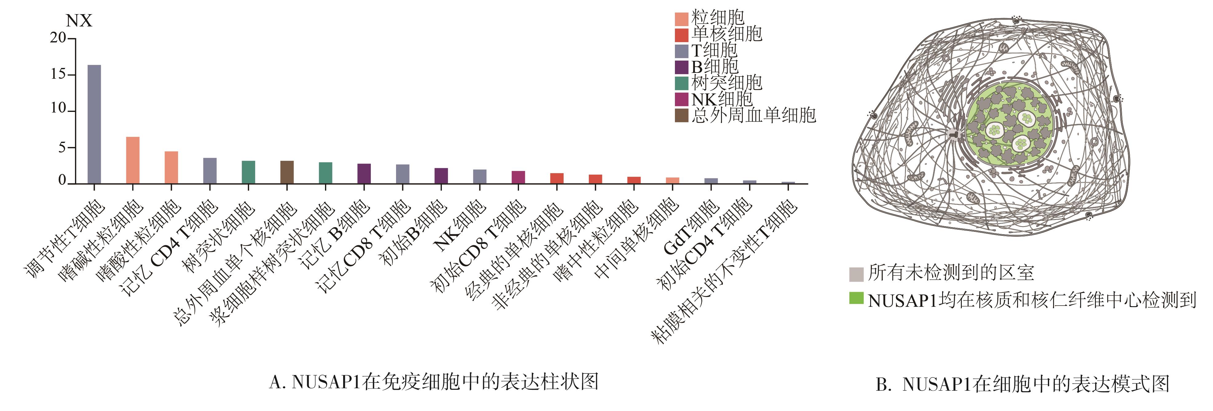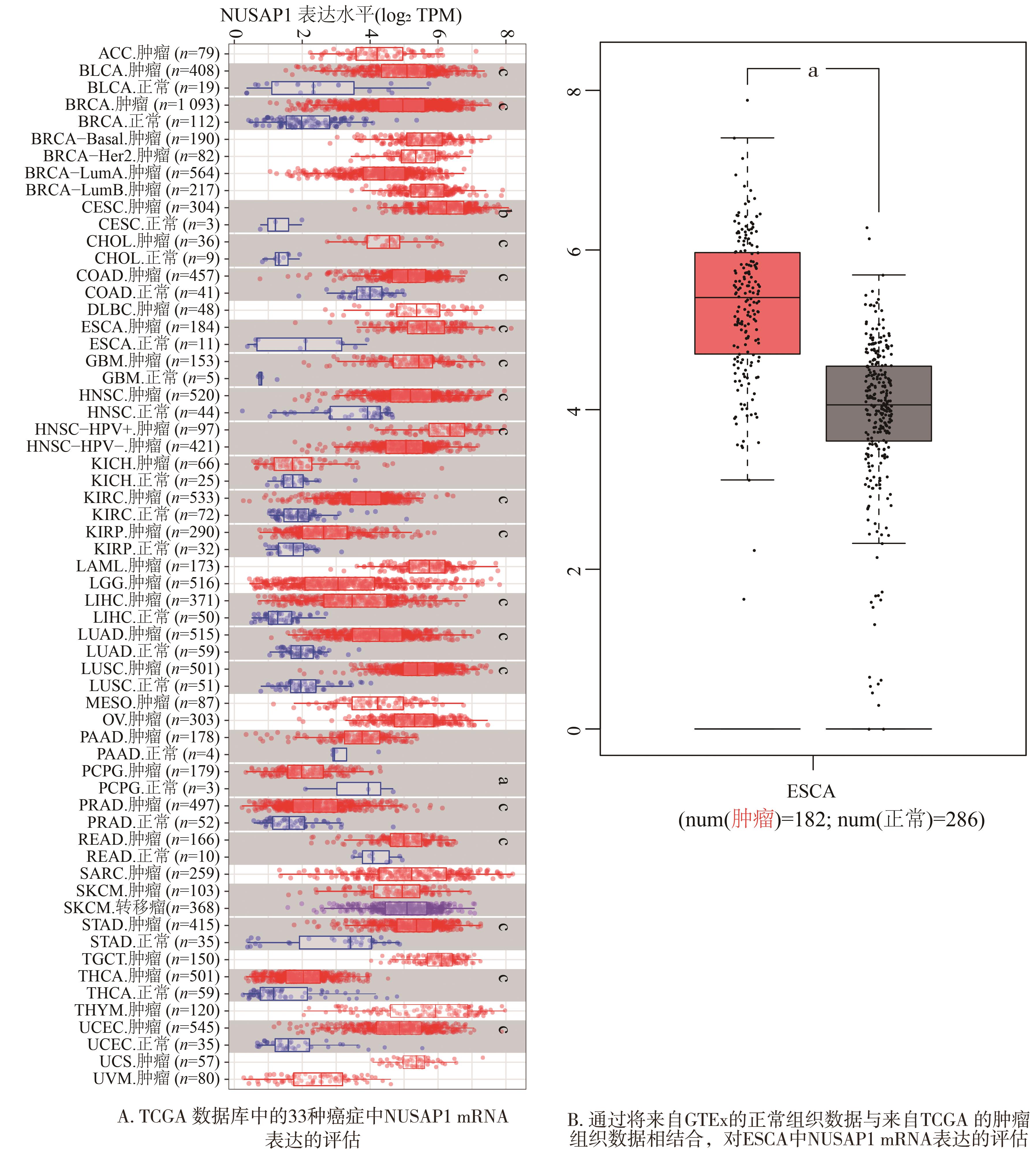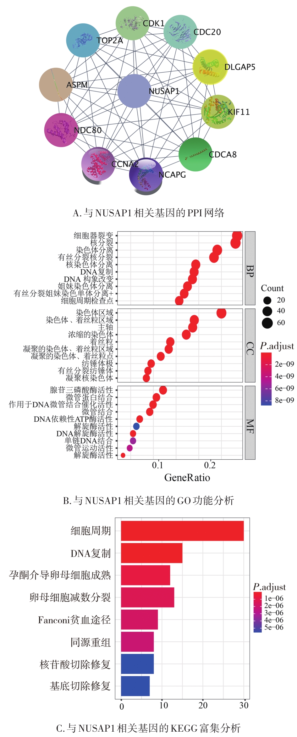 摘要:目的 探讨核仁纺锤体相关蛋白1(nucleolar and spindle-associated protein 1,NUSAP1)在食管癌(esophageal carcinoma,ESCA)中的表达情况、临床意义及功能机制,为ESCA的早期诊断和治疗提供新思路。方法 从GEPIA2和TIMER数据库下载ESCA样本与癌旁样本,进行NUSAP1的表达分析,STRING和Cytoscape软件进行NUSAP1相关基因的PPI网络构建,并进行GO、KEGG及GSEA富集分析。TIMER数据库被用来分析NUSAP1与免疫细胞的相关性。最后通过RT-PCR、Western blot和免疫组化验证NUSAP1在ESCA组织和细胞中的表达,使用慢病毒包被的小干扰RNA转染ESCA细胞,进行NUSAP1的表达敲减。通过CKK-8和Ki67免疫荧光评估NUSAP1对ESCA细胞增殖的影响。结果 NUSAP1在ESCA组织和细胞中高表达。NUSAP1的表达与CDK1、B细胞和巨噬细胞浸润正相关,而与CD4+ T细胞、CD8+ T细胞、中性粒细胞和树突状细胞浸润负相关。GSEA分析发现NUSAP1的高表达组主要富集于Wnt/β-catenin 信号通路、过氧化物酶通路、PI3K/Akt/mTOR信号通路。在体外,敲减NUSAP1后抑制了ESCA细胞增殖。结论 NUSAP1在ESCA中高表达,并与ESCA细胞增殖和免疫细胞浸润密切相关。因此,NUSAP1可能有助于ESCA的诊断和治疗。