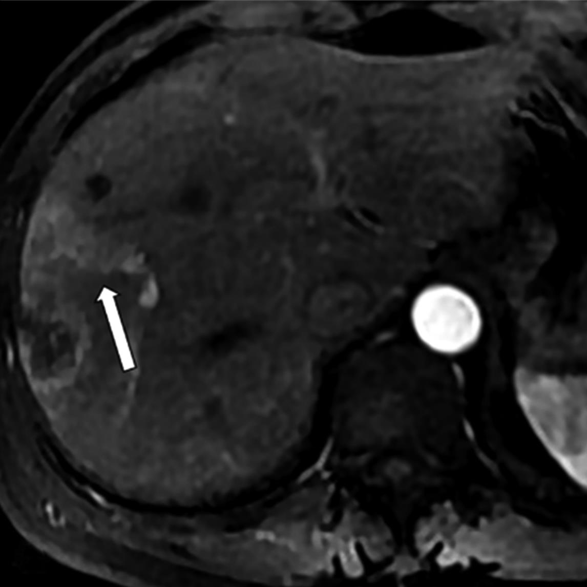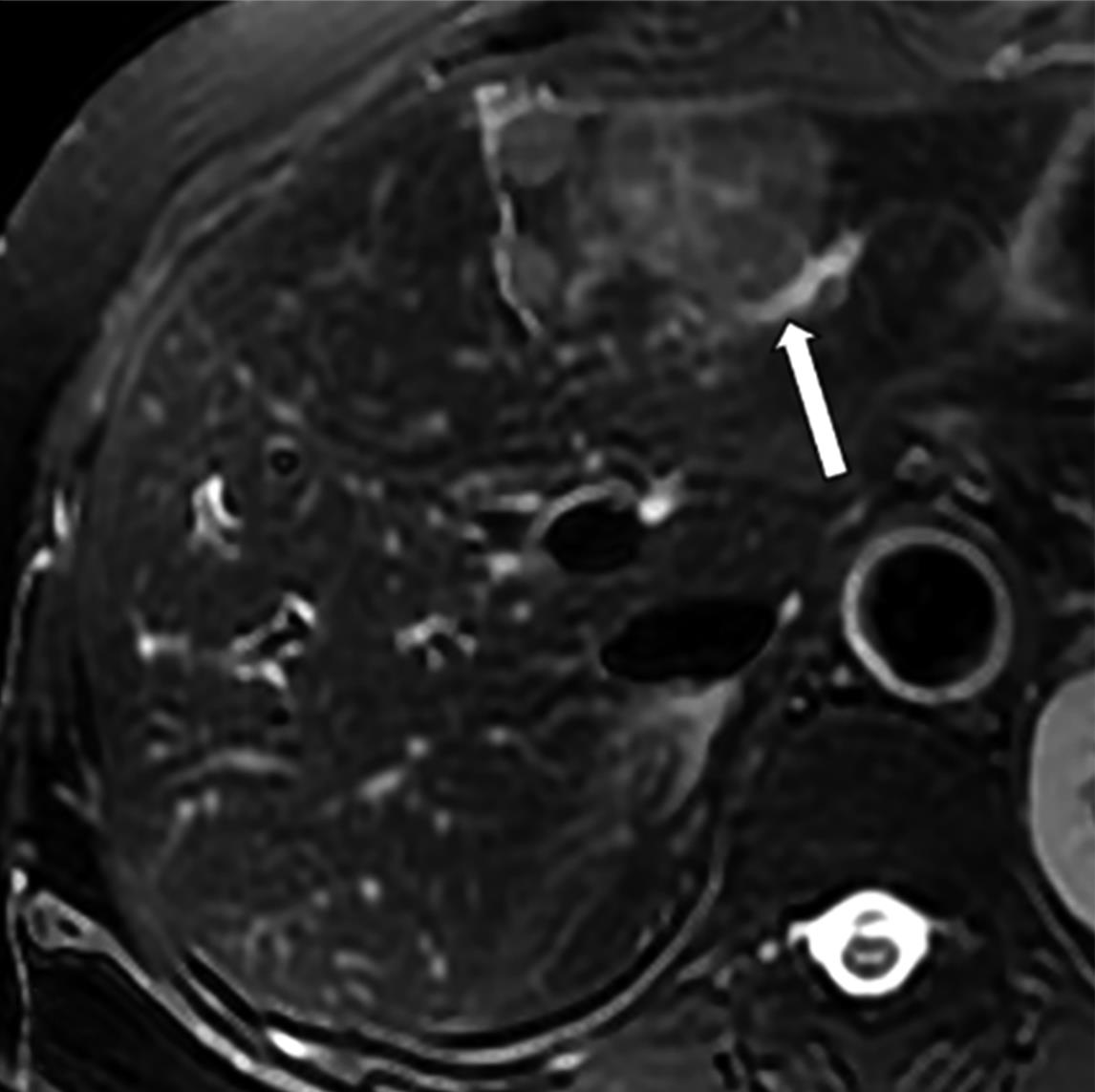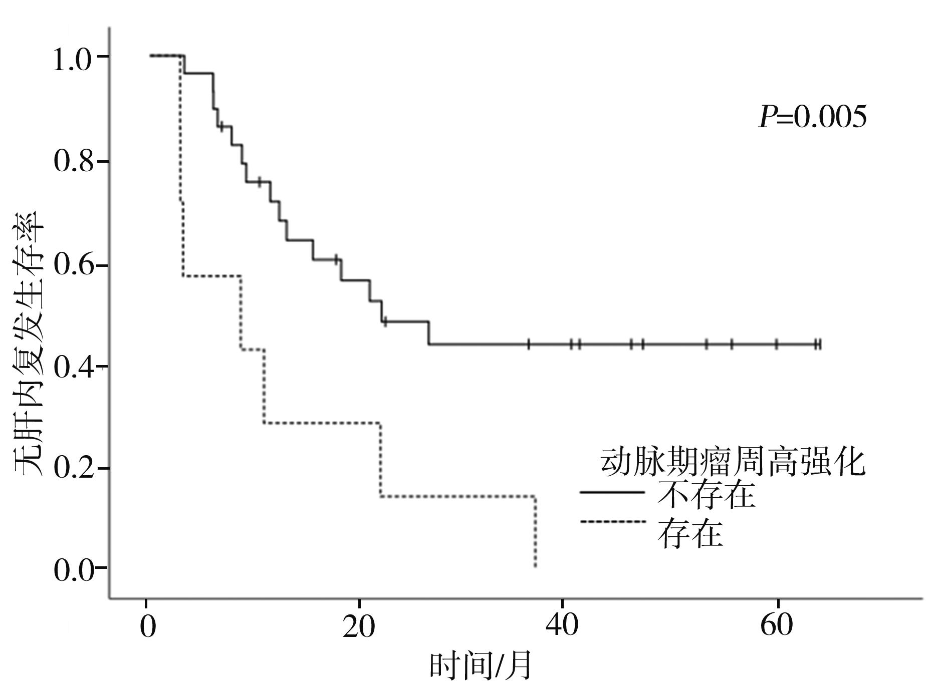 摘要:目的 研究结直肠肝转移(colorectal liver metastases,CRLM)瘤周影像特征在非解剖切除(non-anatomic resection,NAR)后CRLM患者中长期预后的价值。方法 回顾性纳入术前行腹部钆塞酸二钠增强磁共振成像(magnetic resonance imaging,MRI)和NAR术后的CRLM患者。影像特征评估动脉期瘤周高强化、肝胆期(hepatobiliary phase,HBP)瘤周低摄取和瘤周胆管扩张。应用Kaplan-Meier法计算生存率,并采用Cox比例风险回归模型进行单因素和多因素分析以确定无肝内复发生存期(liver recurrence-free survival,LRFS)、无复发生存期(recurrence-free survival,RFS)和总生存期(overall survival,OS)的独立预测因素。结果 本研究共纳入36例患者,58个CRLM病灶。存在和不存在动脉期瘤周高强化的患者3年LRFS和RFS率有统计学差异(LRFS:14.3% vs. 43.9%,P=0.005;RFS:14.3% vs. 40.3%,P=0.006)。动脉期瘤周高强化与较差的LRFS(P=0.002,HR=5.541,95%CI=1.853~15.975)和较差的RFS(P=0.002,HR=5.392,95%CI=1.887~15.412)独立相关。胆管扩张和HBP瘤周低摄取均不为LRFS、RFS和OS的独立预测因素。结论 动脉期瘤周高强化是接受NAR的CRLM患者LRFS和RFS预后因子。