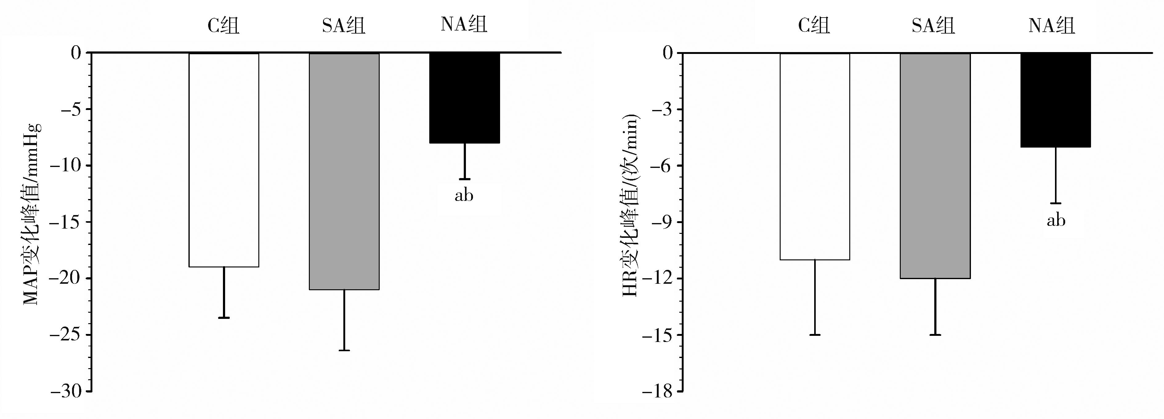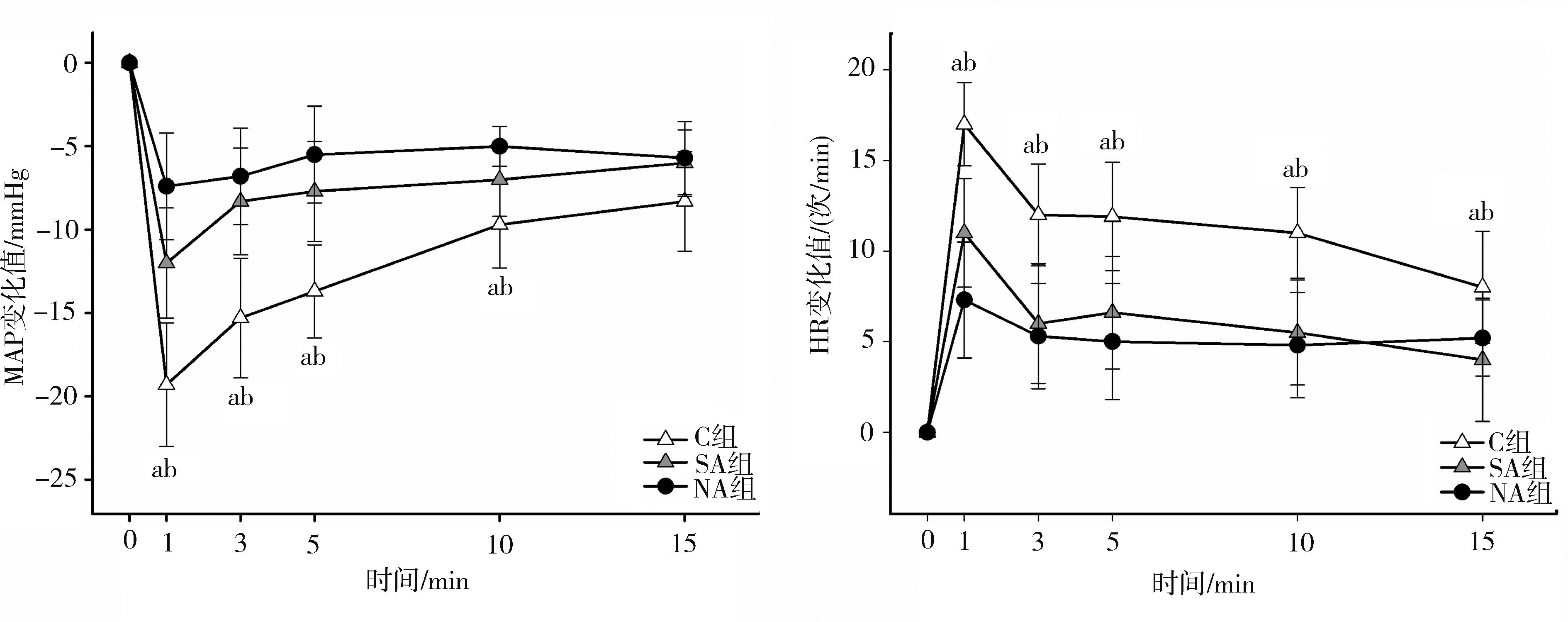 摘要:目的 探讨收肌管及腘窝坐骨神经阻滞联合踝部止血带在老年足部手术应用的效果。方法 择期行足部手术的老年患者69例,以随机数字表法分为3组:蛛网膜下腔阻滞联合大腿止血带组(C组)、蛛网膜下腔阻滞联合踝部止血带组(SA组)及收肌管及腘窝坐骨神经阻滞联合踝部止血带组(NA组)。比较3组麻醉后30 min内平均动脉压(mean arterial pressure,MAP)、心率(heart rate,HR)变化峰值,松止血带后1、3、5、10、15 min时MAP及HR变化;术后排尿、排气时间及24 h恢复质量(quality of recovery,QoR)-15评分;麻醉及术野止血效果、间羟胺用量、首次自控镇痛(patient-controlled analgesia,PCA)时间、术后48 h内舒芬太尼用量及不良反应等情况。结果 纳入患者69例,64例完成研究。与C组及SA组比较,NA组麻醉后30 min内MAP及HR变化峰值明显减小,术后排尿、排气时间显著缩短,24 h QoR-15评分更高;麻醉起效较慢、阻滞范围小,间羟胺用量更少,首次PCA时间显著延长,术后12、24及48 h舒芬太尼累积用量减少,差异有统计学意义(P<0.05)。与C组比较,SA组及NA组松止血带后MAP、HR波动幅度明显减小,间羟胺用量更少;术后止血带区域皮肤水泡和疼痛发生率更低,差异有统计学意义(P<0.05)。3组其余指标差异无统计学意义(P>0.05)。结论 收肌管及腘窝坐骨神经阻滞联合踝部止血带应用于老年足部手术,血流动力学稳定,恢复速度快,效果良好,不良反应少。