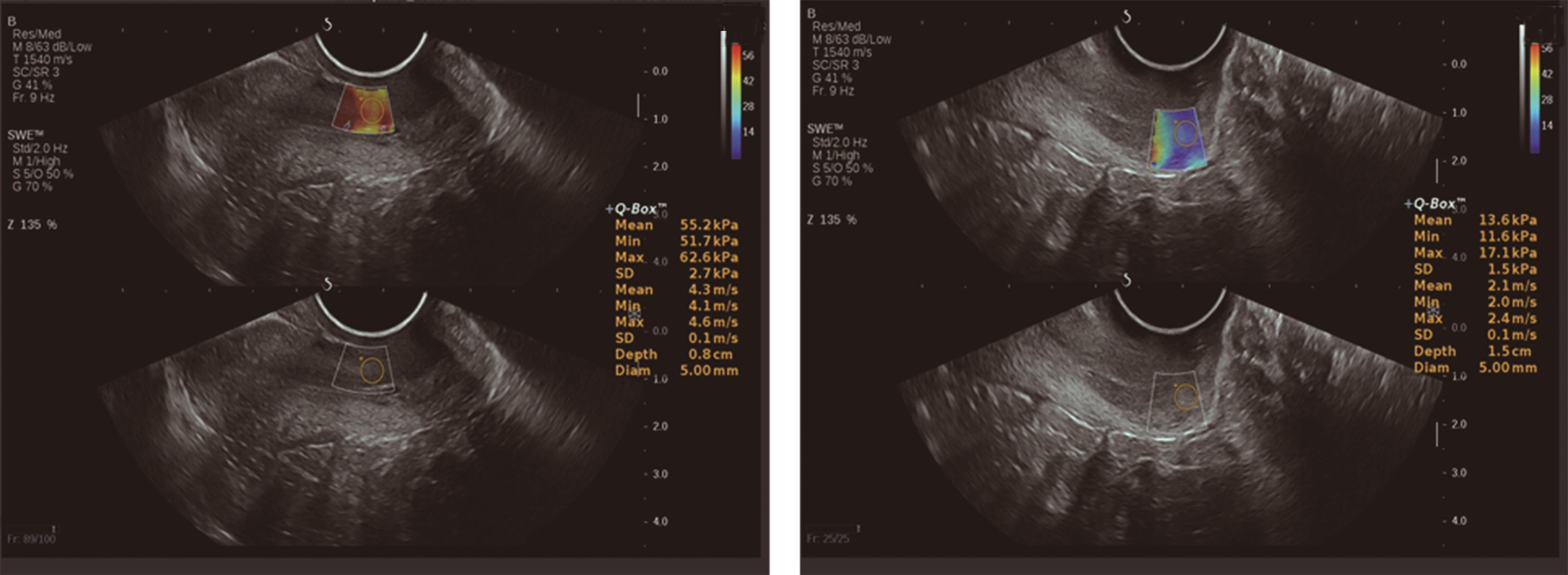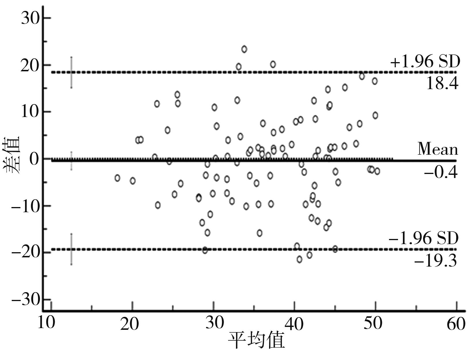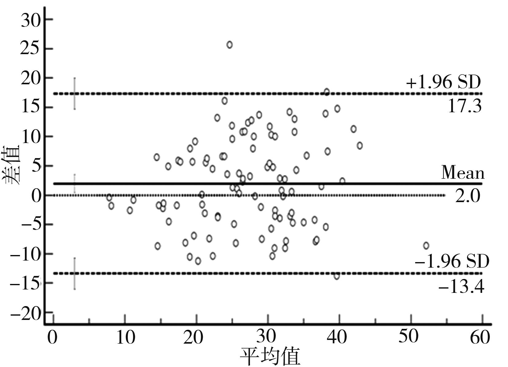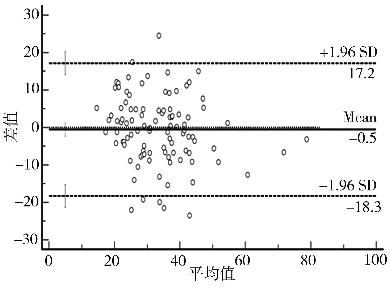 摘要:目的 评价剪切波弹性成像(shear wave elastography,SWE)测量育龄期健康未育女性宫颈杨氏模量值的可重复性。方法 由同一名接受过SWE检测培训的高年资医师于同一天不同时间点,前后2次对100名处于育龄期但未育的健康女性宫颈行剪切波弹性成像,测量时选取宫颈4个位点:内口前唇(anterior lip of the inner mouth,IA)、内口后唇(posterior lip of the inner mouth,IP)、外口前唇(anterior lip of the outer mouth,EA)及外口后唇(posterior lip of the outer mouth,EP),获取育龄期健康未育女性宫颈杨氏模量值。使用组内相关系数(interclass correlation coefficient,ICC)评价检查者内可重复性,同时绘制Bland-Altman散点图评价测量一致性。结果 宫颈4个测量位点的前后2次测值均无统计学差异(P>0.05);宫颈IA、EA、EP处杨氏模量值的组内相关系数分别为0.828、0.785、0.768,提示组内可重复性非常好;宫颈IP处杨氏模量值的组内相关系数为0.632,提示组内可重复性好;Bland-Altman散点图提示SWE测量宫颈4个位点杨氏模量值的组内一致性均为好。结论 SWE可用于宫颈硬度的测量,且在宫颈不同位点均具有良好的可重复性与一致性。