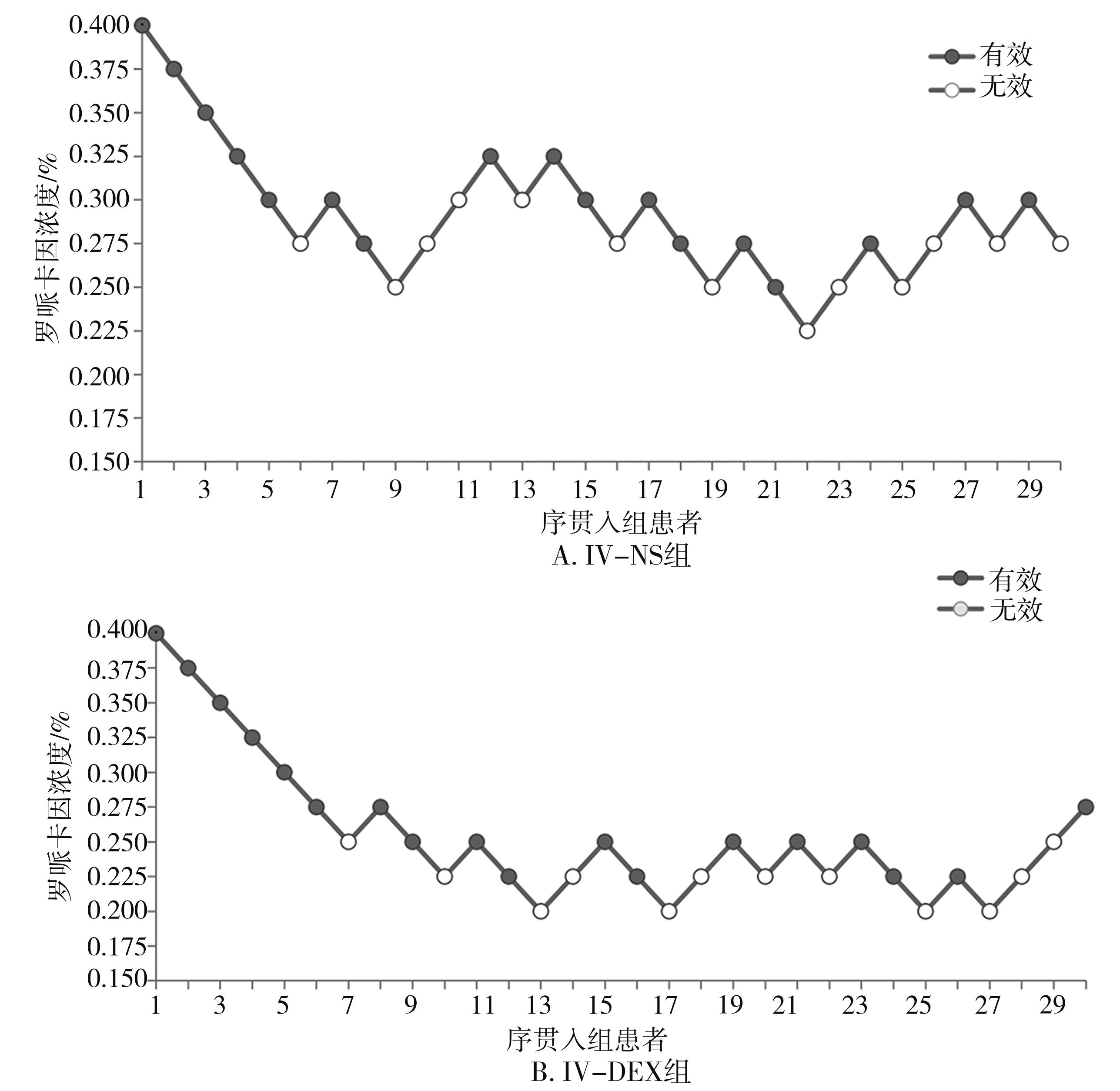 摘要:目的 骶管阻滞具有操作简单、损伤小、起效快和麻醉效果明确等特点,是儿童和成人接受下肢、泌尿系统或肛肠手术的常用麻醉方法。静脉输注右美托咪定(intravenous dexmedetomidine,IV-DEX)是区域麻醉过程中常用的镇静方法,显示了其对局麻药的协同作用。本研究的目的是验证IV-DEX是否会降低局麻药骶管阻滞的半数有效浓度(median effective concentration,EC50)。方法 纳入60例计划行择期痔切除术的患者,分为2组,静脉输注生理盐水组(intravenous-normal saline,IV-NS组)和IV-DEX组。IV-NS组和IV-DEX组分别在骶管阻滞前15 min静脉输注20 mL生理盐水和1 μg/kg右美托咪定(生理盐水稀释至20 mL)。采用Dixon-Massey“上下”顺序分配法确定罗哌卡因骶管阻滞的EC50。记录患者术中生命体征,需要药物处理的低血压、心动过缓和术中其他不良反应发生情况。结果 IV-NS组罗哌卡因骶管阻滞的EC50为0.280%,IV-DEX组为0.233%(P<0.05)。与IV-NS组相比,IV-DEX组中罗哌卡因的EC50降低16.8%(P=0.000),具有统计学差异。2组间需要药物治疗的低血压、心动过缓和术中其他不良反应发生率无统计学差异。结论 IV-DEX可以降低罗哌卡因骶管阻滞的EC50,但IV-DEX可能导致低血压、心动过缓的发生率增加。因此,IV-DEX与局麻药协同作用的最佳剂量仍需要进一步探索。