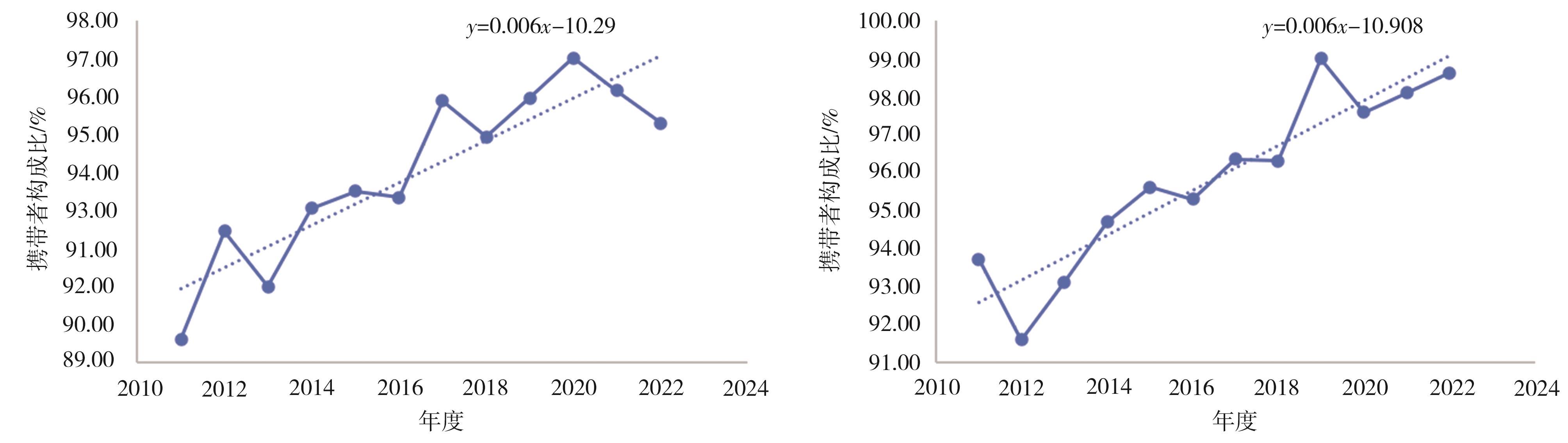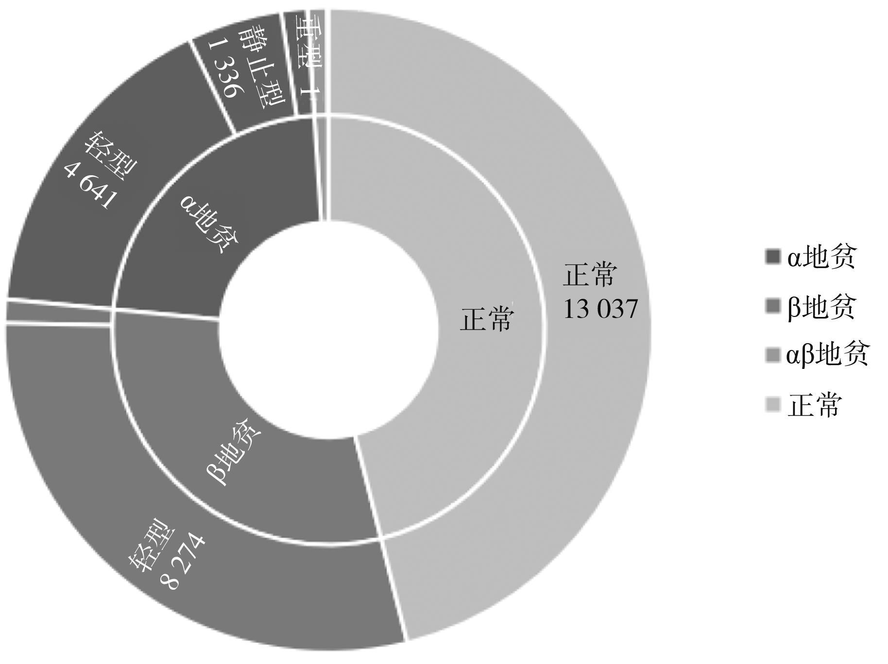 摘要:目的 探讨重庆地区儿童地中海贫血基因检测阳性情况、基因型及分布特征。方法 对2011年1月至2022年12月重庆医科大学附属儿童医院就诊的28 287例经血液学筛查疑似地中海贫血儿童进行常见α和β地中海贫血基因突变位点检测,分析检出率和地中海贫血携带者检出构成比的变化趋势及基因型分布情况。结果 在28 287例疑似地中海贫血儿童中,共检测出15 249例地中海贫血患者,阳性率为53.91%。α、β、αβ地中海贫血阳性率分别为22.41%(6 340例)、30.43%(8 609例)和1.06%(301例),中重型地贫阳性率为2.47%(698例)。2011年至2022年间随年龄增加各组α地中海贫血携带者检出构成比的线性回归k值分别为-0.002、0.004、0.006、0.010、0.012,而β地中海贫血分别为0.011、0.004、0.002、-0.001。共检出21种α地中海贫血基因型,其中α地中海贫血主要基因型为--SEA/αα,占比69.58%。共检测出46种β地中海贫血基因型,其中β地中海贫血主要基因型为CD17/βN、CD41-42/βN及IVS-II-654/βN,占比分别为31.75%、27.92%、25.21%,一共为84.88%。结论 重庆地区儿童地中海贫血常见基因突变位点检测阳性率较高,中重型比例也较高。2011年至2022年间α地中海贫血携带者随年龄段增大检出率升高,而β地中海贫血降低,表明部分β地中海贫血患者基因诊断时间较晚。重庆地区儿童地中海贫血基因型集中在--SEA/αα、CD17/βN、CD41-42/βN及IVS-II-654/βN,与重庆地区成人一致,与广东、广西等地贫高发区有差异。这些结果对于本地区地中海贫血的干预和预防具有重要意义。
